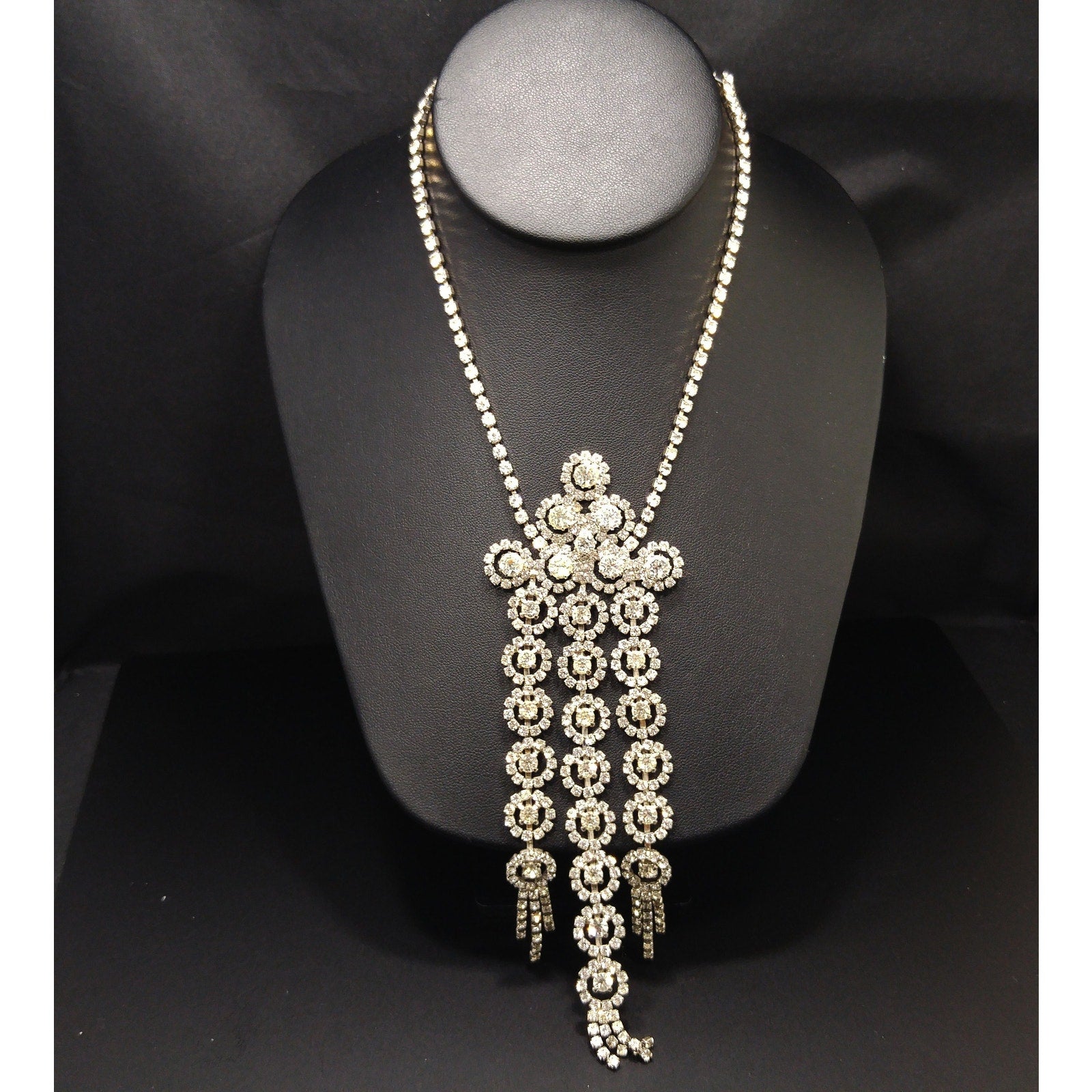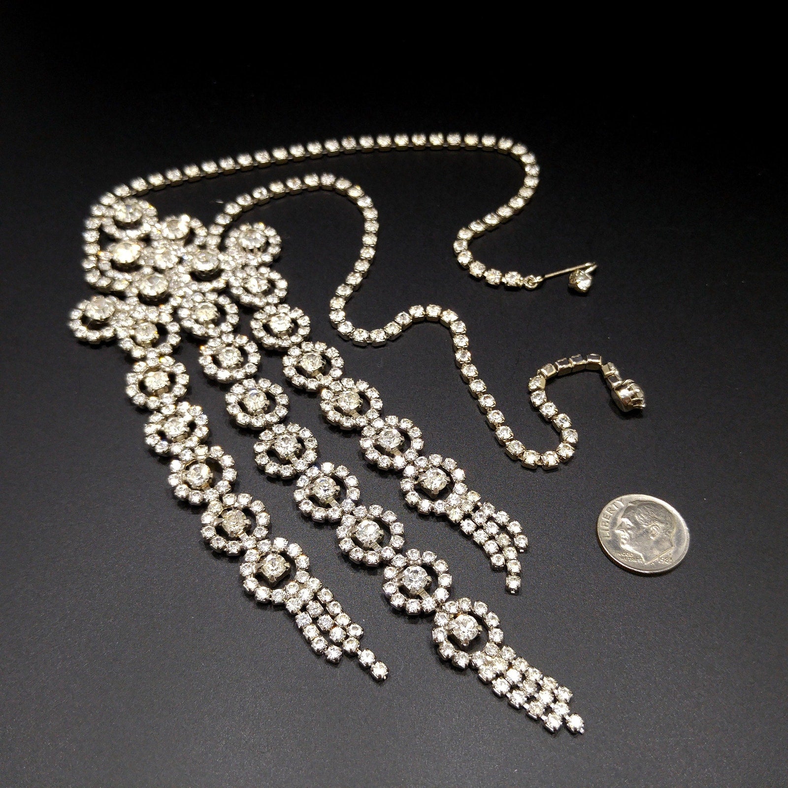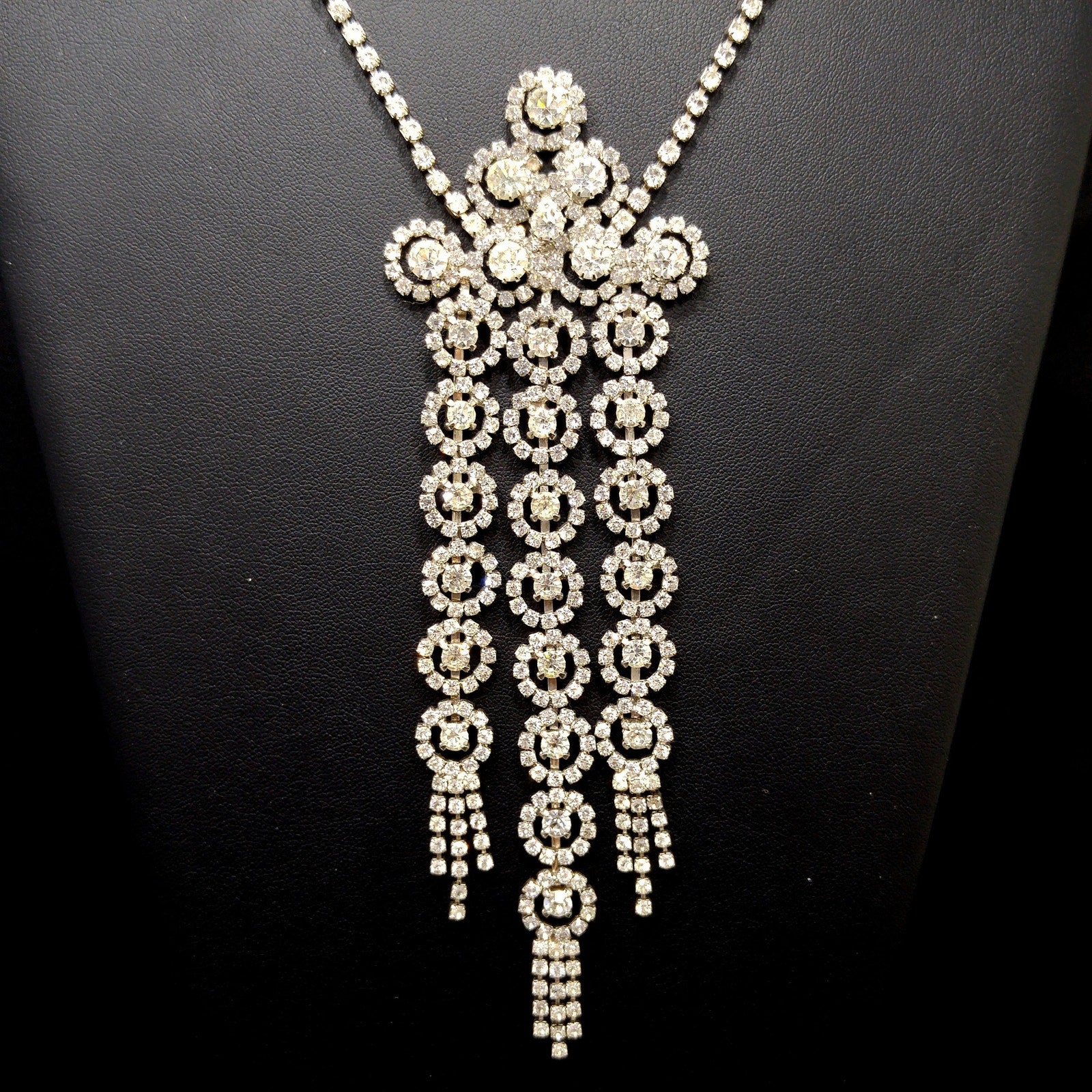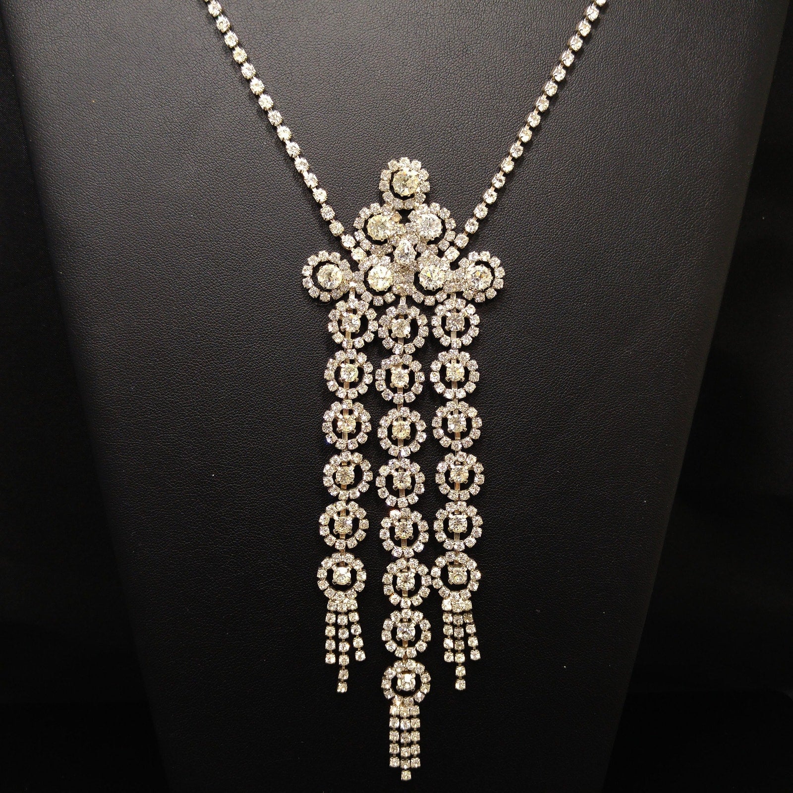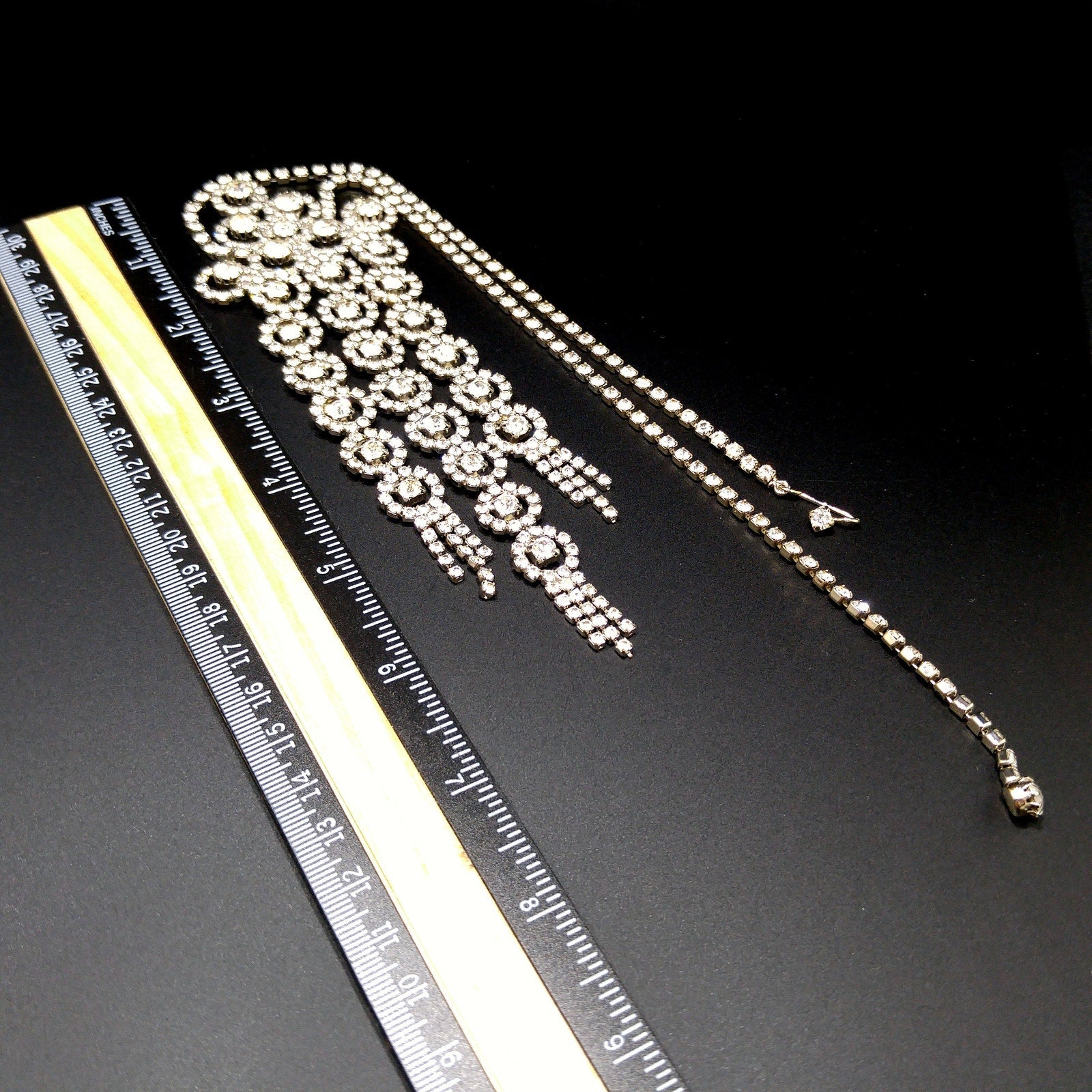 *Description: This is a gorgeous mid-century bridal or wedding necklace, which may be an unsigned Weiss, as it has the rhinestone topped hook and rhinestone tipped extension clasp and a designer quality construction. This necklace has a 6 inch dangle frontal section with sparkling clear rhinestones in several sizes on a rhodium plated base. The necklace is adjustable and would make a wonderful formal necklace for any occasion. This would be a great addition to your vintage jewelry collection or make a great vintage gift!