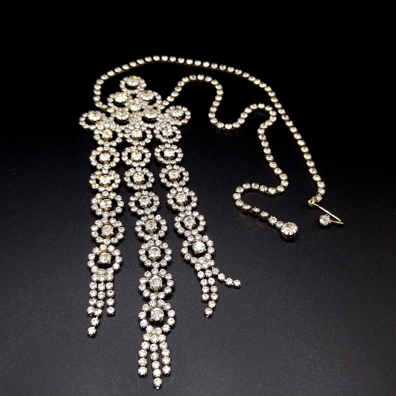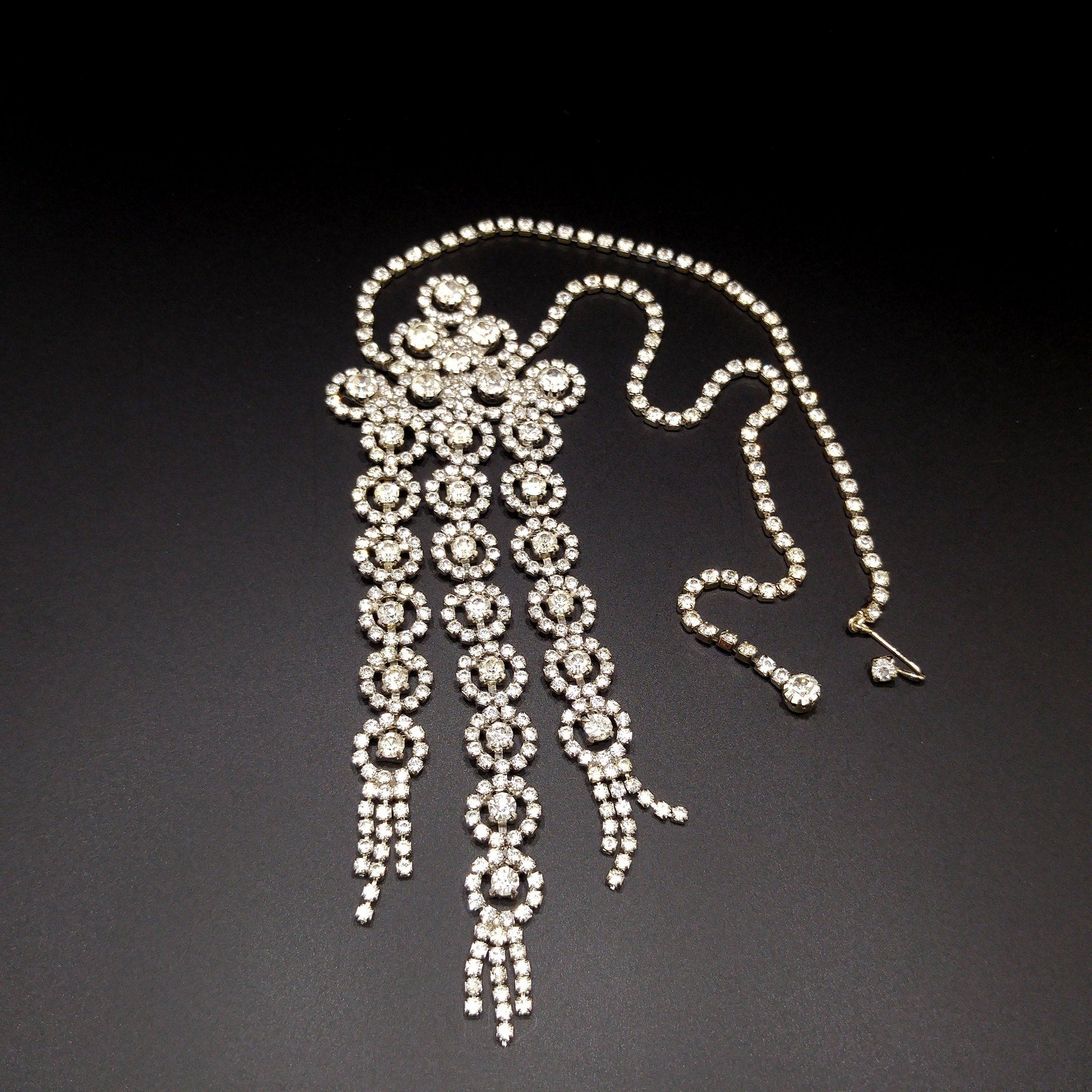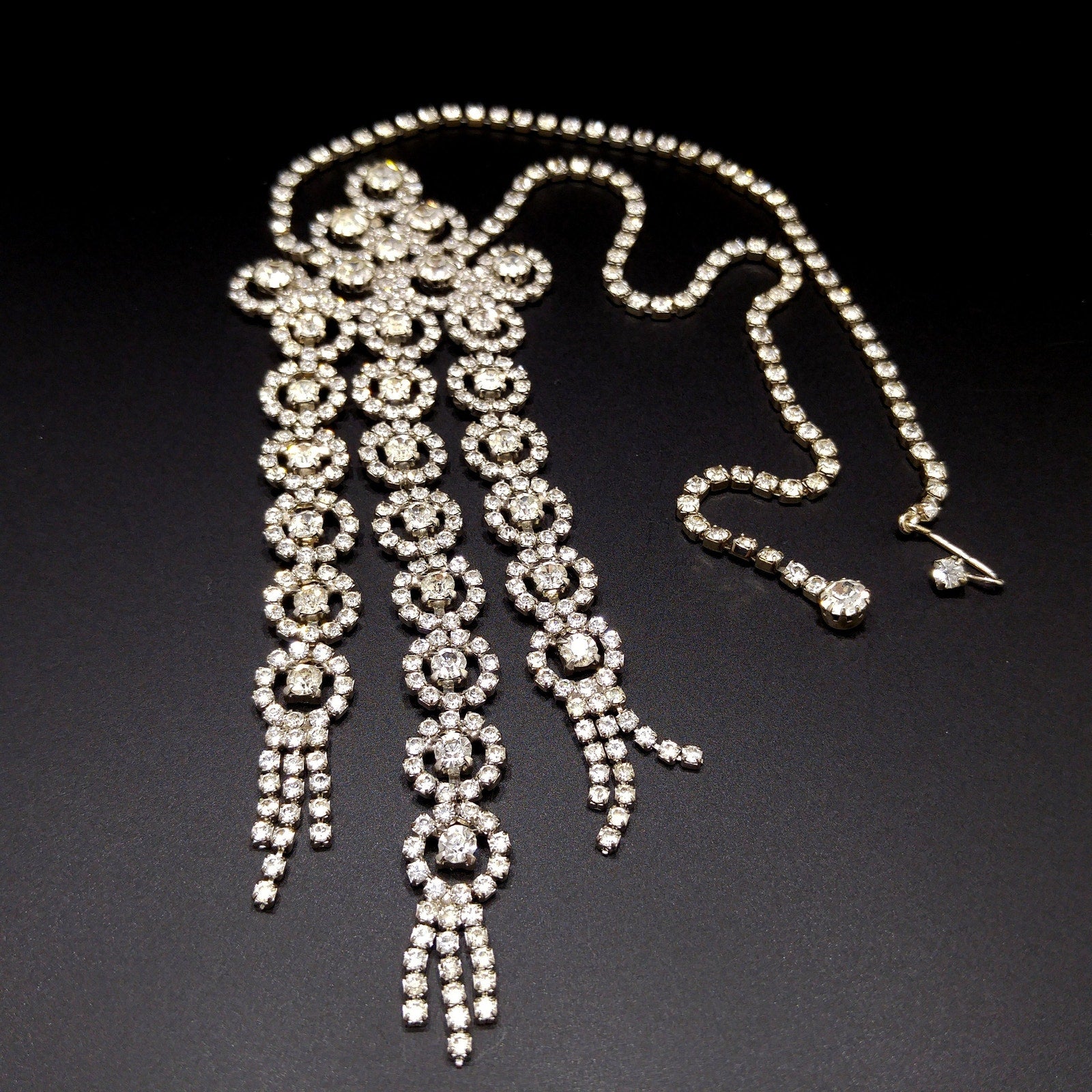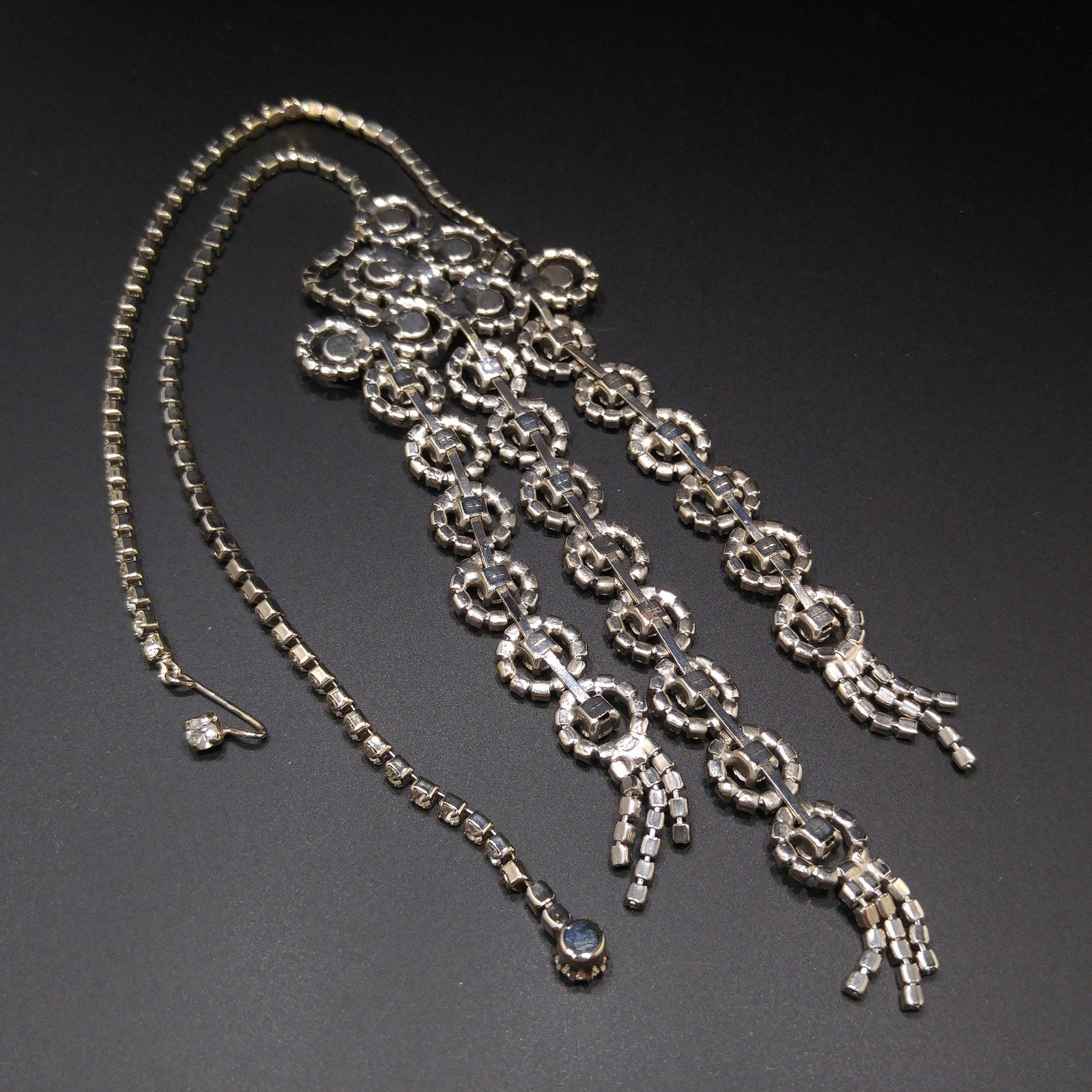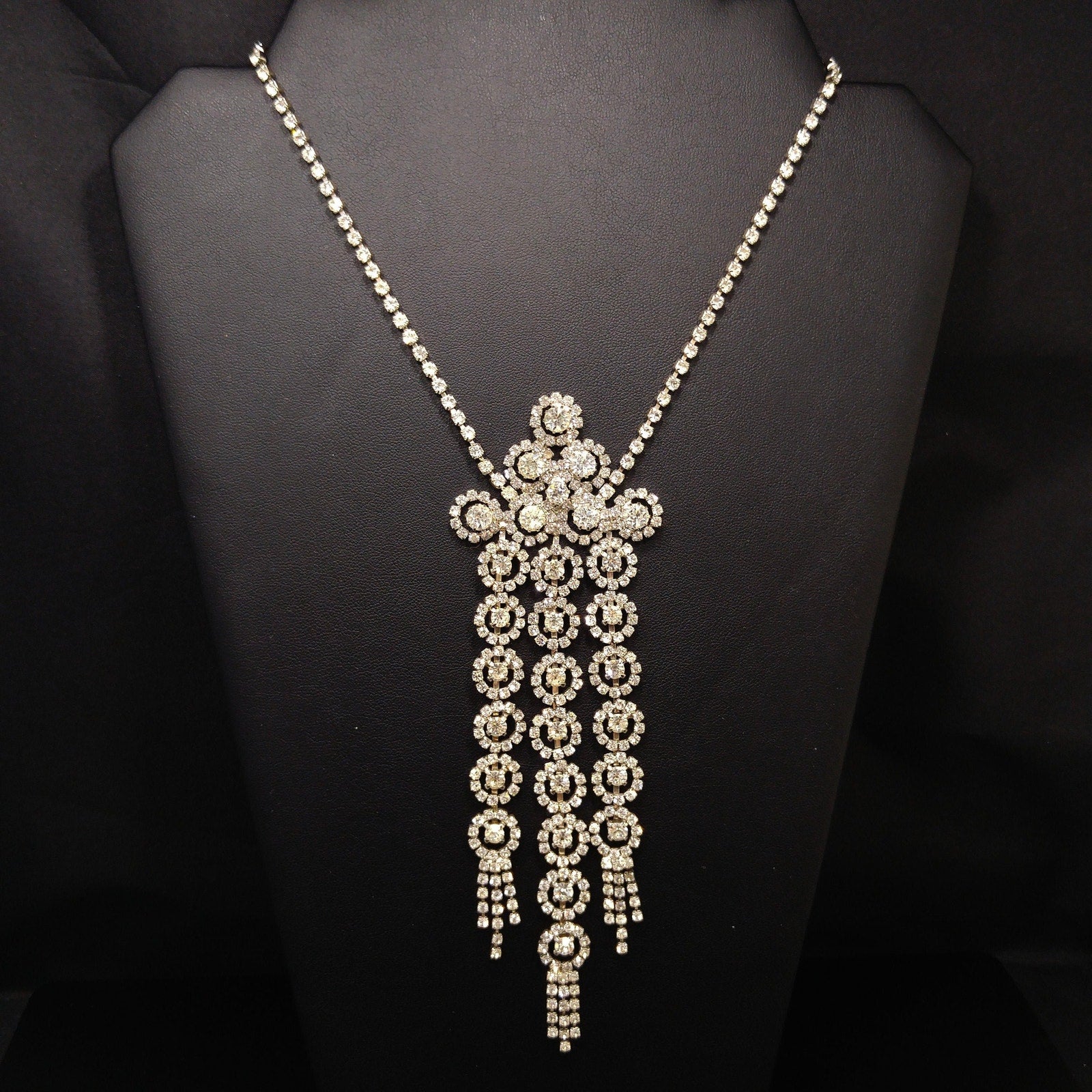 *Description: This is a gorgeous mid-century bridal or wedding necklace, which may be an unsigned Weiss, as it has the rhinestone topped hook and rhinestone tipped extension clasp and a designer quality construction. This necklace has a 6 inch dangle frontal section with sparkling clear rhinestones in several sizes on a rhodium plated base. The necklace is adjustable and would make a wonderful formal necklace for any occasion. This would be a great addition to your vintage jewelry collection or make a great vintage gift!
