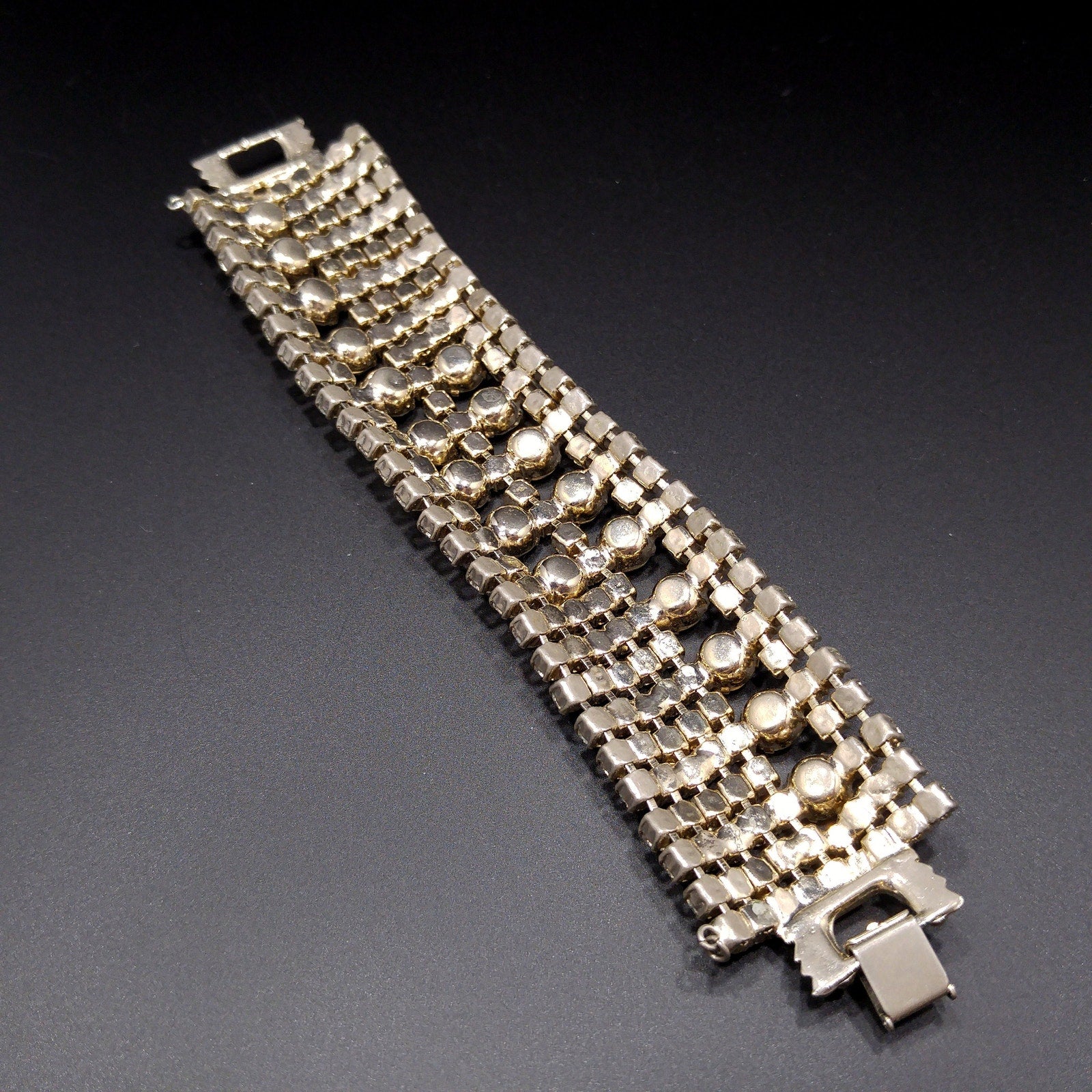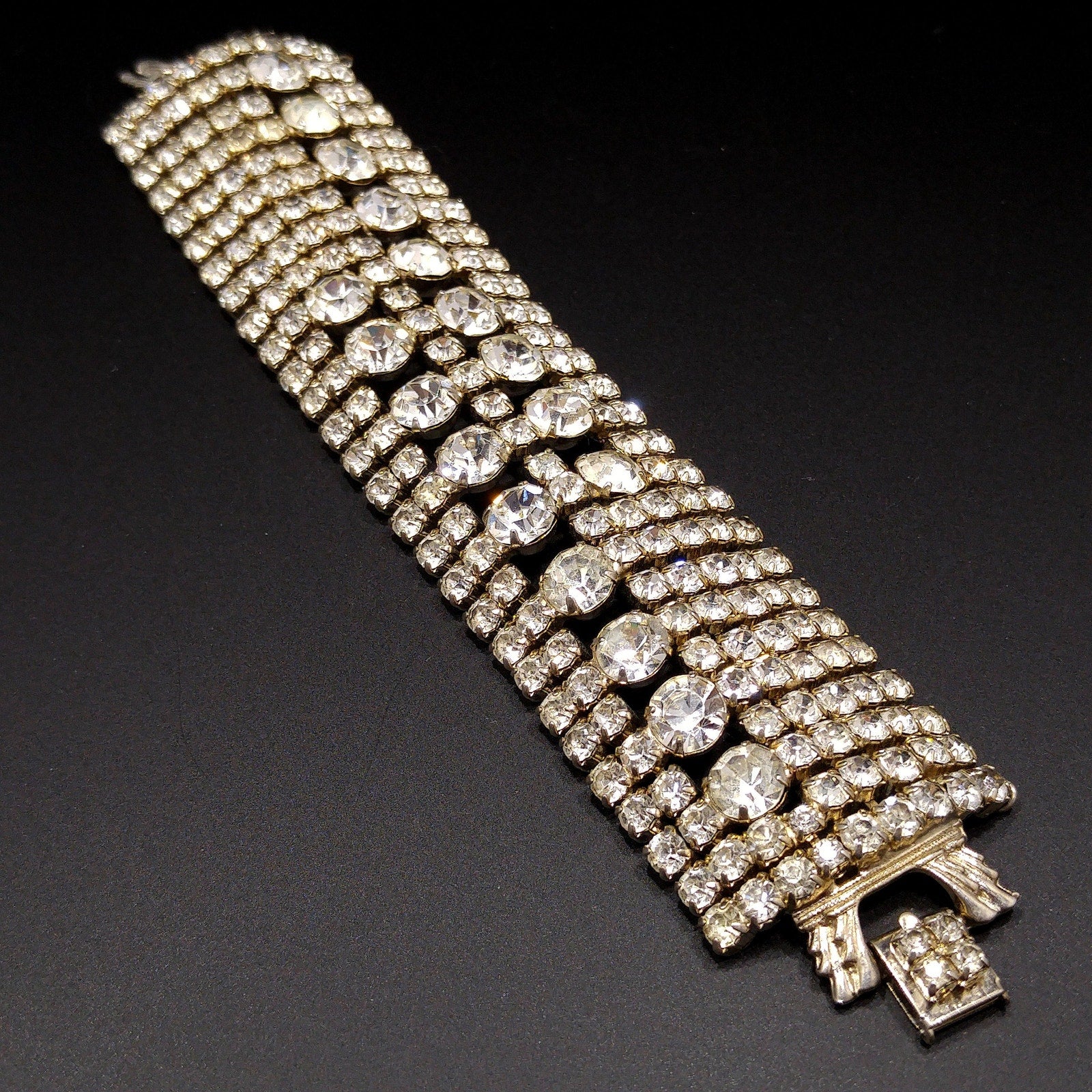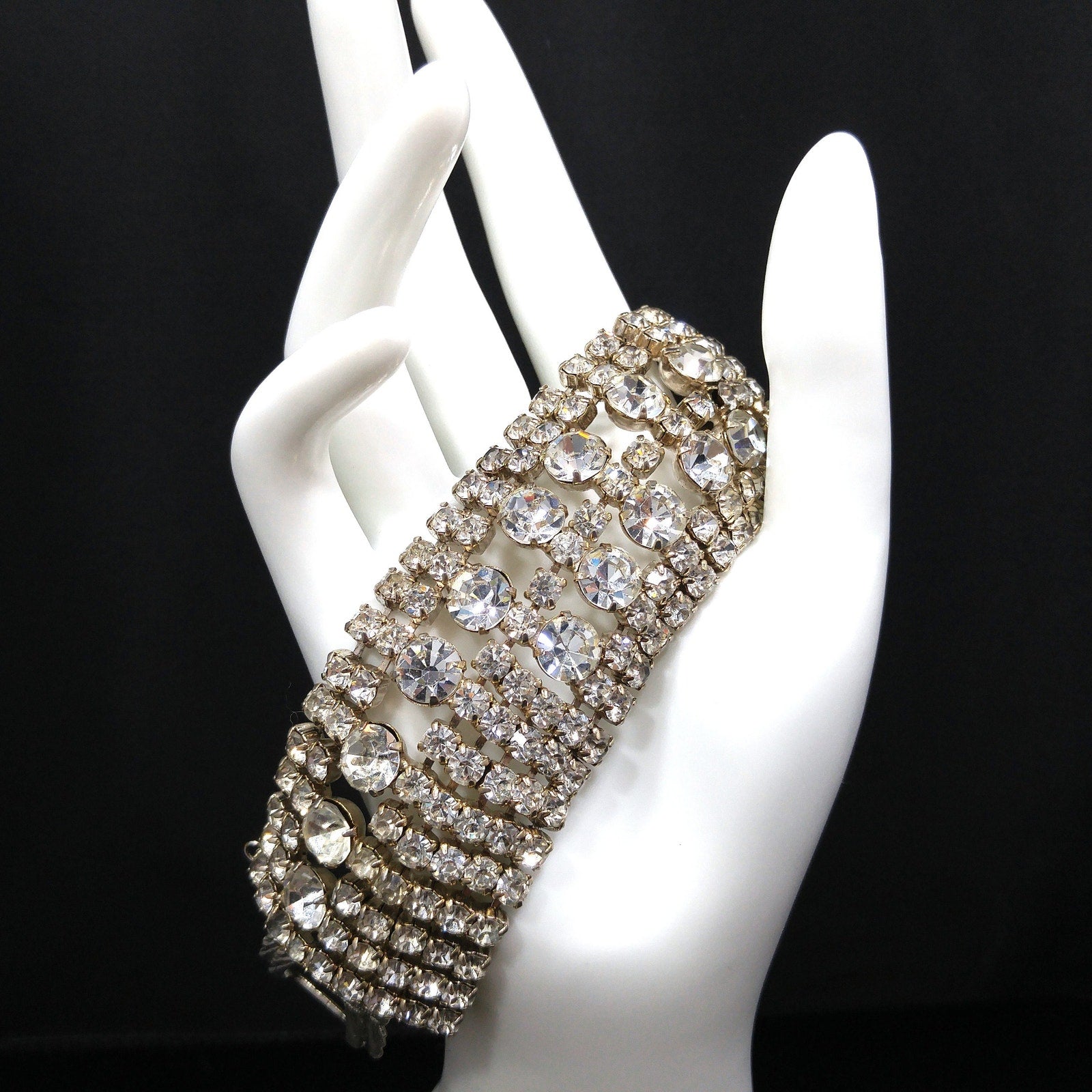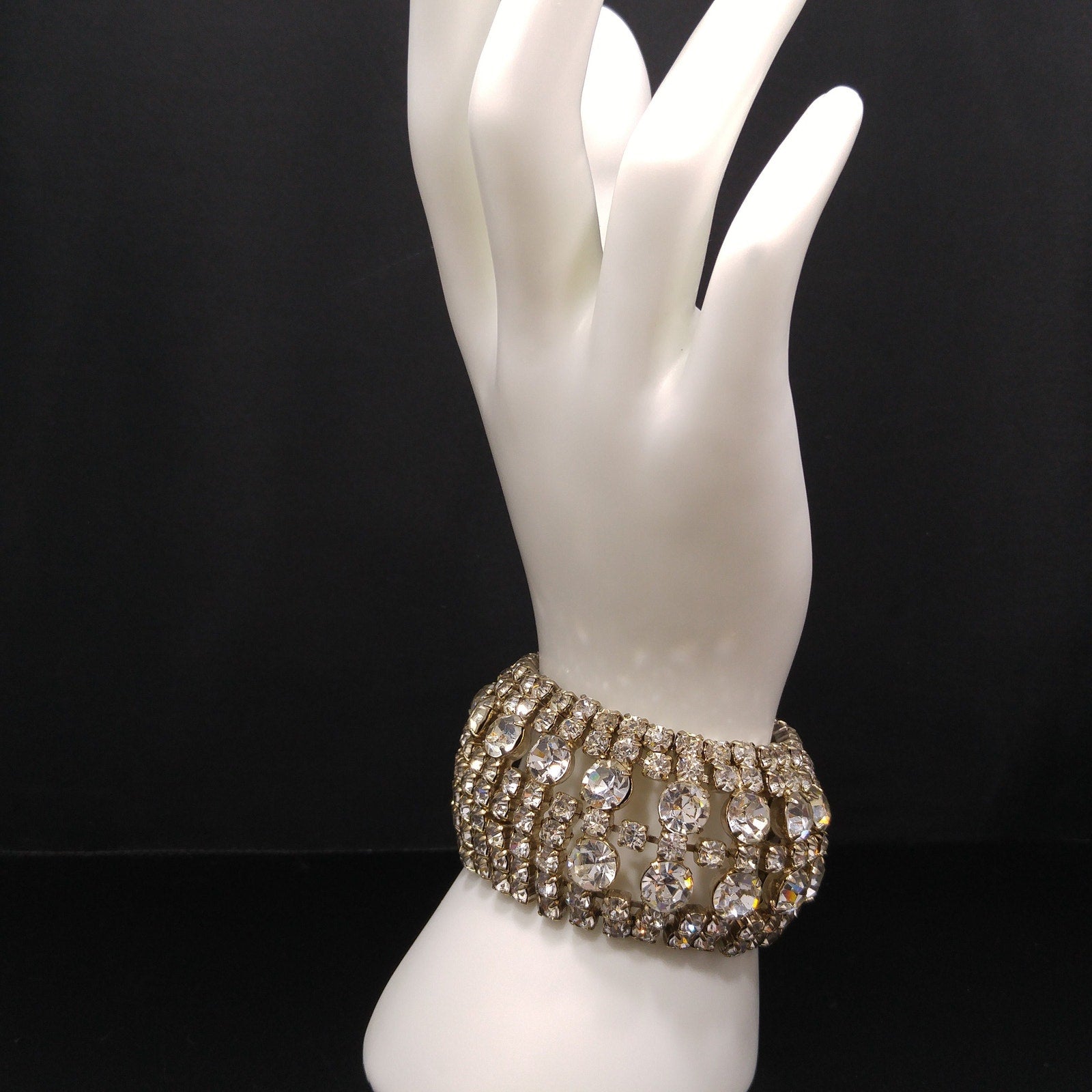 *Description: This is a gorgeous clear rhinestone wide gold plated bracelet from the 1950s which would look beautiful at a wedding or any special event. This bracelet is an unsigned designer bracelet which has a very faint gold tone which only shows up in photos as it looks silver tone. It is rhodium plated but when it was tested, it tested at 22K gold plate. We have a similar Weiss bracelet that is also wide, silver tone, and has the same four rhinestone clasp. So, this may be an unsigned Weiss. It had a safety chain at one time so there is a place to add one. The bracelet itself is in great condition and beautiful. This would be a great addition to your vintage jewelry collection or make a great vintage gift!
