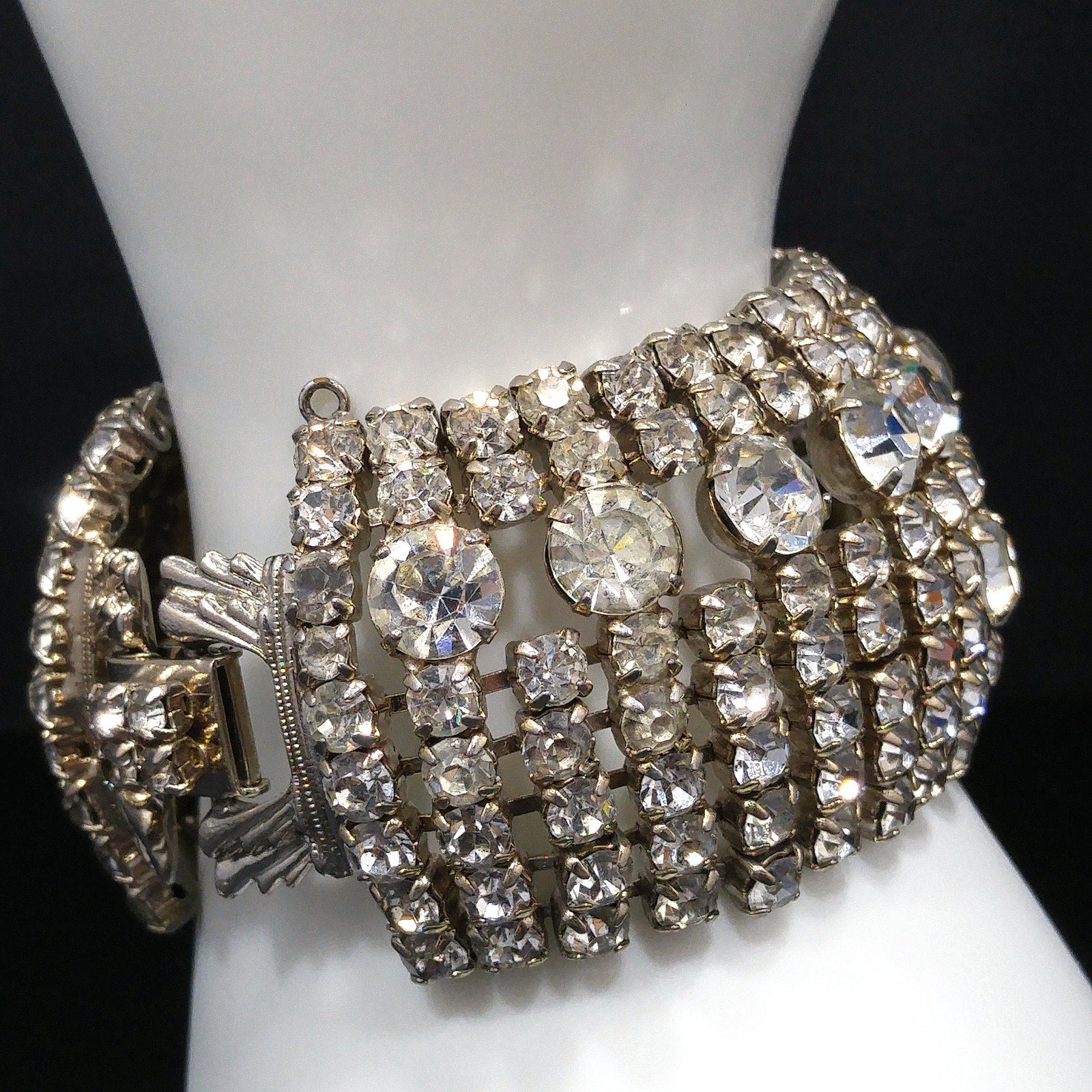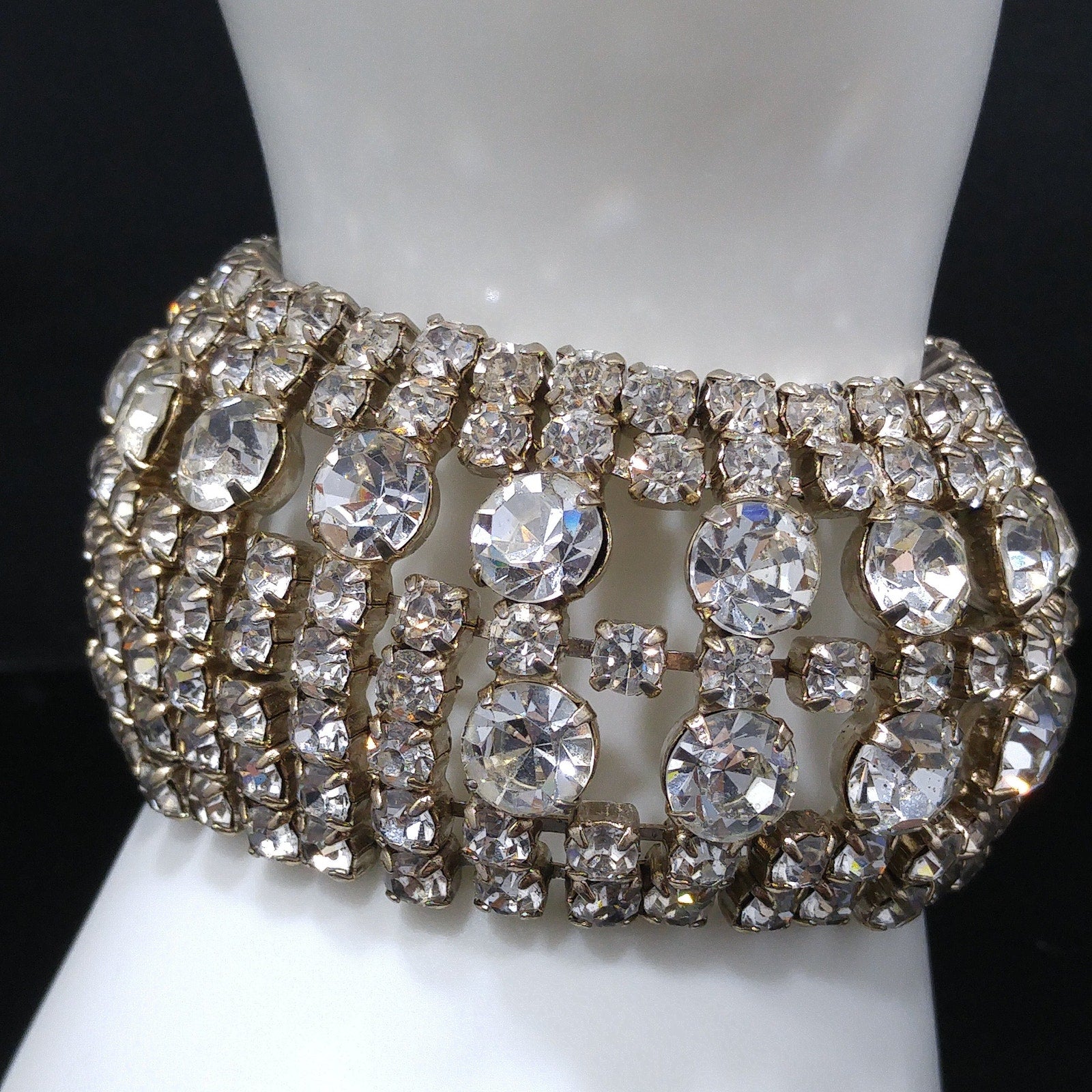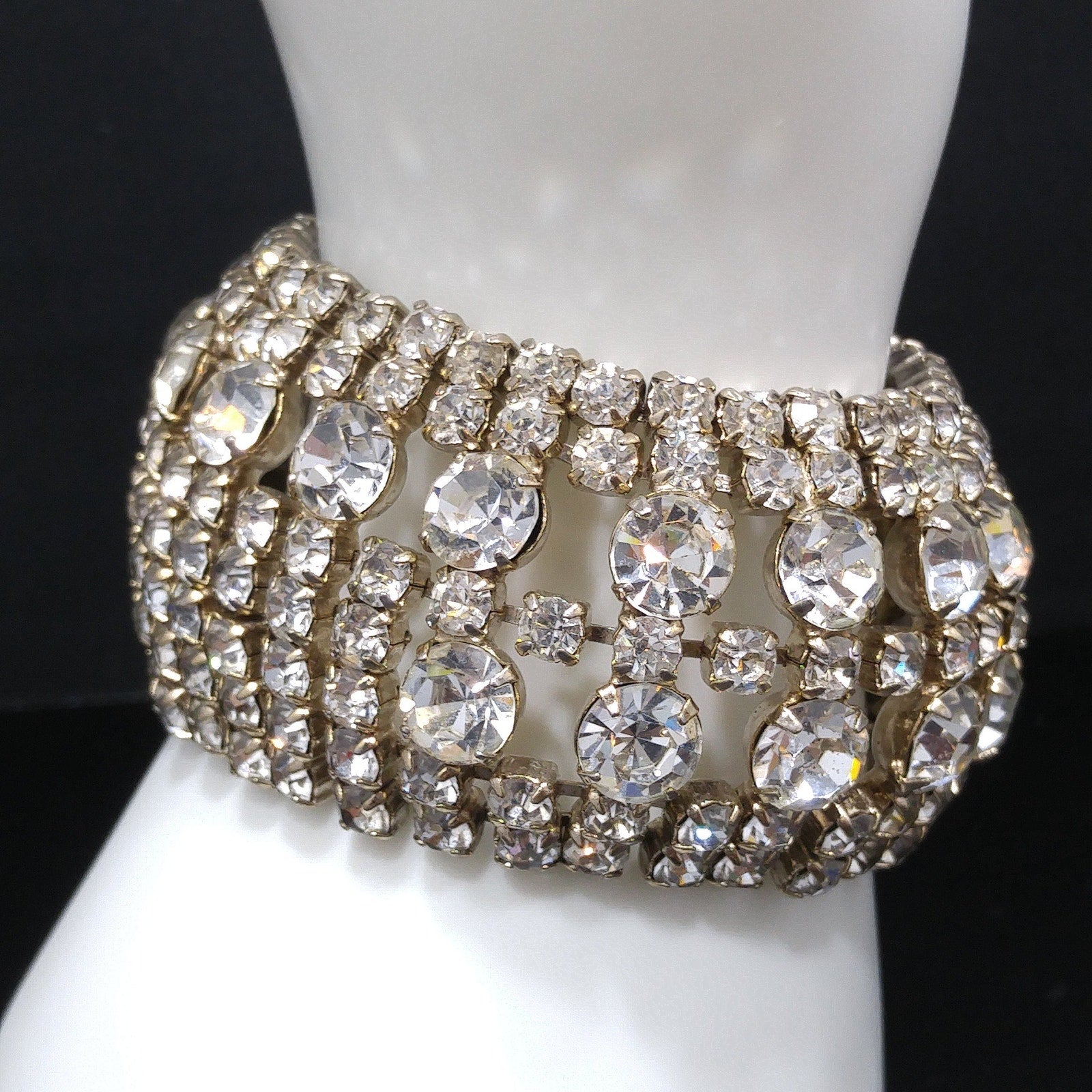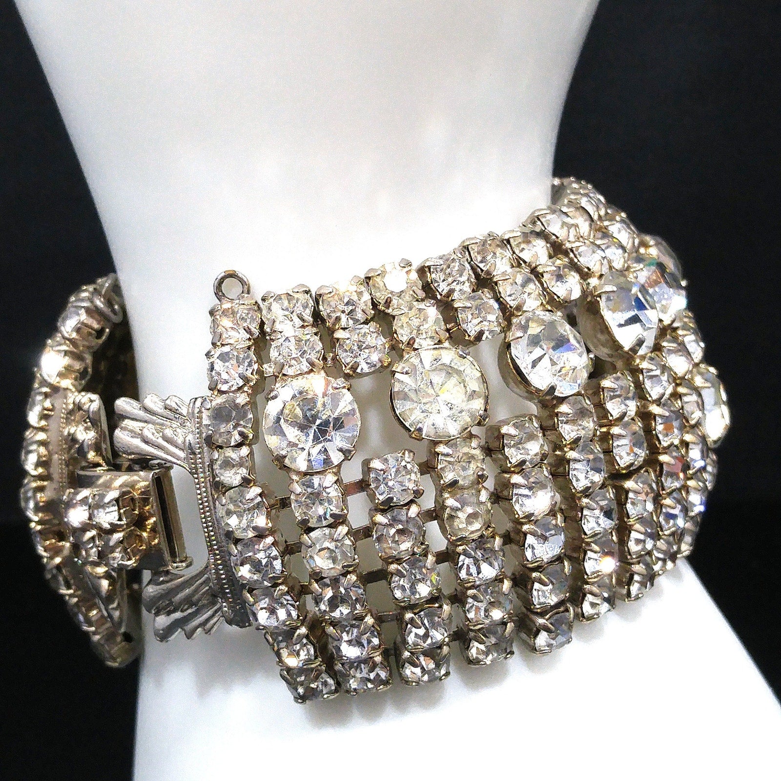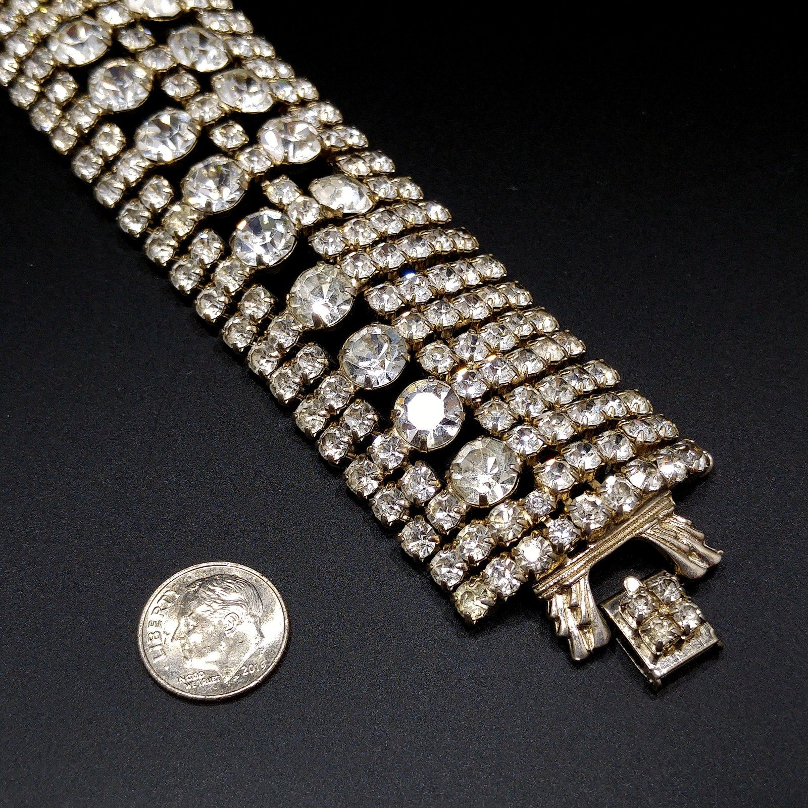 *Description: This is a gorgeous clear rhinestone wide gold plated bracelet from the 1950s which would look beautiful at a wedding or any special event. This bracelet is an unsigned designer bracelet which has a very faint gold tone which only shows up in photos as it looks silver tone. It is rhodium plated but when it was tested, it tested at 22K gold plate. We have a similar Weiss bracelet that is also wide, silver tone, and has the same four rhinestone clasp. So, this may be an unsigned Weiss. It had a safety chain at one time so there is a place to add one. The bracelet itself is in great condition and beautiful. This would be a great addition to your vintage jewelry collection or make a great vintage gift!