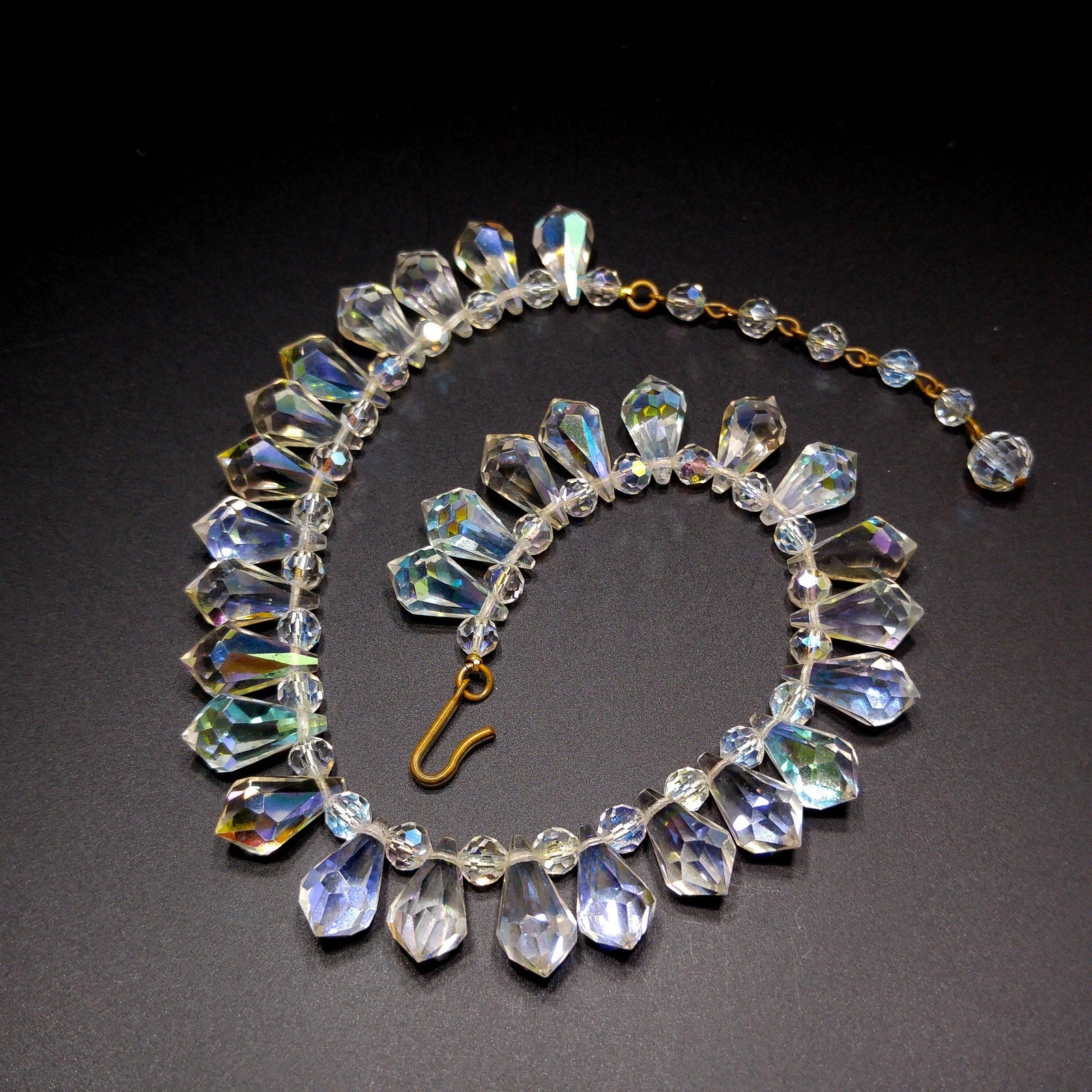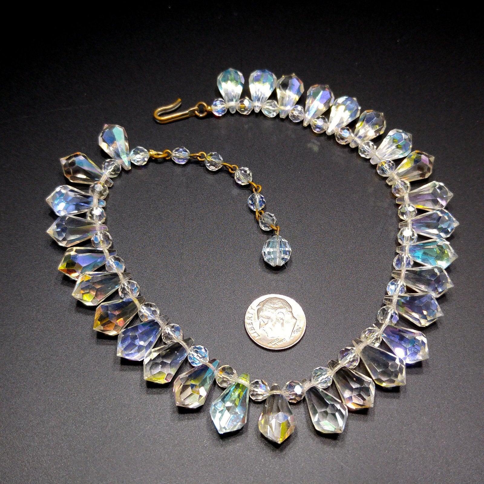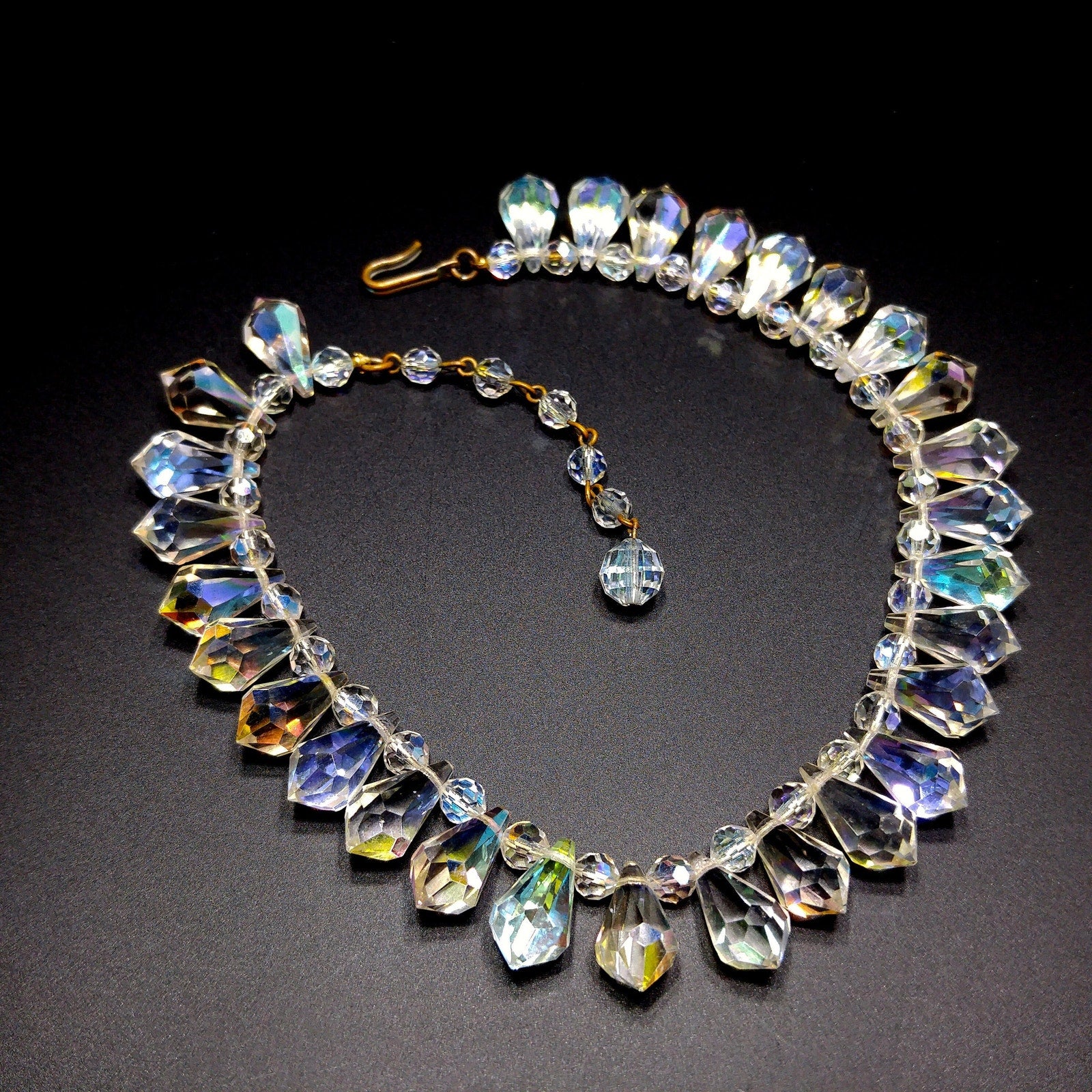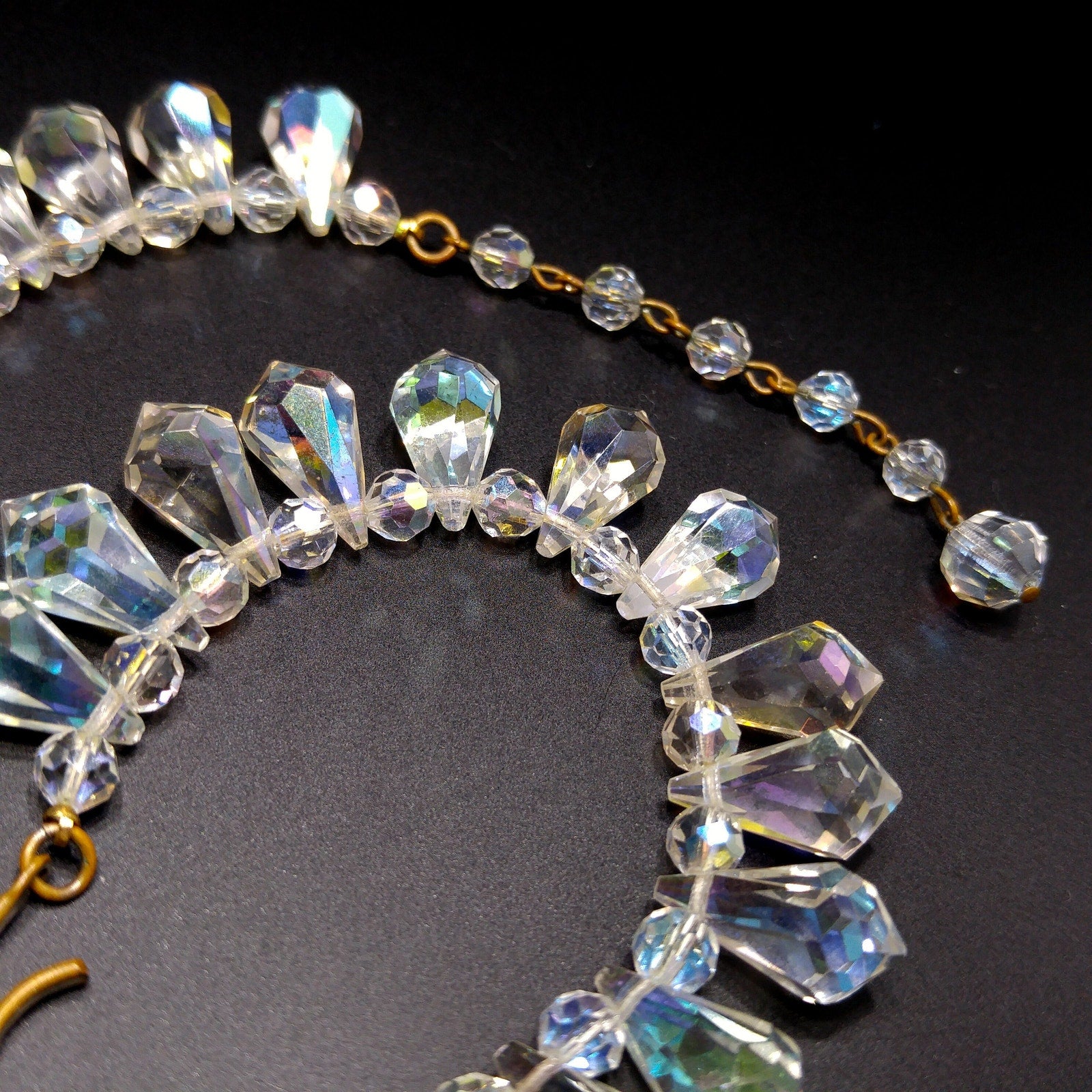 Mid-Century Crystal Teardrop Dangling Necklace, 18mm AB Crystals, 1950s Vintage Jewelry