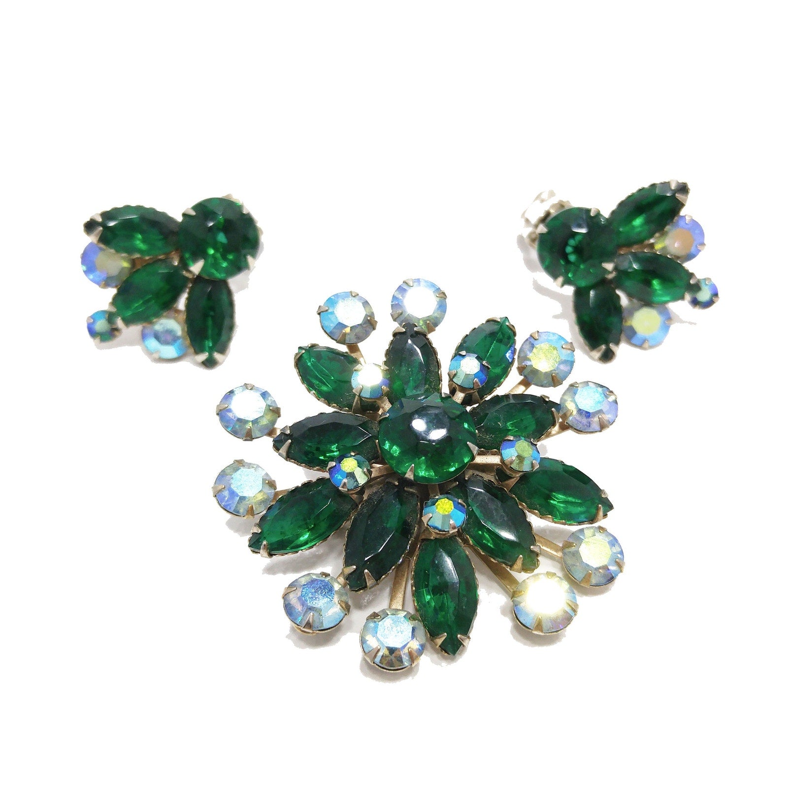 *Description: This is a beautiful mid-century green rhinestone flower brooch and matching clip earring set from the late 1950s. The center green rounded edge faceted rhinestones are encircled with aurora borealis rhinestone chatons with two matching AB chatons on the earrings also. The setting holds each rhinestone on a rivet and the green marquise cut rhinestones are dog-toothed prong set. Beautiful set. Wonderful vintage gift!