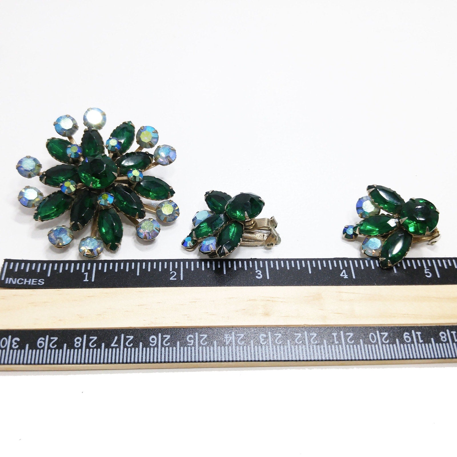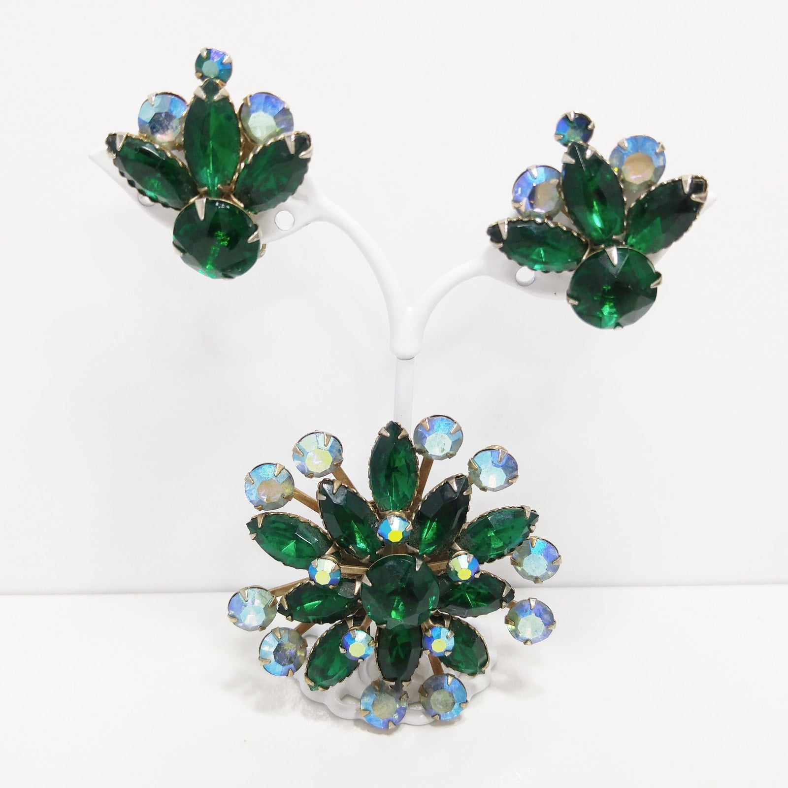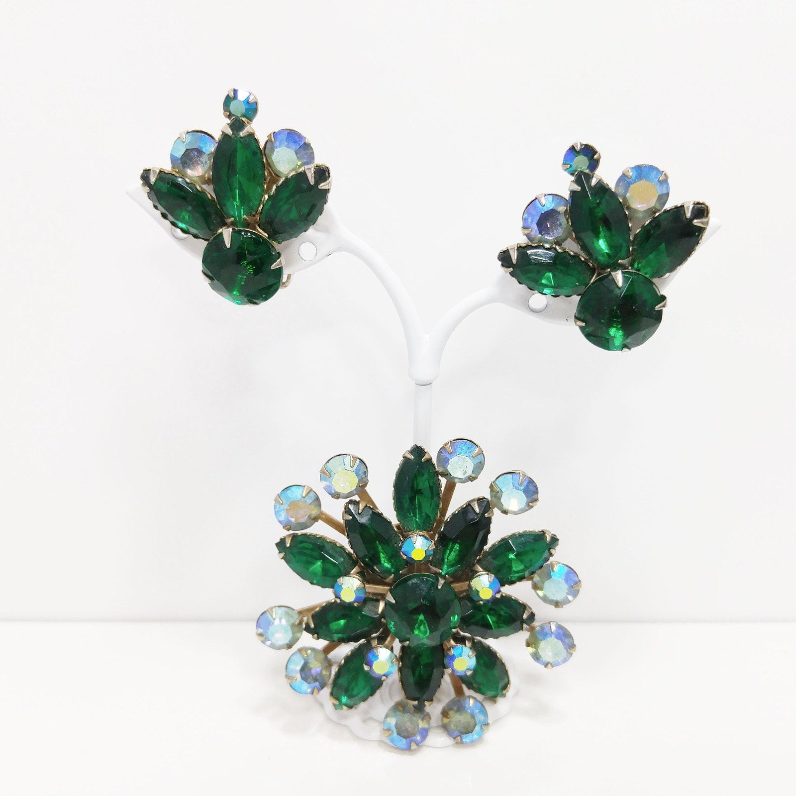 Mid-Century Green Rhinestone Flower Brooch & Earrings, Aurora Borealis, 1950s