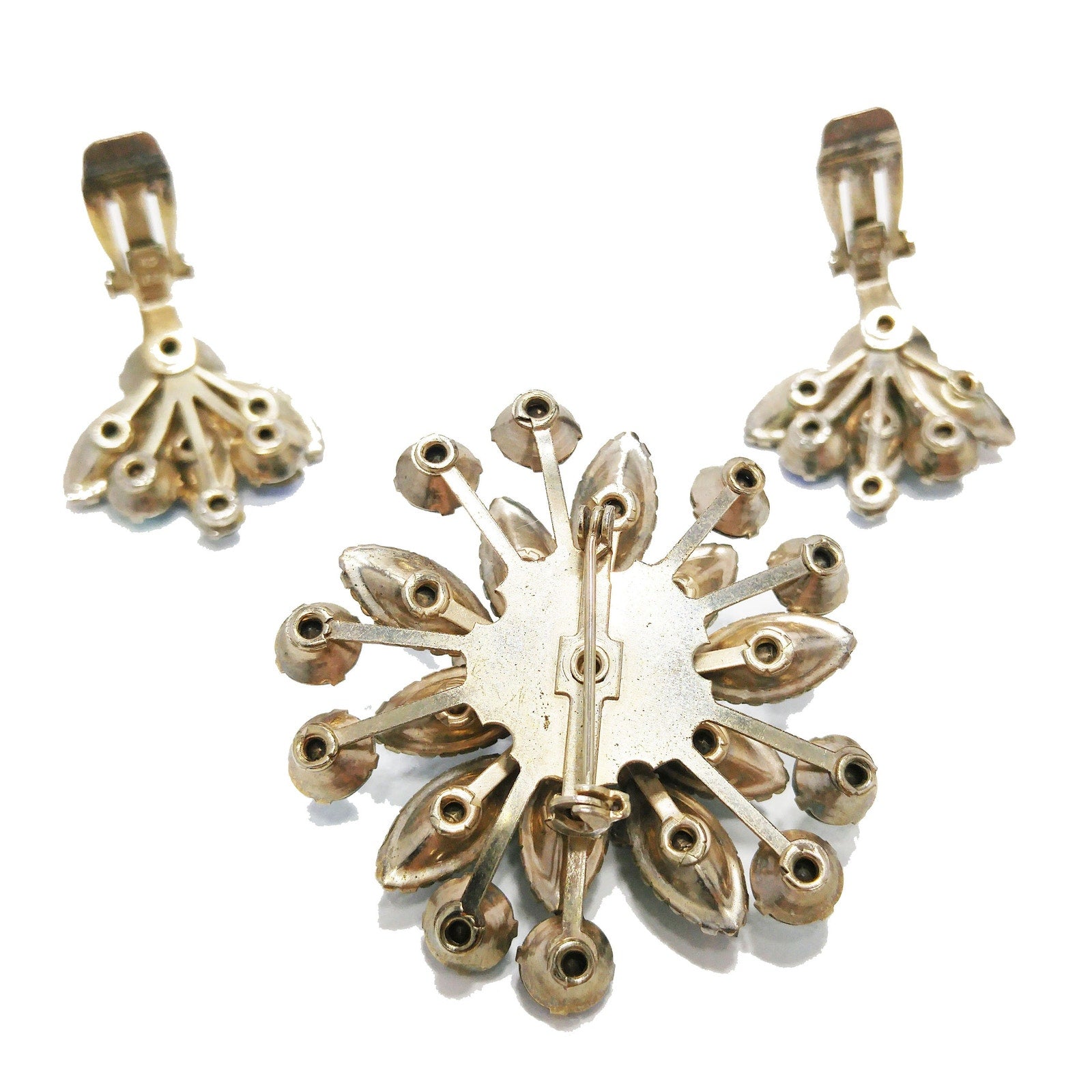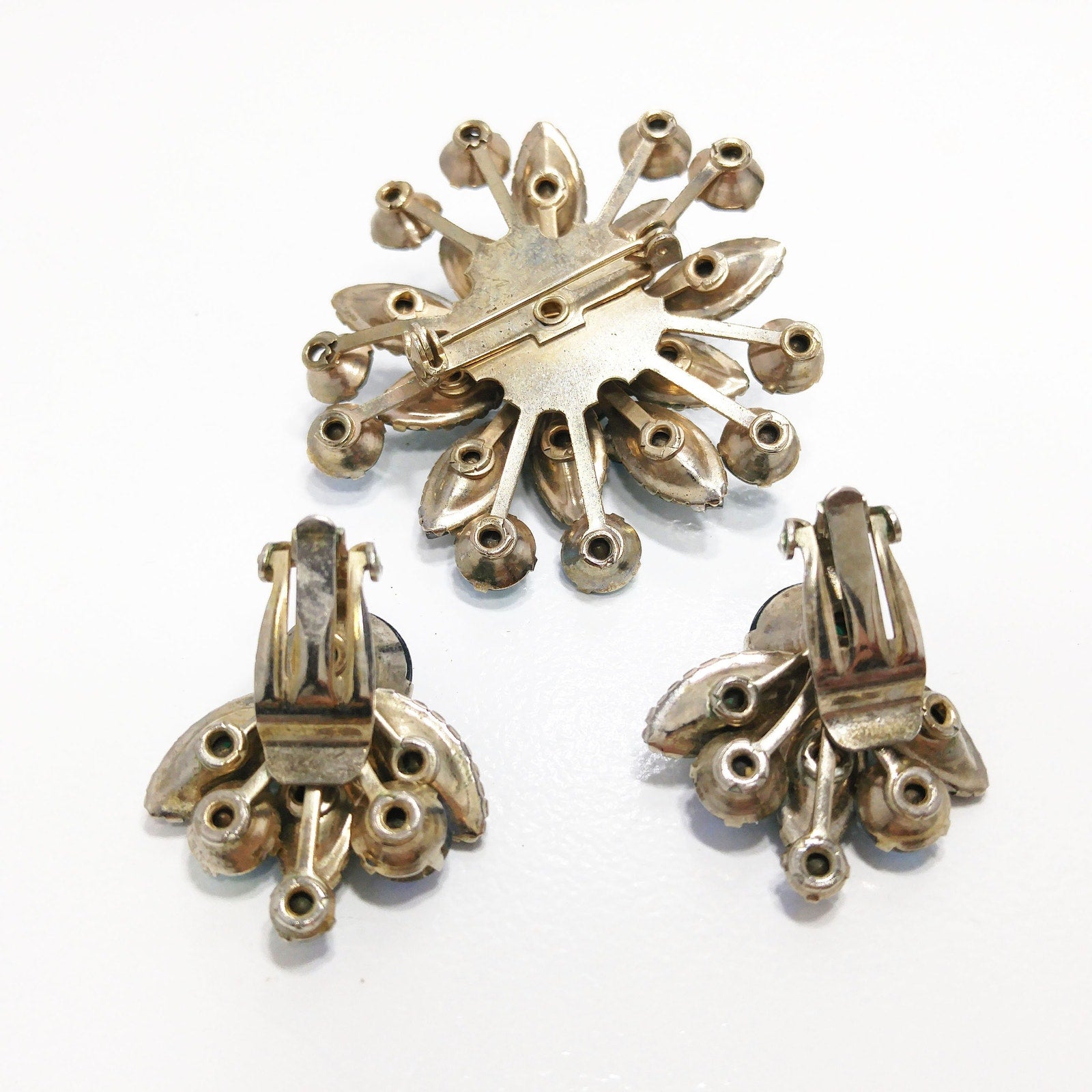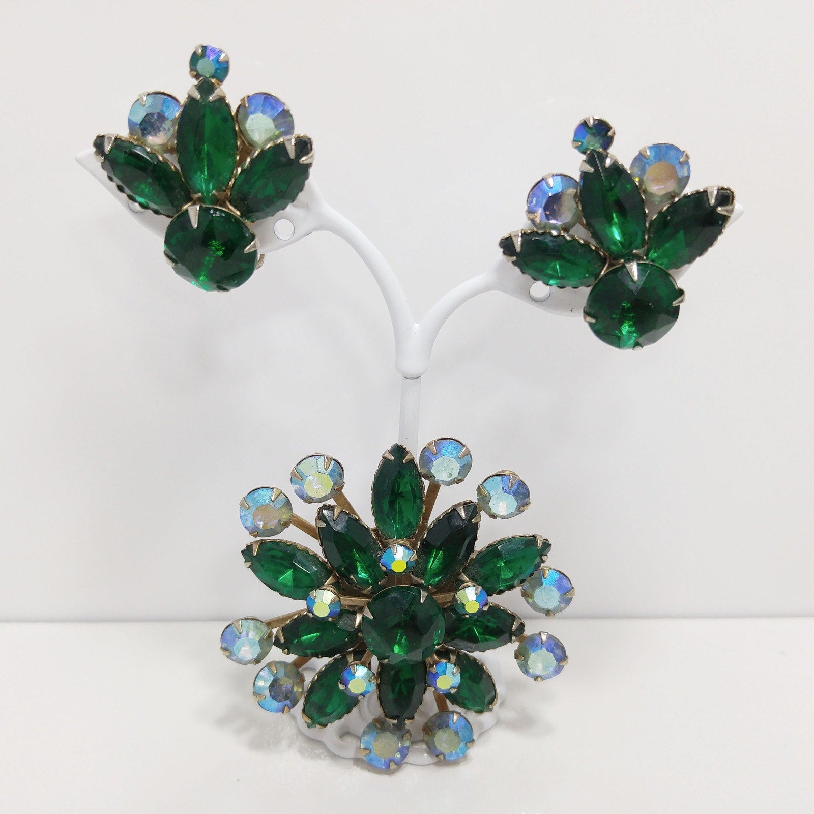 Mid-Century Green Rhinestone Flower Brooch & Earrings, Aurora Borealis, 1950s