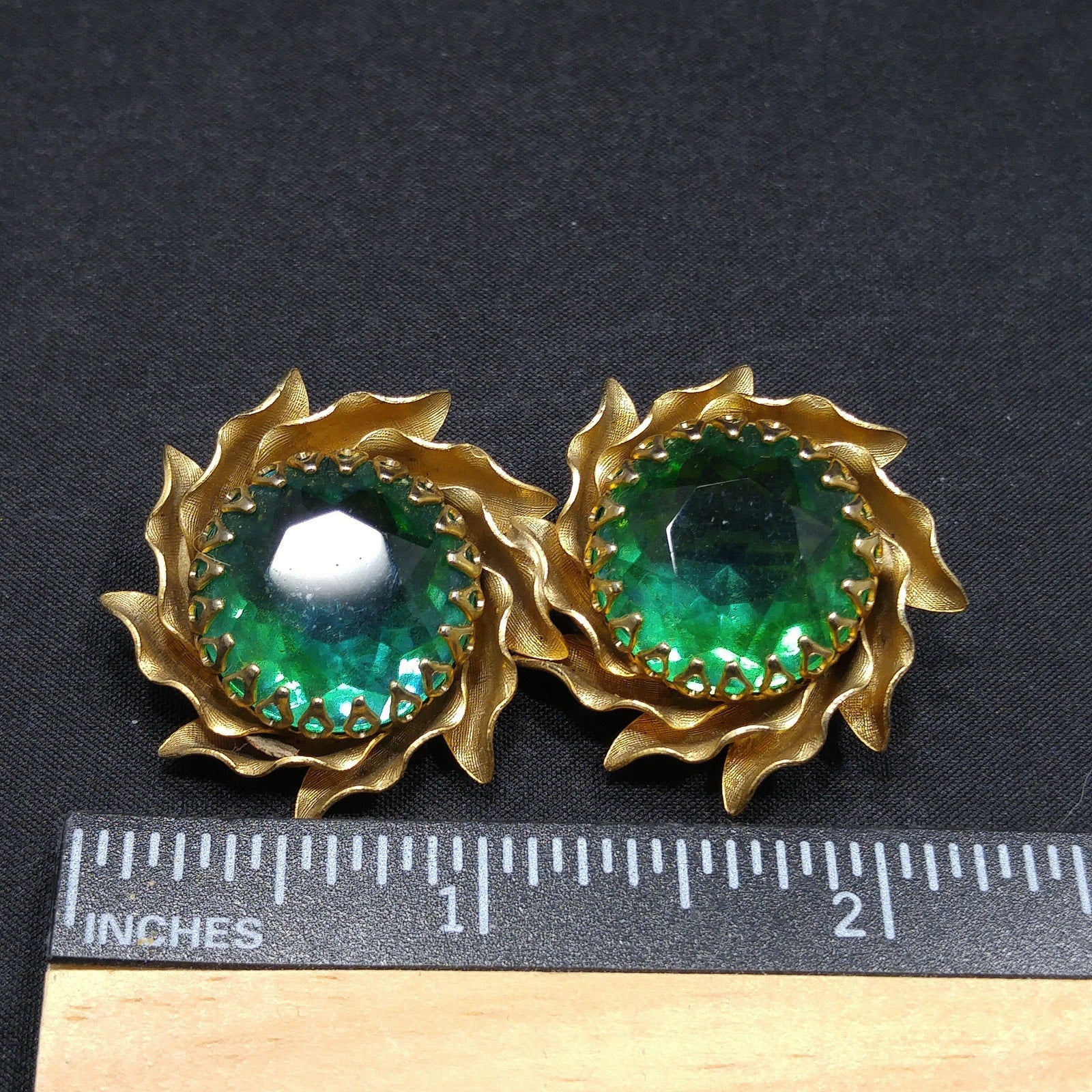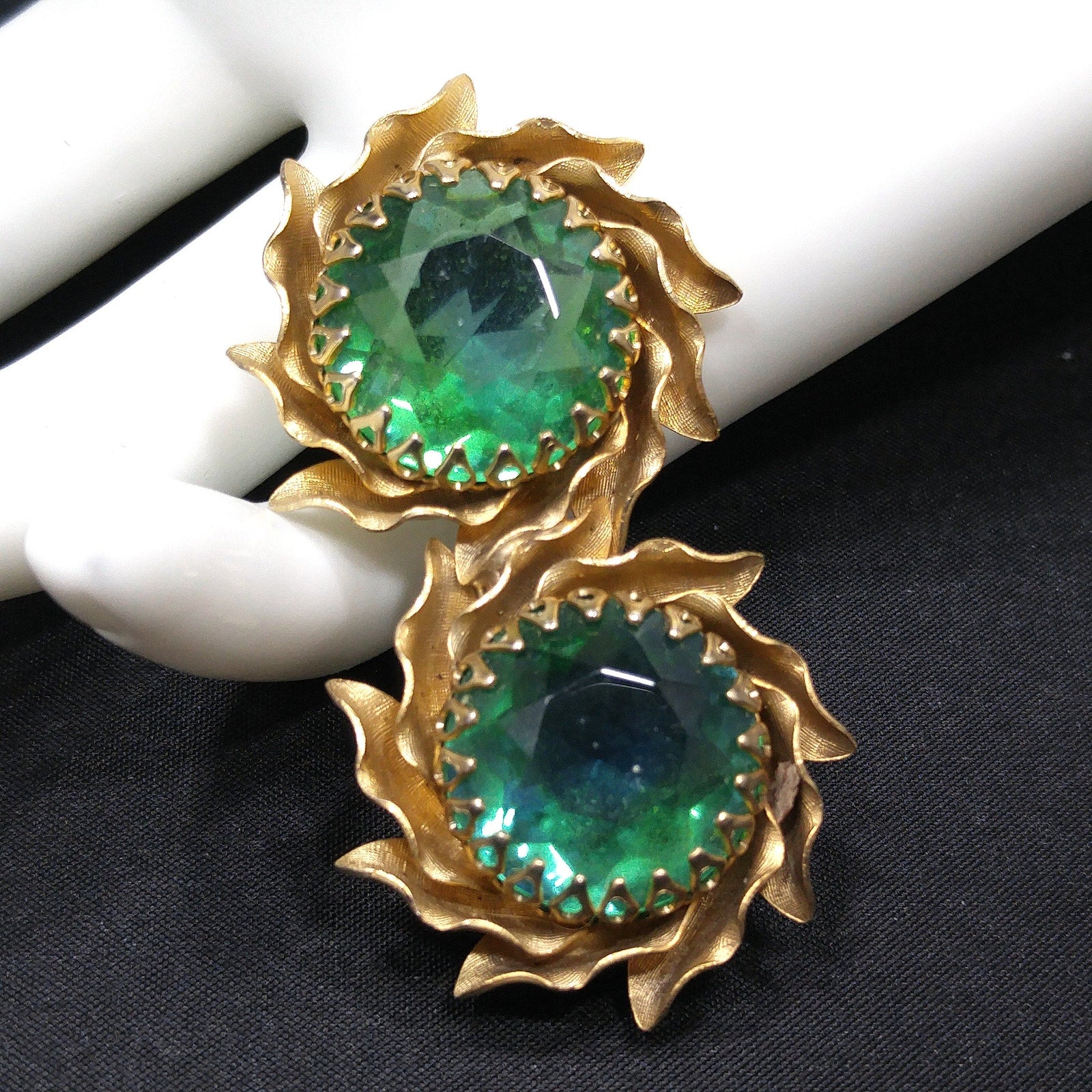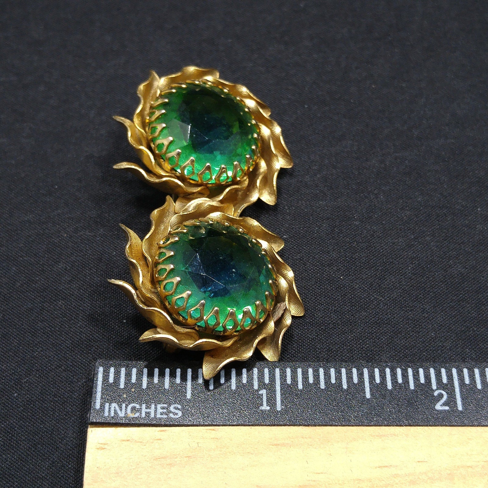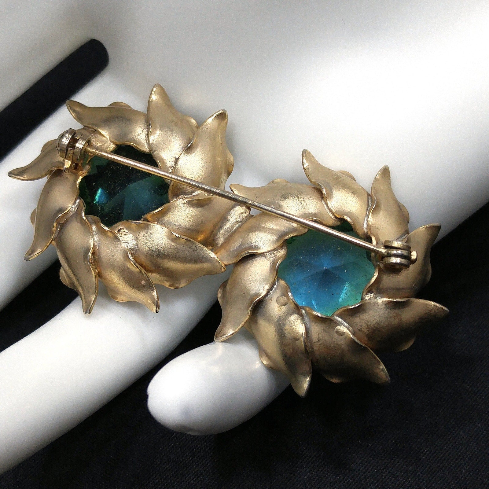 *Description: This is a great mid-century floral brooch in a very unique style with two, side by side, large green rhinestone flowers from the 1950s. The flat table rhinestones are all dog-toothed prong set and securely locked in place with the textured gold plated leaves wrapping around the center stone. This would be a great addition to your vintage jewelry collection or make a great vintage gift!