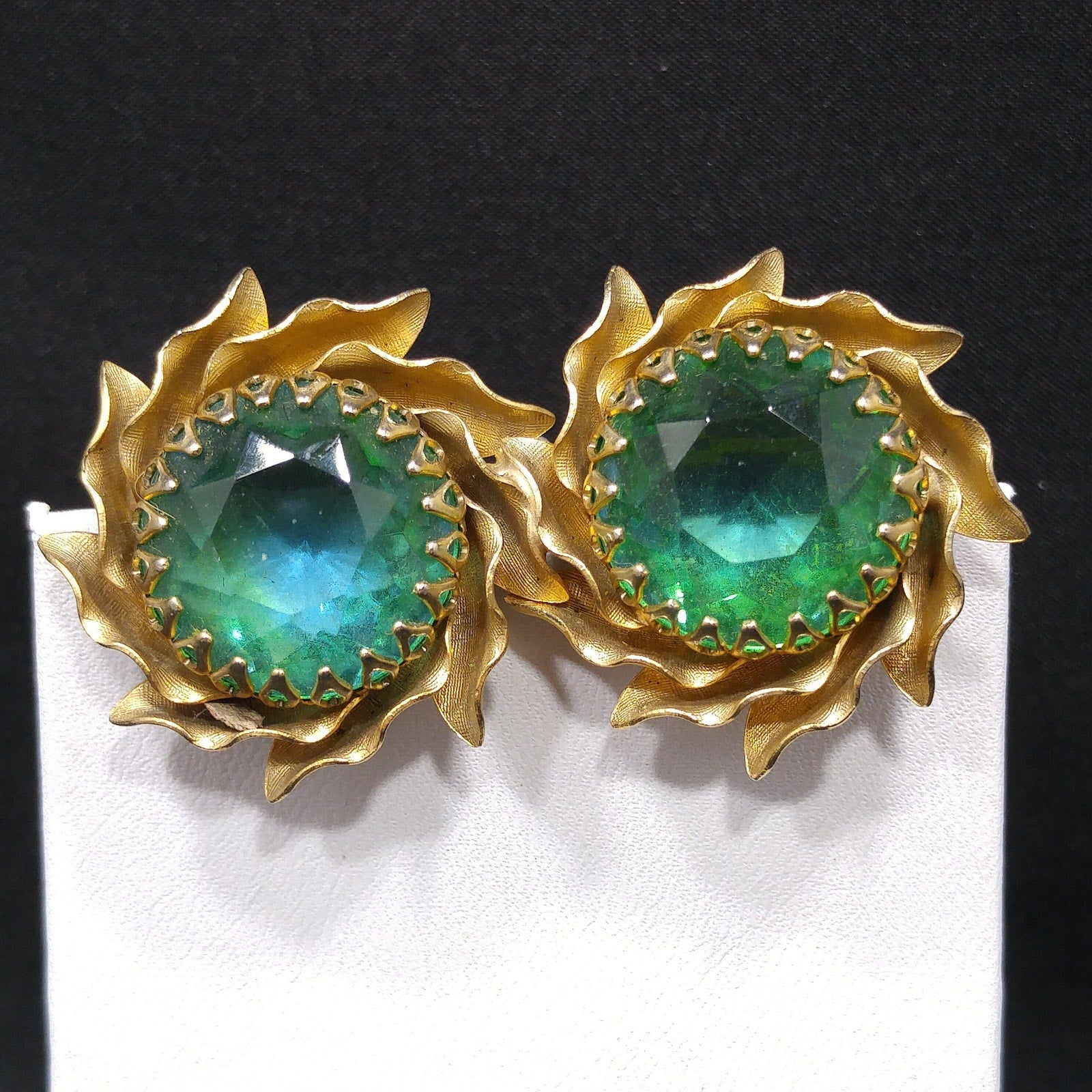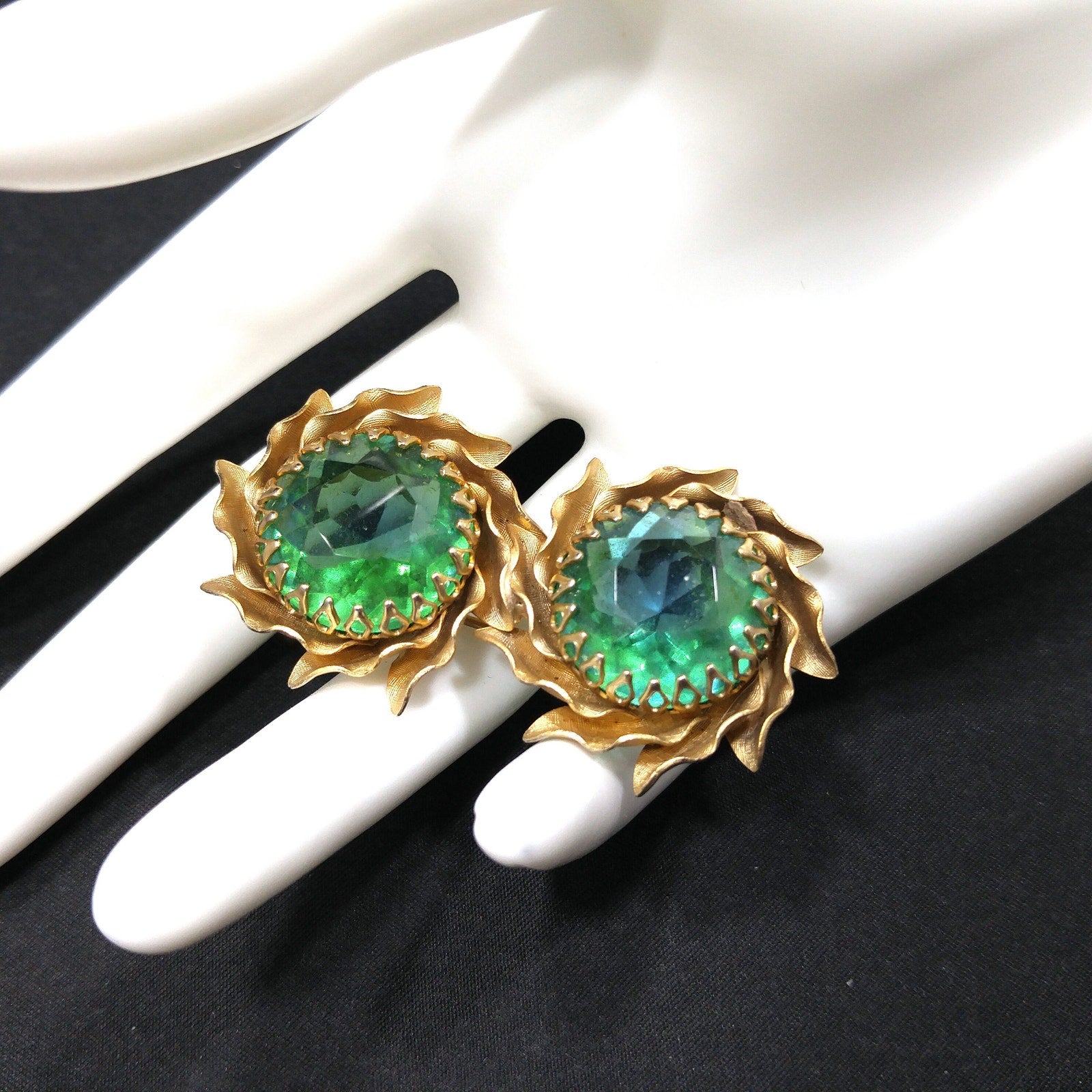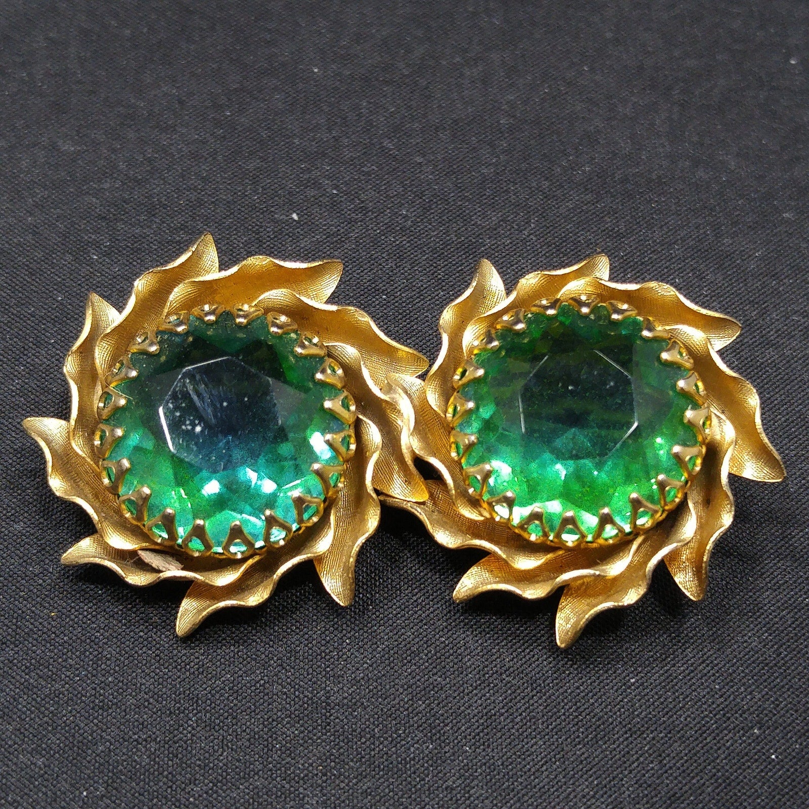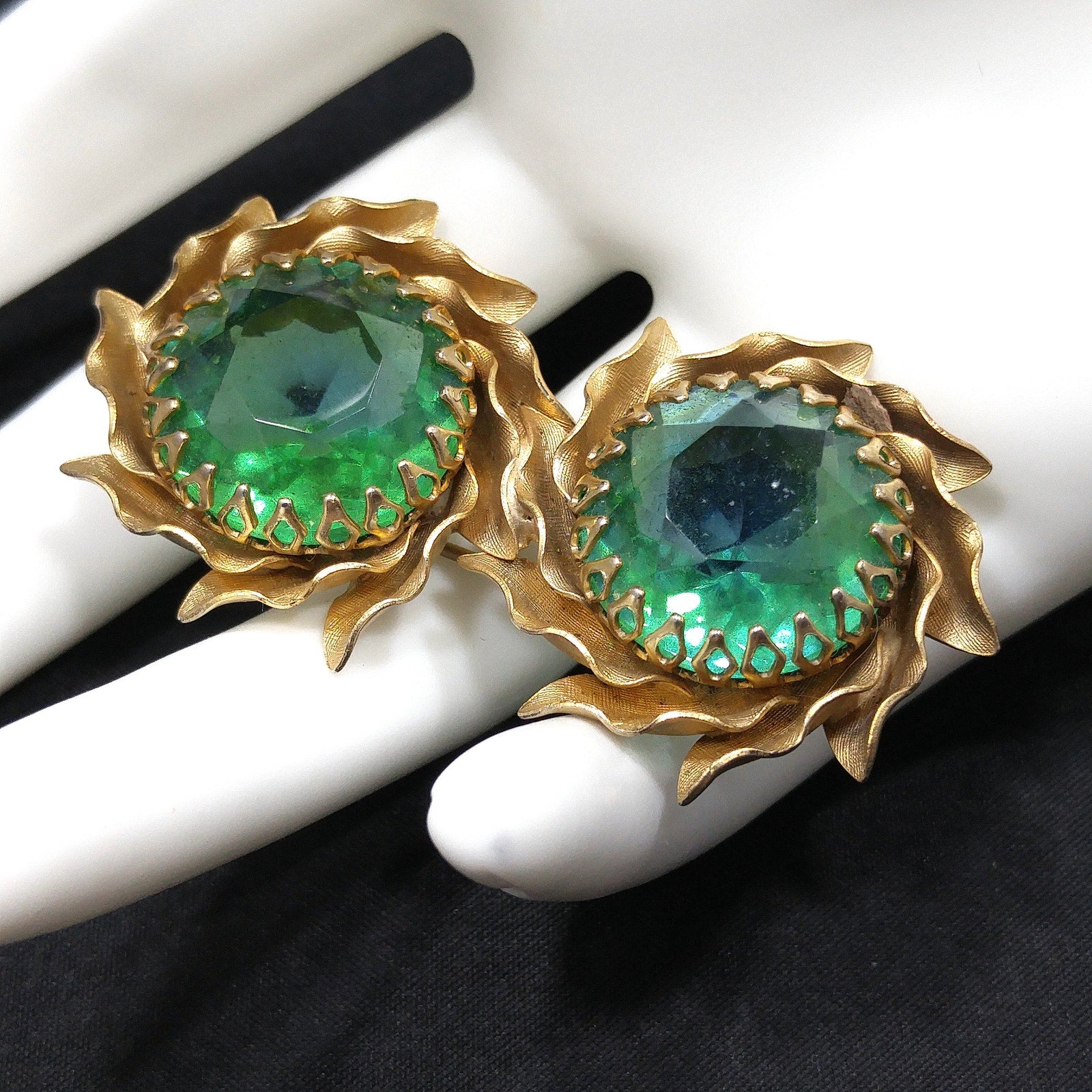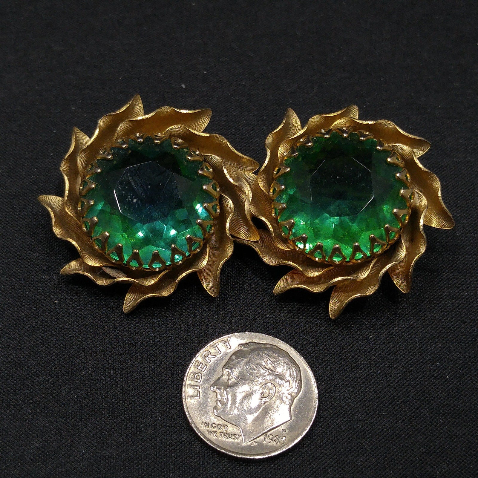 *Description: This is a great mid-century floral brooch in a very unique style with two, side by side, large green rhinestone flowers from the 1950s. The flat table rhinestones are all dog-toothed prong set and securely locked in place with the textured gold plated leaves wrapping around the center stone. This would be a great addition to your vintage jewelry collection or make a great vintage gift!