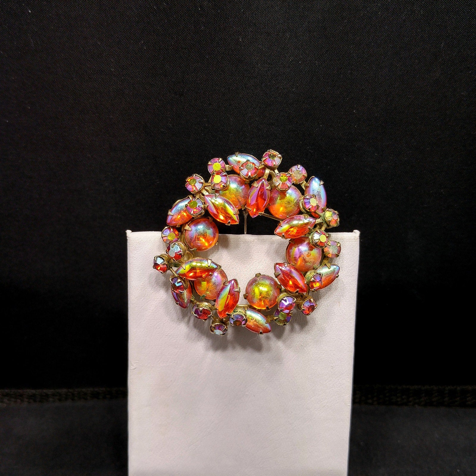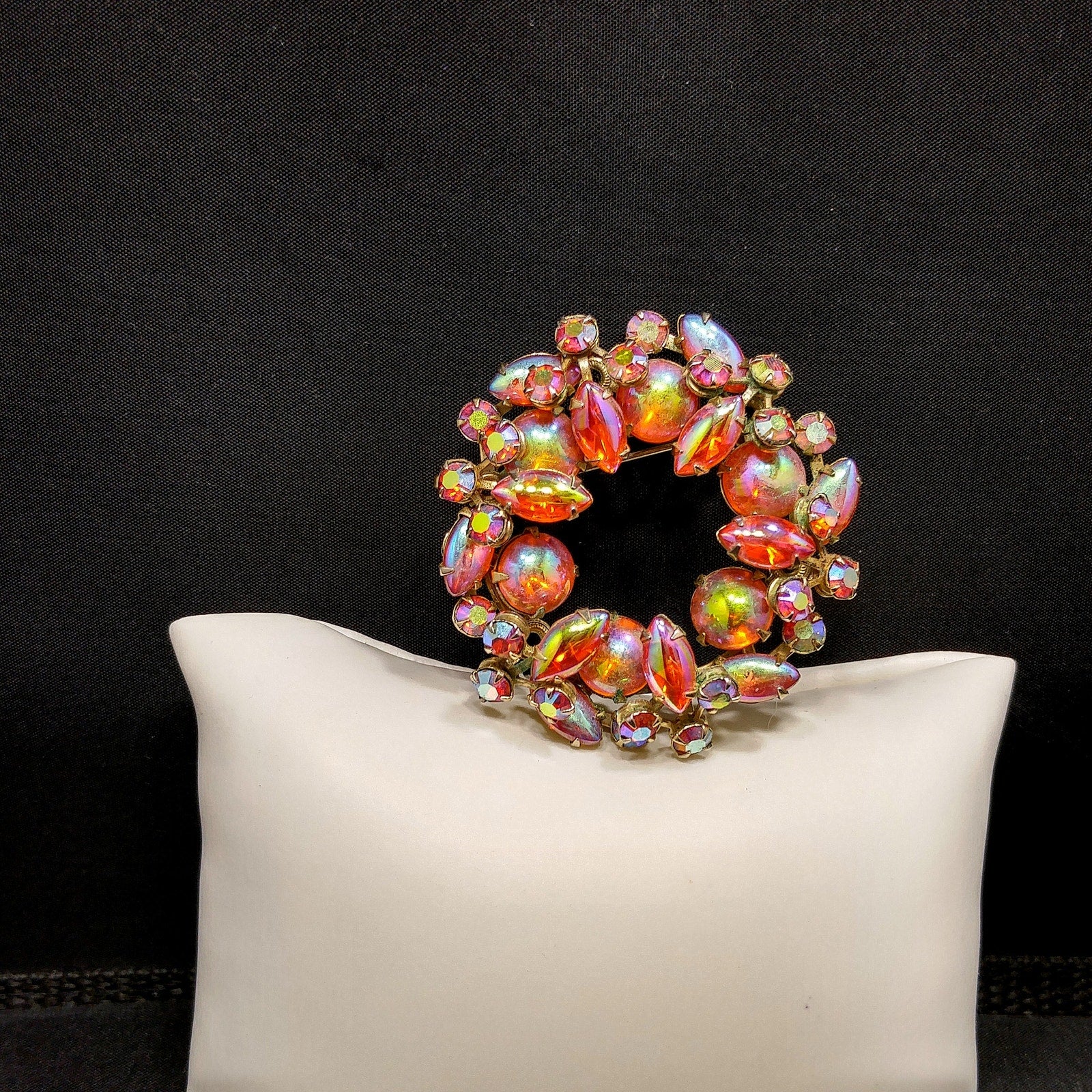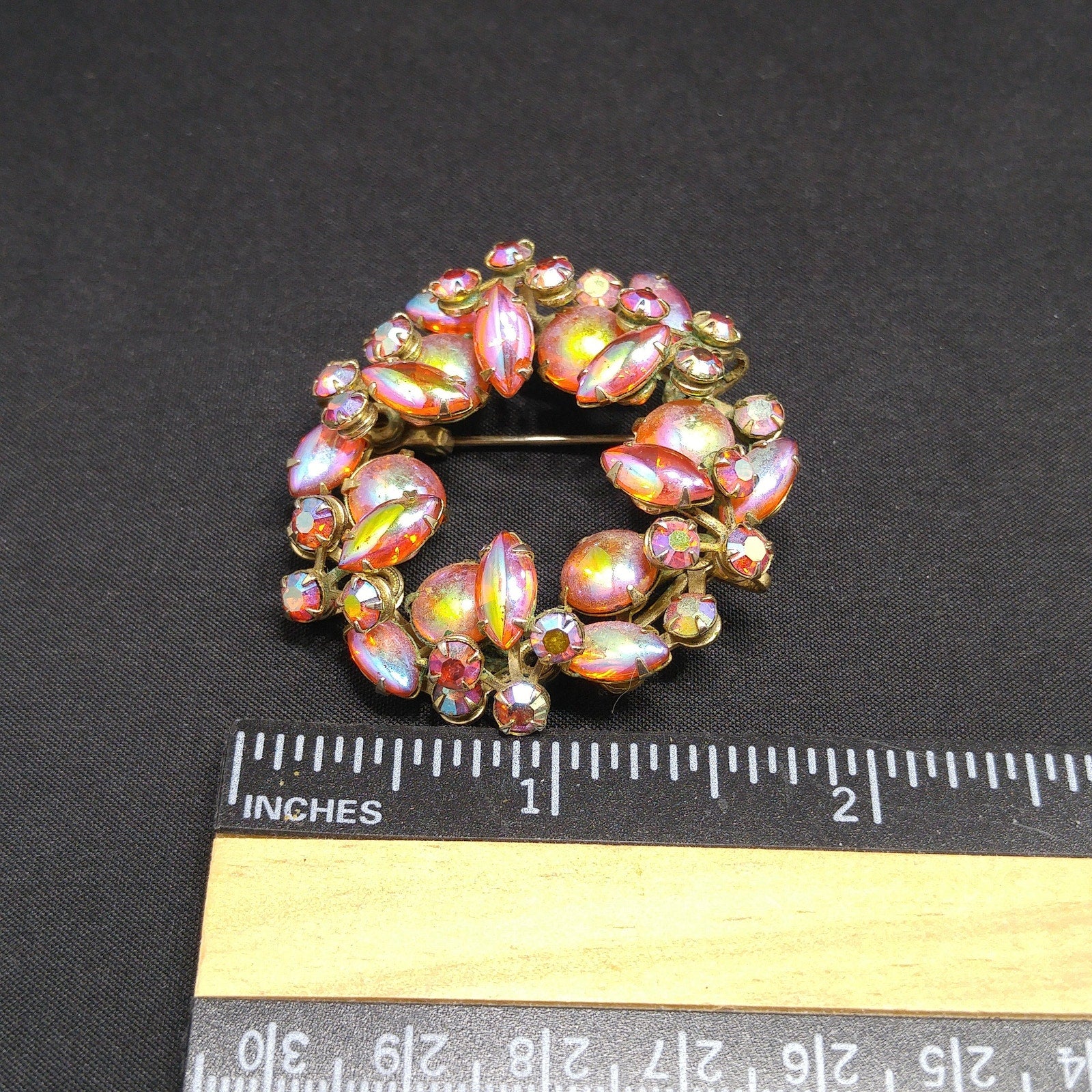 *Description: This is a unique and beautiful pink iridescent art glass wreath brooch from the 1950s. The brooch is a riveted floral design and the rhinestones and art glass are prong set. All stones are in place. Due to the iridescent design, there are multiple colors within the art glass and there is a tint of orange. The rhinestones are aurora borealis so they are reflecting blues and silvers. The brooch is on a gold tone background. This would be a great addition to your vintage jewelry collection or make a great vintage gift!
