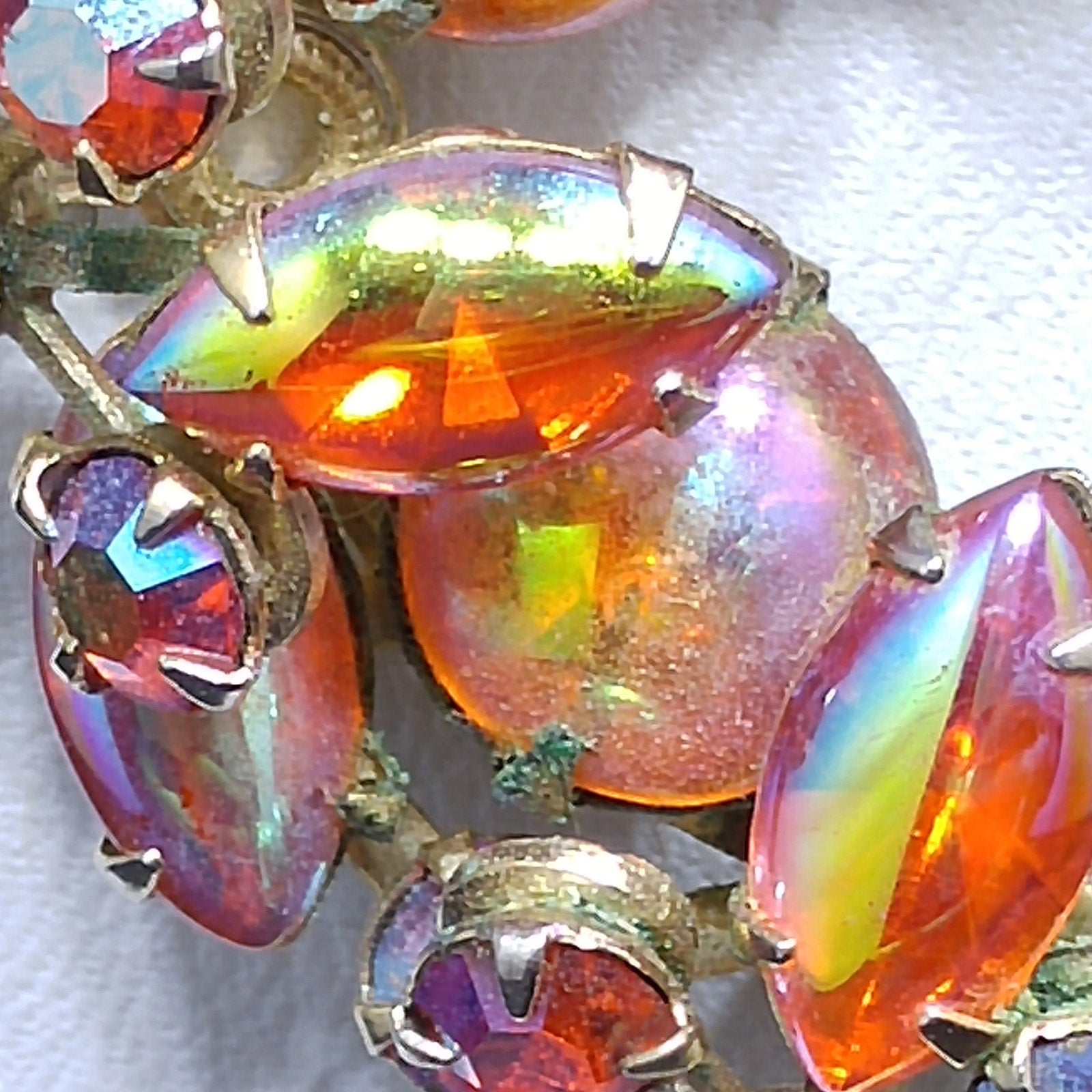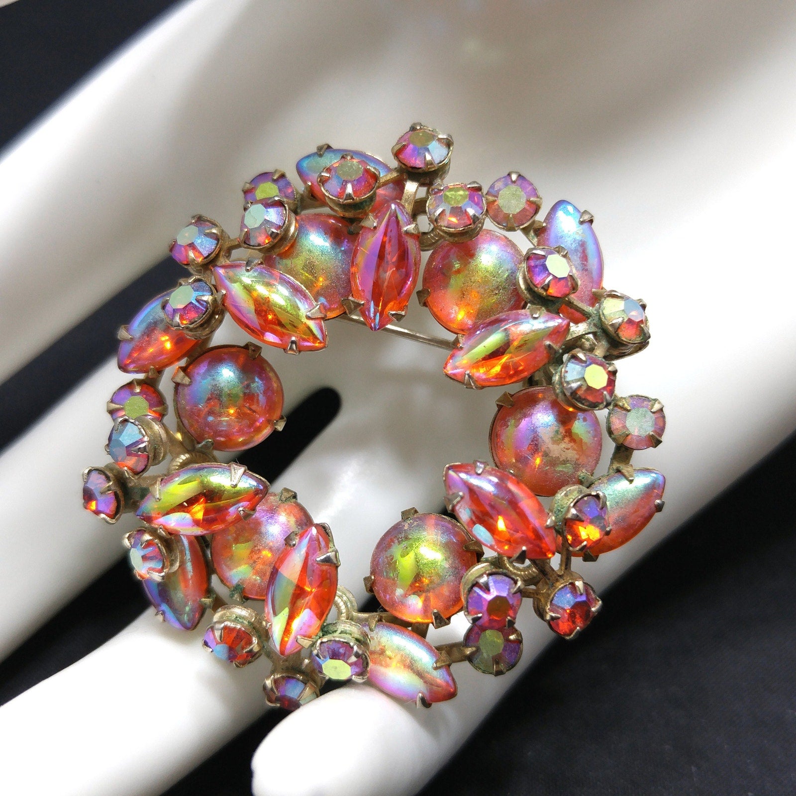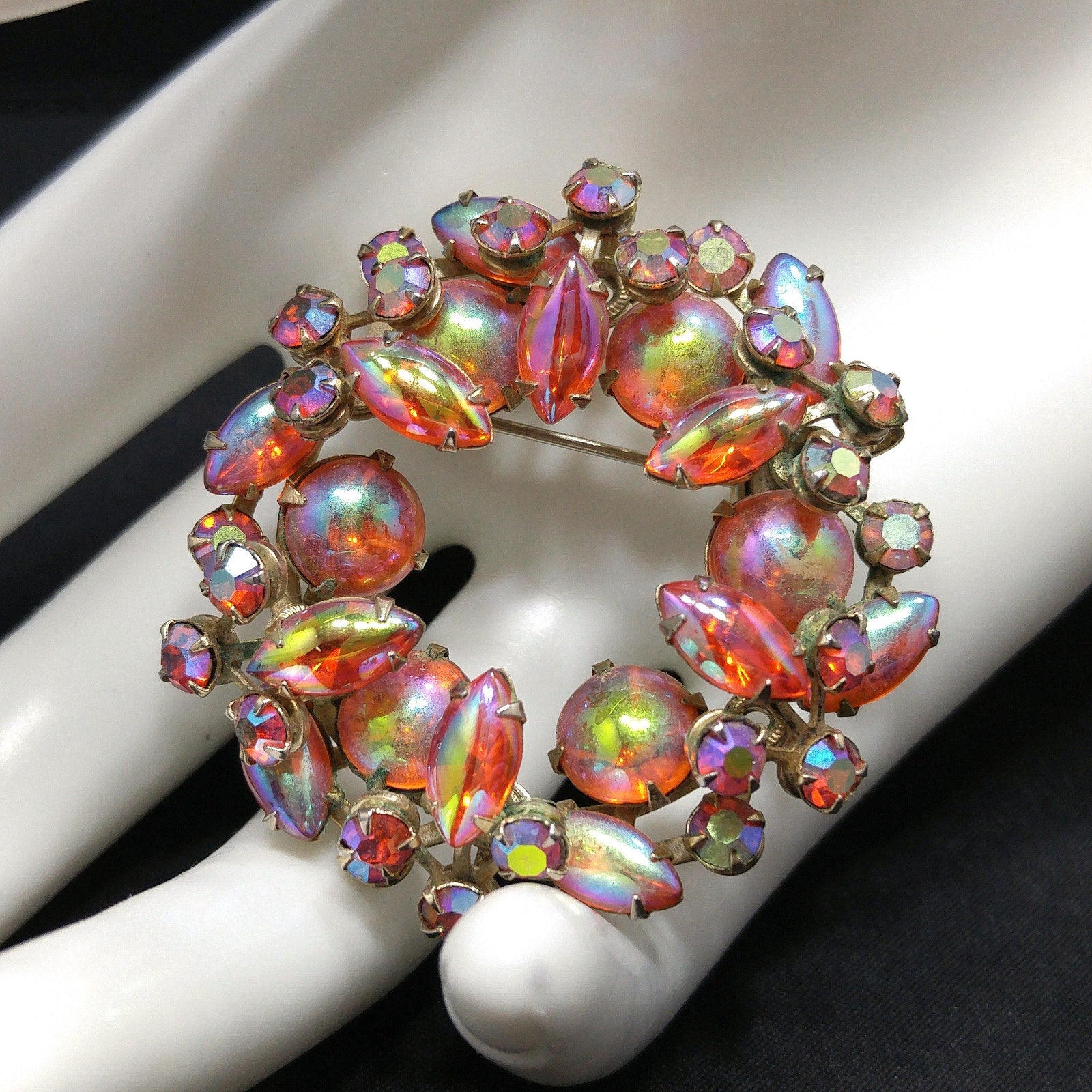 *Description: This is a unique and beautiful pink iridescent art glass wreath brooch from the 1950s. The brooch is a riveted floral design and the rhinestones and art glass are prong set. All stones are in place. Due to the iridescent design, there are multiple colors within the art glass and there is a tint of orange. The rhinestones are aurora borealis so they are reflecting blues and silvers. The brooch is on a gold tone background. This would be a great addition to your vintage jewelry collection or make a great vintage gift!