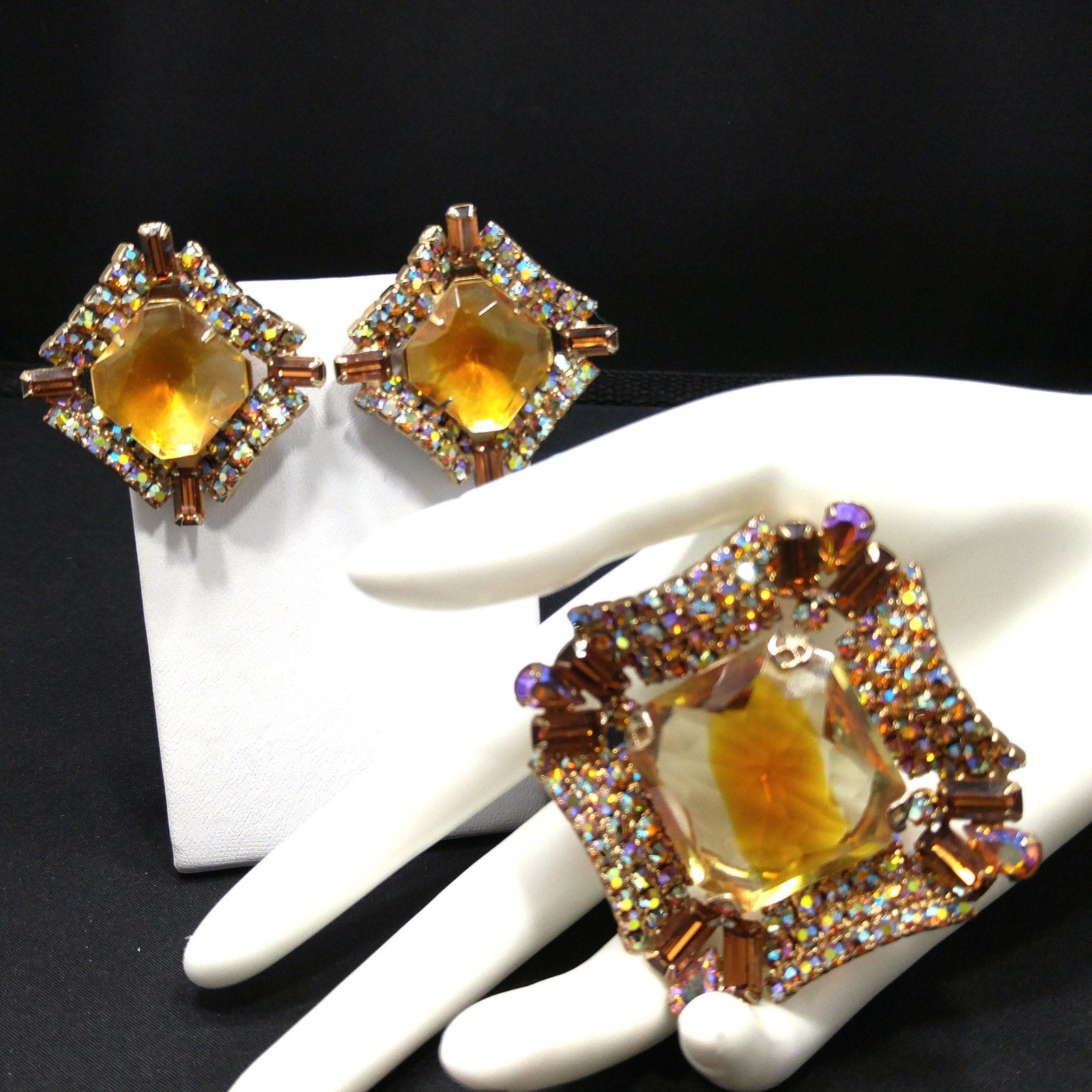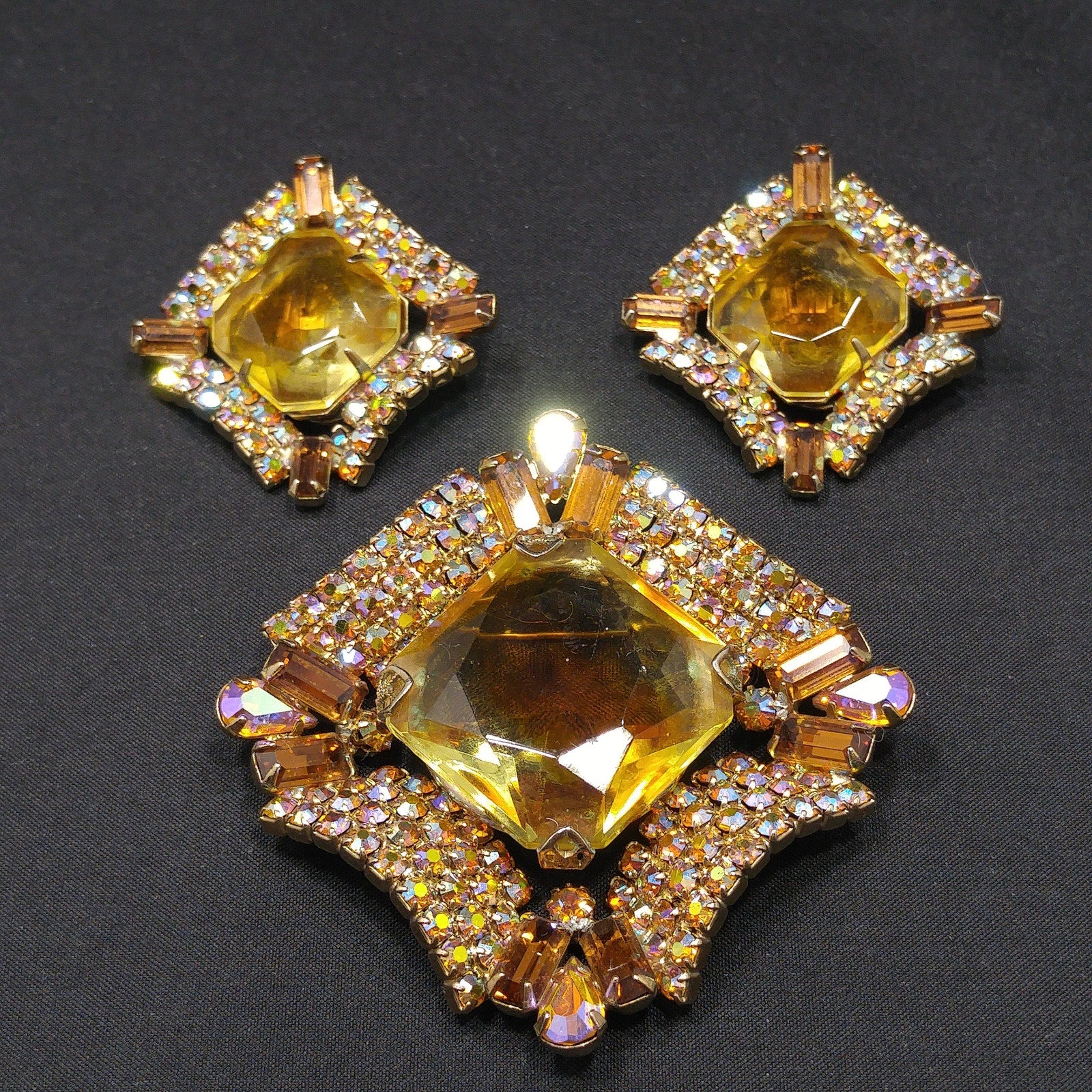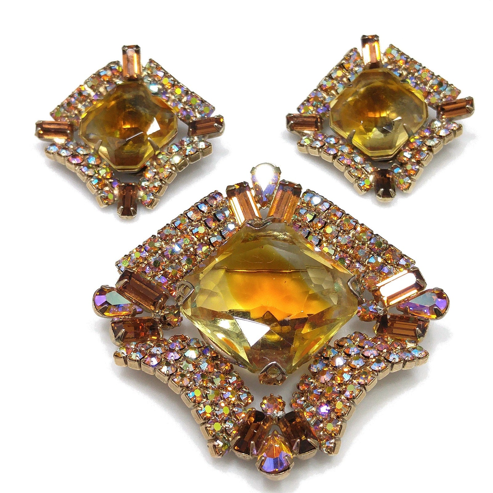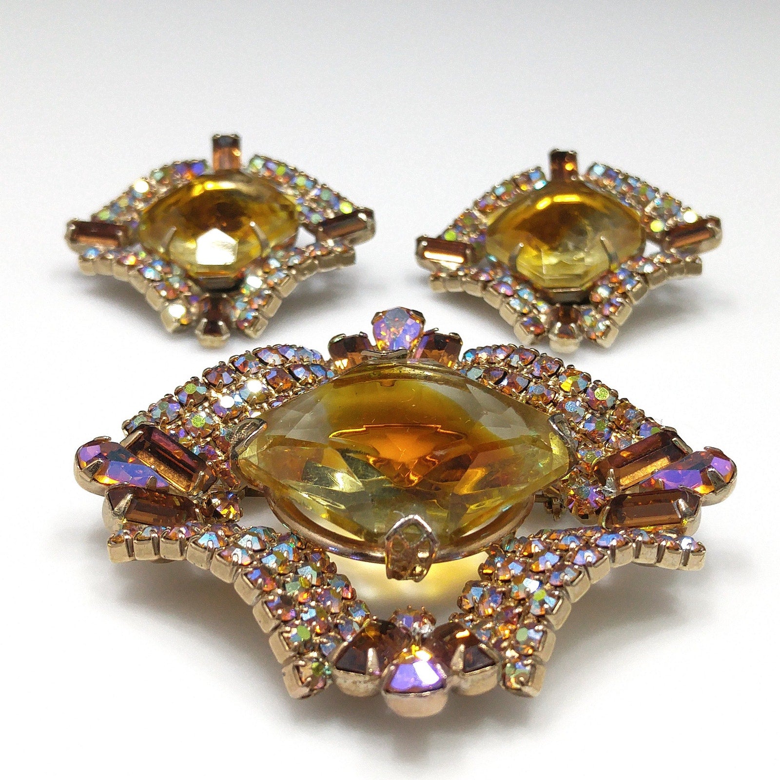*Description: This is a gorgeous mid-century modern light topaz glass rhinestone brooch and matching clip earrings from the 1960s. The brooch has a large glass faceted center and is prong set. Around the center faceted glass is aurora borealis rhinestones in several cuts which include teardrop, baguette, and chaton cuts. The matching earrings are a replica of the brooch and are clip earrings. The corner aurora borealis rhinestones on the earrings are baguette cut. Each rhinestone is set is gold plated metal and they are designer quality. They must have had a paper tag as they are not signed. Gorgeous set which would be a great addition to your vintage jewelry collection or make a great vintage gift!