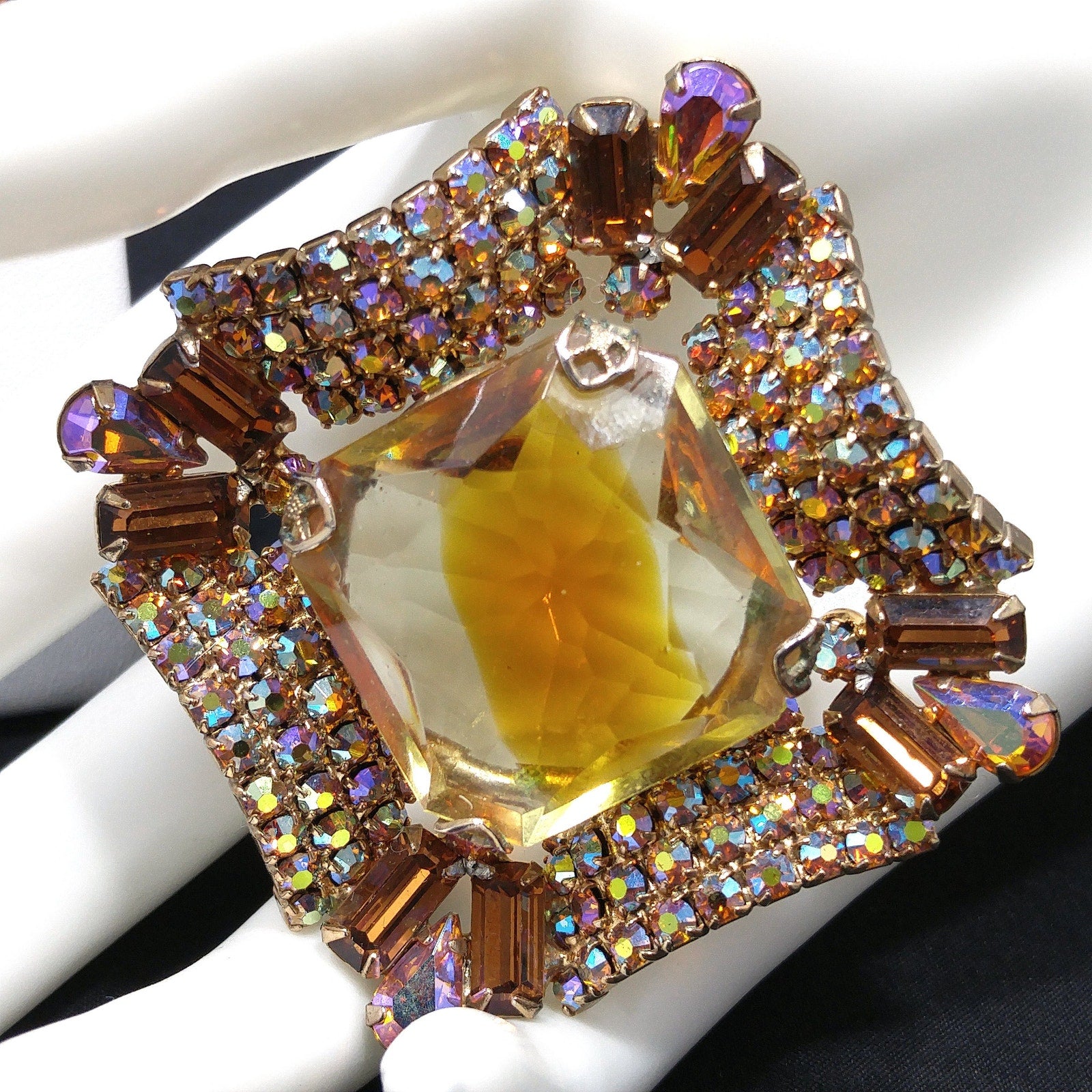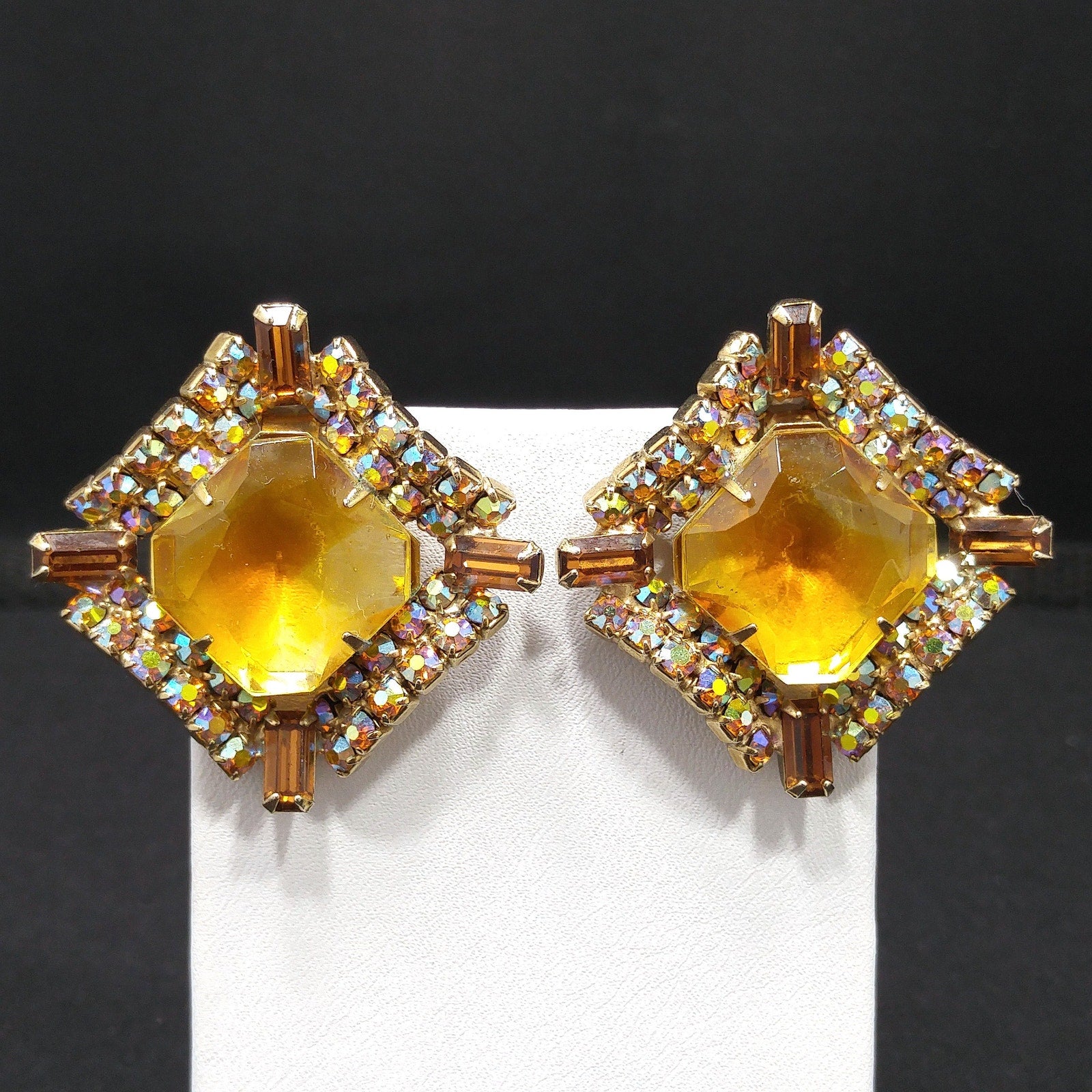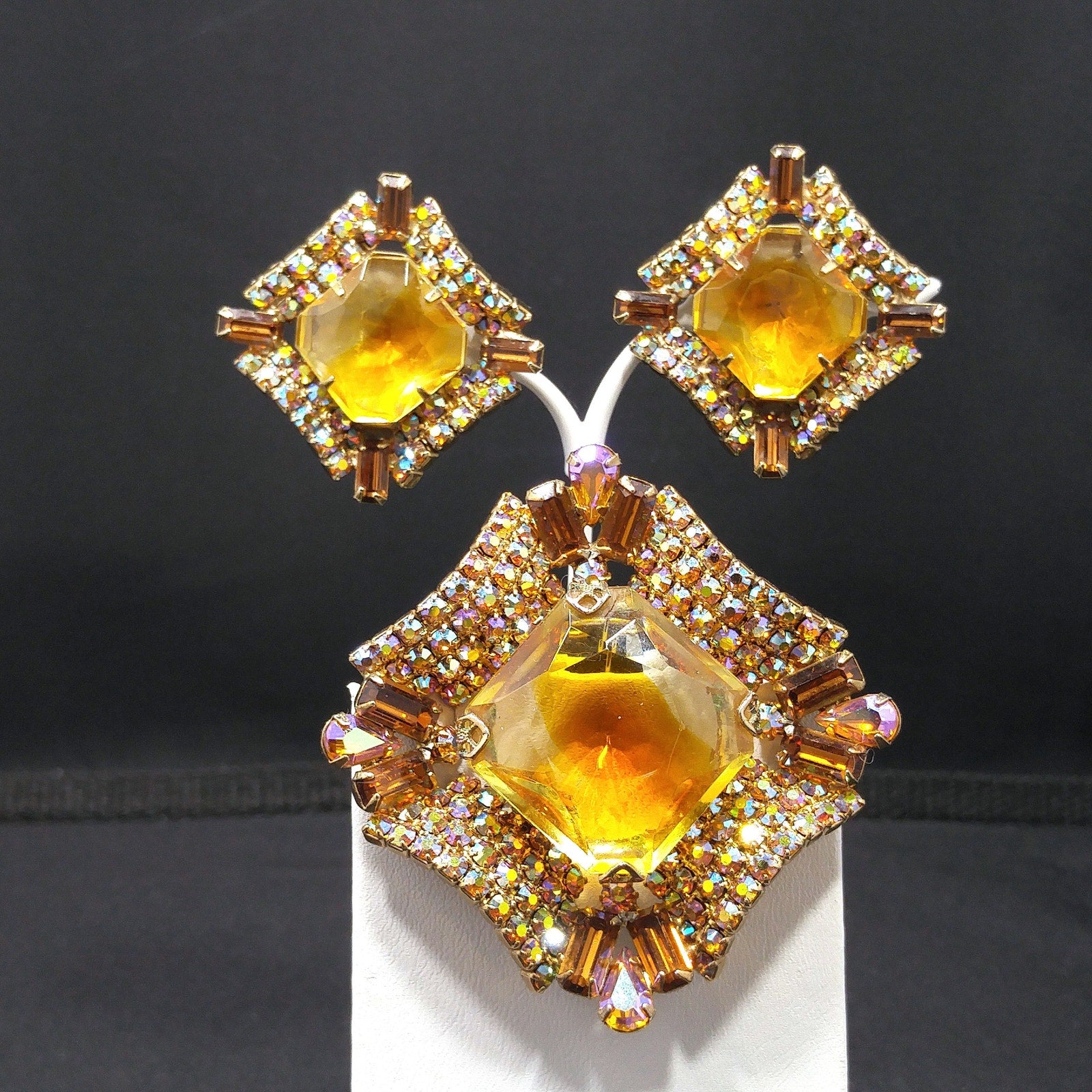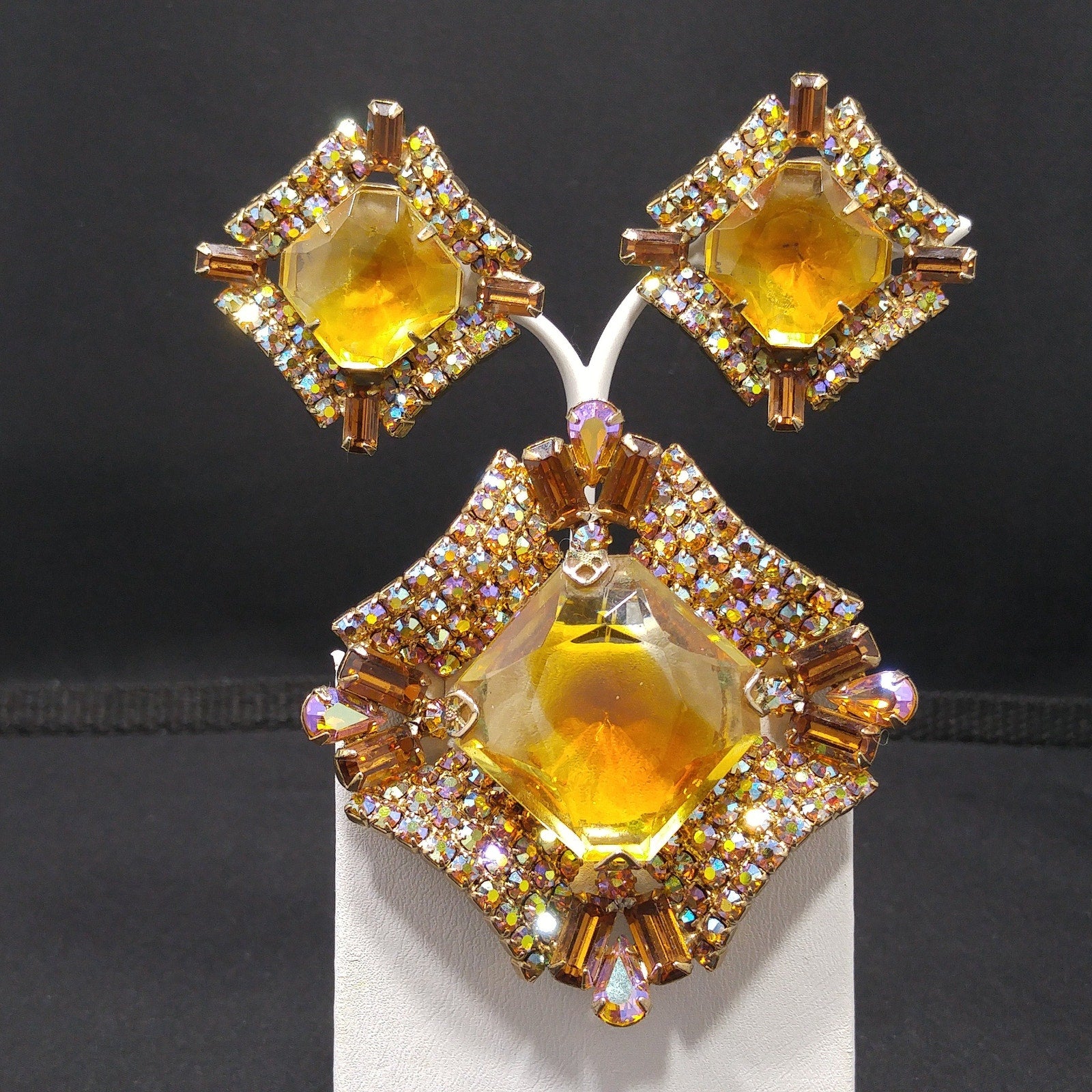 *Description: This is a gorgeous mid-century modern light topaz glass rhinestone brooch and matching clip earrings from the 1960s. The brooch has a large glass faceted center and is prong set. Around the center faceted glass is aurora borealis rhinestones in several cuts which include teardrop, baguette, and chaton cuts. The matching earrings are a replica of the brooch and are clip earrings. The corner aurora borealis rhinestones on the earrings are baguette cut. Each rhinestone is set is gold plated metal and they are designer quality. They must have had a paper tag as they are not signed. Gorgeous set which would be a great addition to your vintage jewelry collection or make a great vintage gift!