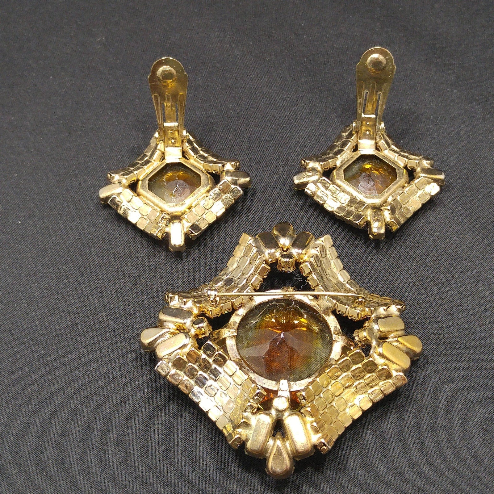 Mid-Century Modern Large Topaz Glass Brooch & Earrings, Gold Plated, 1960s Vintage Jewelry