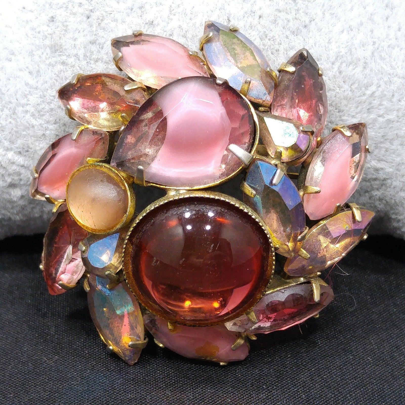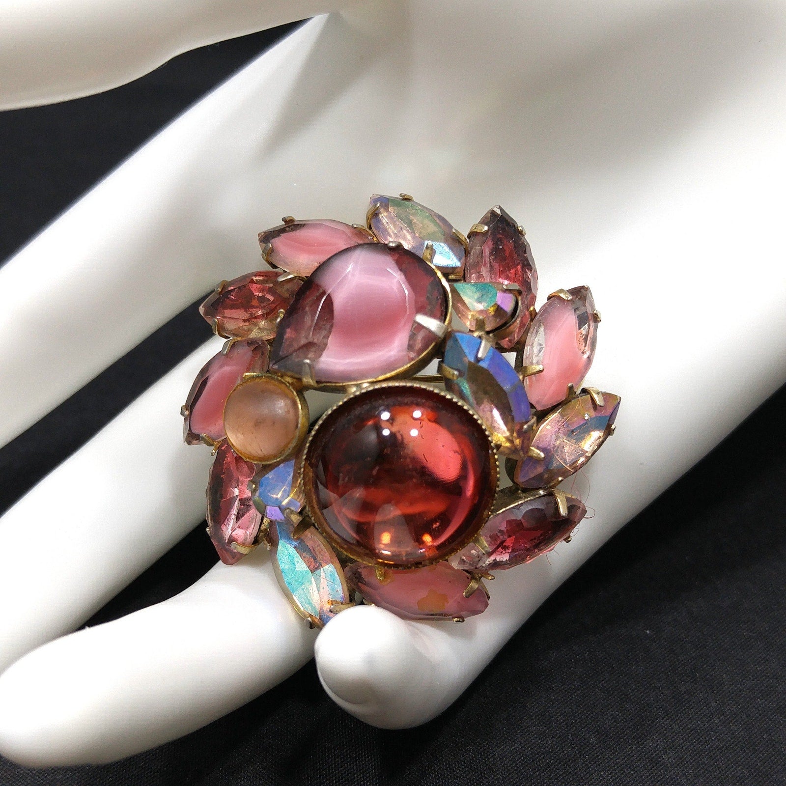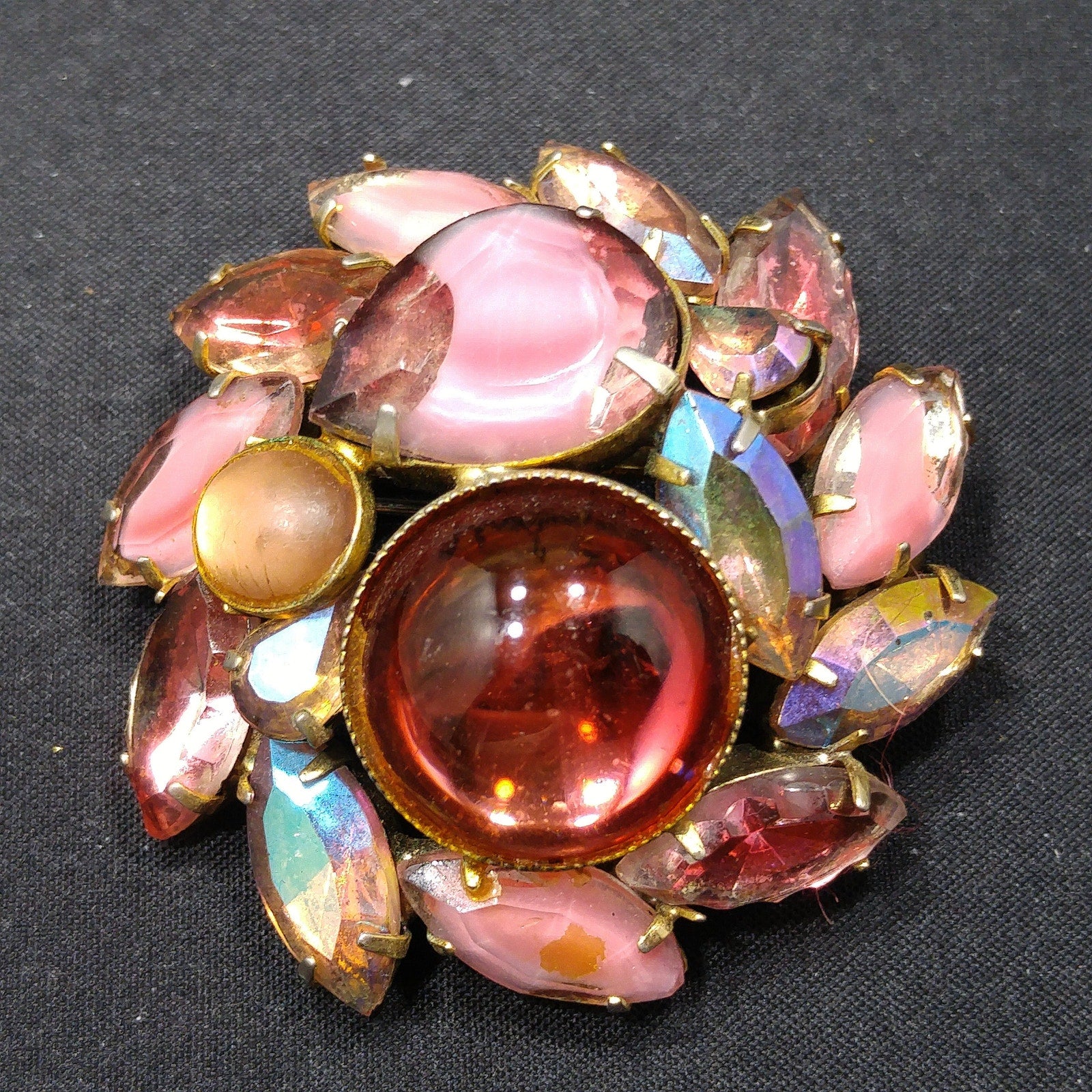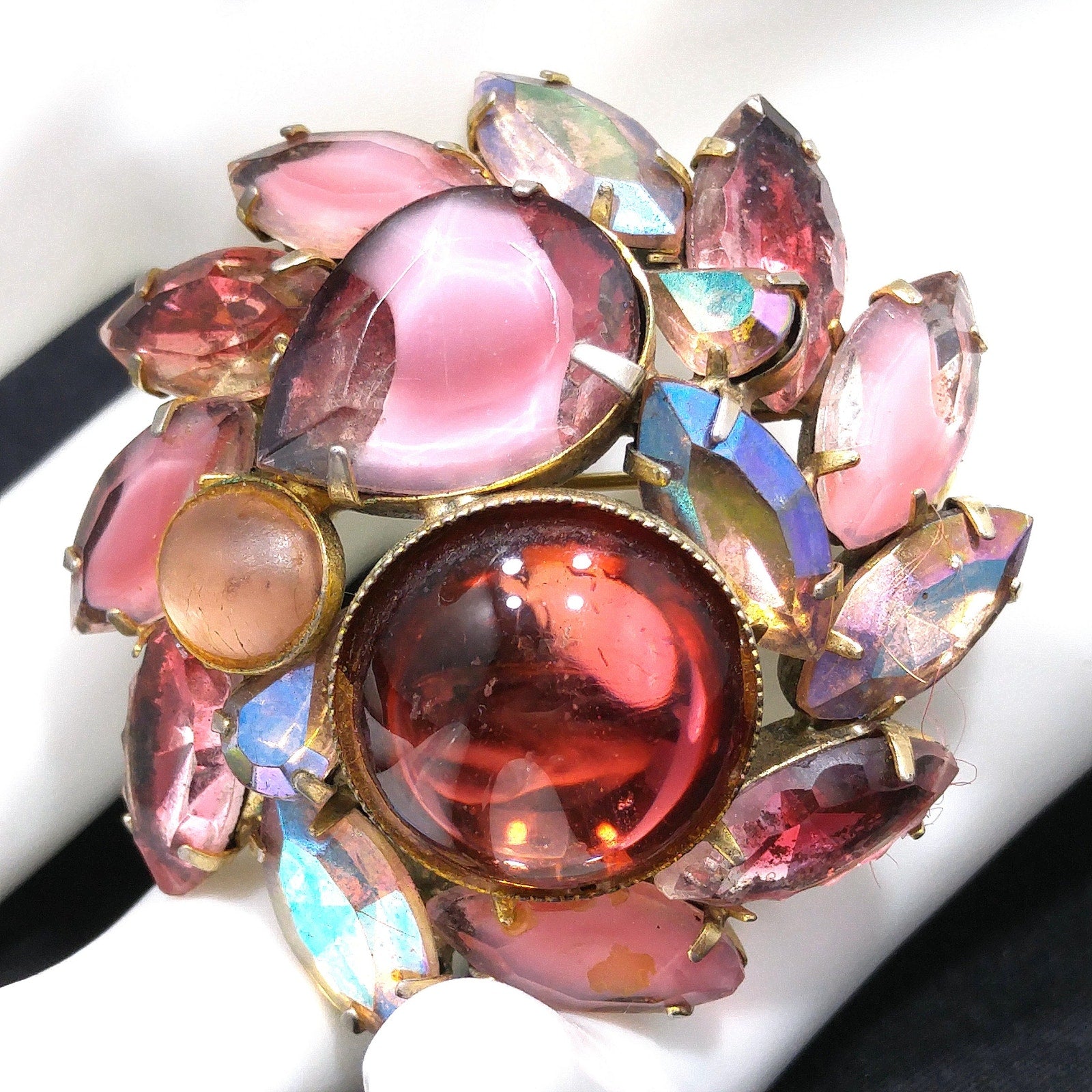 *Description: This is a beautiful mid-century pink art glass brooch from the 1950s. The domed design has Czech fire polished rhinestones and pink art glass rhinestones which are clear with pink glass blown inside. There is a darker pink red cabochon near the top of the dome with is very polished and another pear shape art glass cabochons which has the clear glass with the pink blown inside. The brooch is very unique in design and is on an antique gold plated setting. This would be a great addition to your vintage jewelry collection or make a great vintage gift!