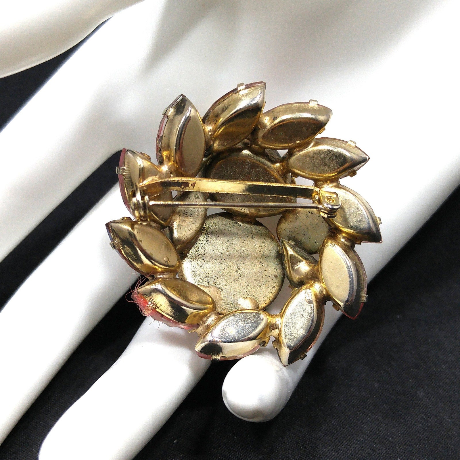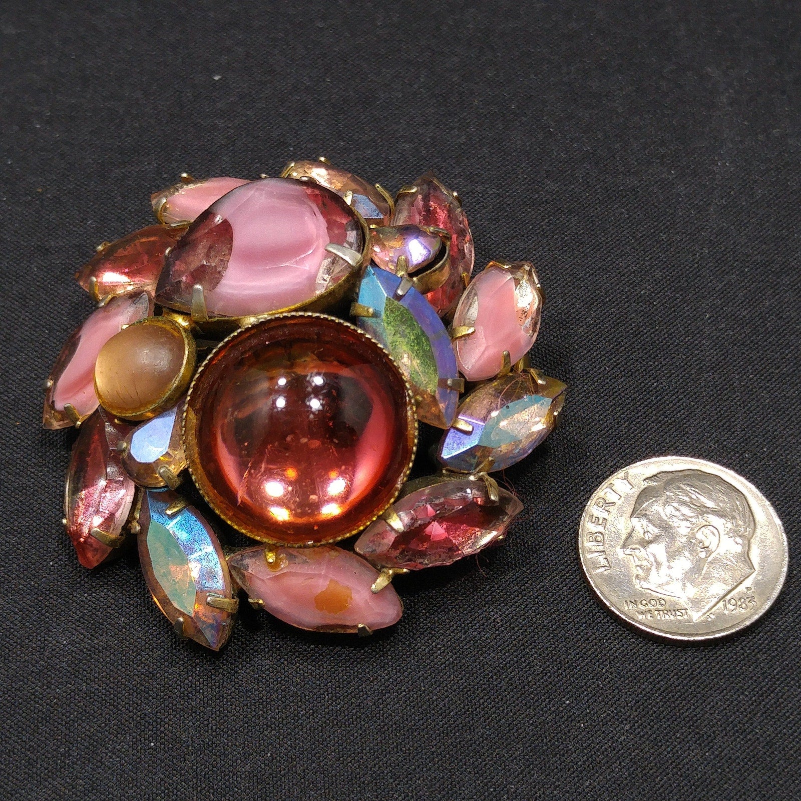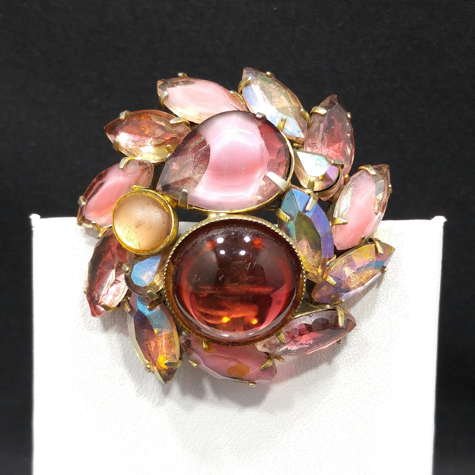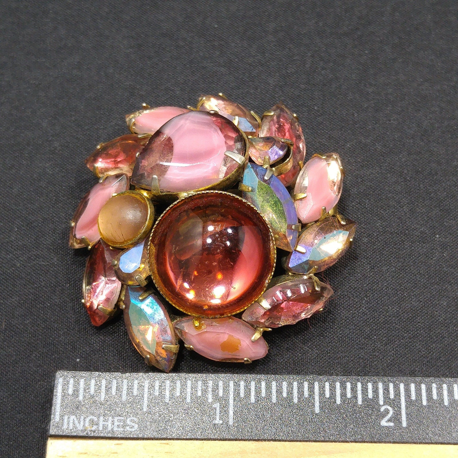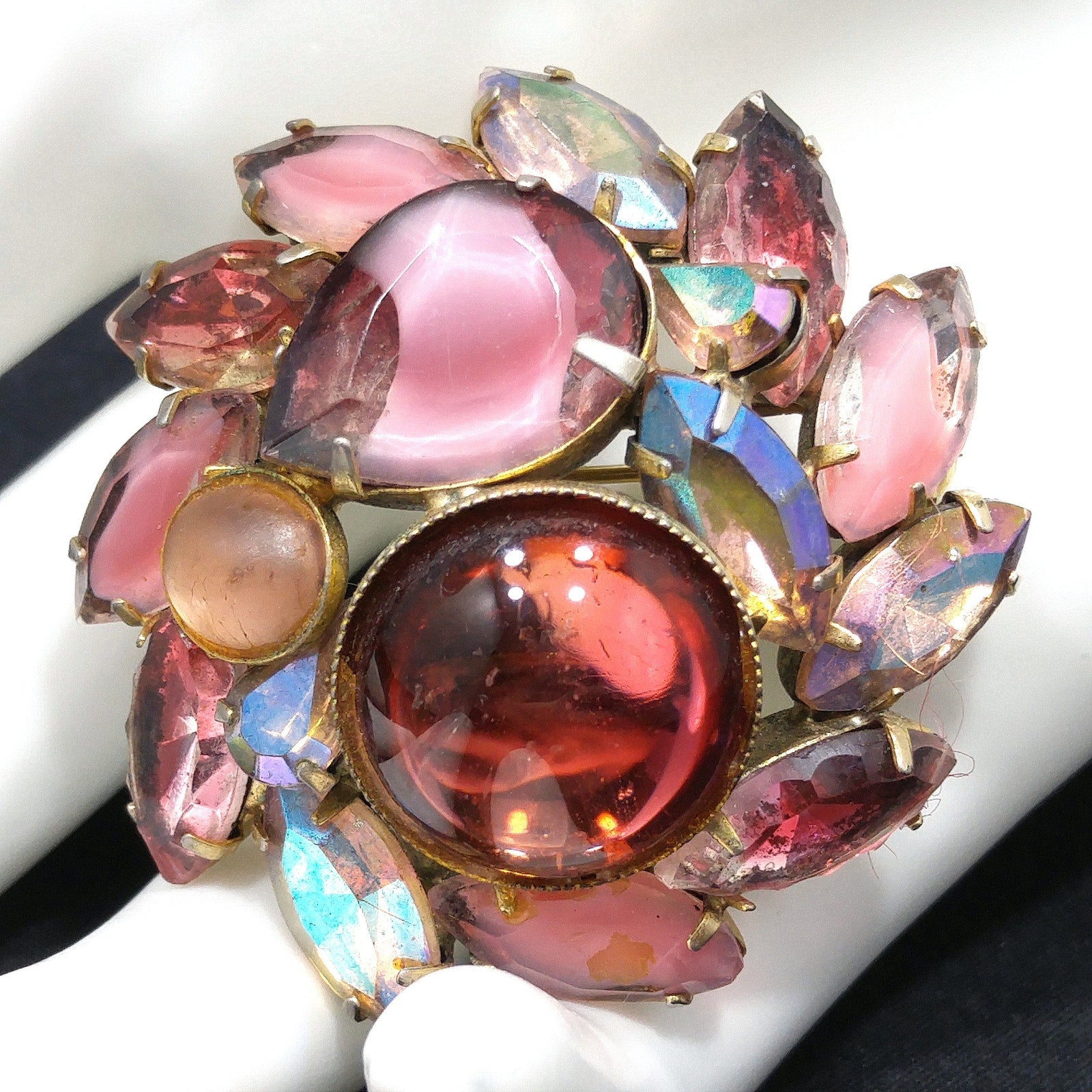 *Description: This is a beautiful mid-century pink art glass brooch from the 1950s. The domed design has Czech fire polished rhinestones and pink art glass rhinestones which are clear with pink glass blown inside. There is a darker pink red cabochon near the top of the dome with is very polished and another pear shape art glass cabochons which has the clear glass with the pink blown inside. The brooch is very unique in design and is on an antique gold plated setting. This would be a great addition to your vintage jewelry collection or make a great vintage gift!