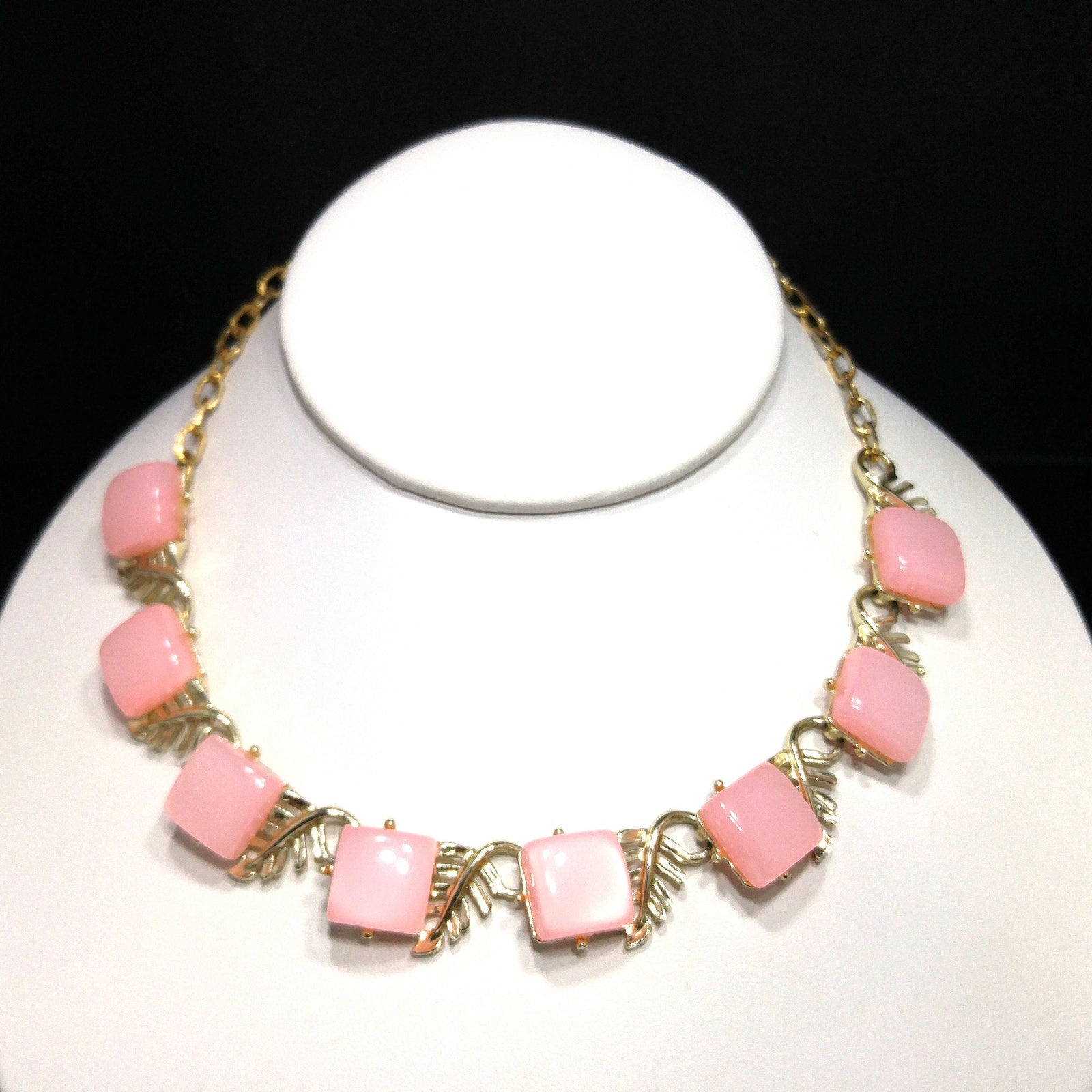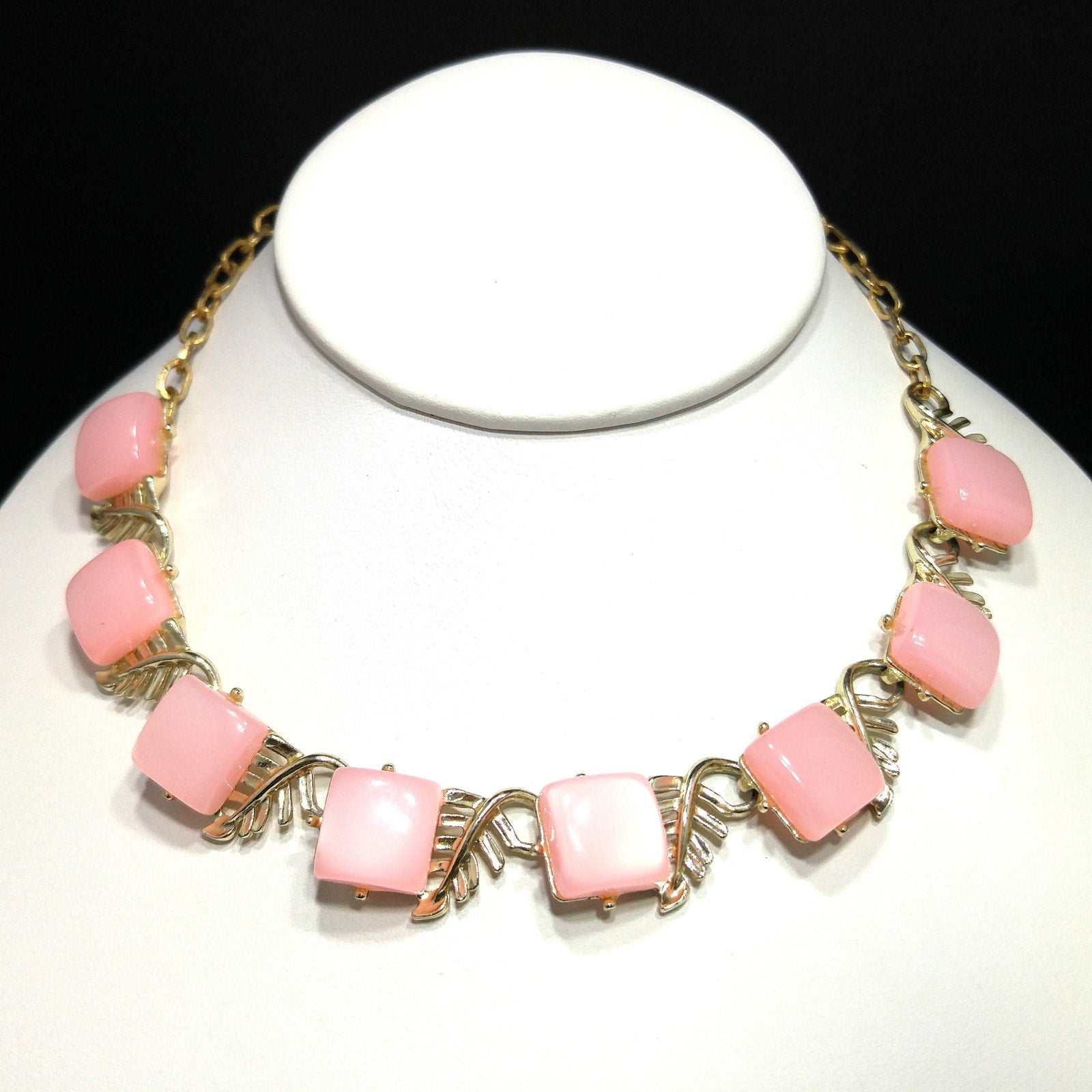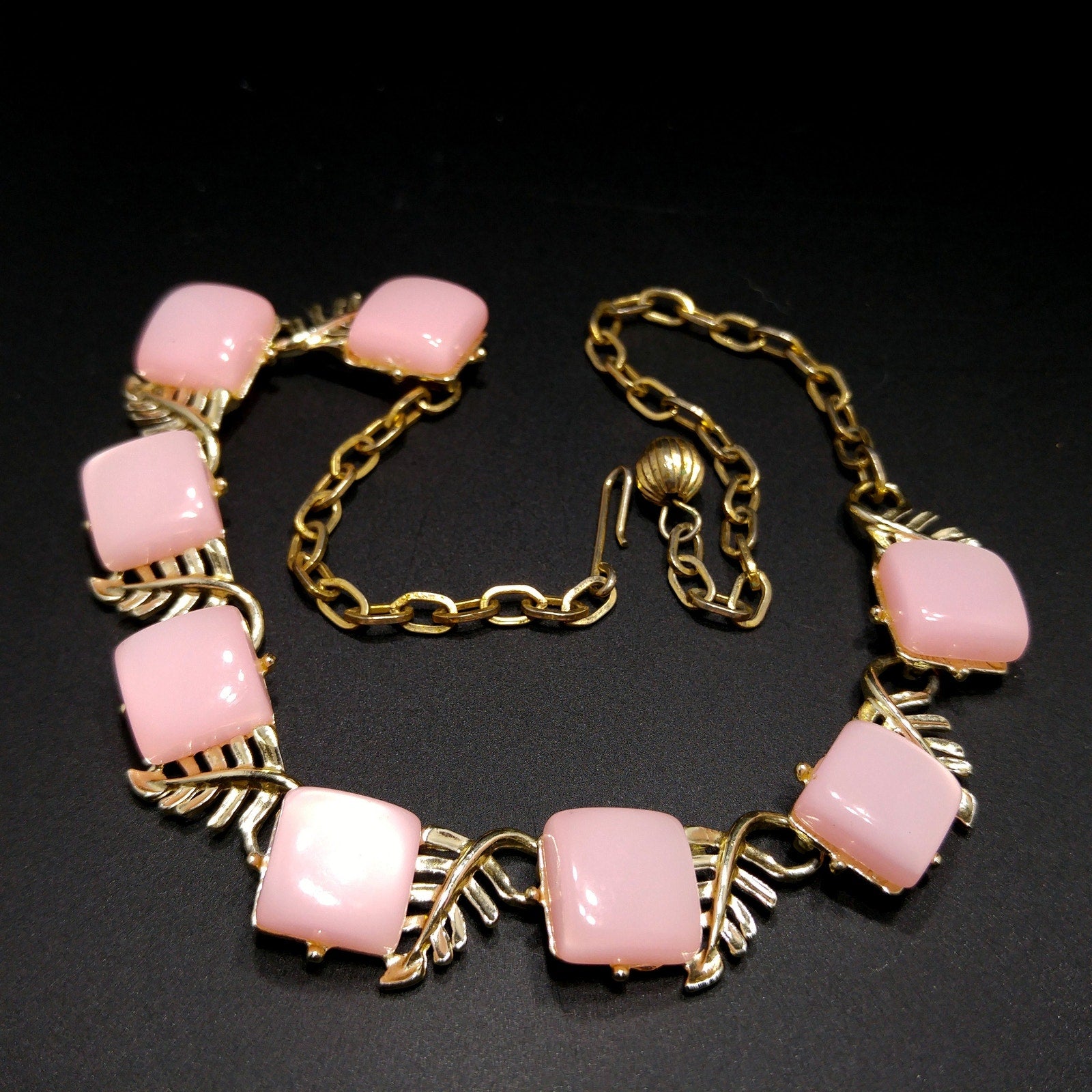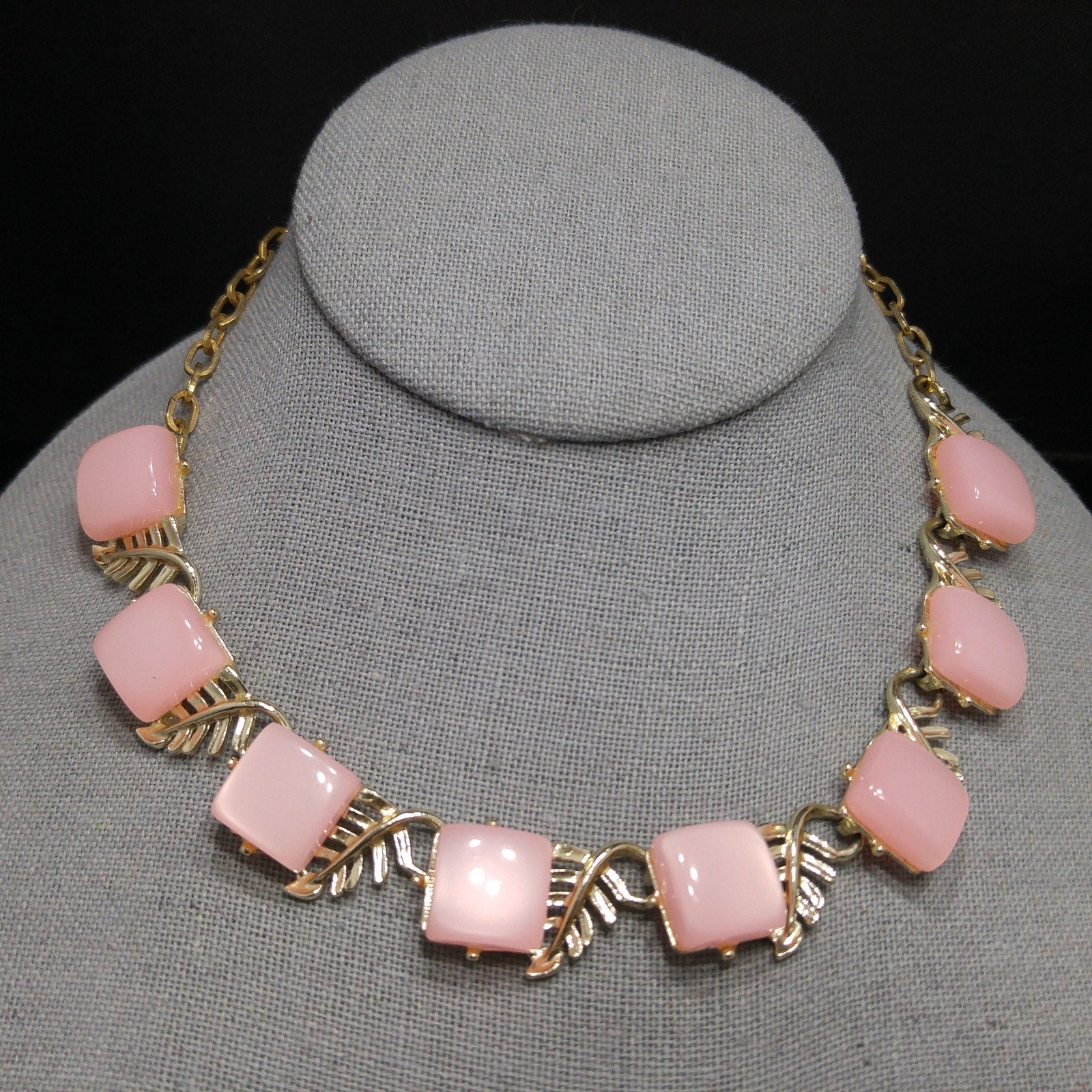 *Description: This is a beautiful mid-century pink Moonglow Lucite squares choker necklace in gold tone with open work leaves on each link from the 1950s. This would be a great addition to your vintage jewelry collection or make a great vintage gift!