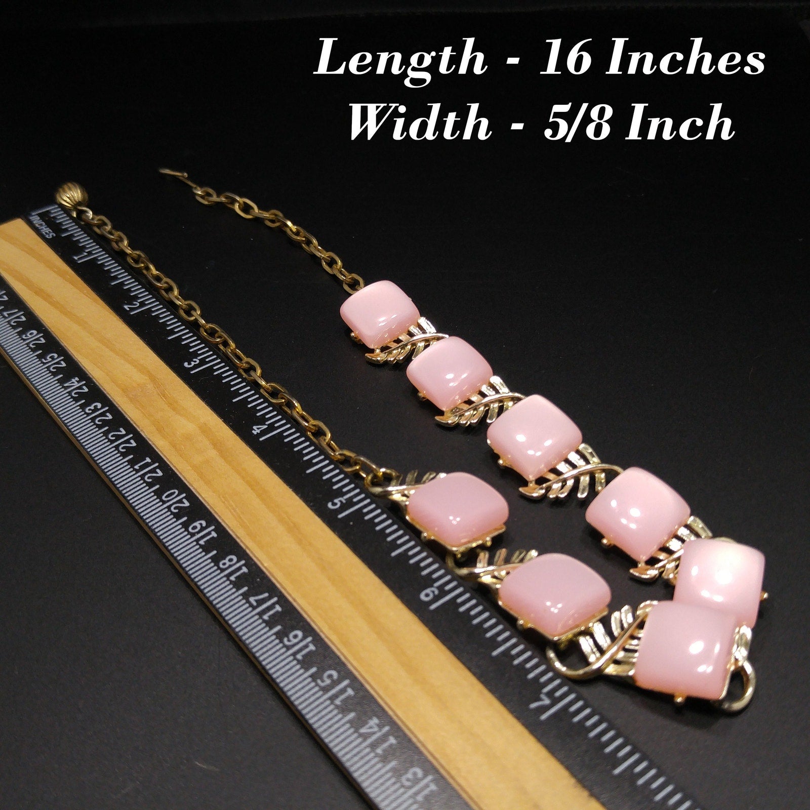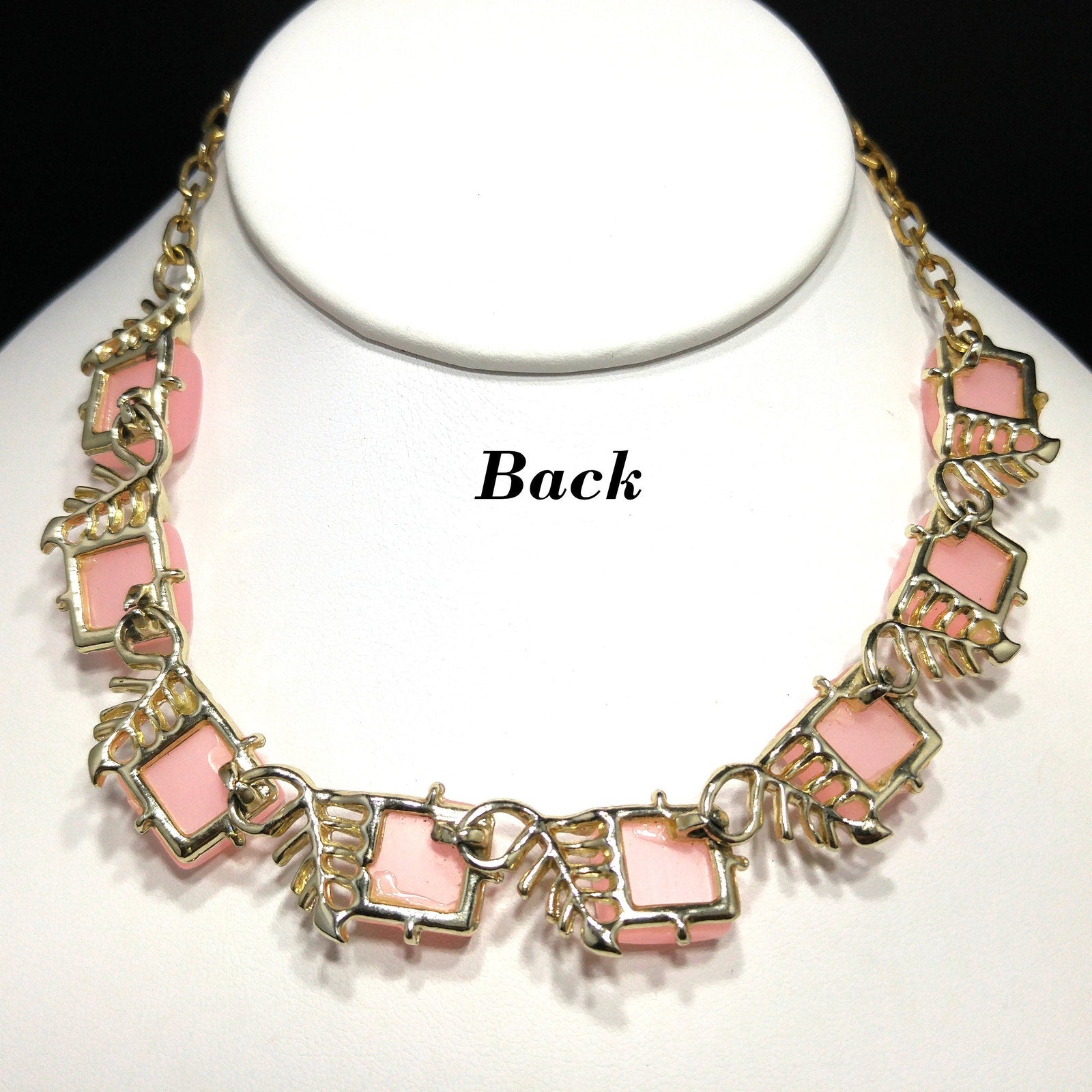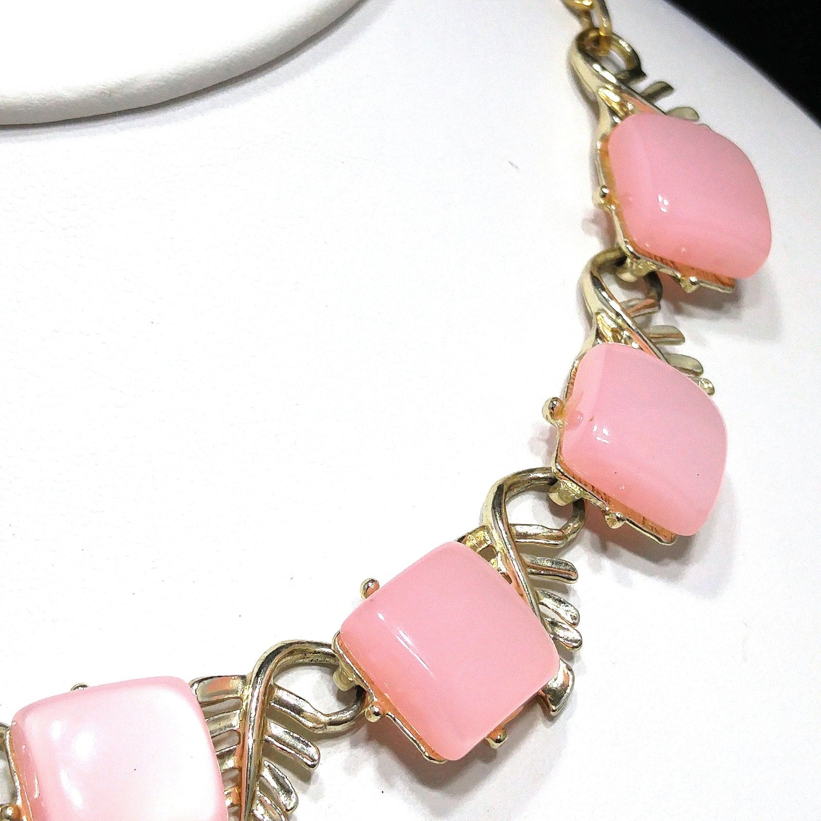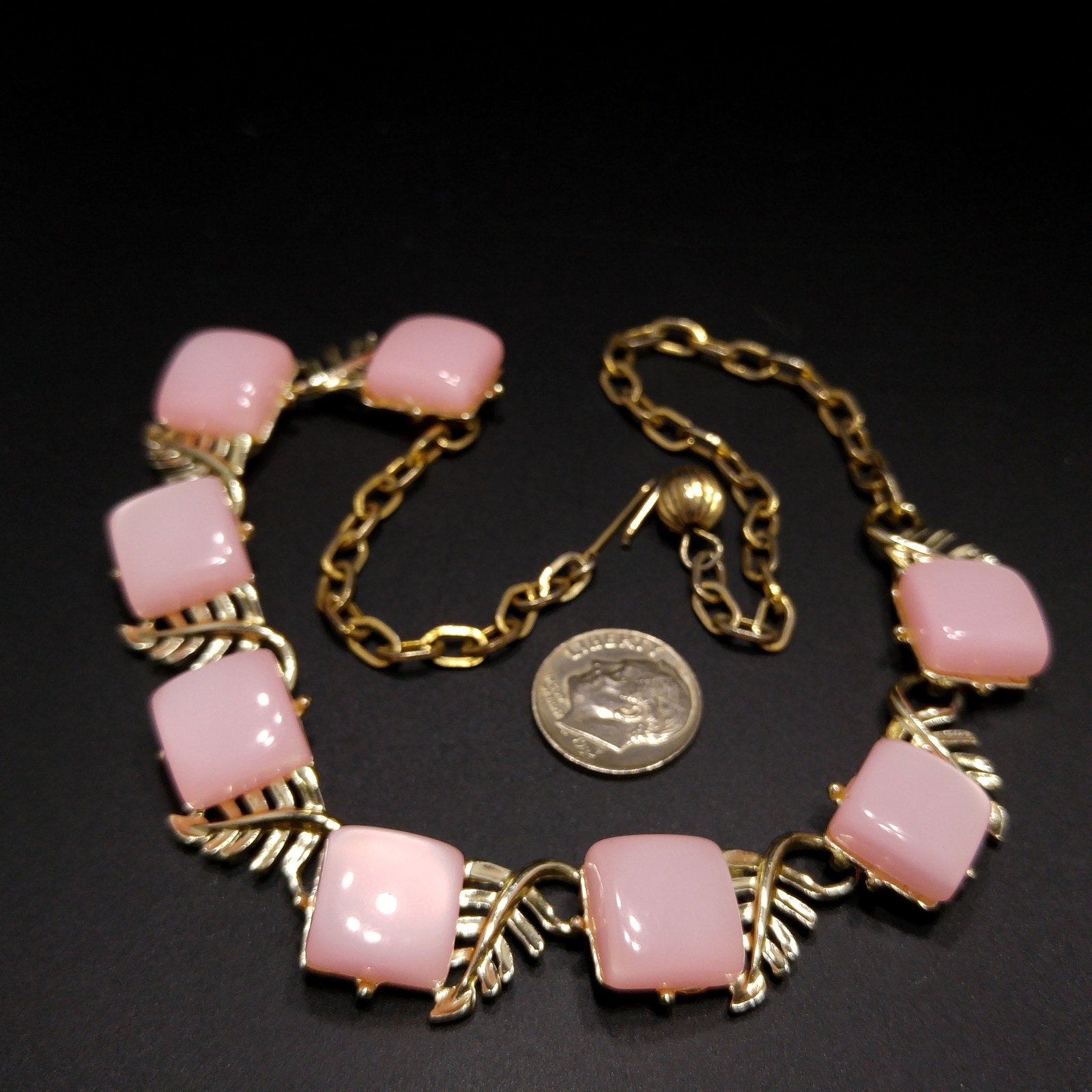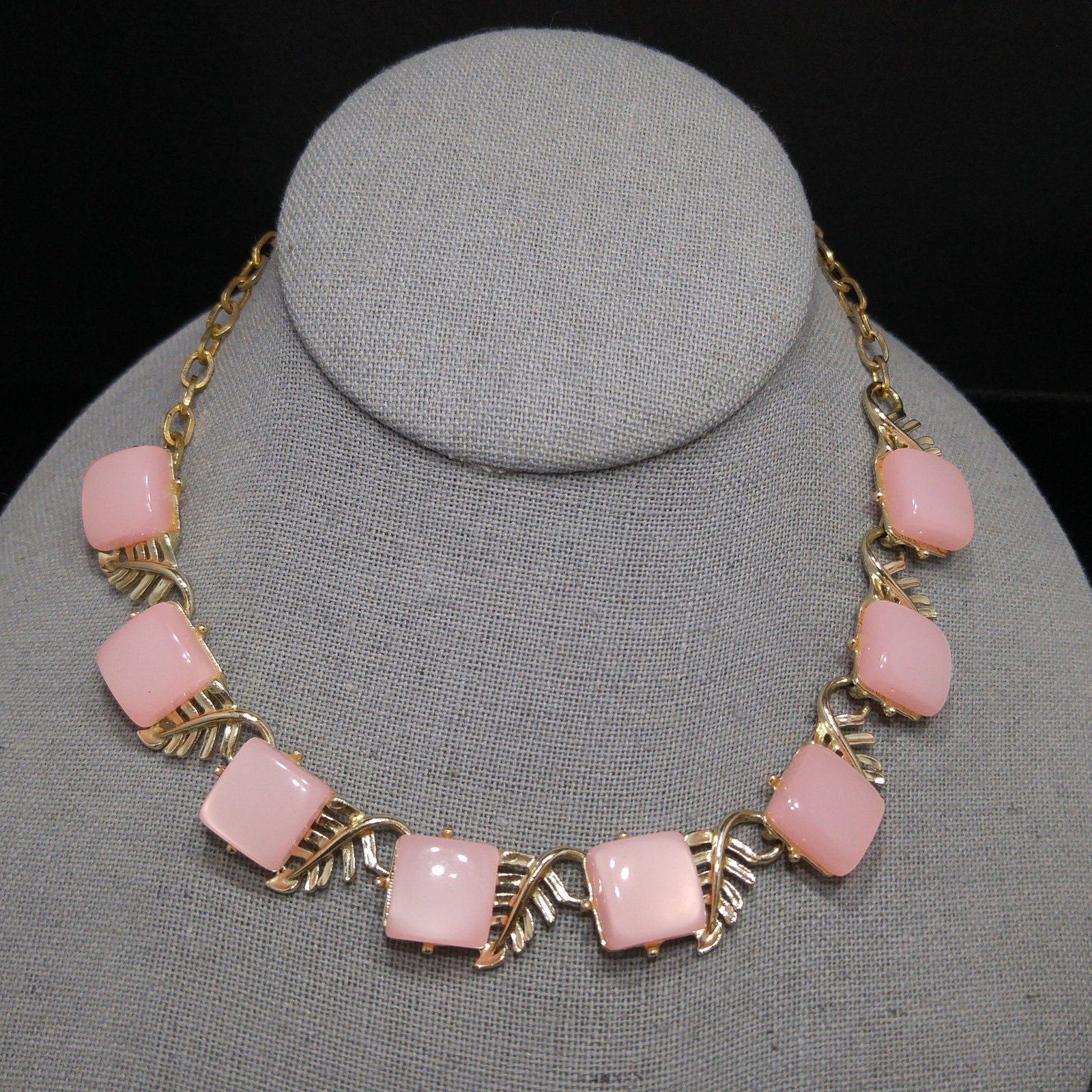 *Description: This is a beautiful mid-century pink Moonglow Lucite squares choker necklace in gold tone with open work leaves on each link from the 1950s. This would be a great addition to your vintage jewelry collection or make a great vintage gift!