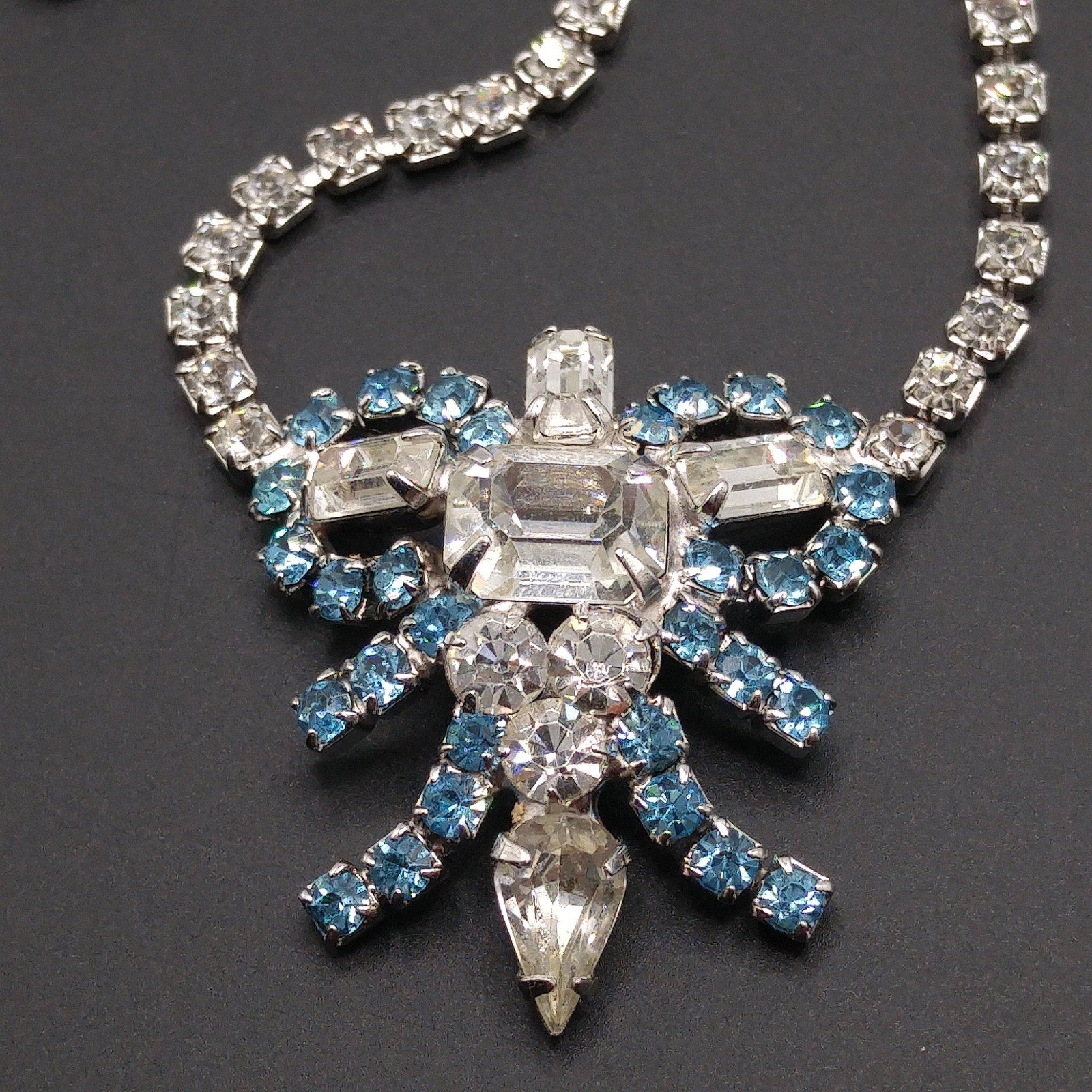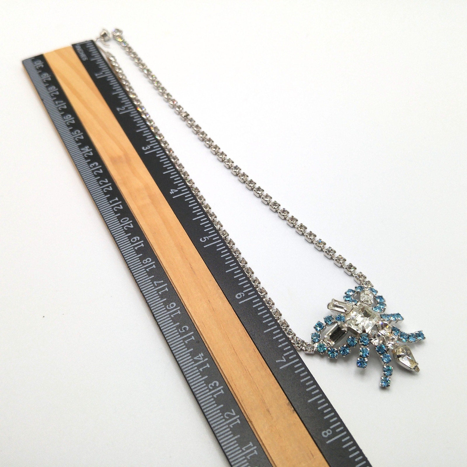 Mid-Century Turquoise Blue Clear Rhinestone Choker Necklace, Rhodium Plated, 1960s Vintage Jewelry