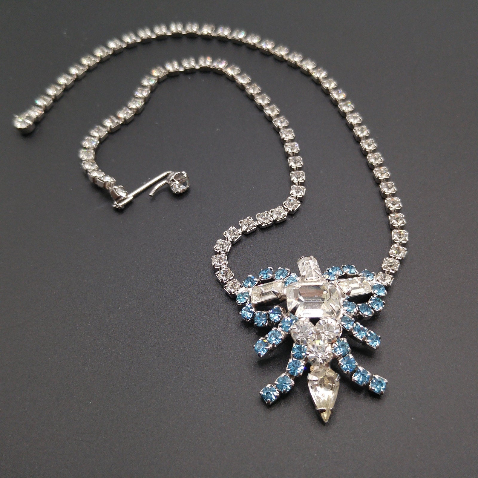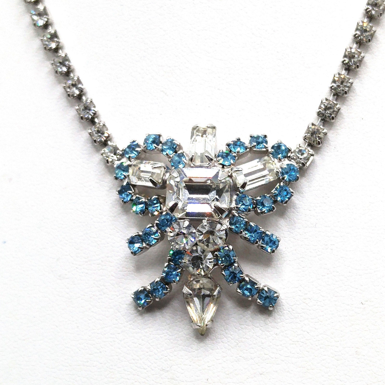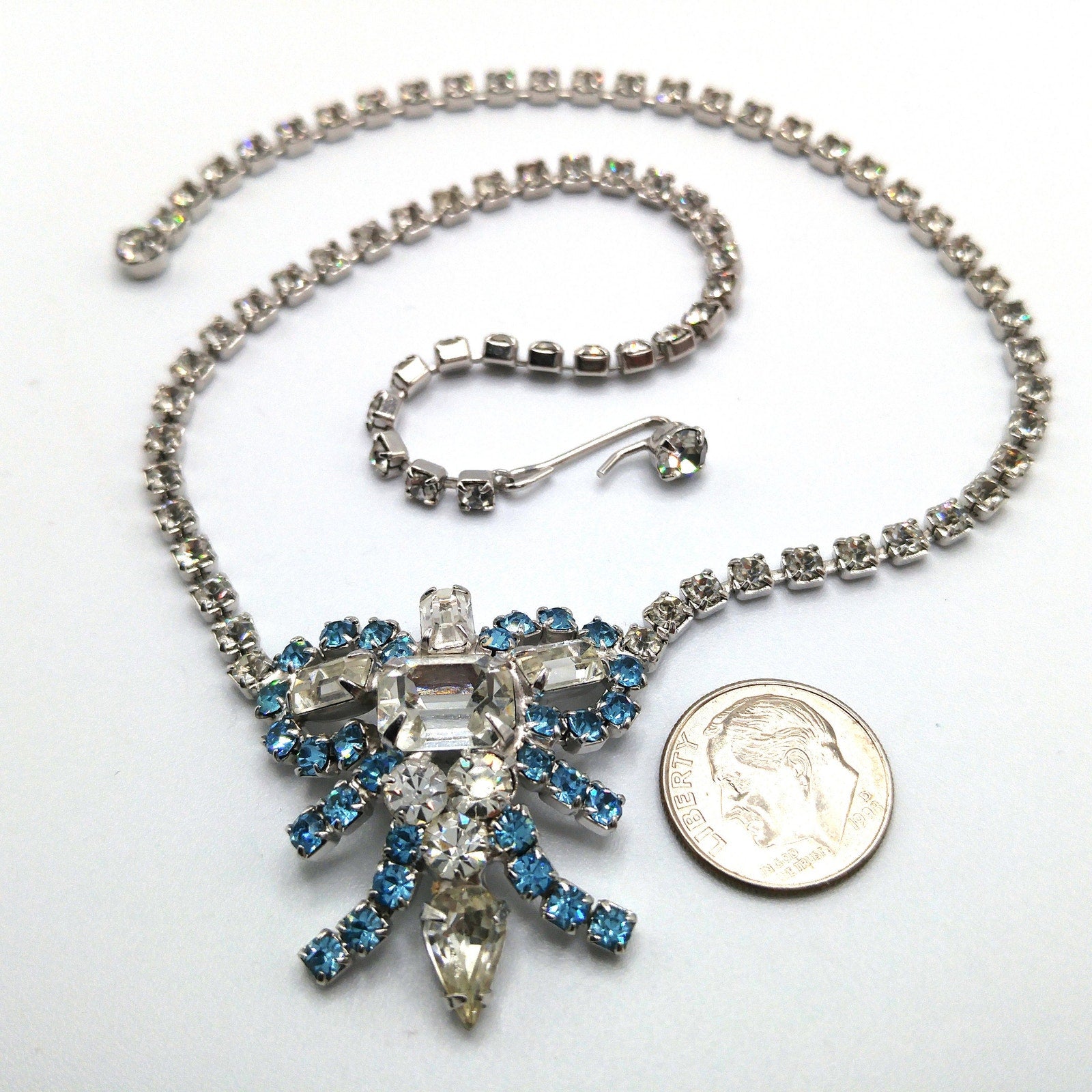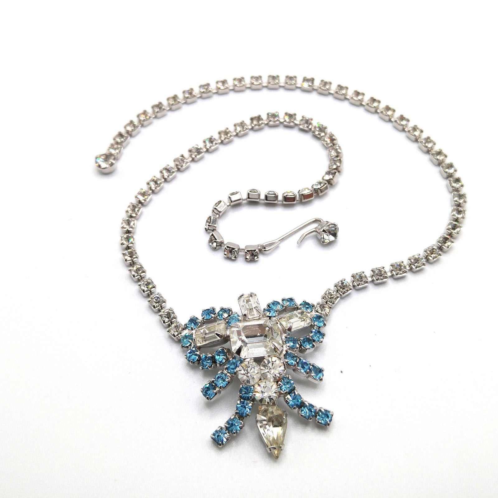 *Description: This is a beautiful vintage turquoise and clear rhinestone pendant necklace on a rhodium plated backing from the 1960s. The built in pendant has a center enamel cut clear rhinestone with turquoise and clear rhinestones around it in a beautiful design. The clasp is a hook with a rhinestone on top. The length is adjustable up to 15 inches. This would be a great addition to your vintage jewelry collection or make a great vintage gift!