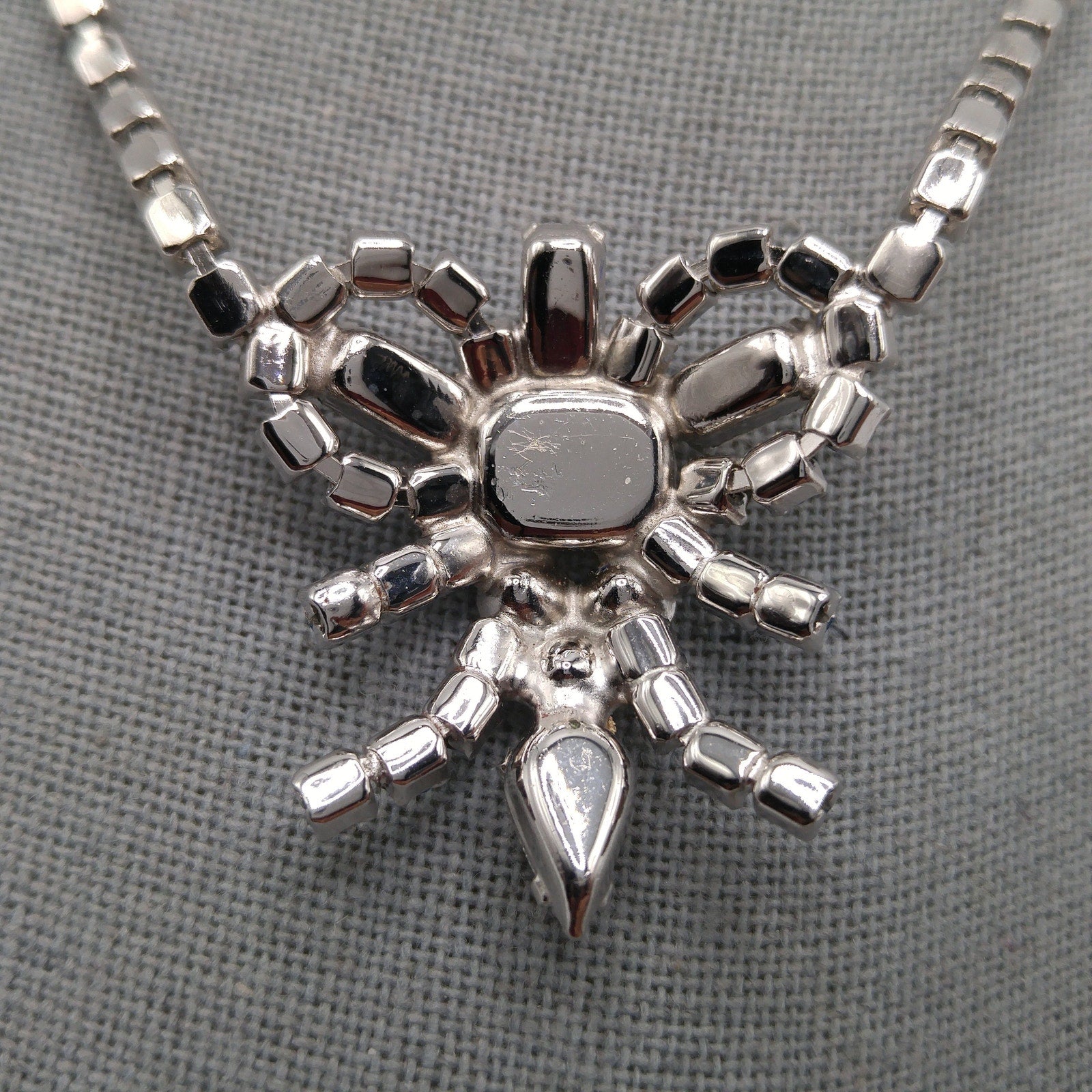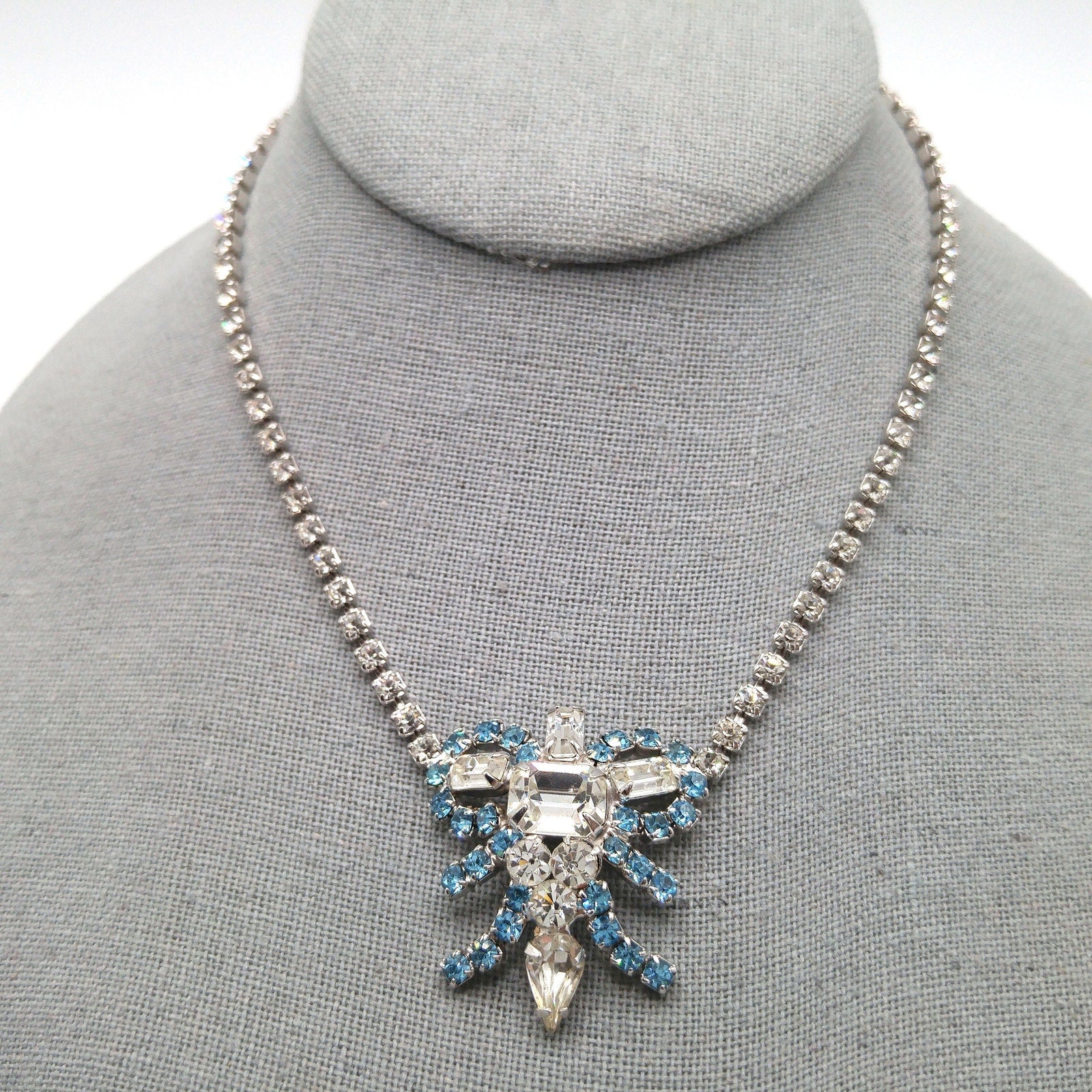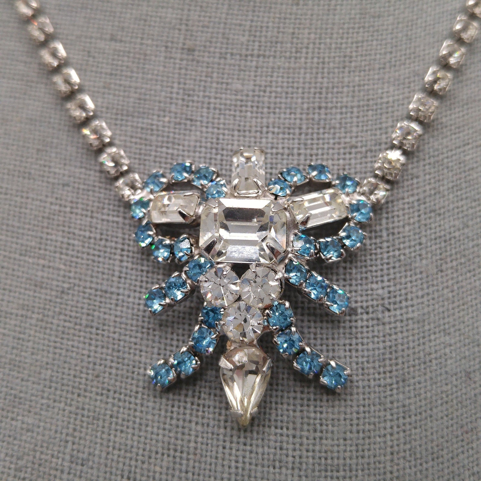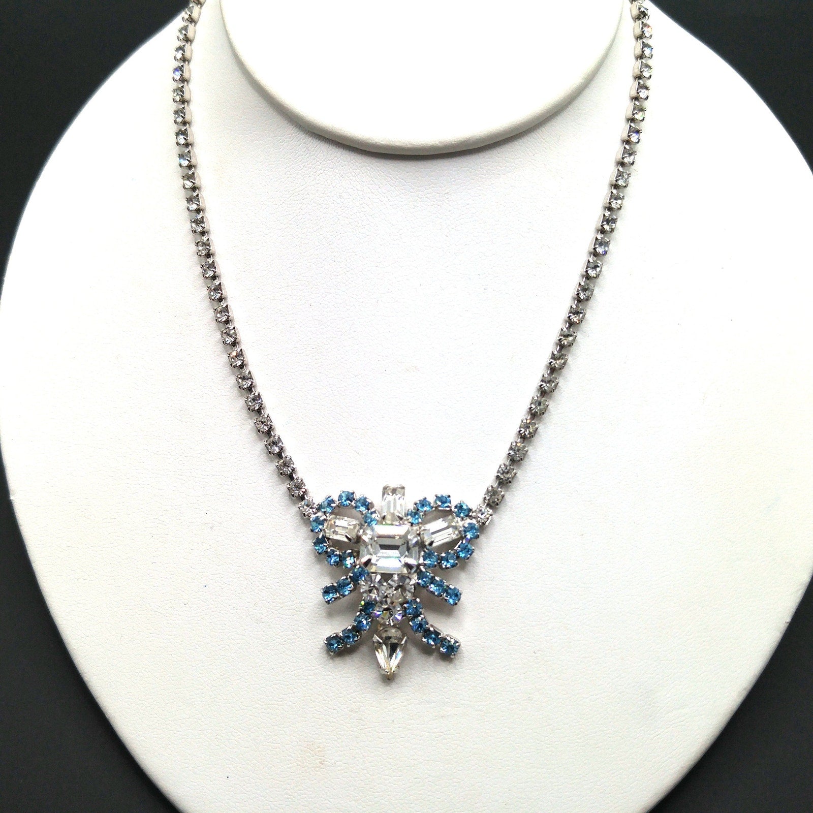*Description: This is a beautiful vintage turquoise and clear rhinestone pendant necklace on a rhodium plated backing from the 1960s. The built in pendant has a center enamel cut clear rhinestone with turquoise and clear rhinestones around it in a beautiful design. The clasp is a hook with a rhinestone on top. The length is adjustable up to 15 inches. This would be a great addition to your vintage jewelry collection or make a great vintage gift!