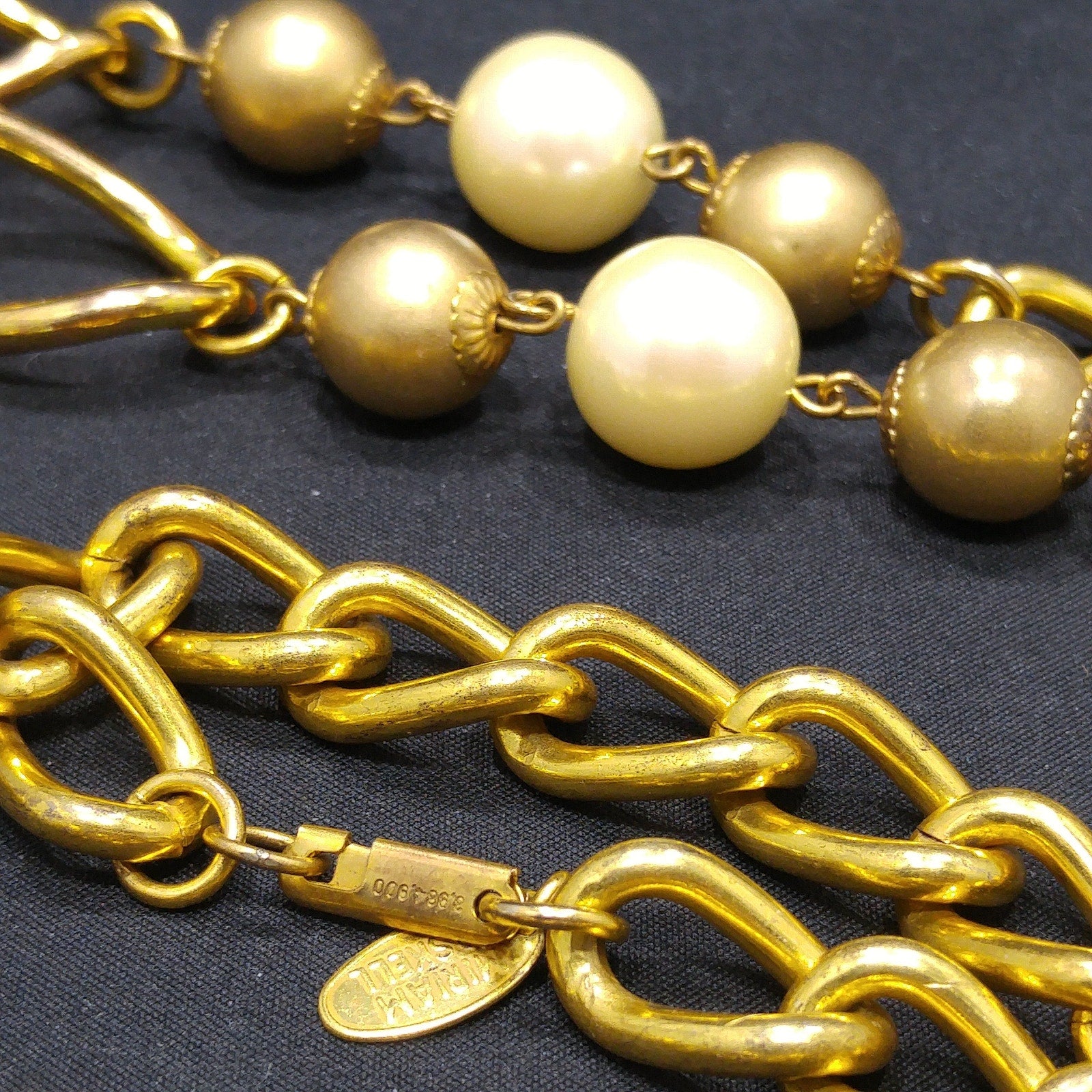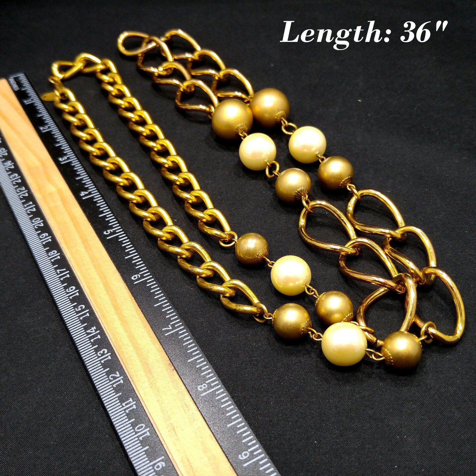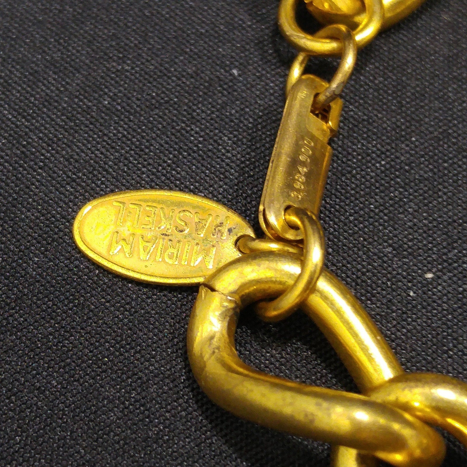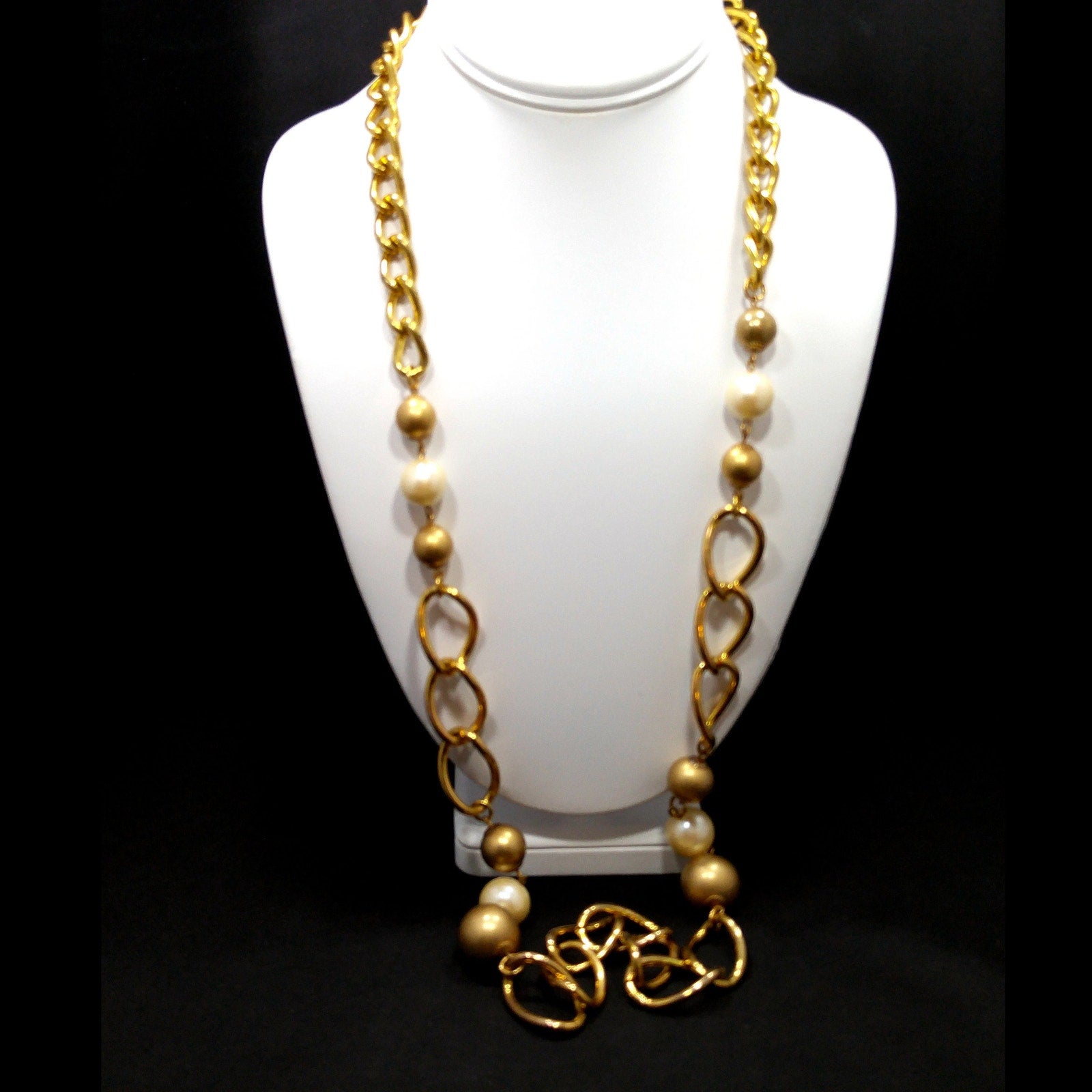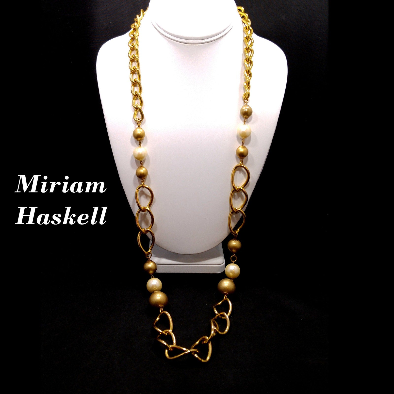 *Description: This is a beautiful Miriam Haskell faux pearl long necklace with gold and white faux pearls and chain links in a variety of sizes from the 1940s to early 1950s. The necklace has a slide clasp with Miriam Haskell on the side and the number 3.984.900. The links are gold plated and the necklace is in great condition. This would be a great addition to your vintage jewelry collection or make a great vintage gift!