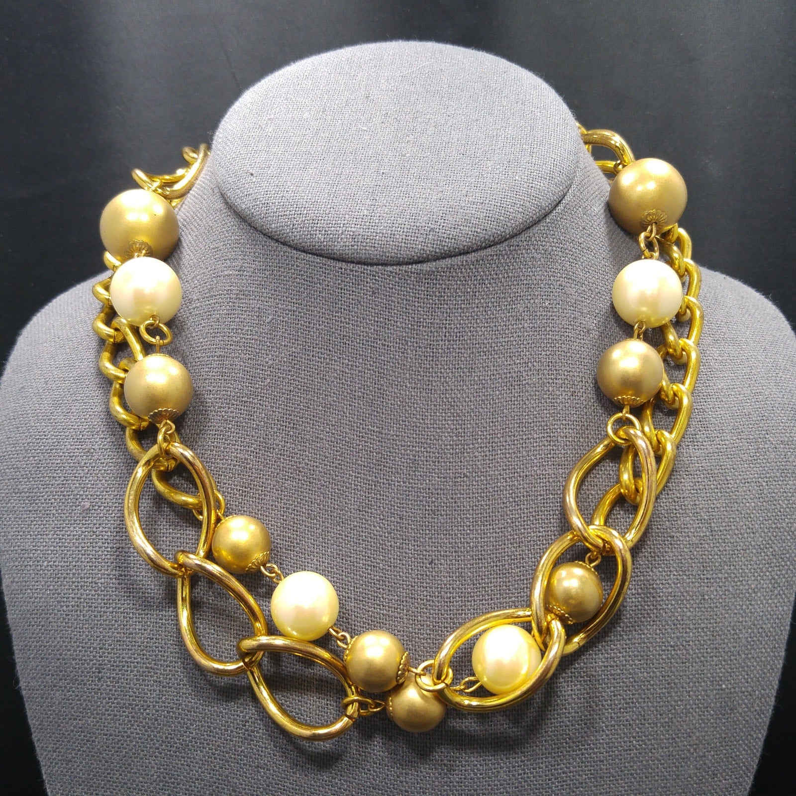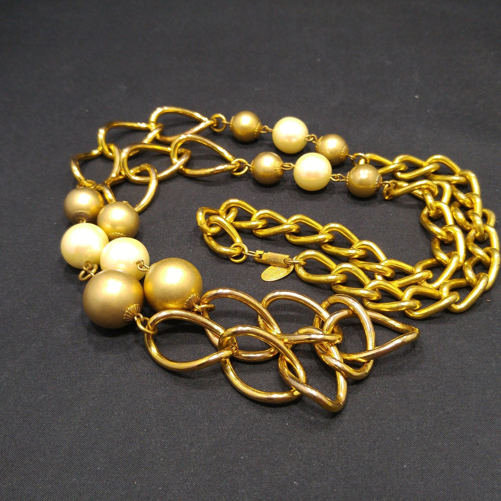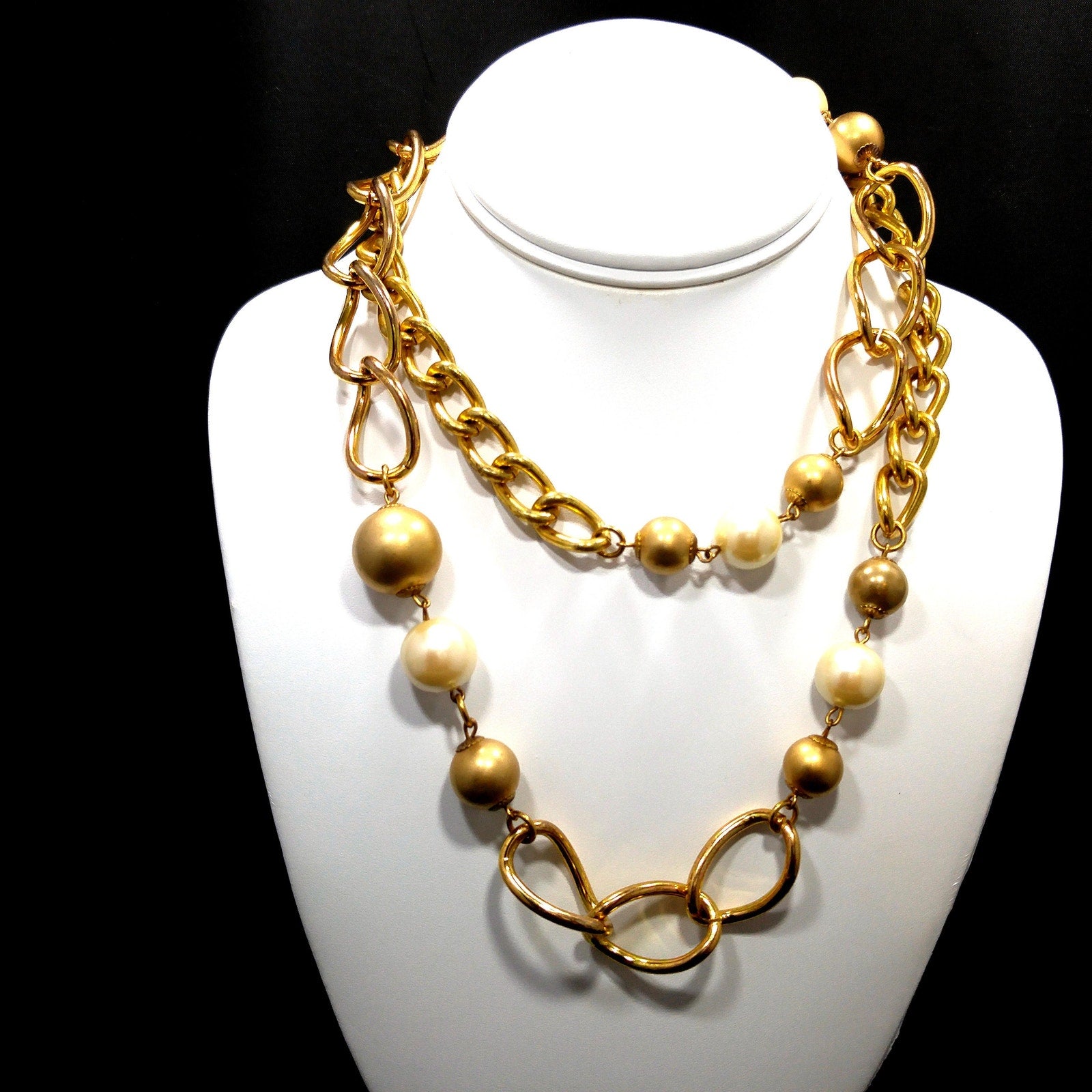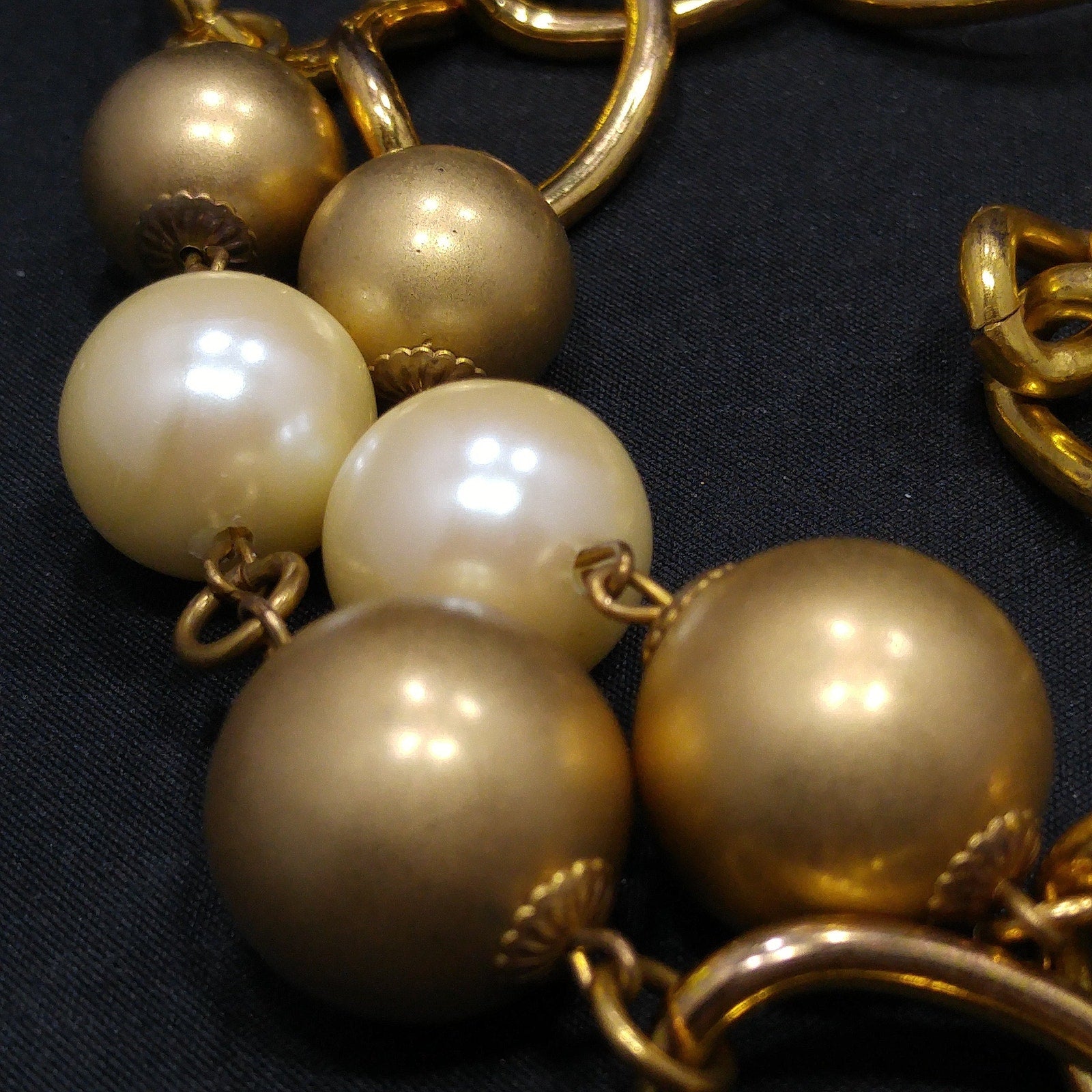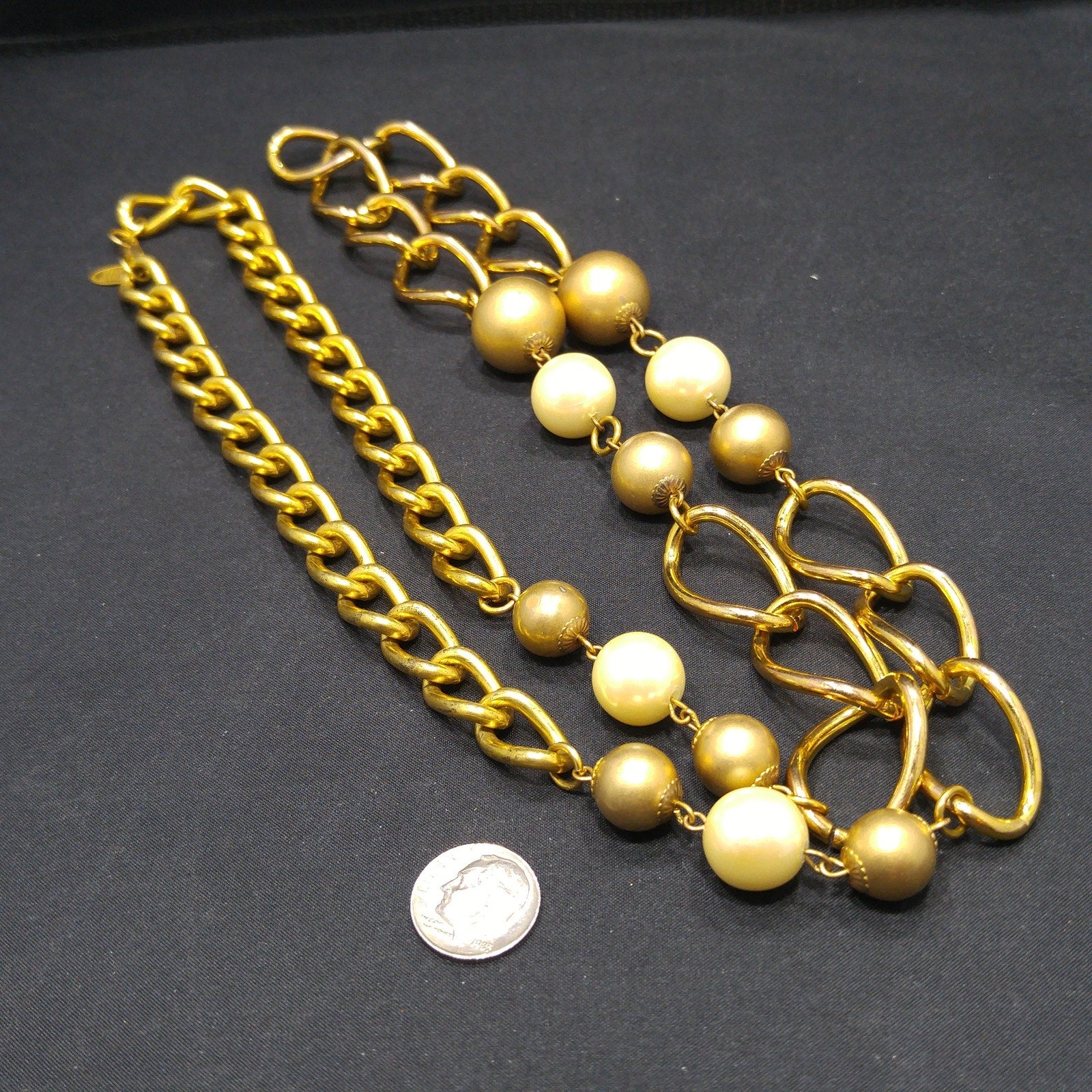 *Description: This is a beautiful Miriam Haskell faux pearl long necklace with gold and white faux pearls and chain links in a variety of sizes from the 1940s to early 1950s. The necklace has a slide clasp with Miriam Haskell on the side and the number 3.984.900. The links are gold plated and the necklace is in great condition. This would be a great addition to your vintage jewelry collection or make a great vintage gift!