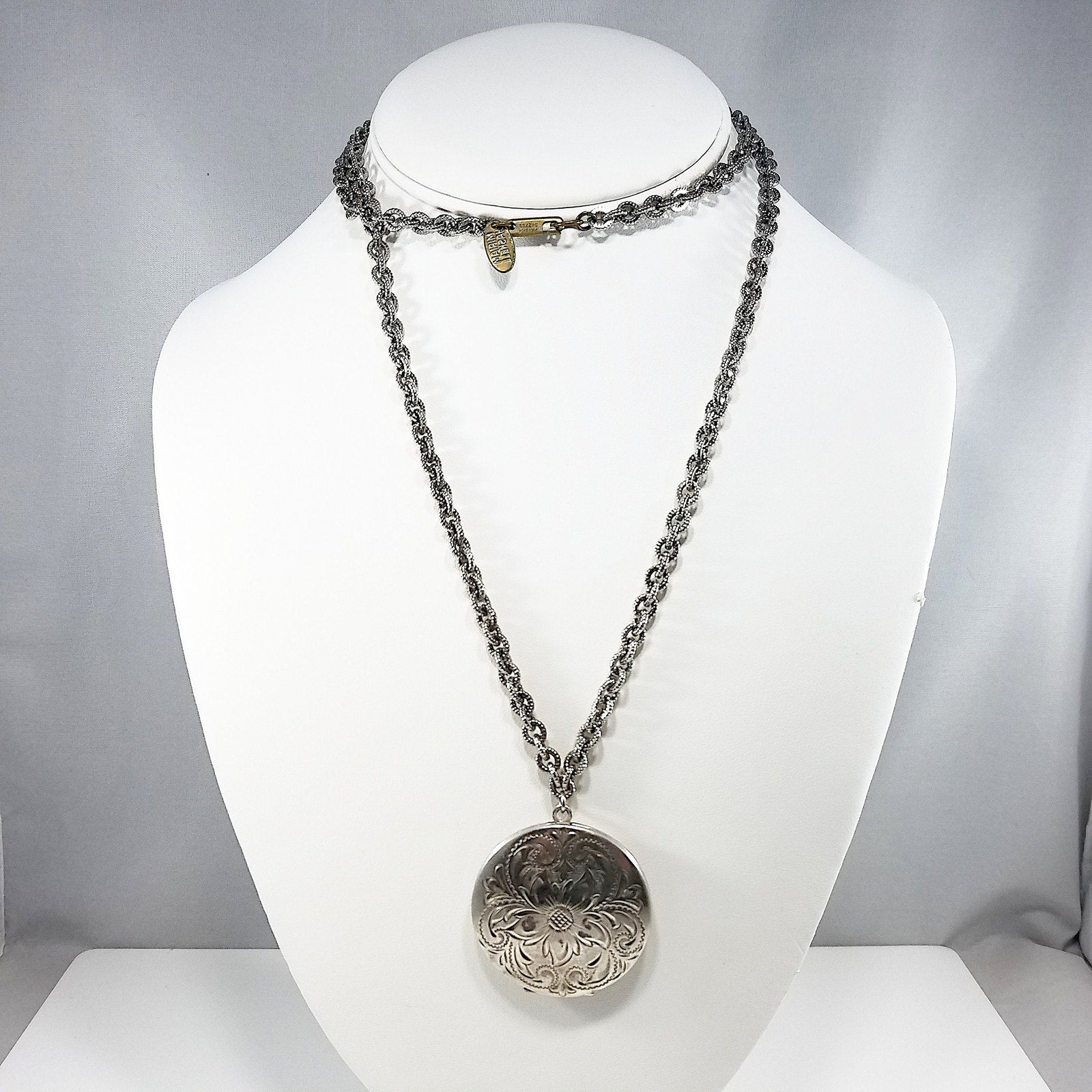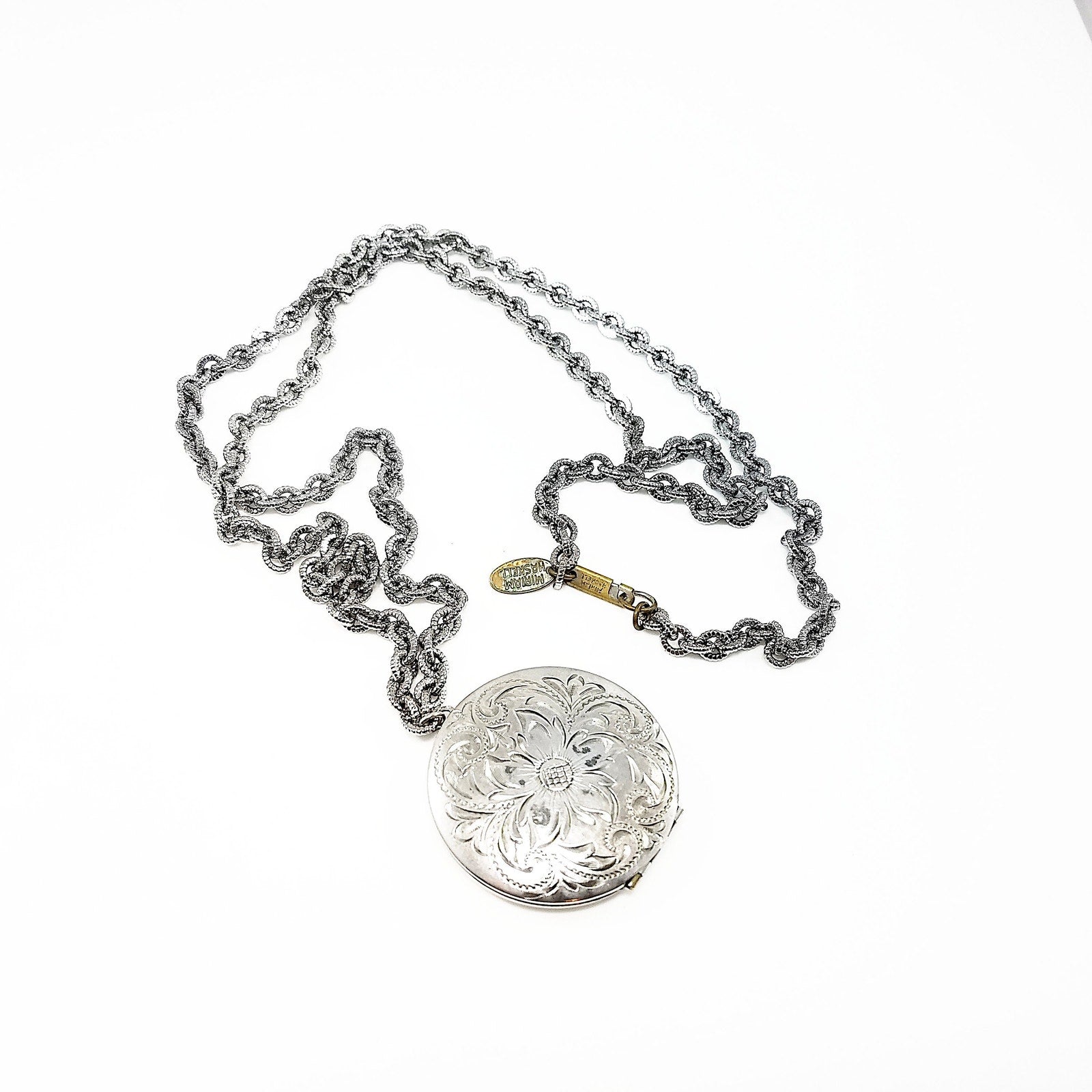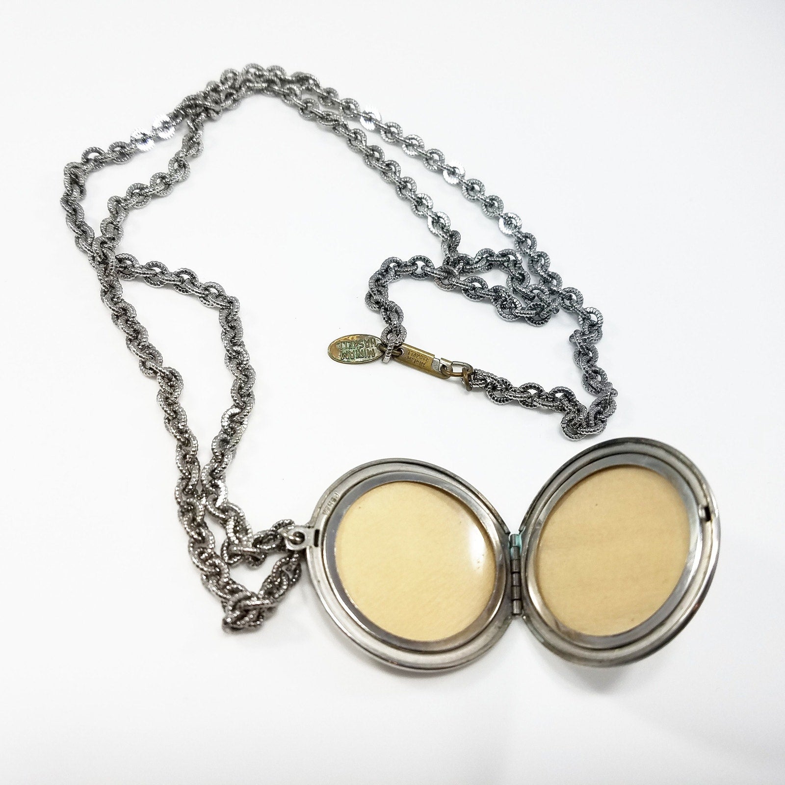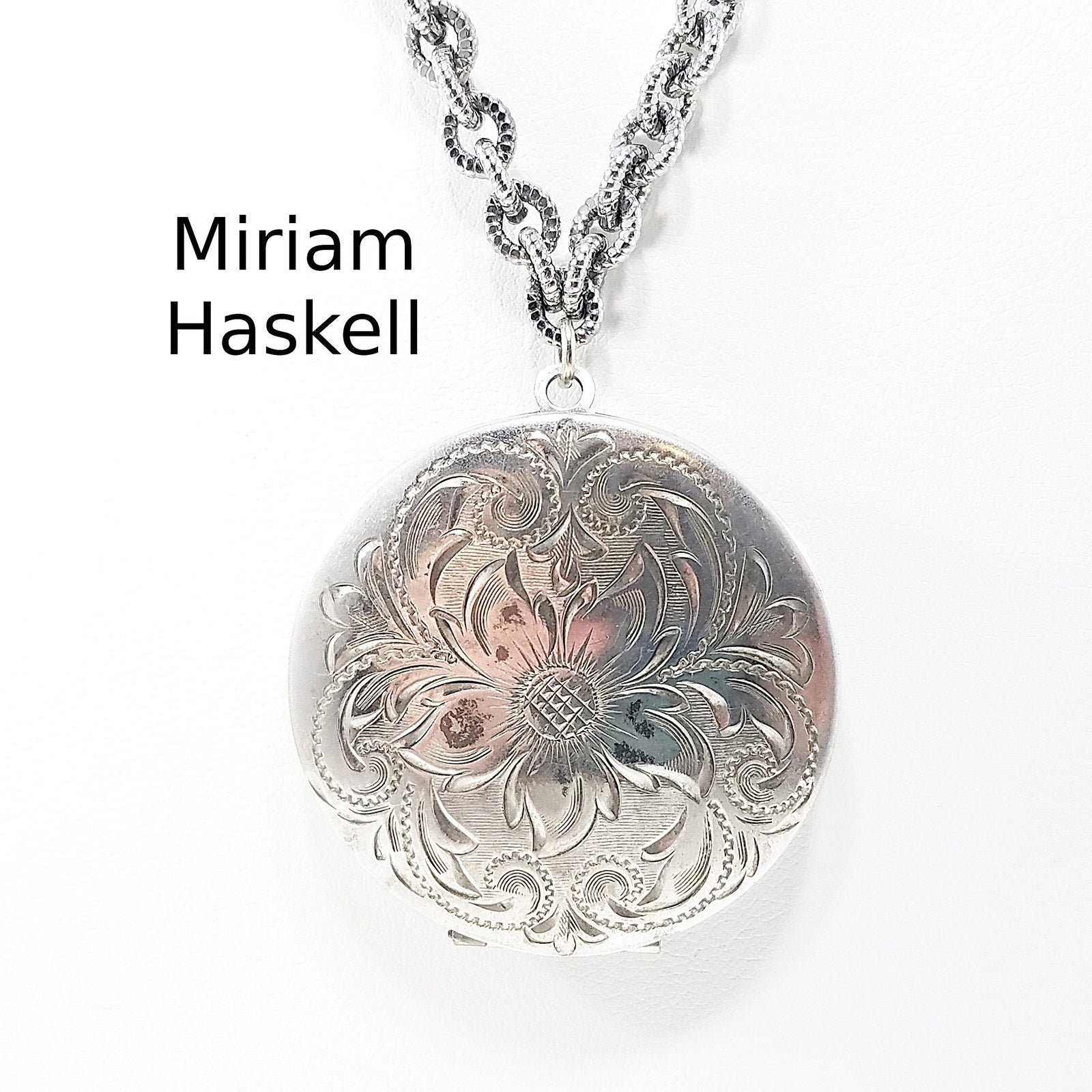 *Description: This is a beautiful silver toned etched locket pendant design by MIRIAM HASKELL which hangs on a 30 inch chain. The clasp is very unique and has the patent number on one side and Miriam Haskell on the other. There is also a hang tag which is near the clasp. This hang tag is imprinted on one side and the reverse imprint shows on the opposite side. This particular hang tag began to be used between 1950 and 1951. The chain is very unique and has texture on each link. This would make a wonderful gift with your favorite photos inside or left for that special someone to add their favorite photos. It would also be a great addition to your vintage jewelry collection.