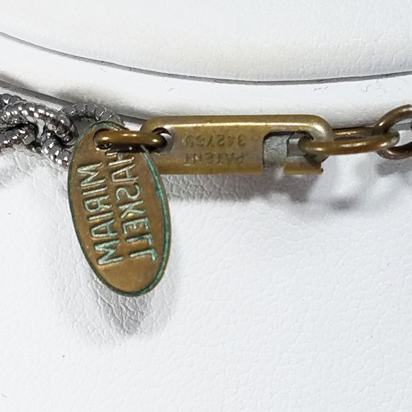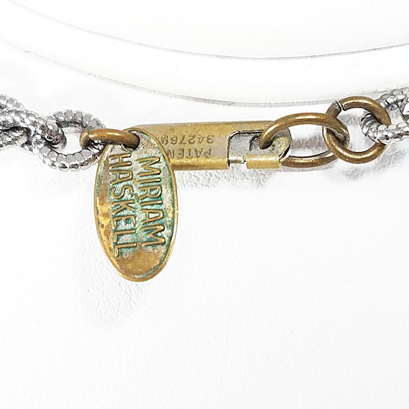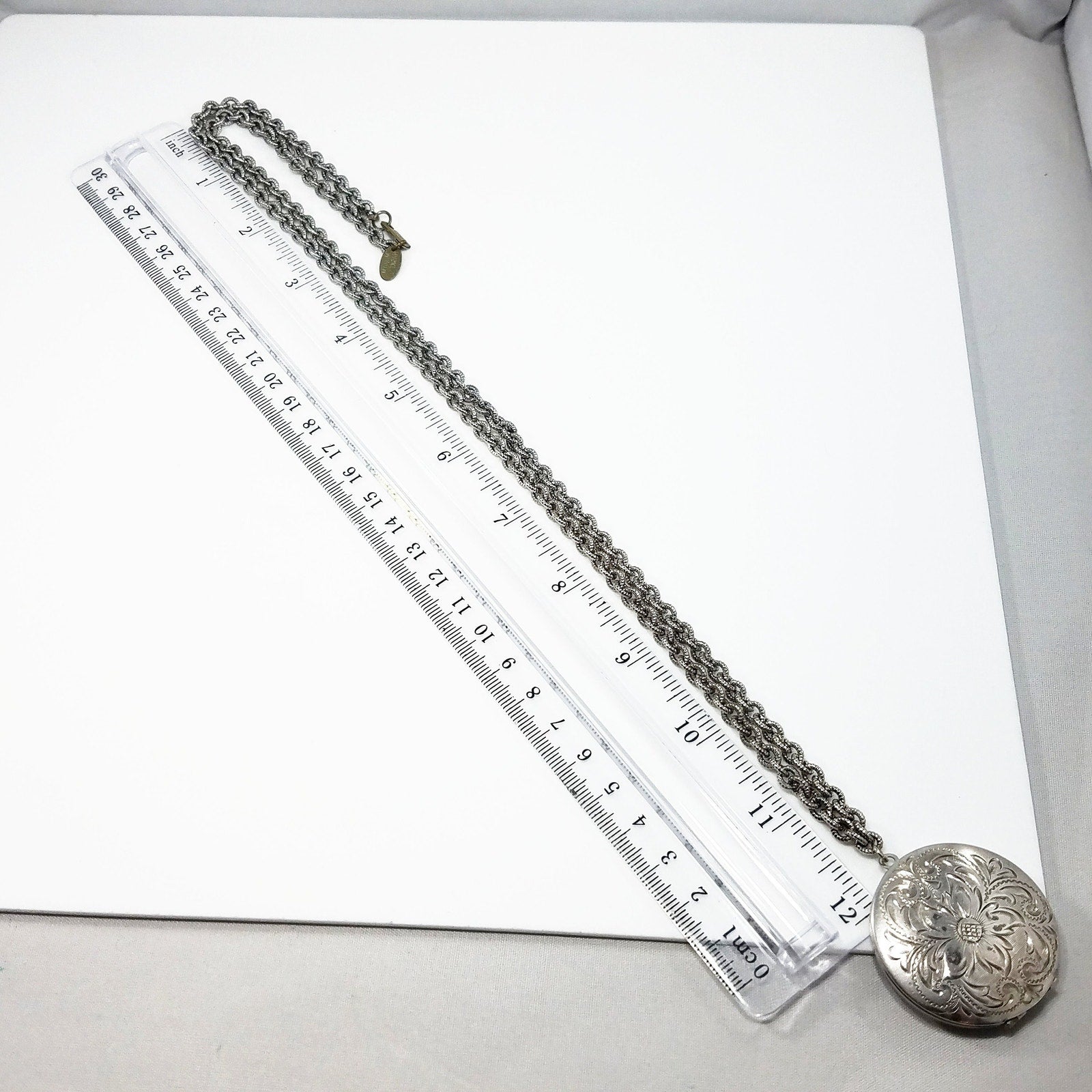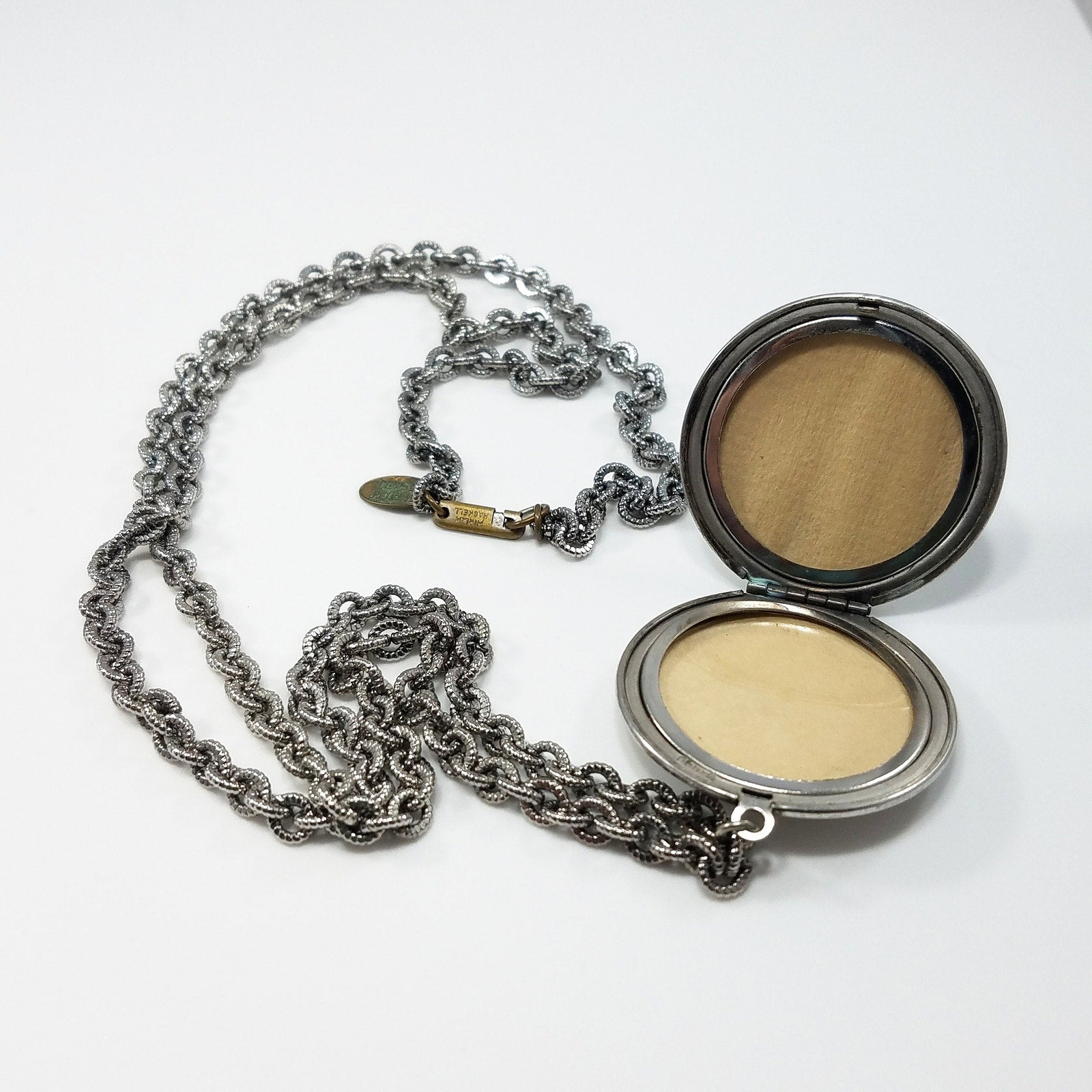 *Description: This is a beautiful silver toned etched locket pendant design by MIRIAM HASKELL which hangs on a 30 inch chain. The clasp is very unique and has the patent number on one side and Miriam Haskell on the other. There is also a hang tag which is near the clasp. This hang tag is imprinted on one side and the reverse imprint shows on the opposite side. This particular hang tag began to be used between 1950 and 1951. The chain is very unique and has texture on each link. This would make a wonderful gift with your favorite photos inside or left for that special someone to add their favorite photos. It would also be a great addition to your vintage jewelry collection.