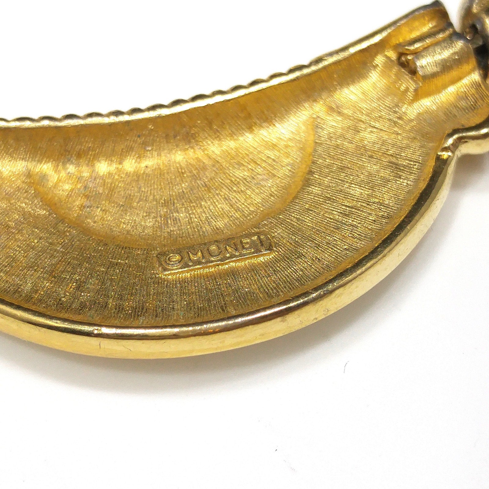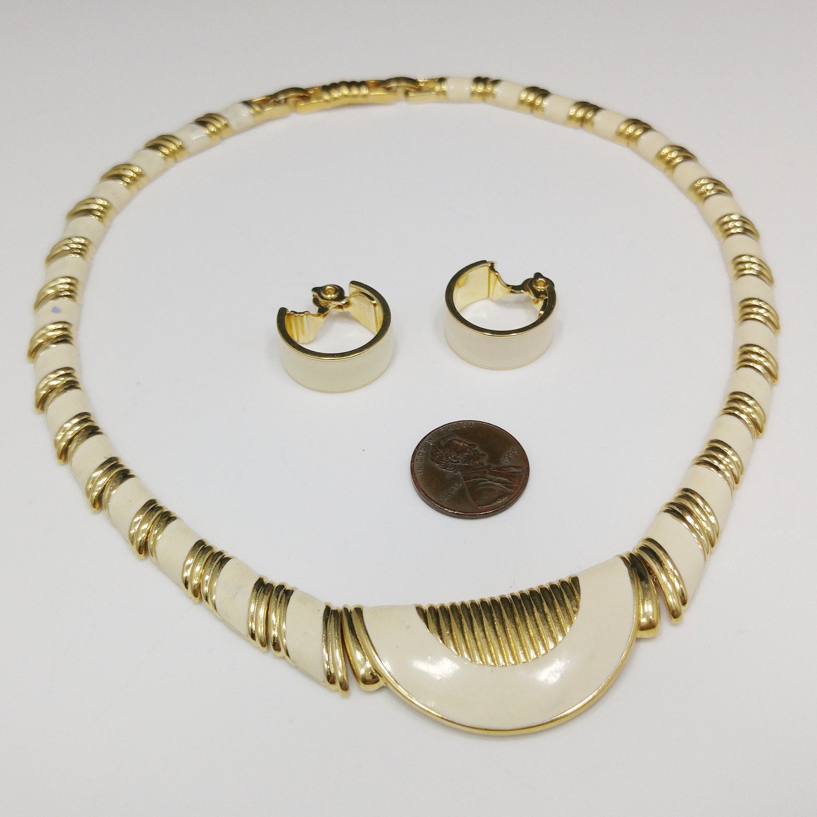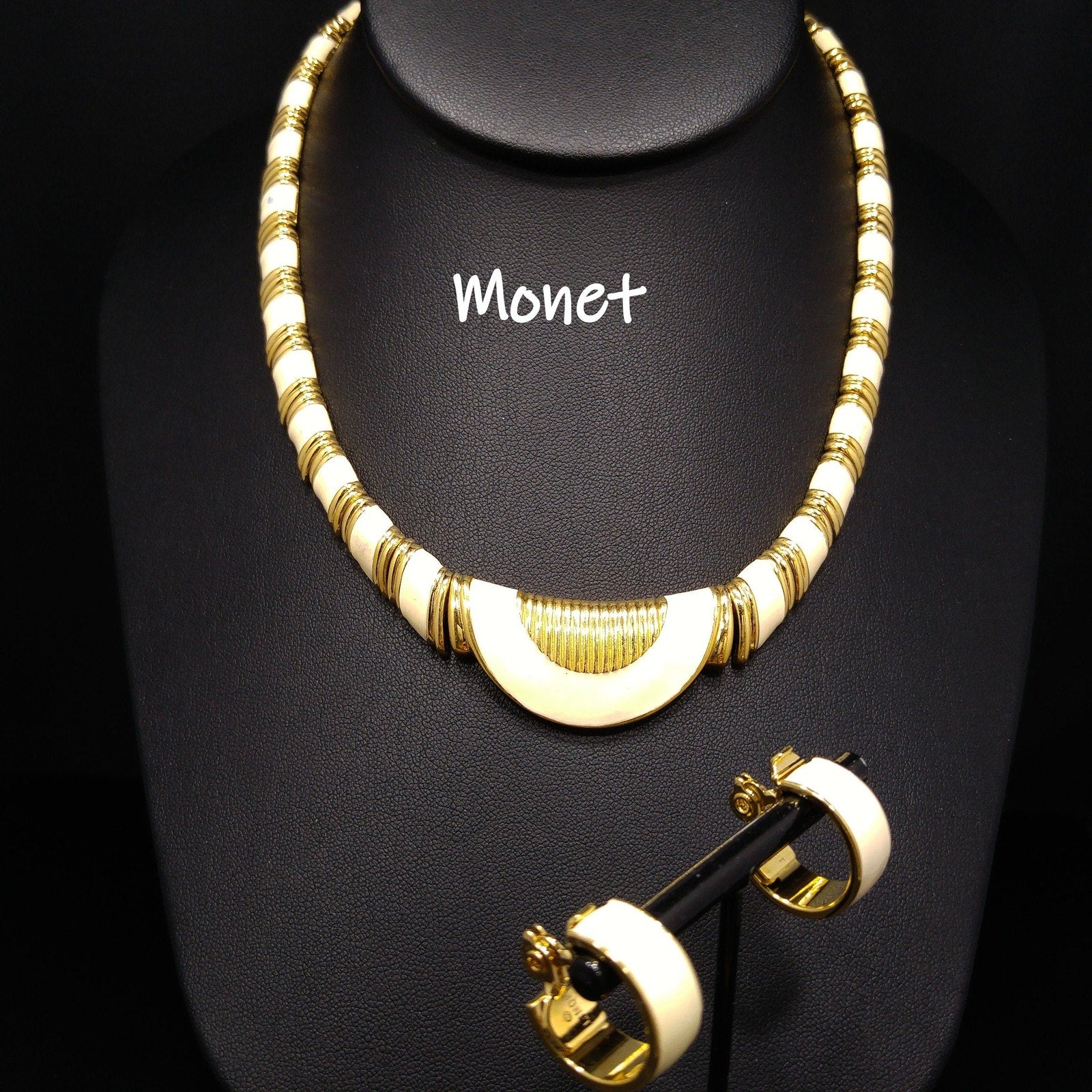 *Description: This is a 1980s Monet cream enamel and gold link necklace with matching cream enamel and gold clip earrings. Each piece is signed Monet with the copyright symbol. The necklace has a half circle with a textured gold center with links that are cream enamel trimmed in gold and each link is threaded through a gold chain. You can barely see the chain between each link. The necklace is 15 inches and includes an extender that has an alligator clasp, just like the necklace, which extends the length to 16 inches. The matching earrings are signed Monet with the copyright on the inside. The earrings match but show no wear, that I can see, to the enamel or inside so my guess is that the necklace was worn several times but not the earrings. The earrings have the Monet patent soft push closure for comfort. This would be a great addition to your vintage jewelry collection or make a great vintage gift!