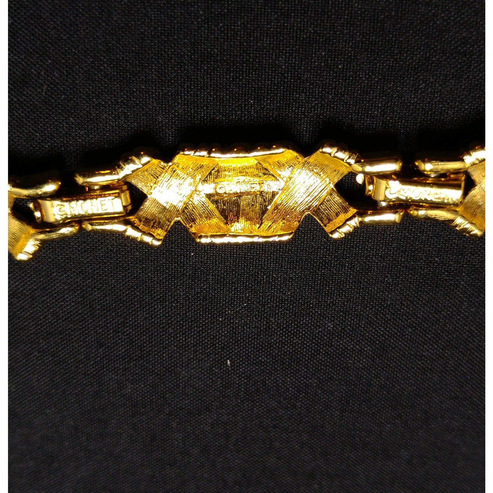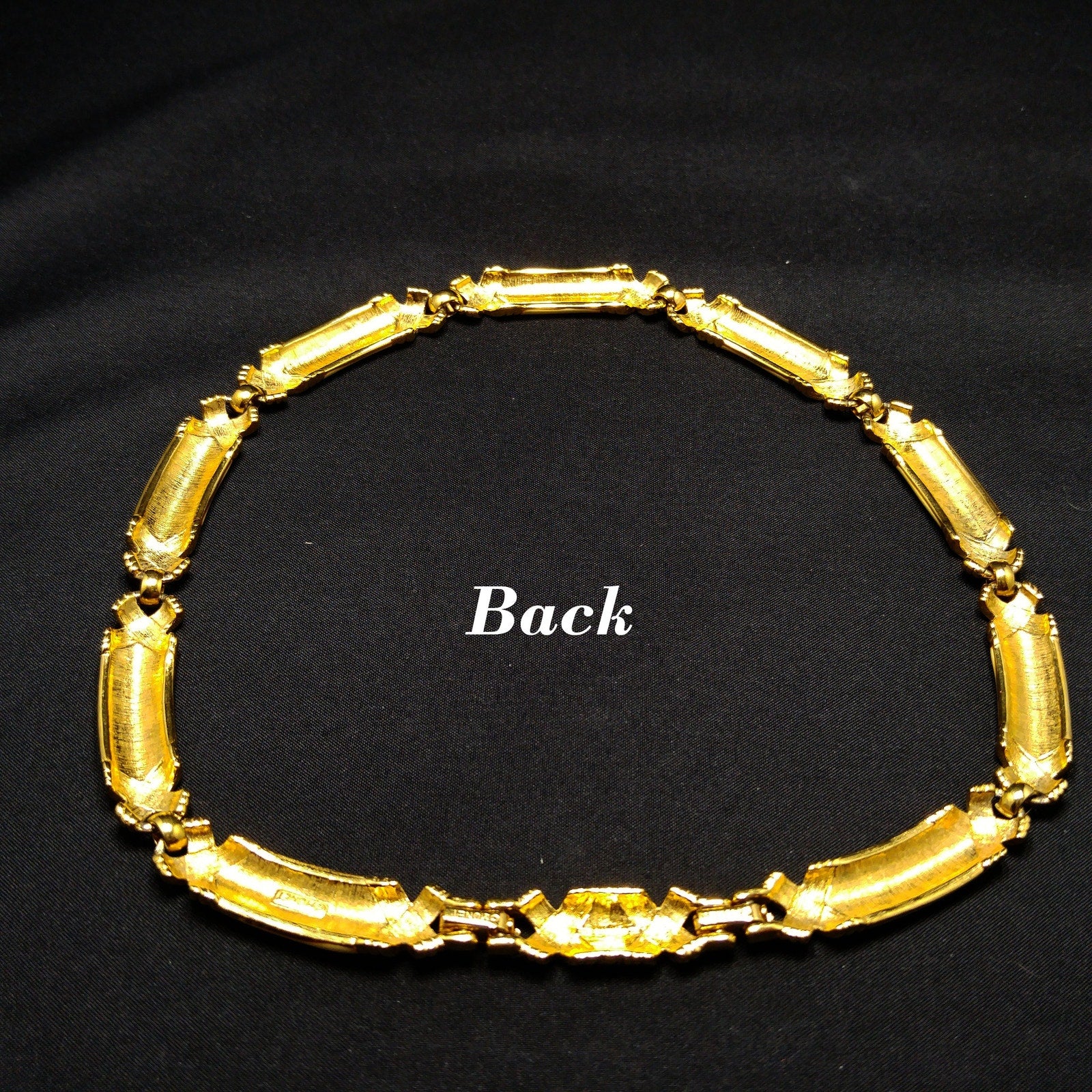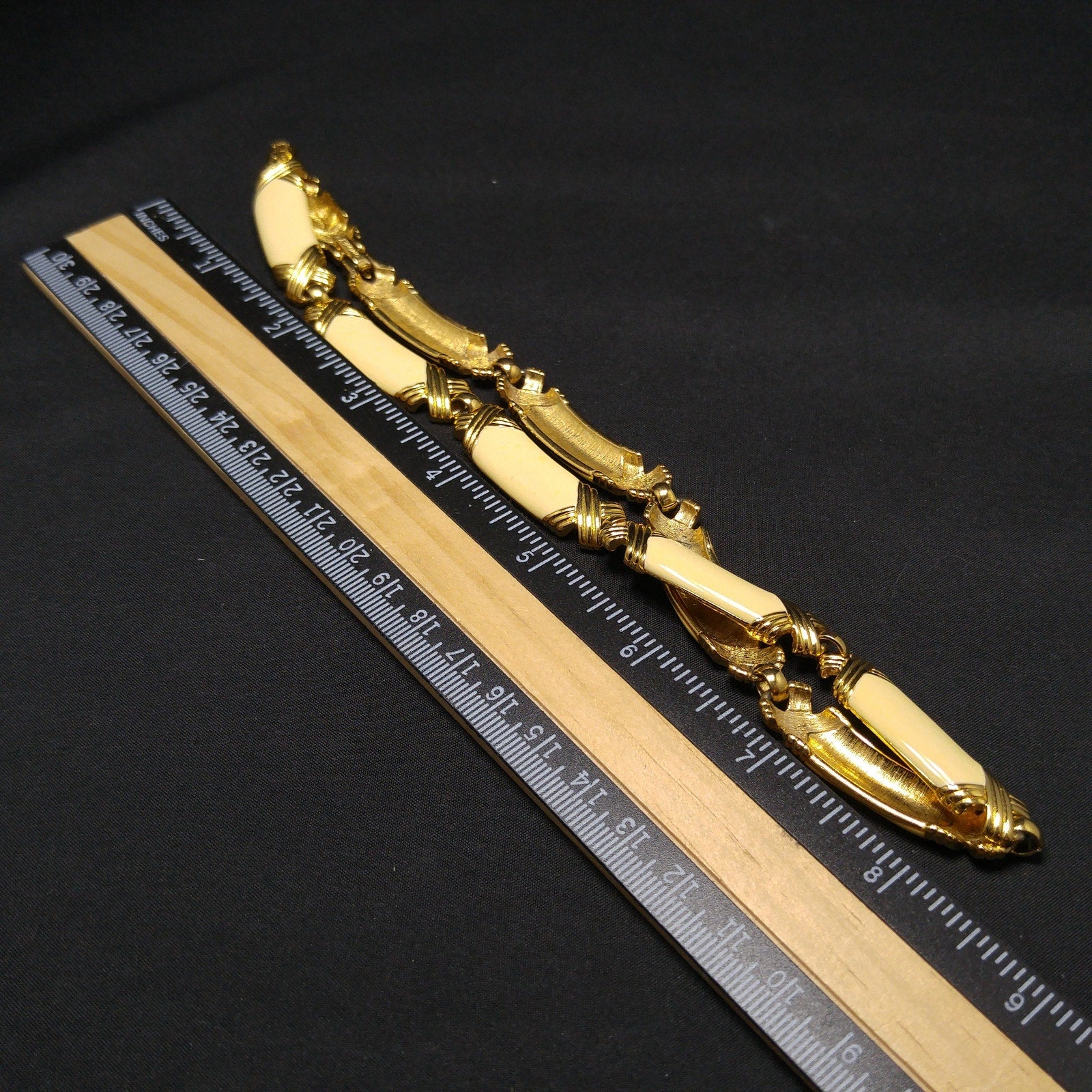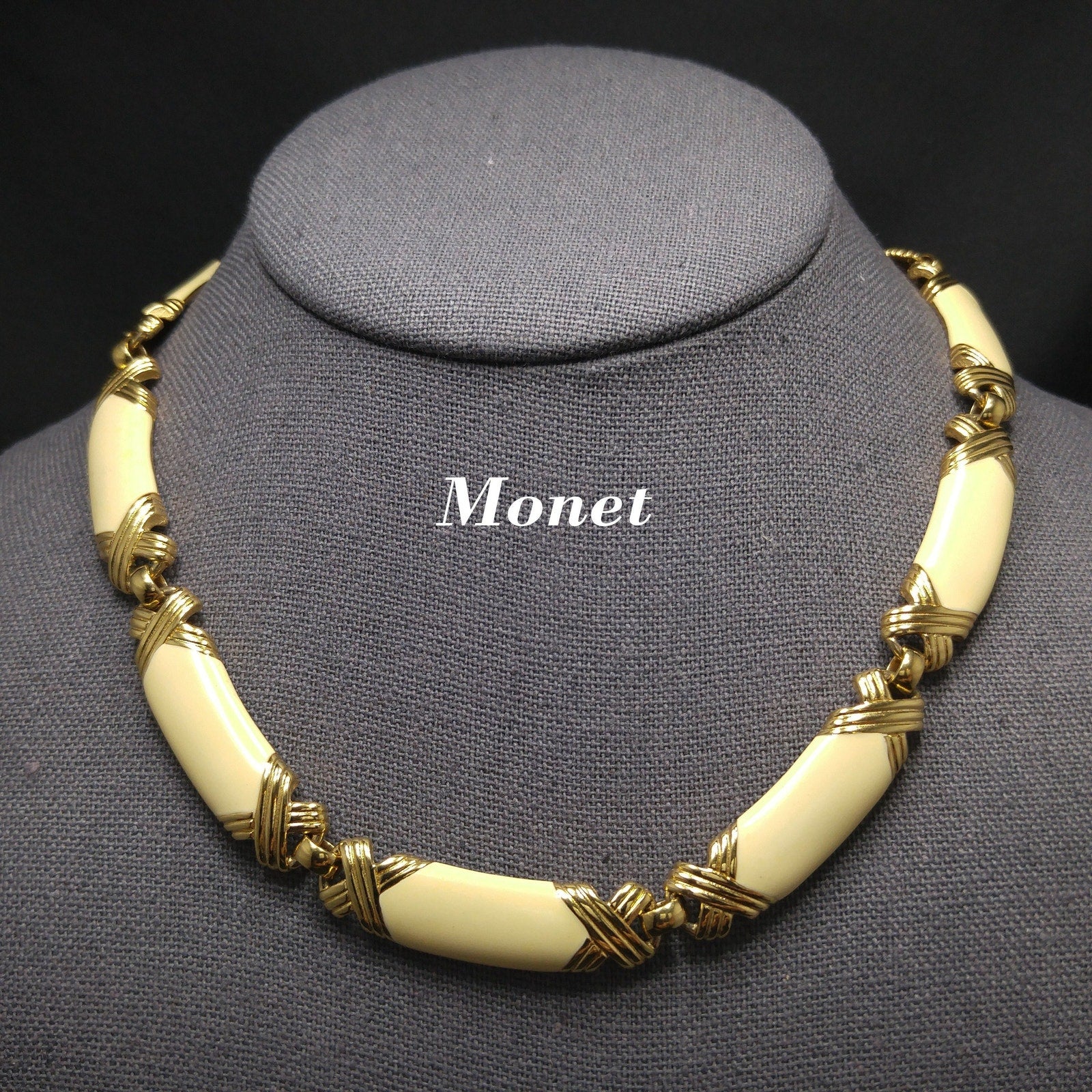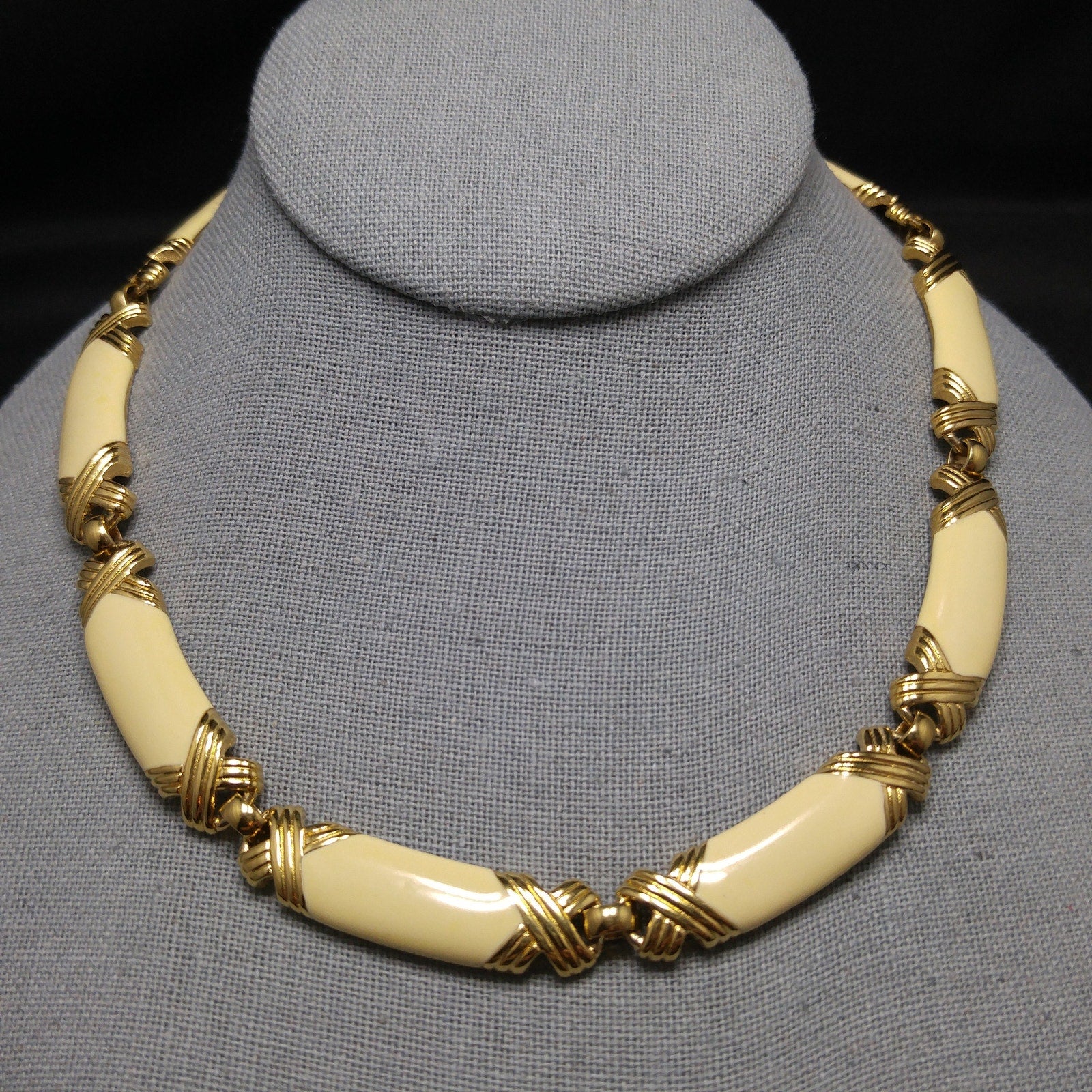 *Description: This is a beautiful Monet cream enamel and gold plated link necklace from the 1980s. The necklace has slightly curved links with cream in the middle and an x on each side in gold plate. There are two clasps so that you can add or remove an inch extender which blends in with the design. You can wear the necklace at 16 or 17 inches. It is 1/2 Inches in width and fits nice around the contour of your neck. This would be a great addition to your vintage jewelry collection or make a great vintage gift!