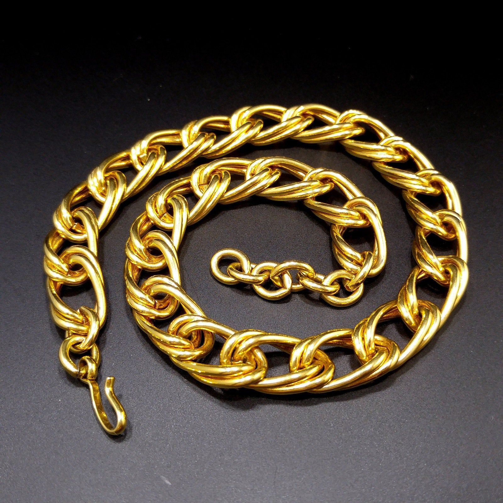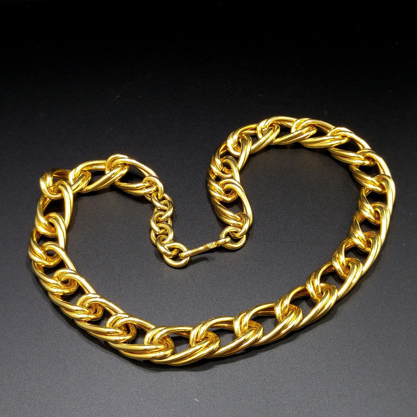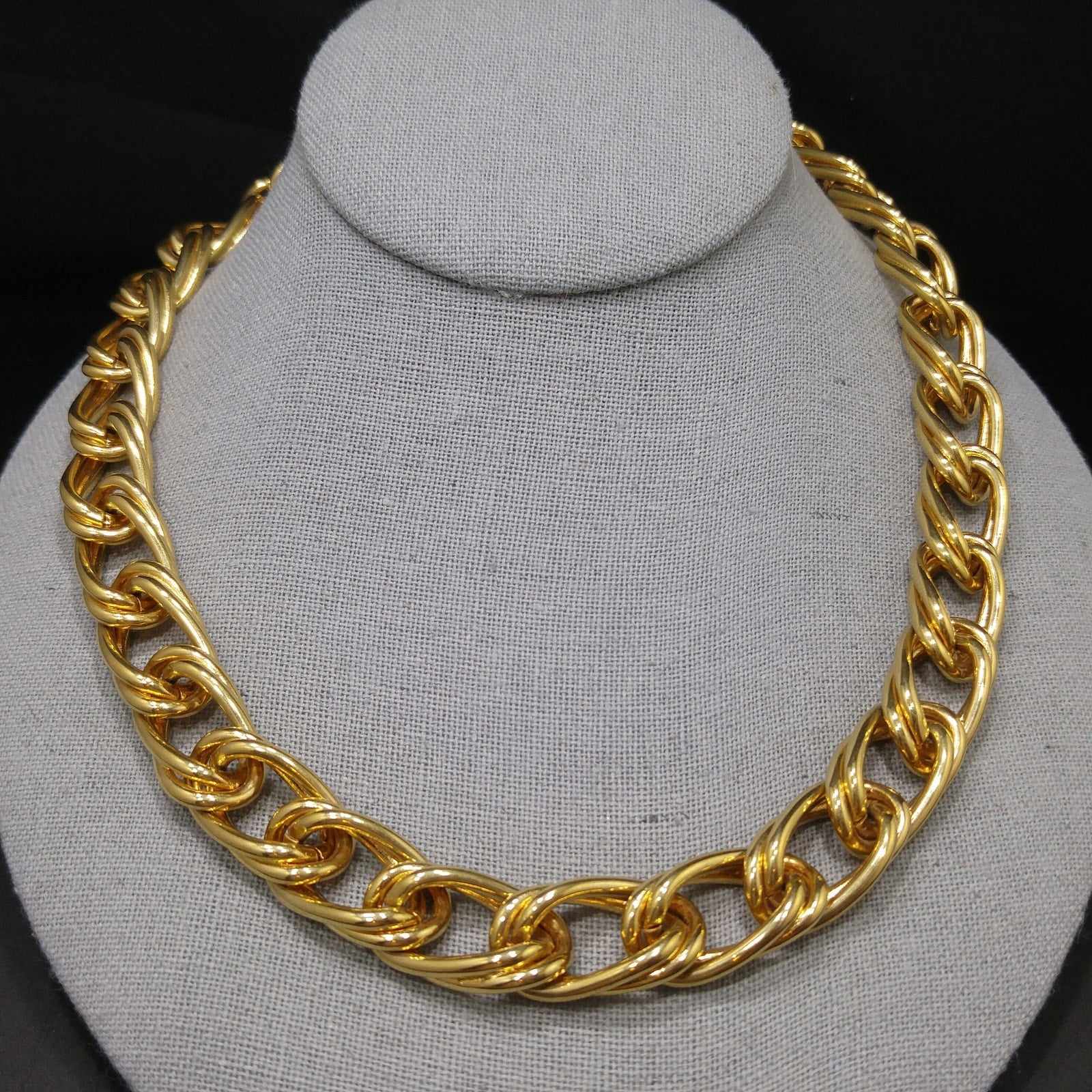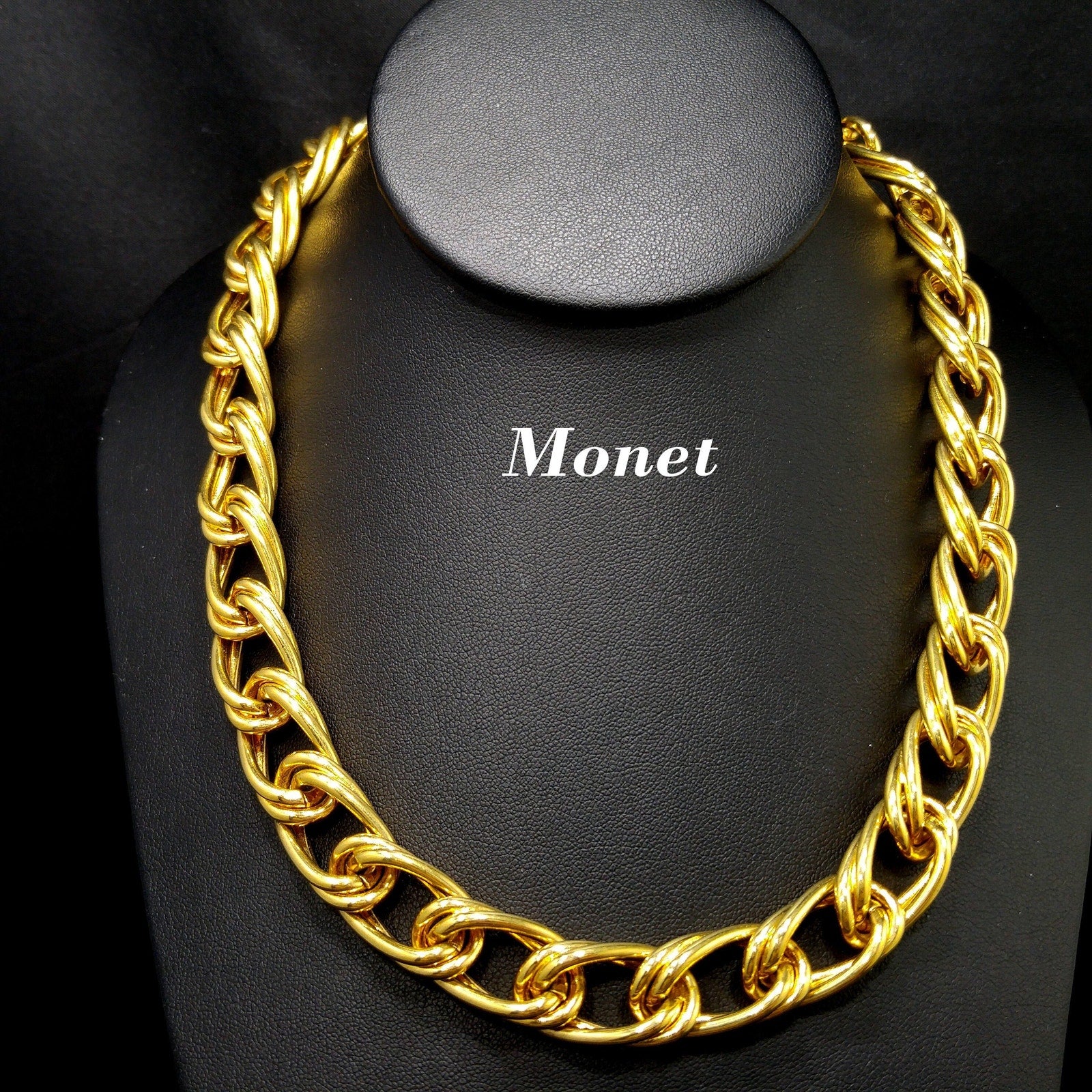 *Description: This is a beautiful smooth gold plated double chain necklace by MONET from the 1980s with an adjustable length and hook clasp. The necklace chain is wide and substantial in weight at 4.5 ounces. Monet chain necklaces are timeless and would be a great addition to your vintage jewelry collection or make a great vintage gift!