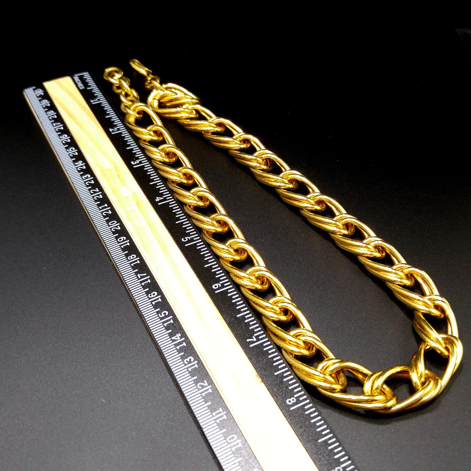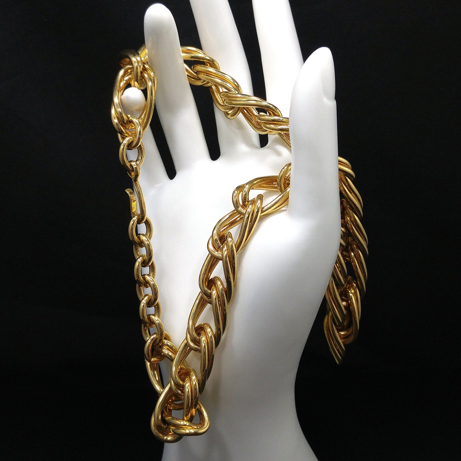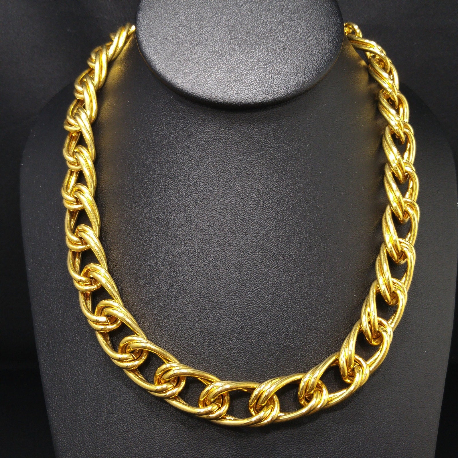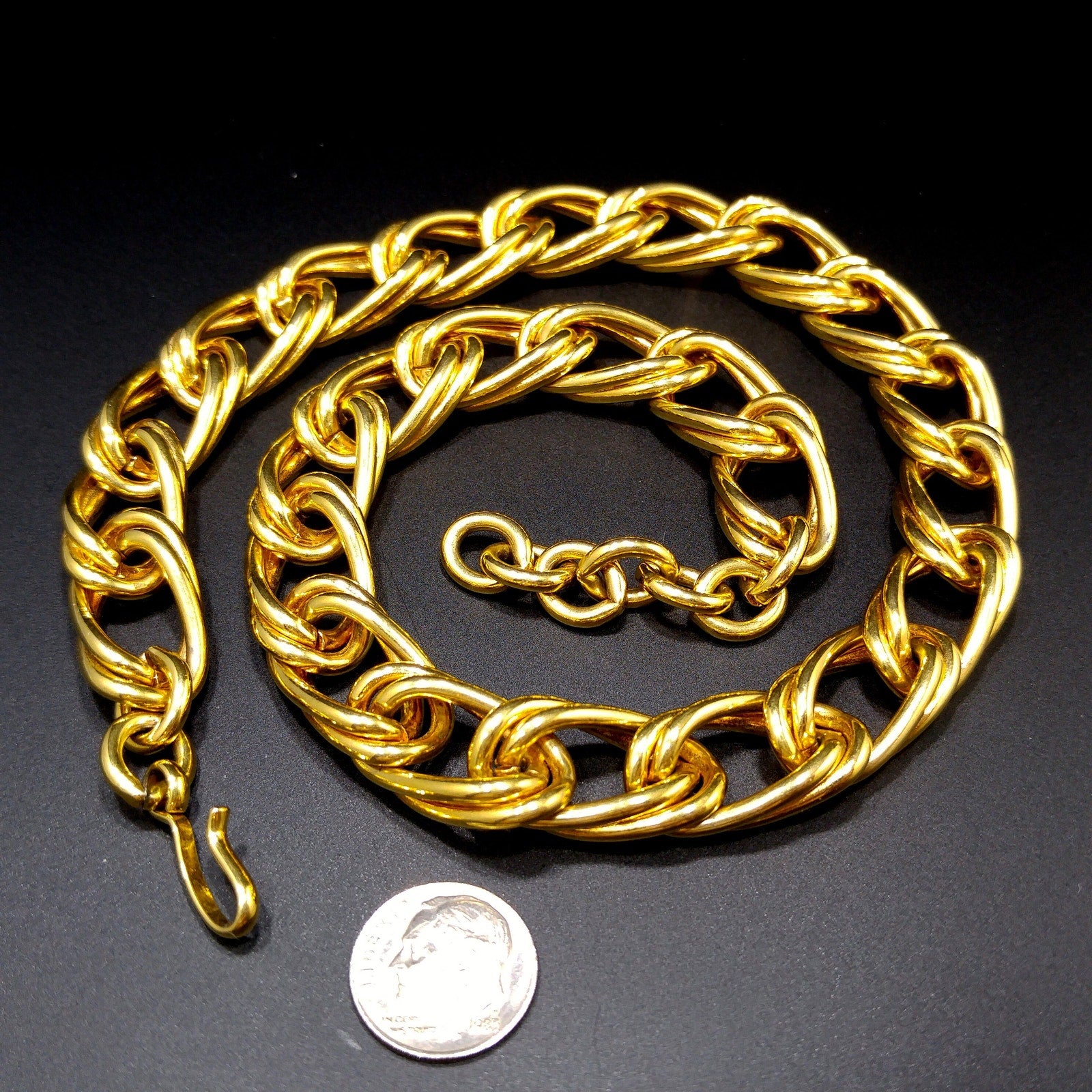 *Description: This is a beautiful smooth gold plated double chain necklace by MONET from the 1980s with an adjustable length and hook clasp. The necklace chain is wide and substantial in weight at 4.5 ounces. Monet chain necklaces are timeless and would be a great addition to your vintage jewelry collection or make a great vintage gift!