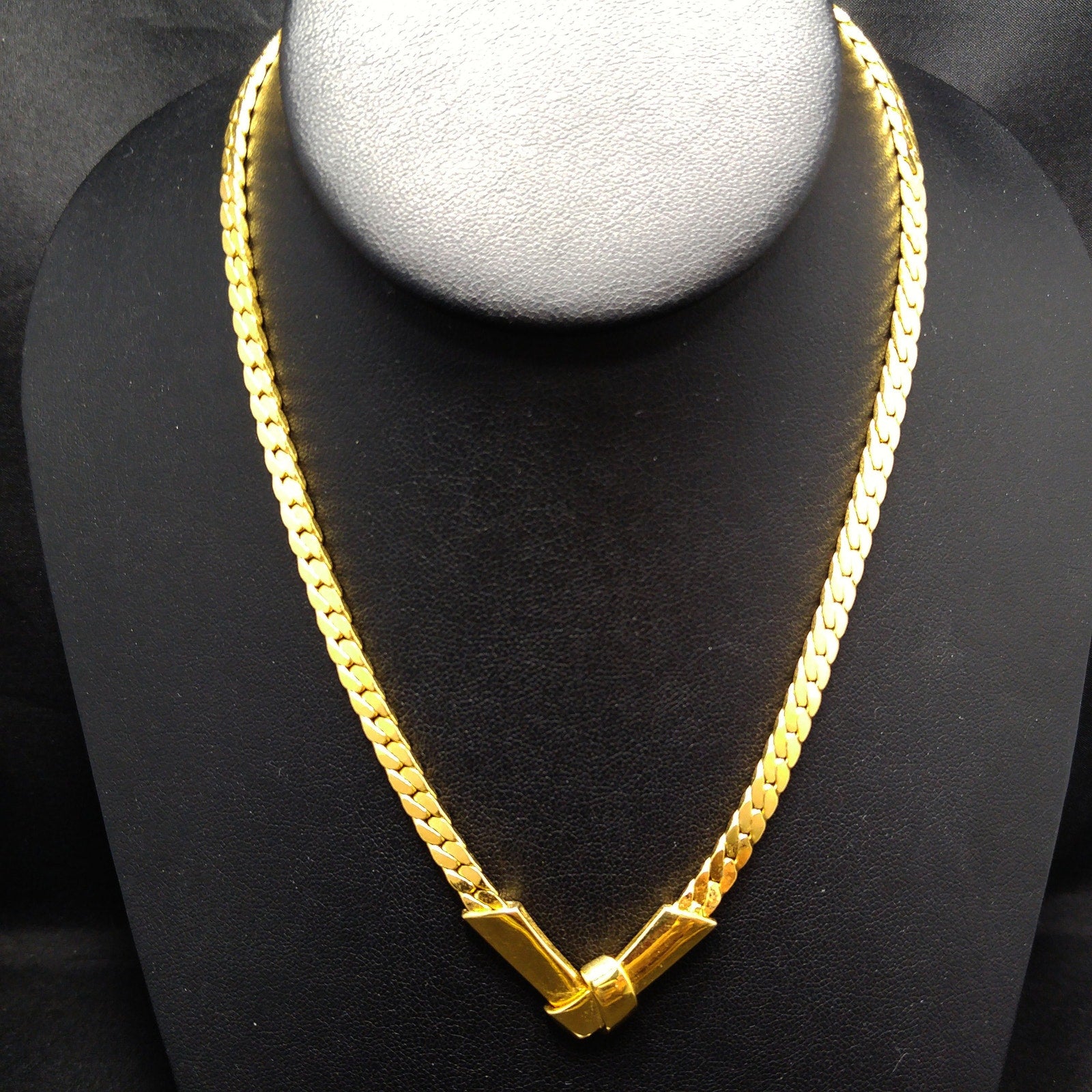 *Description: This is a very nice Monet herringbone chain necklace with a built in pendant in a fold over v shape; all in gold plate, from the 1980s. The necklace has two clasps; without the extra inch, the necklace is 15 1/2 Inches and with the added extension, it is 16 1/2 Inches so you may adjust the length accordingly to your preferred neckline. This would be a great addition to your vintage jewelry collection or make a great vintage gift!