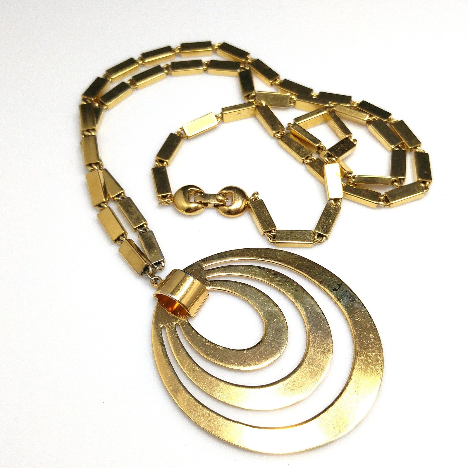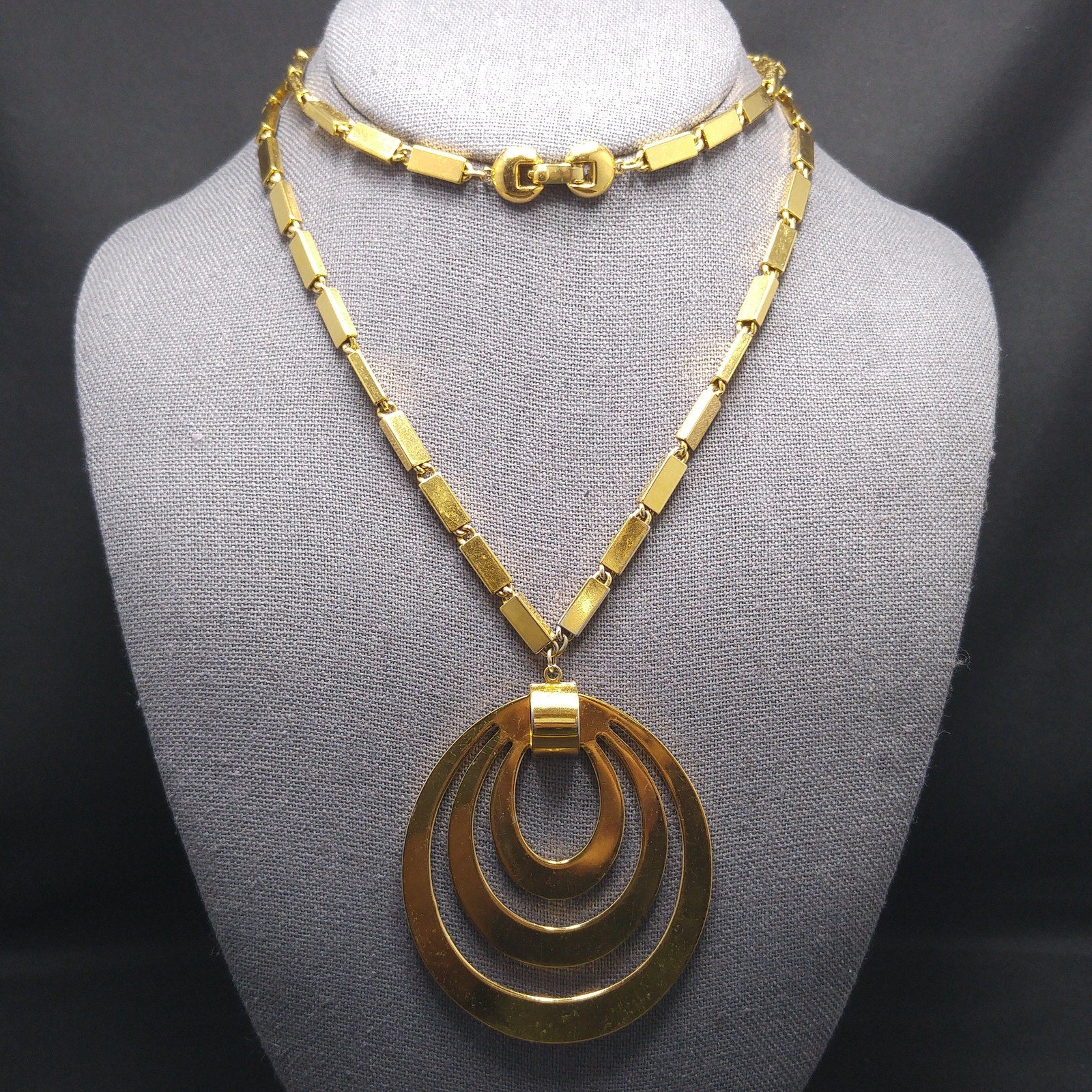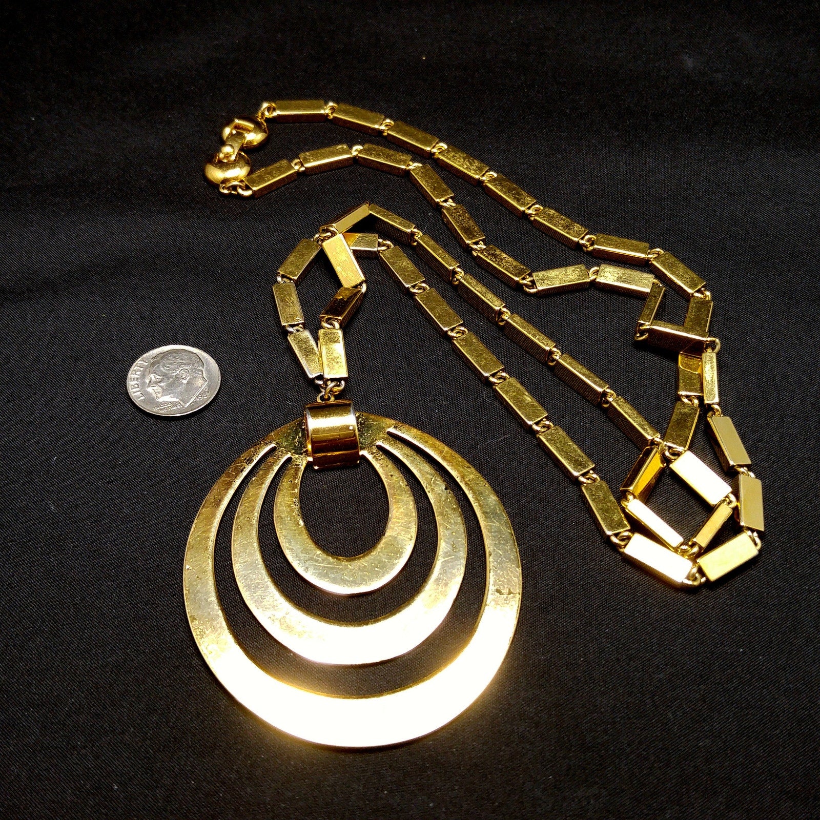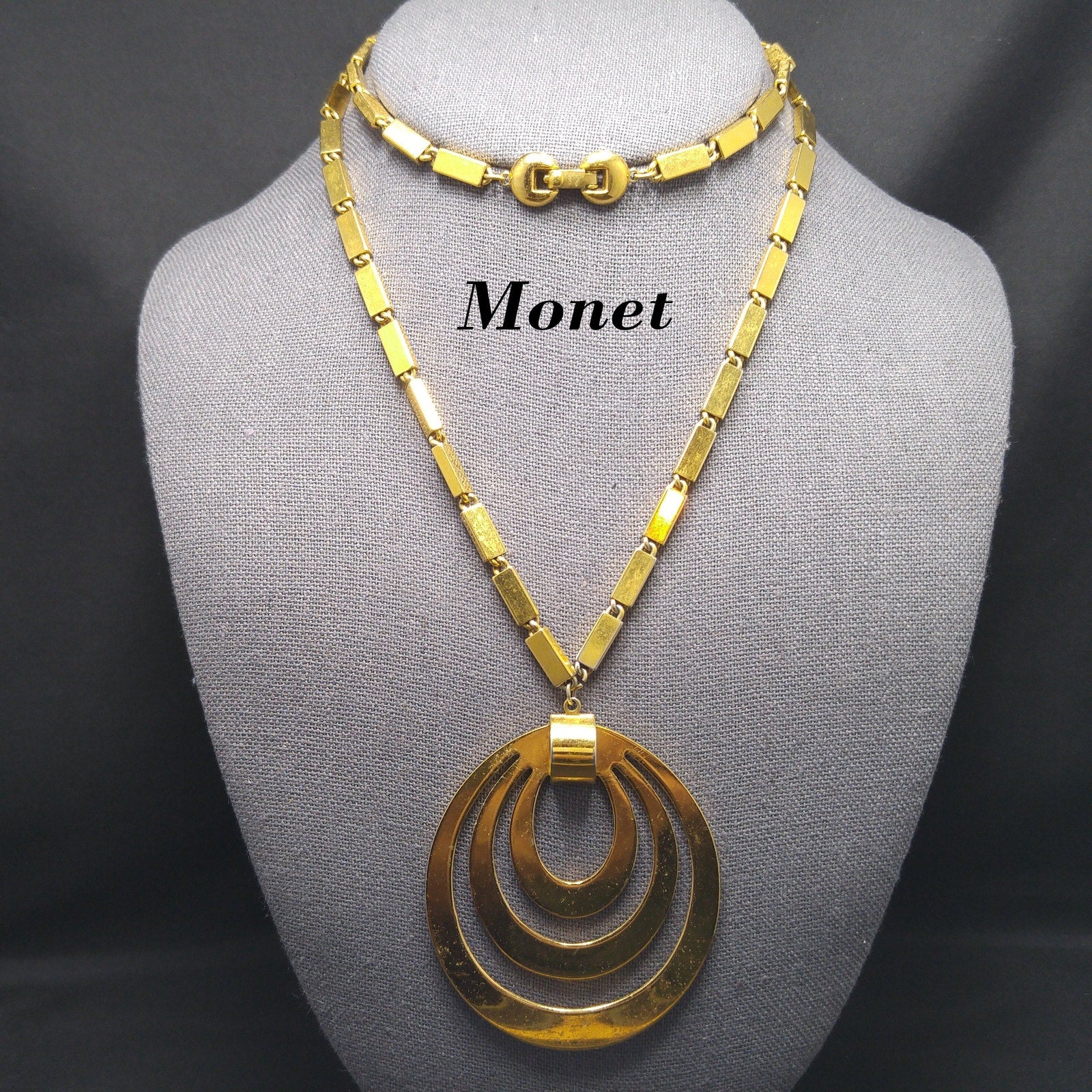 *Description: This is a beautiful Monet necklace, Tournee, a popular pendant necklace from the 1960s. This necklace is featured on page 161 of the Monet The Master Jewelers by Alice Vega. Vega explains that the fashion and accessories of the 1960s were more casual and carefree in feeling. This beautiful box chain pendant necklace is gold plated and has a long length at 29 inches with a large 3 inch pendant. This would be a great addition to your vintage jewelry collection or make a great vintage gift!