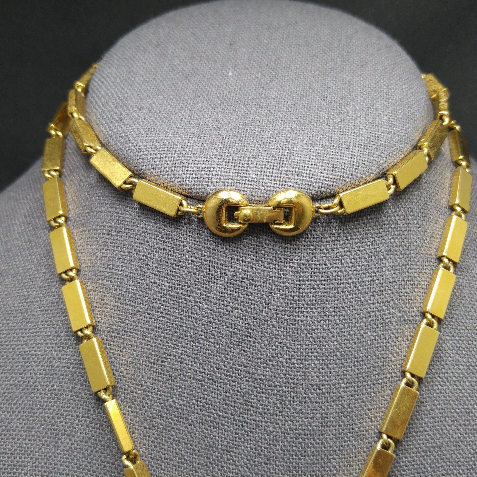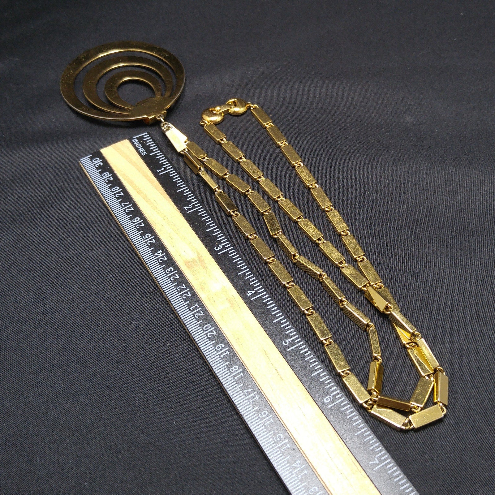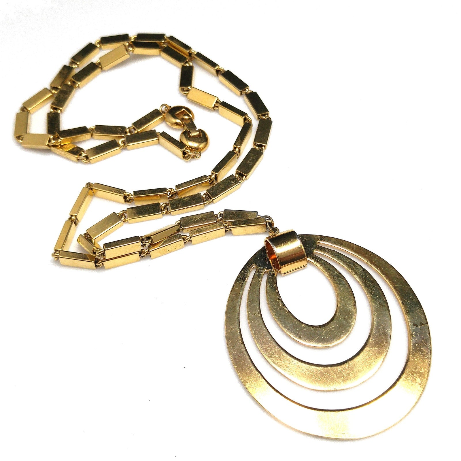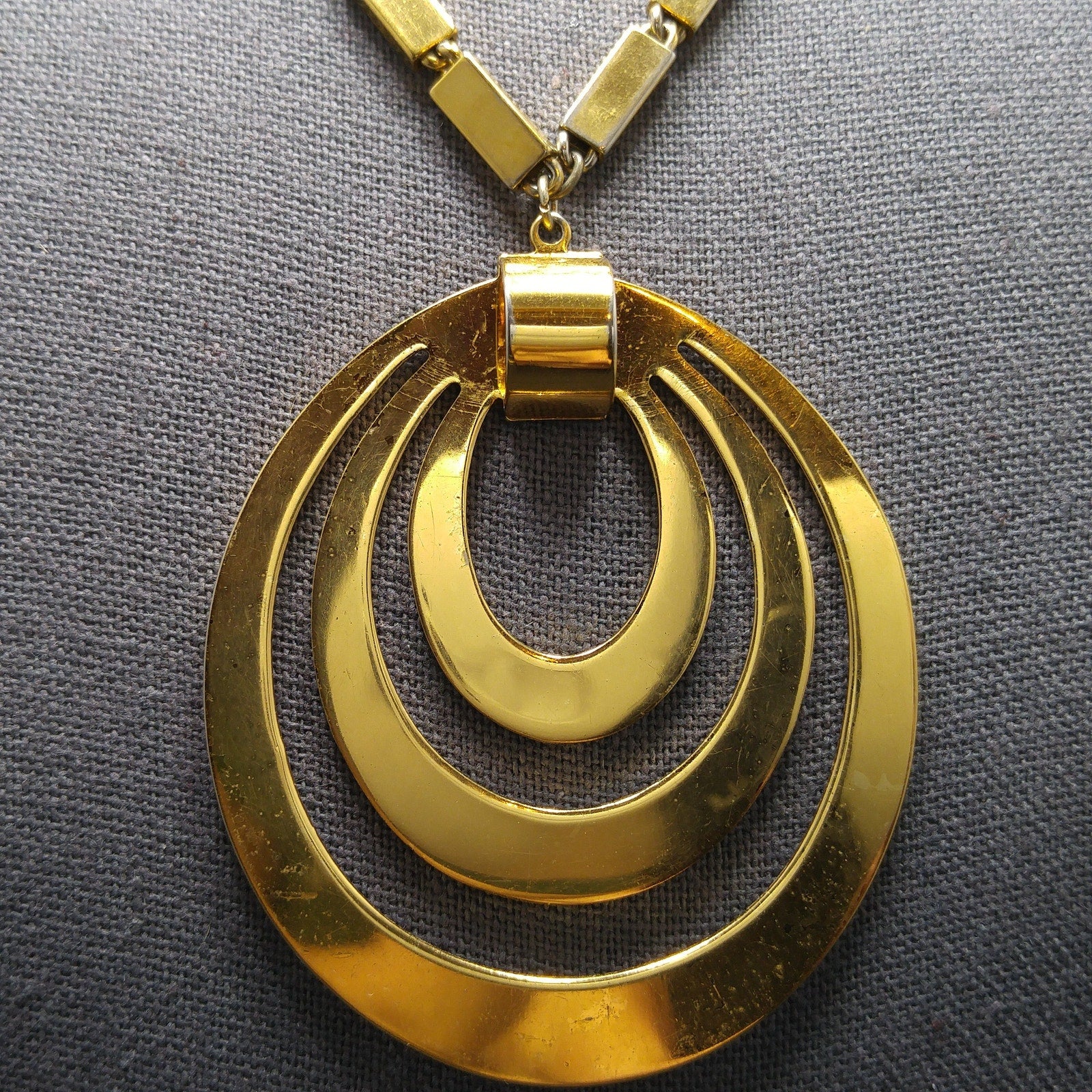 *Description: This is a beautiful Monet necklace, Tournee, a popular pendant necklace from the 1960s. This necklace is featured on page 161 of the Monet The Master Jewelers by Alice Vega. Vega explains that the fashion and accessories of the 1960s were more casual and carefree in feeling. This beautiful box chain pendant necklace is gold plated and has a long length at 29 inches with a large 3 inch pendant. This would be a great addition to your vintage jewelry collection or make a great vintage gift!