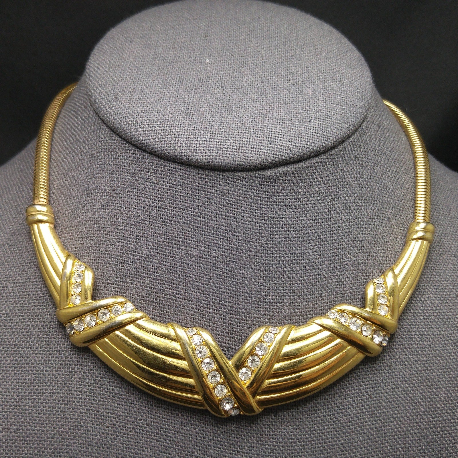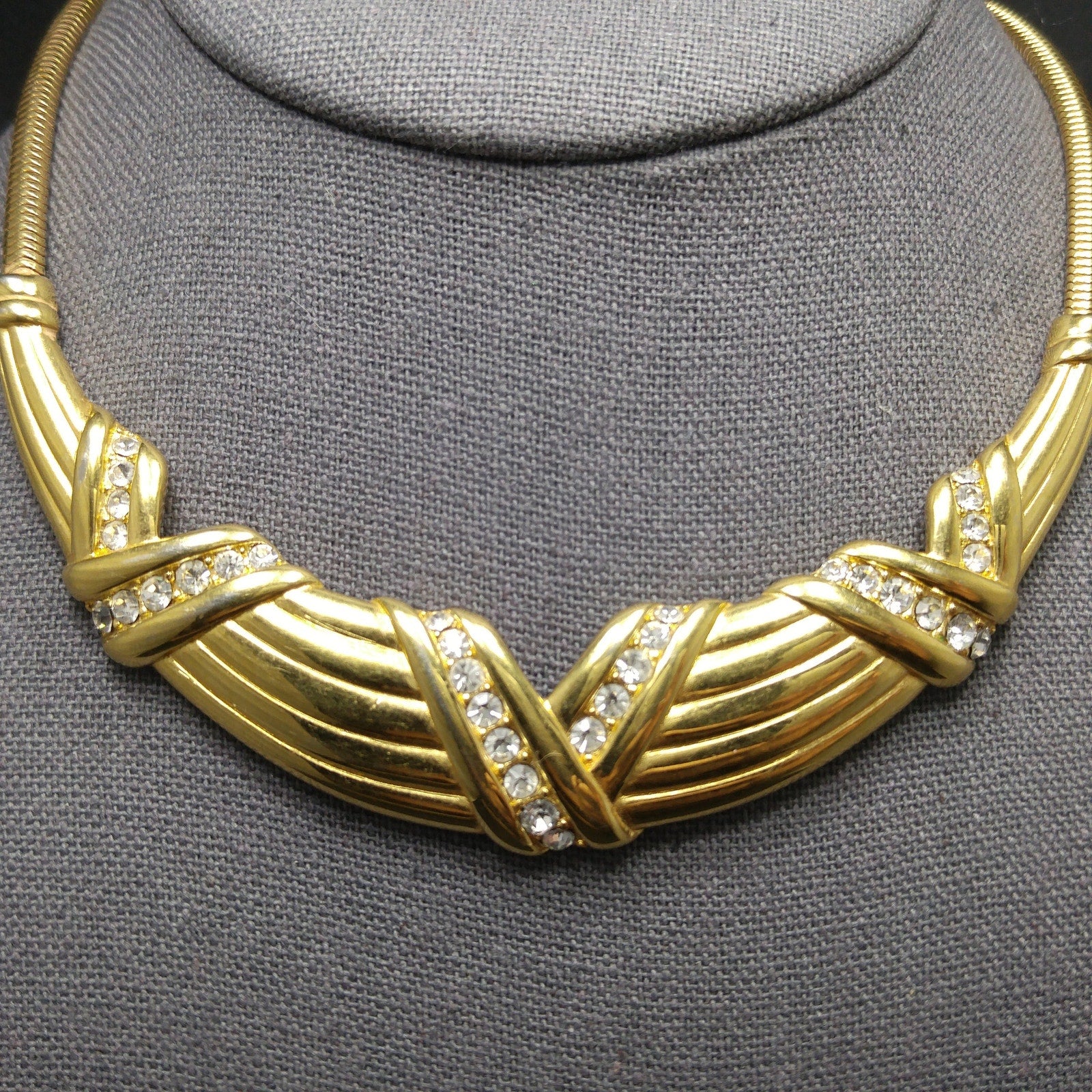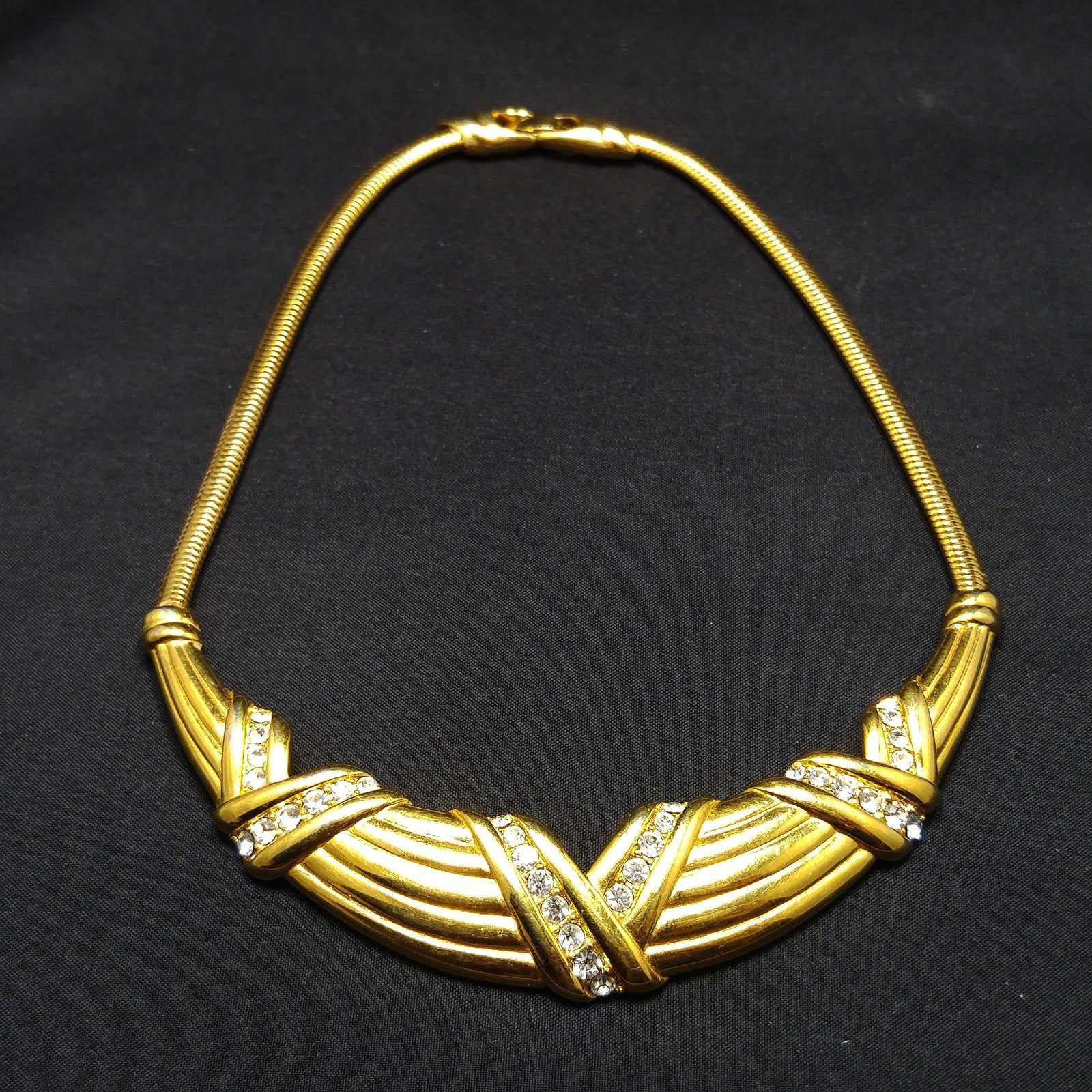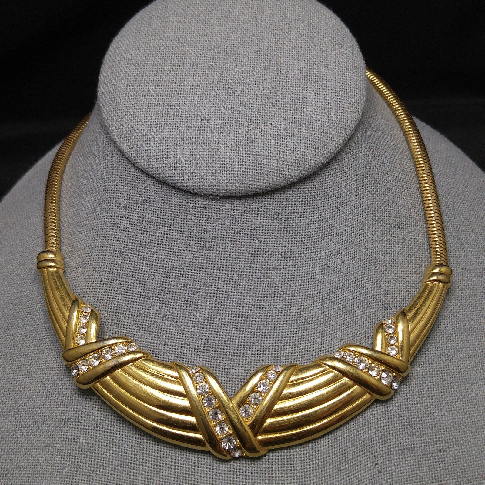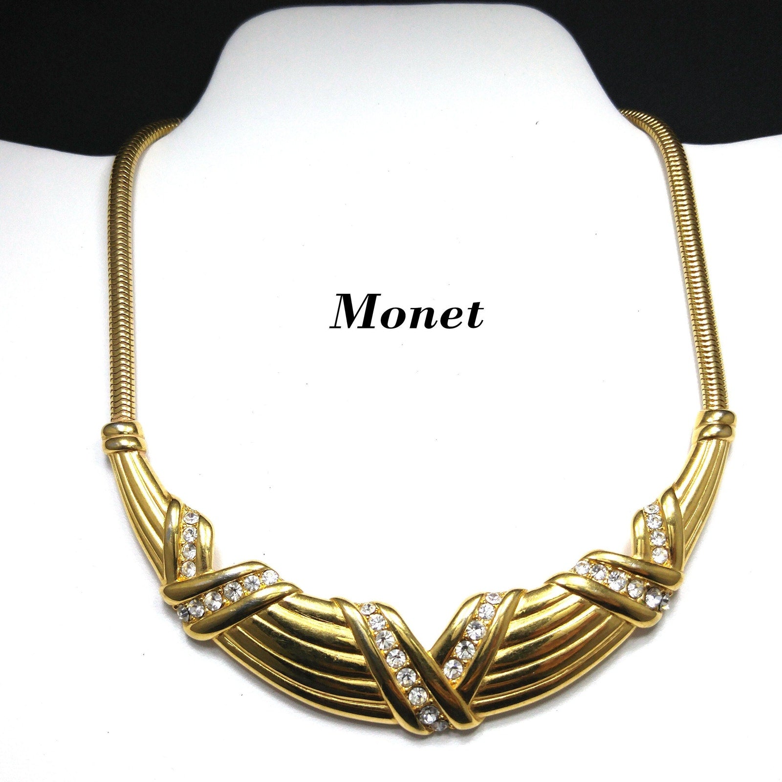 *Description: This is a beautiful Monet clear rhinestone frontal necklace from the late 1950s to 1960s. The clear rhinestones are set into three v shapes on the front of the necklace. The choker is gold plated and has a great snake chain. The necklace is stamped MONET on the frontal portion back, as well as, the back of the alligator clasp. This would be a great addition to your vintage jewelry collection or make a great vintage gift!