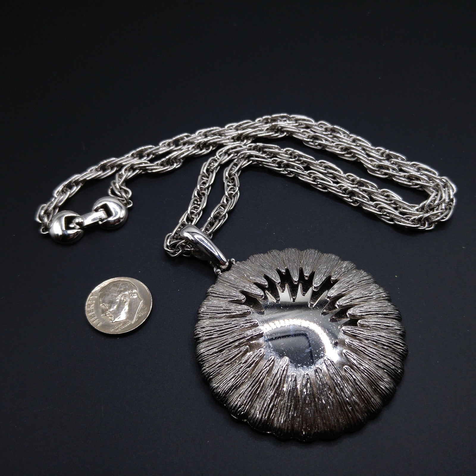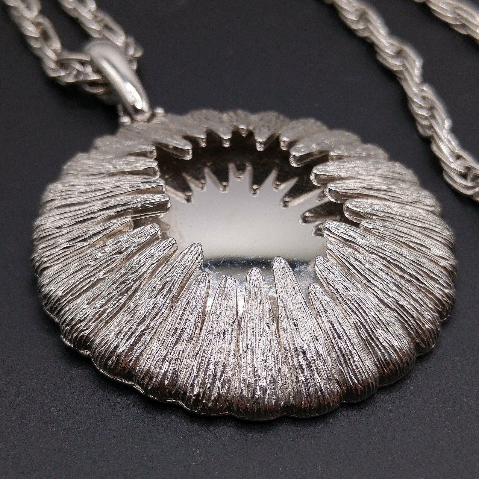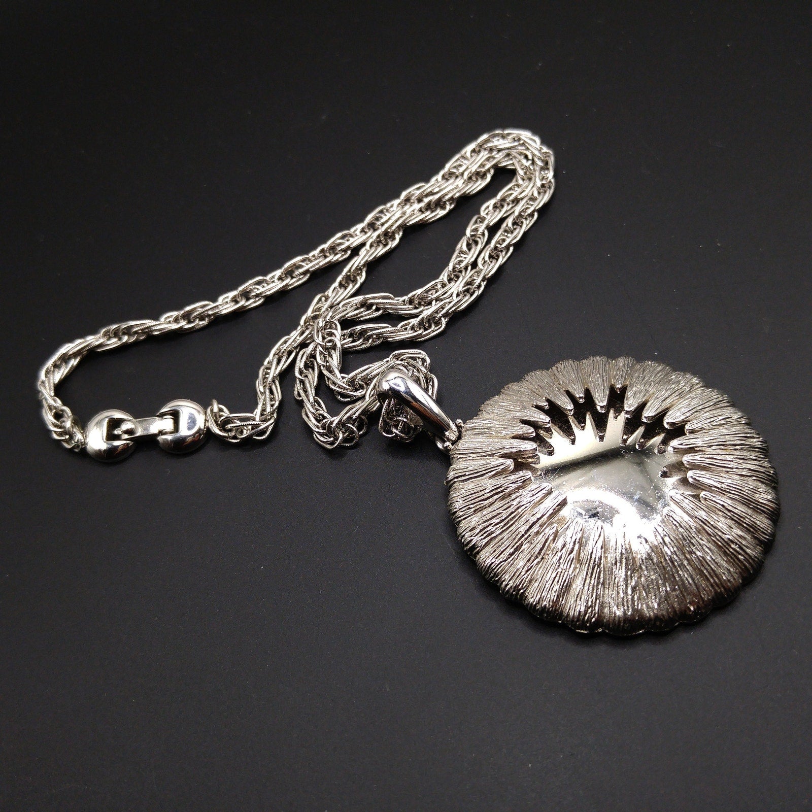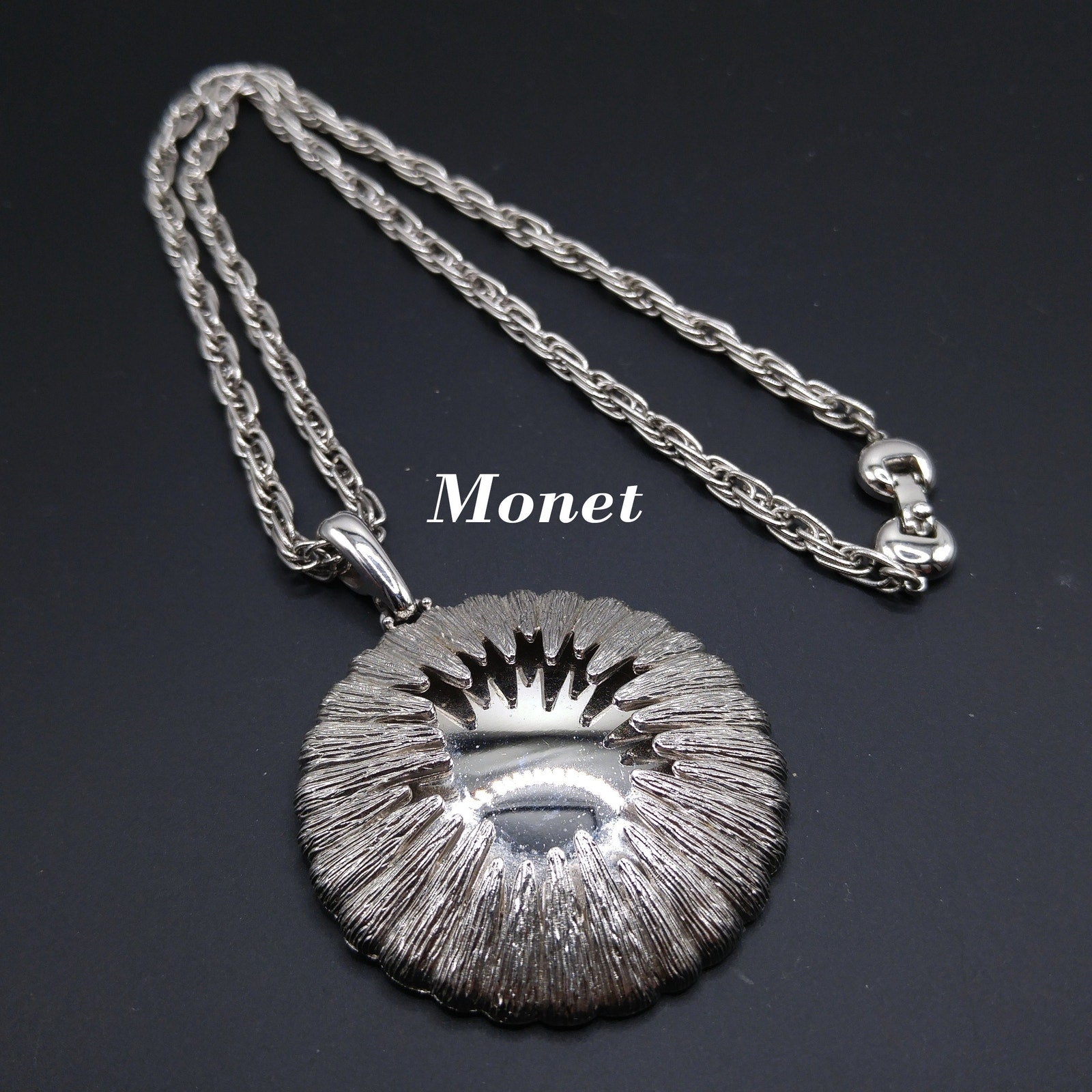 *Description: This is a great Monet vintage pendant necklace from the 1960s. The pendant is textured rhodium plate with a smooth finish inside which looks like a mirror for reflection. The chain has two end pieces with a fold over clasp which fits securely and is stamped MONET, as well as the back of the pendant. This would be a great addition to your vintage jewelry collection or make a great vintage gift!