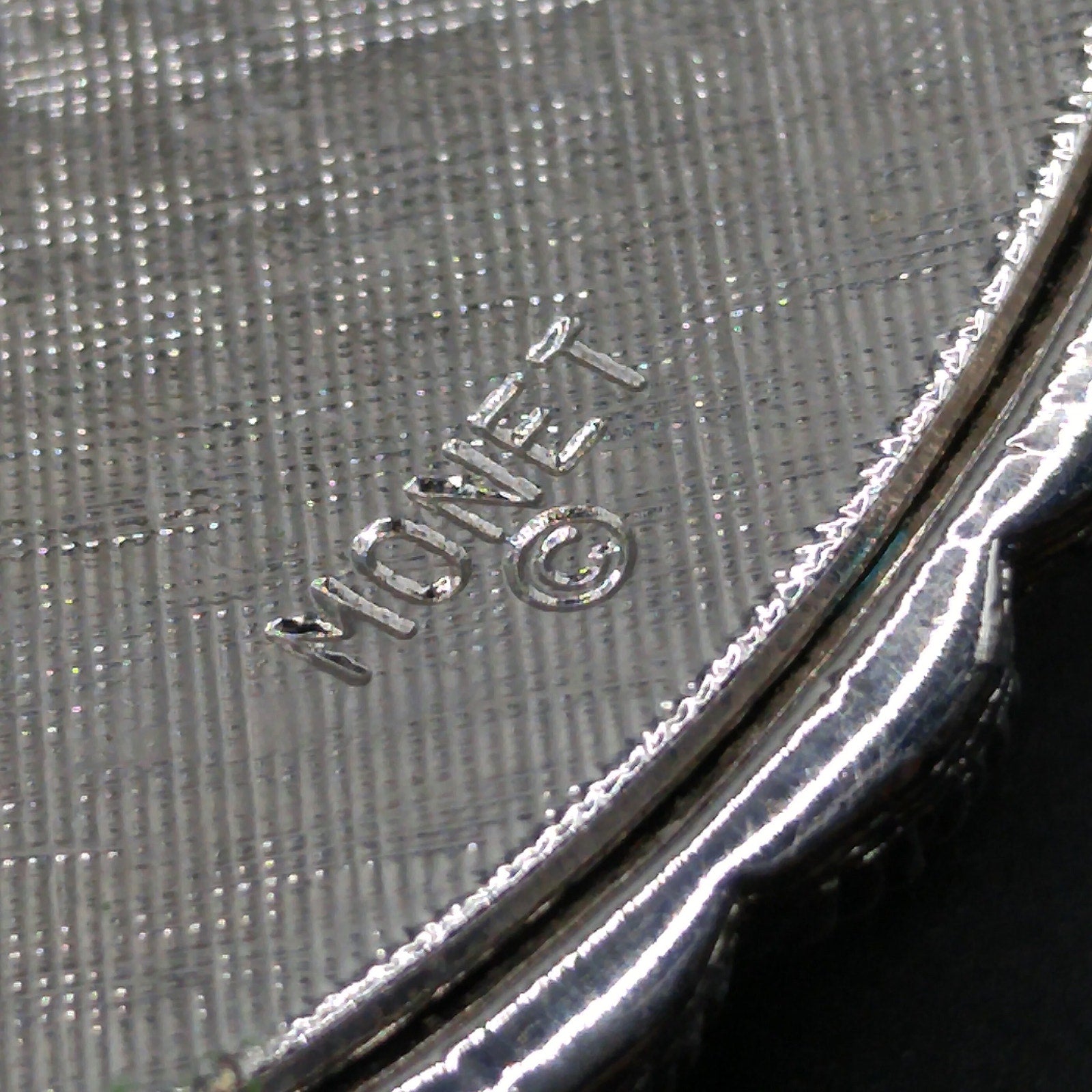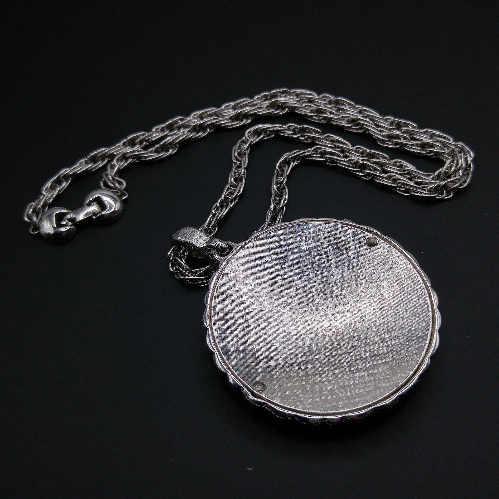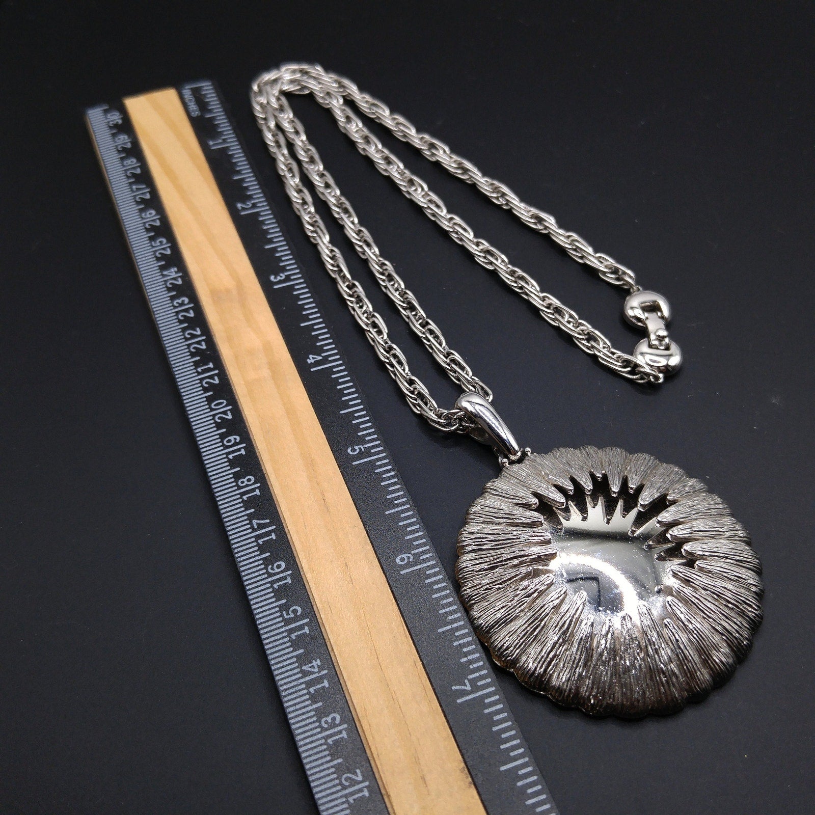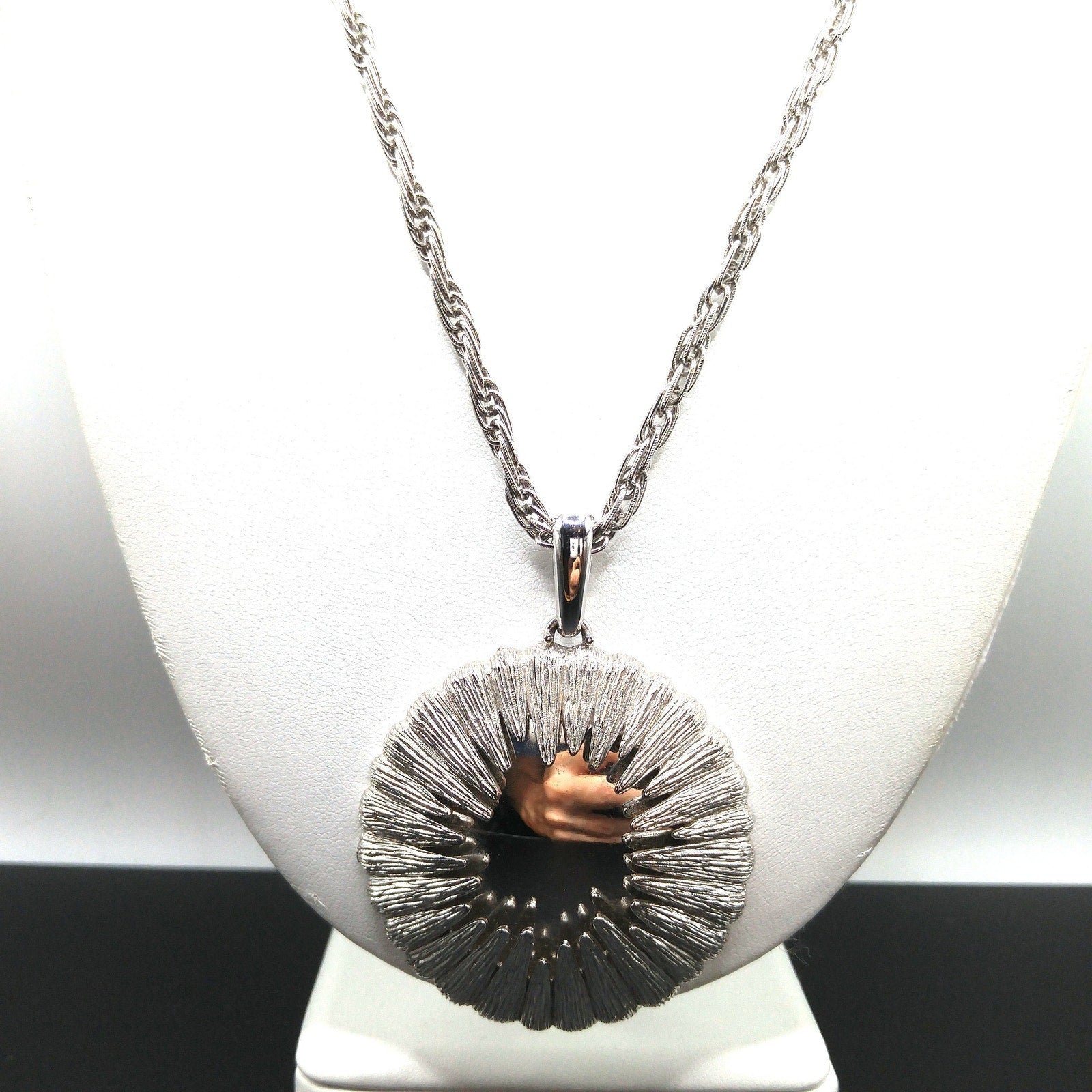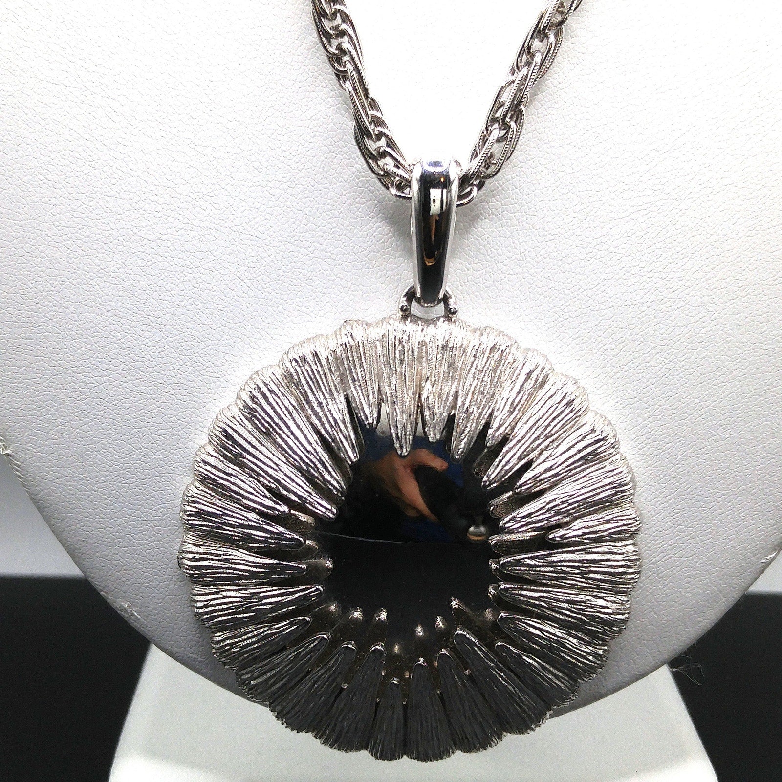 *Description: This is a great Monet vintage pendant necklace from the 1960s. The pendant is textured rhodium plate with a smooth finish inside which looks like a mirror for reflection. The chain has two end pieces with a fold over clasp which fits securely and is stamped MONET, as well as the back of the pendant. This would be a great addition to your vintage jewelry collection or make a great vintage gift!