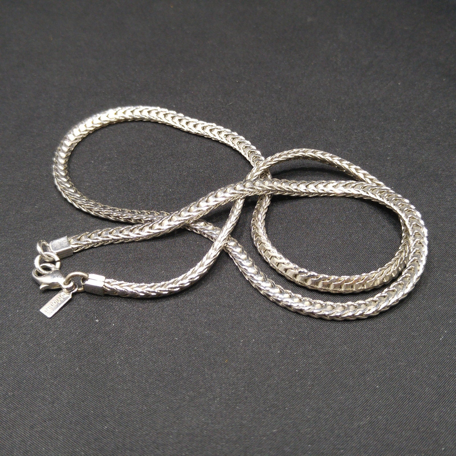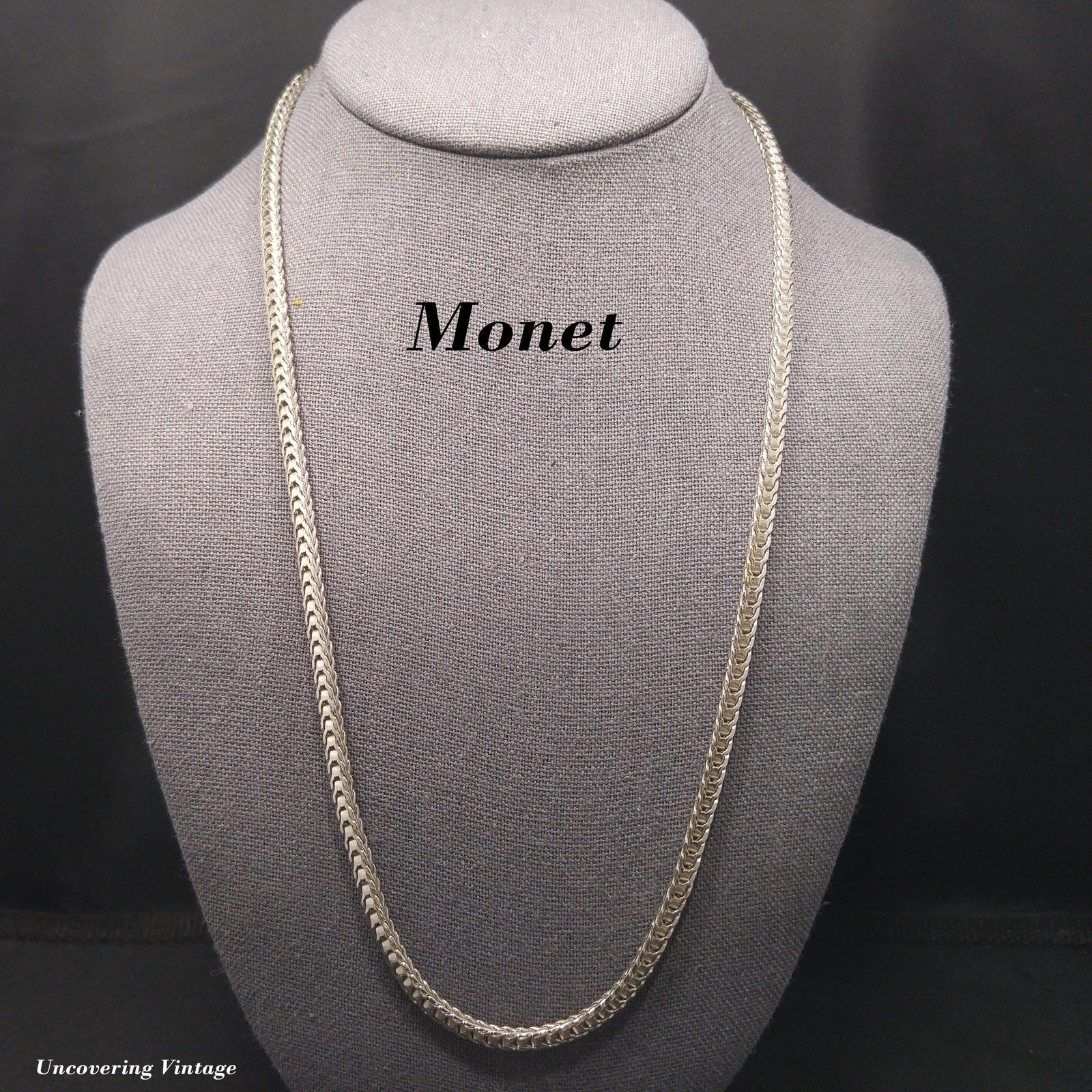 *Description: This is a beautiful Monet rhodium plated silver tone wheat chain necklace from the 1980s. The chain is 24 inches in length with the Monet hang tag and lobster clasp. This is a beautiful chain design and would be a great classic addition to your vintage jewelry collection or make a great vintage gift!