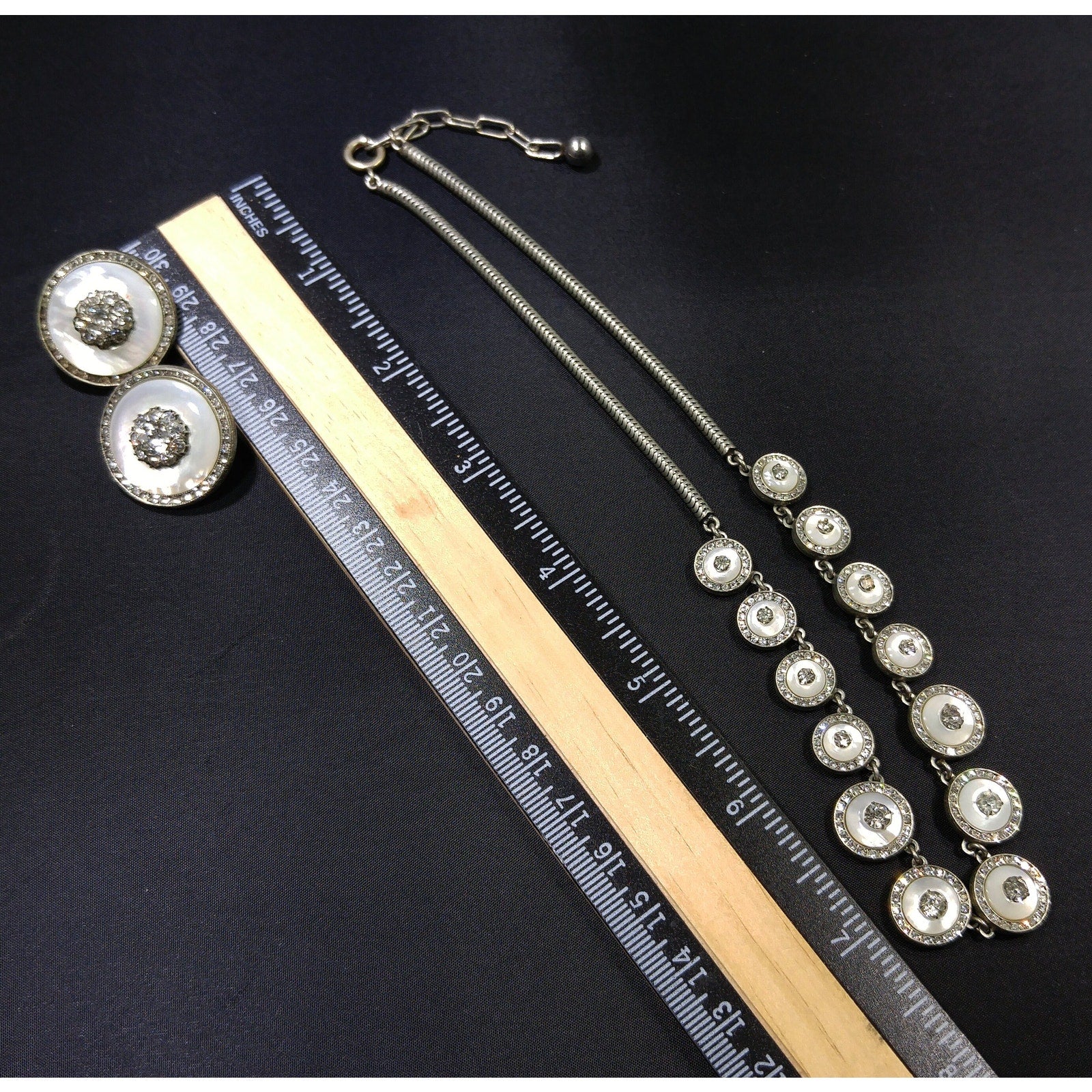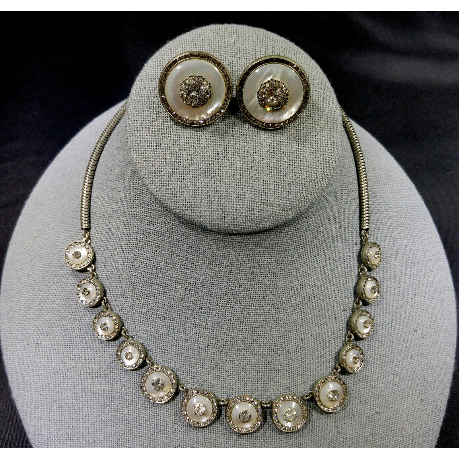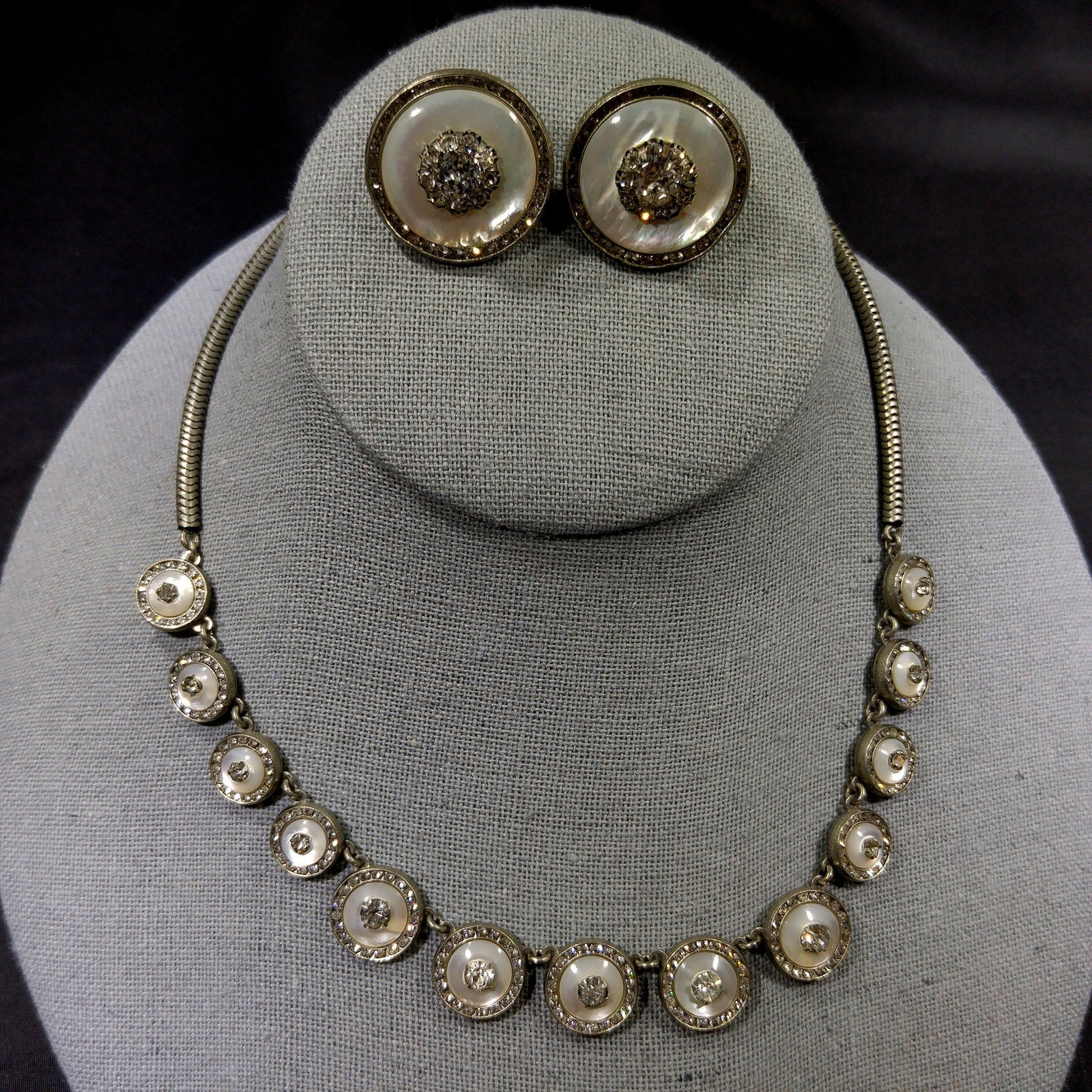 Mother of Pearl Rhinestone Jewelry, Necklace & Clip Earring Set, 1940s Vintage