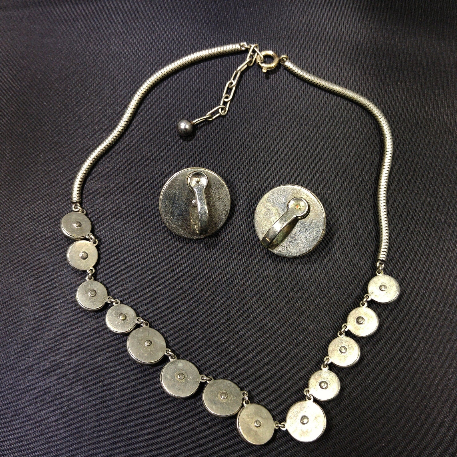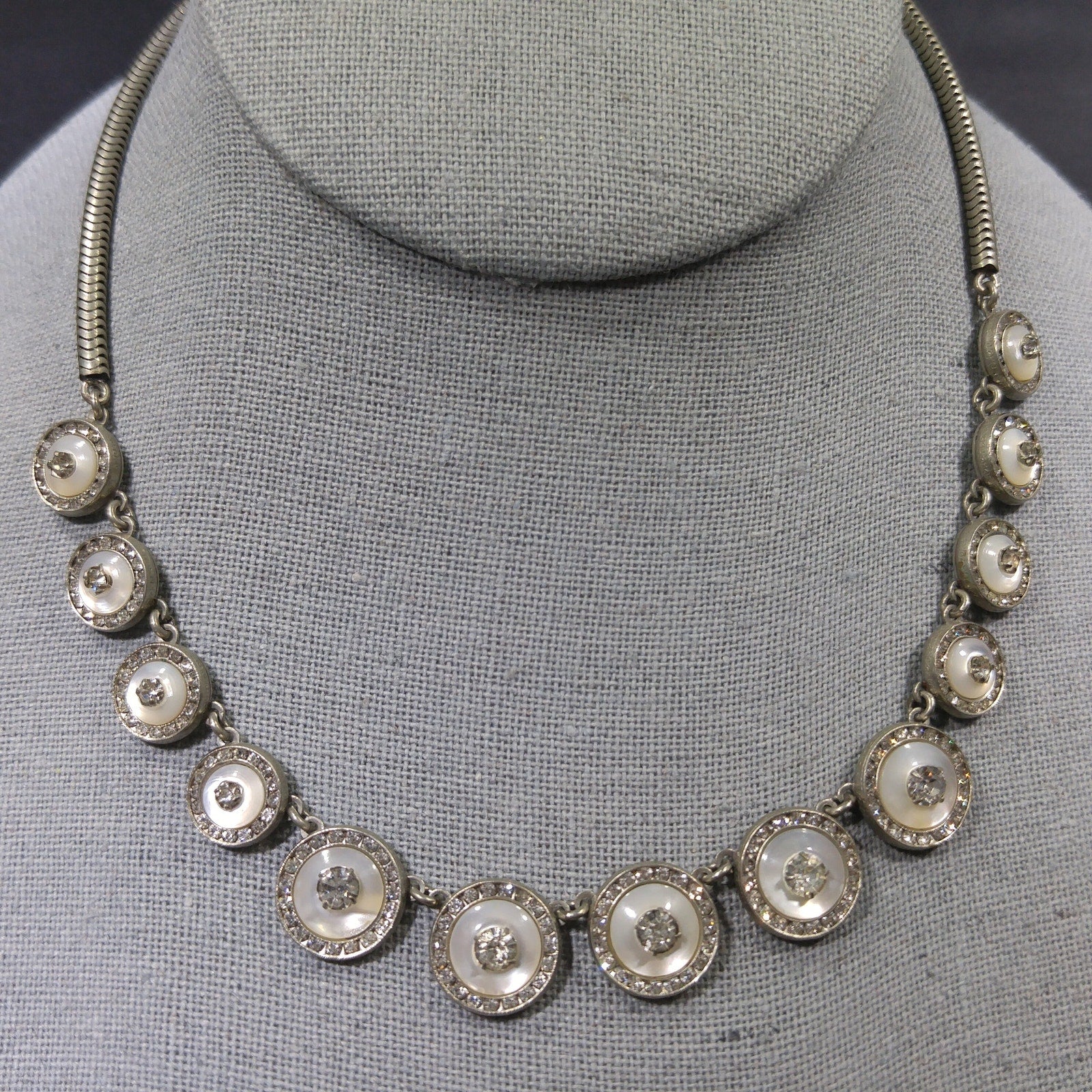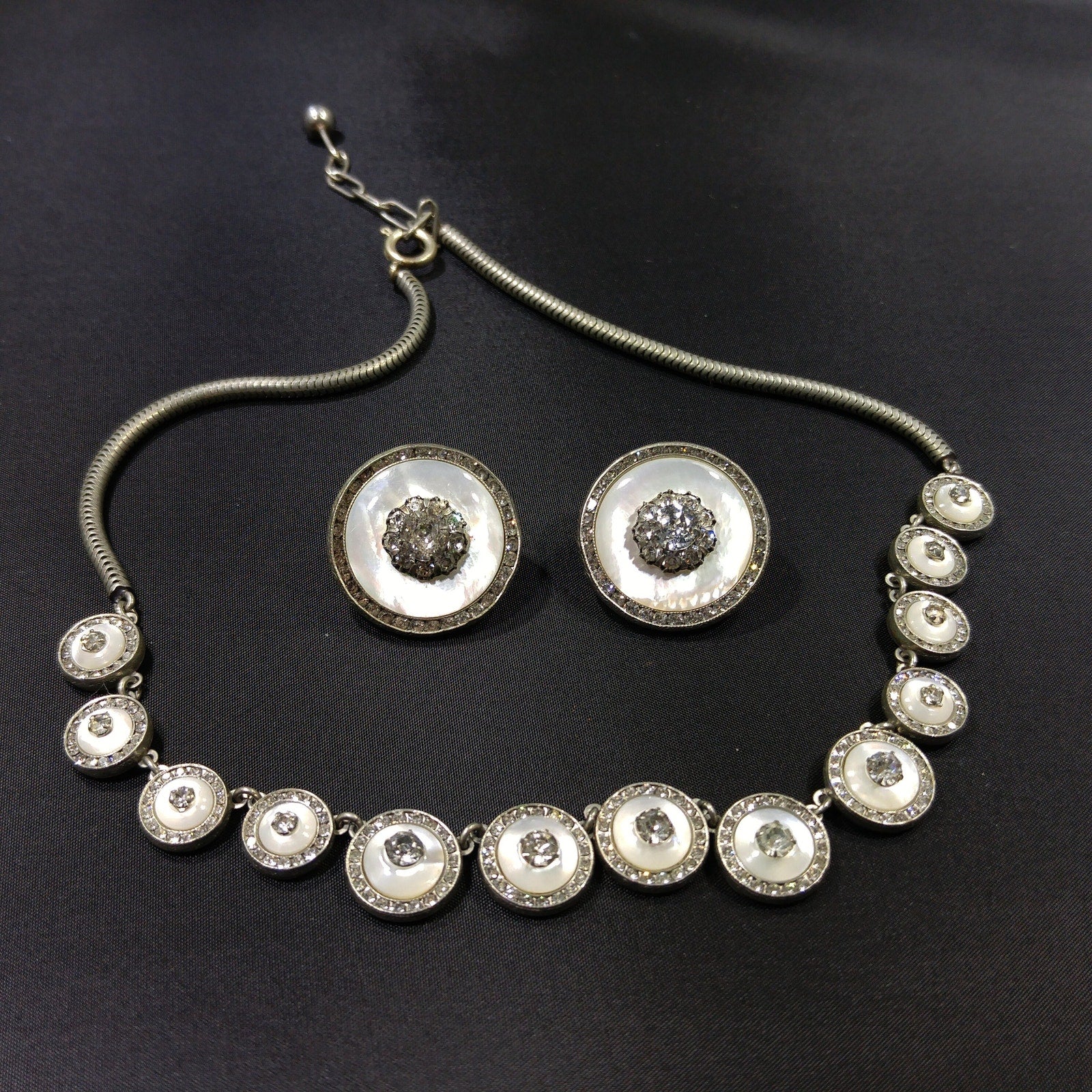 Mother of Pearl Rhinestone Jewelry, Necklace & Clip Earring Set, 1940s Vintage