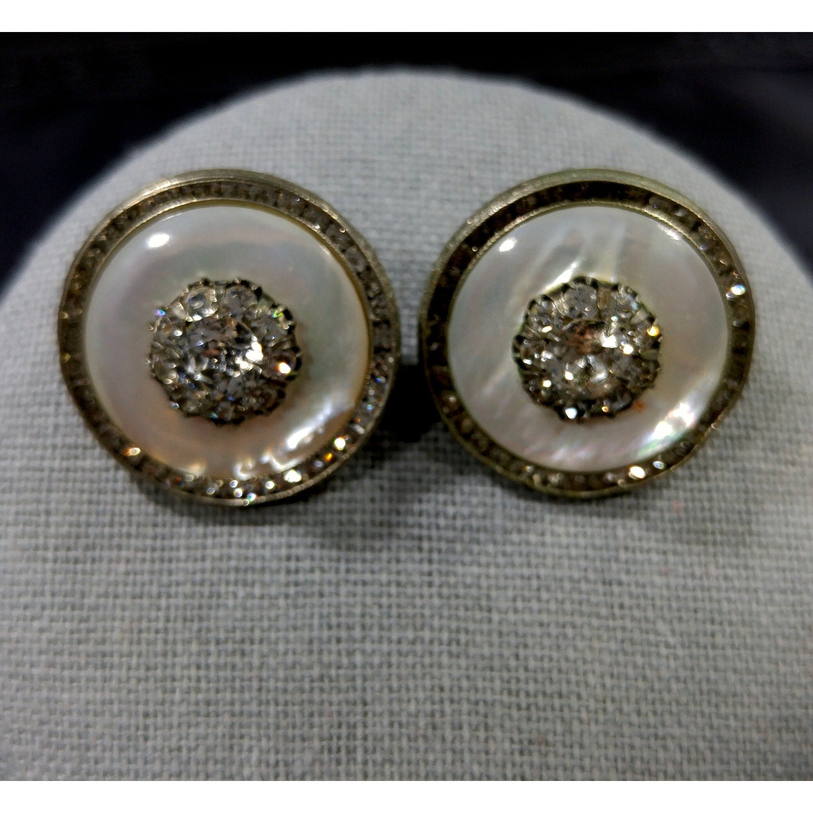 *Description: This is a beautiful Mother of Pearl shell and clear rhinestone set from the 1940s or late 1930s. The MOP disks have clear rhinestone centers and are also encircled by clear rhinestones. The necklace has a snake chain and an older style spring ring clasp. The earrings have clips that are solid and fit securely on your ears. This would be a great addition to your vintage jewelry collection or make a great vintage gift!