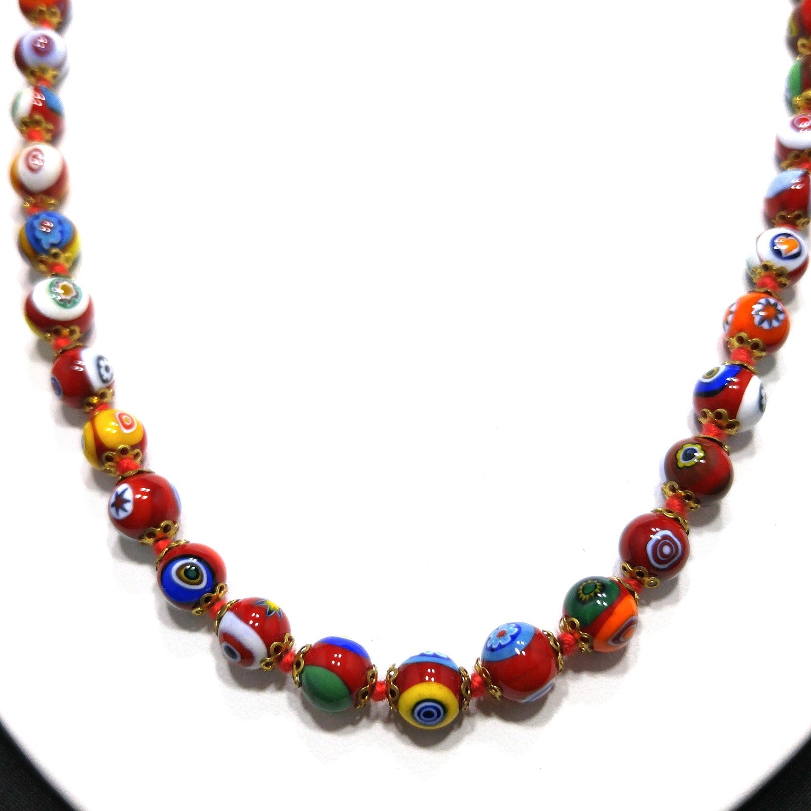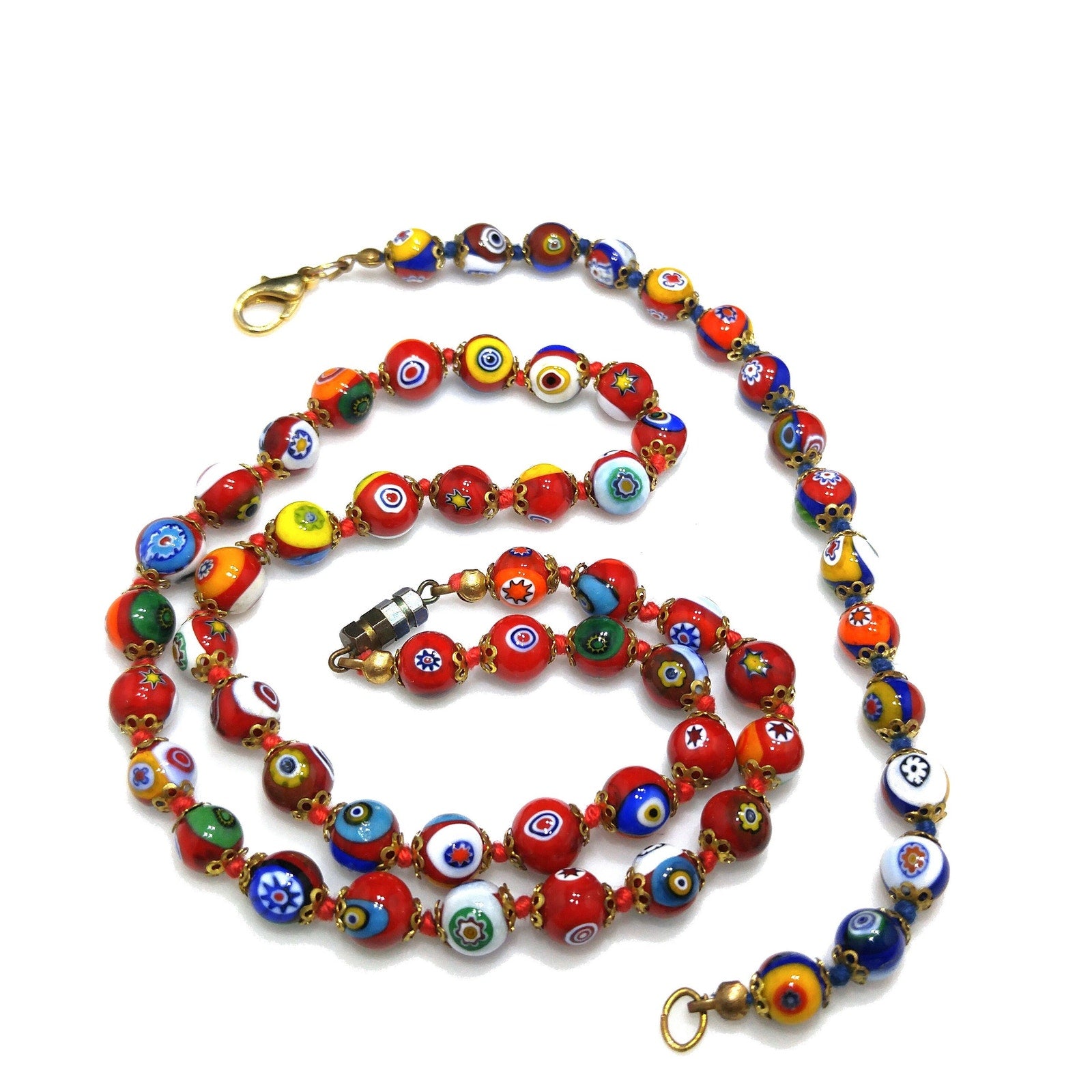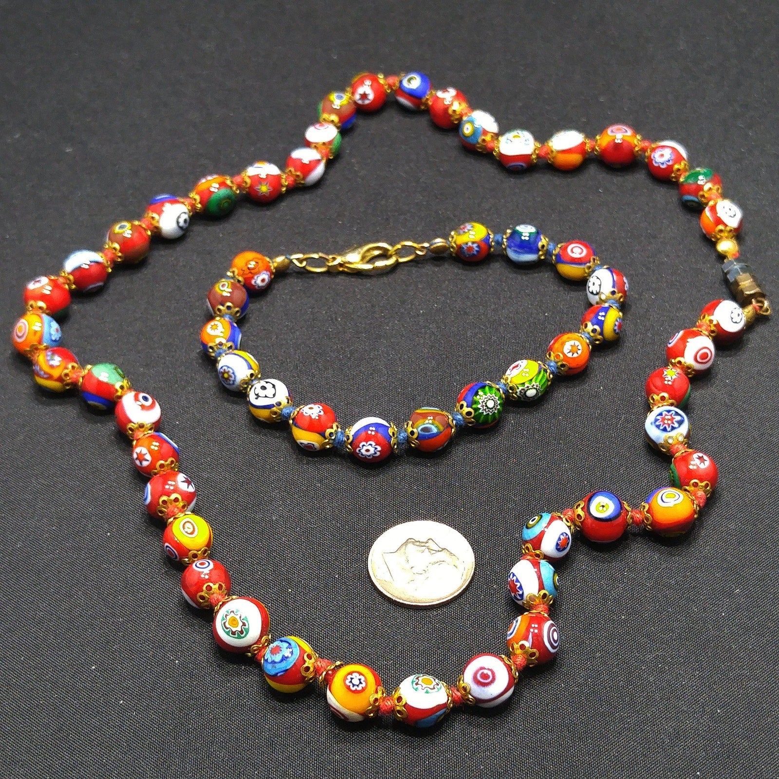 *Description: This is a beautiful vintage millefiori beaded necklace and matching bracelet from the 1950s. The beads are made with bright colors of glass. This necklace is hand knotted and is attached to a two tone barrel clasp on the necklace. The bracelet had the clasp replaced with a lobster clasp which I'm sure was easier to use on the bracelet than a barrel clasp. Both necklace and bracelet have red hand knotted thread between each glass bead. Glass beads are a mixture of sand, potash or soda, heated with lime, and invented in Egypt about 9,000 years ago. It was crafted into beads by the Egyptians and Romans. Glass beads are essential to adornment the world over and the trade of these beads are surrounded by secrecy. Glass bead making techniques are still passed down by word of mouth in Venice, where in 1292 glass makers were moved to the island of Murano and forbidden, on pain of death, to reveal their secrets. This would be a great addition to your vintage jewelry collection or make a great vintage gift!