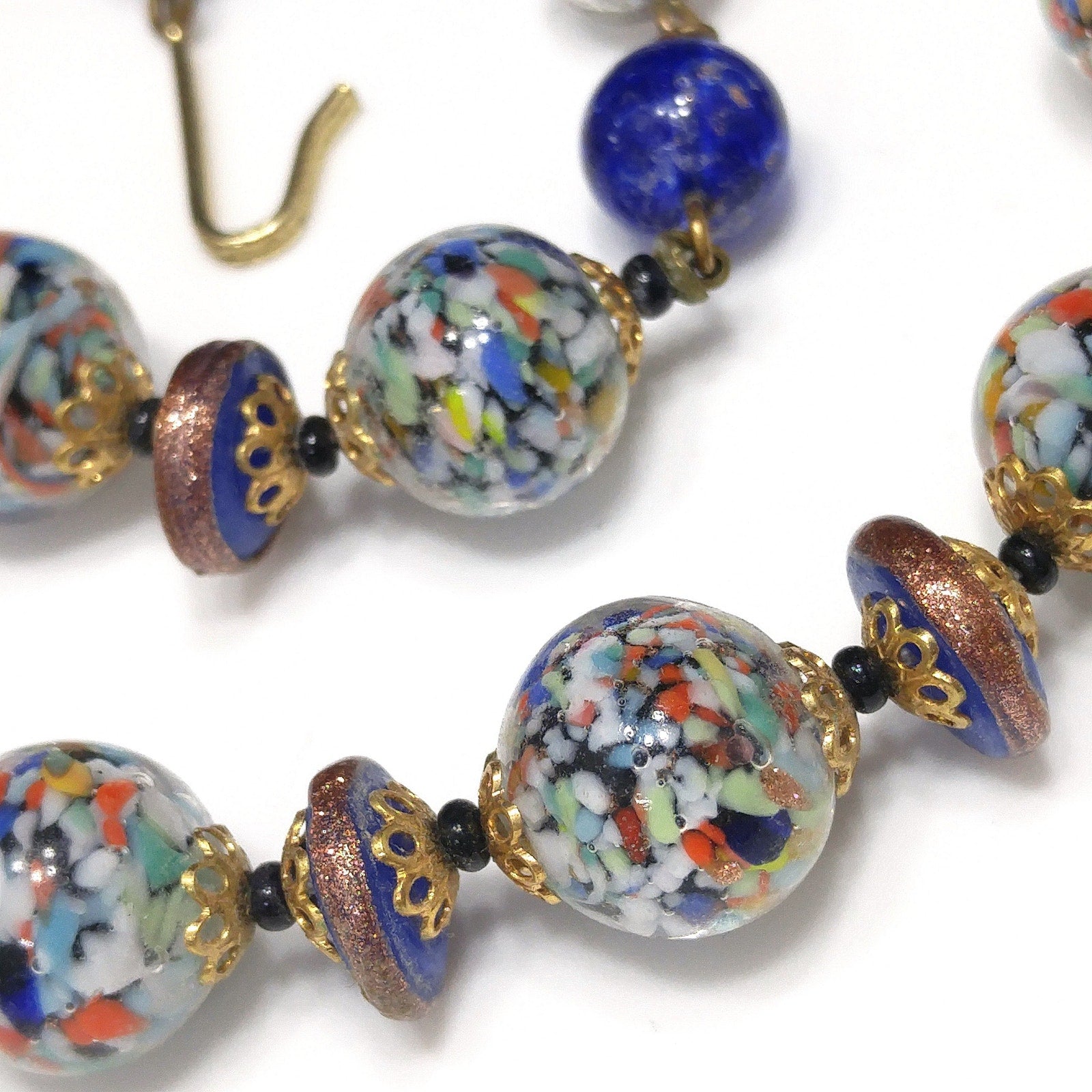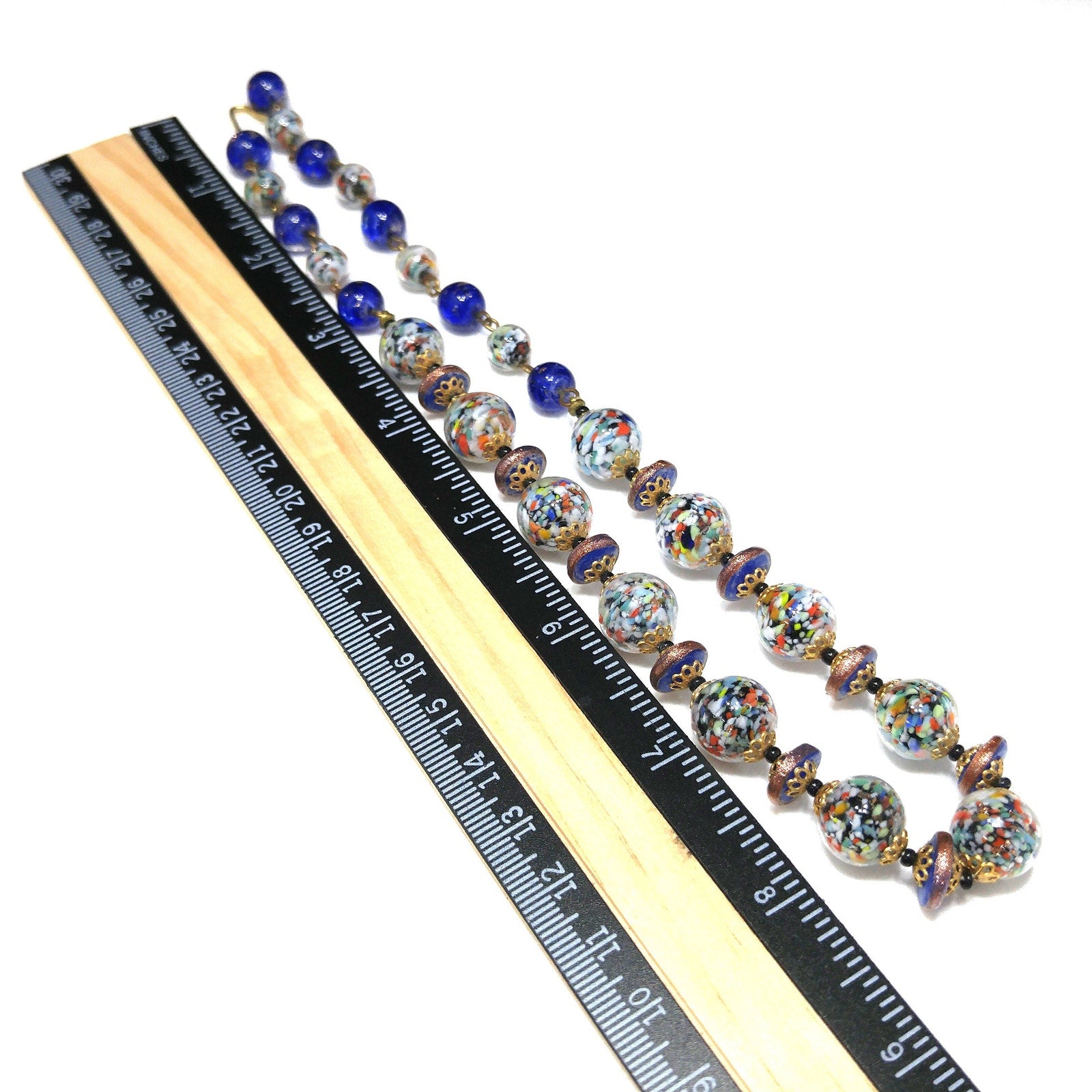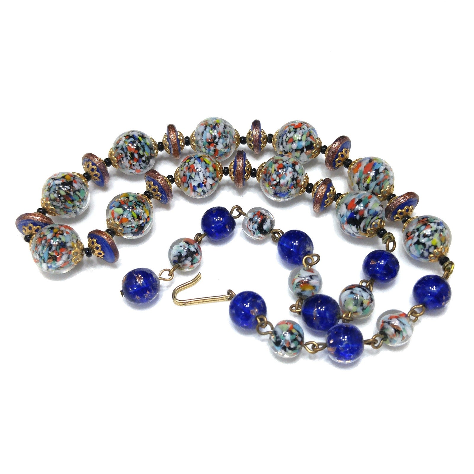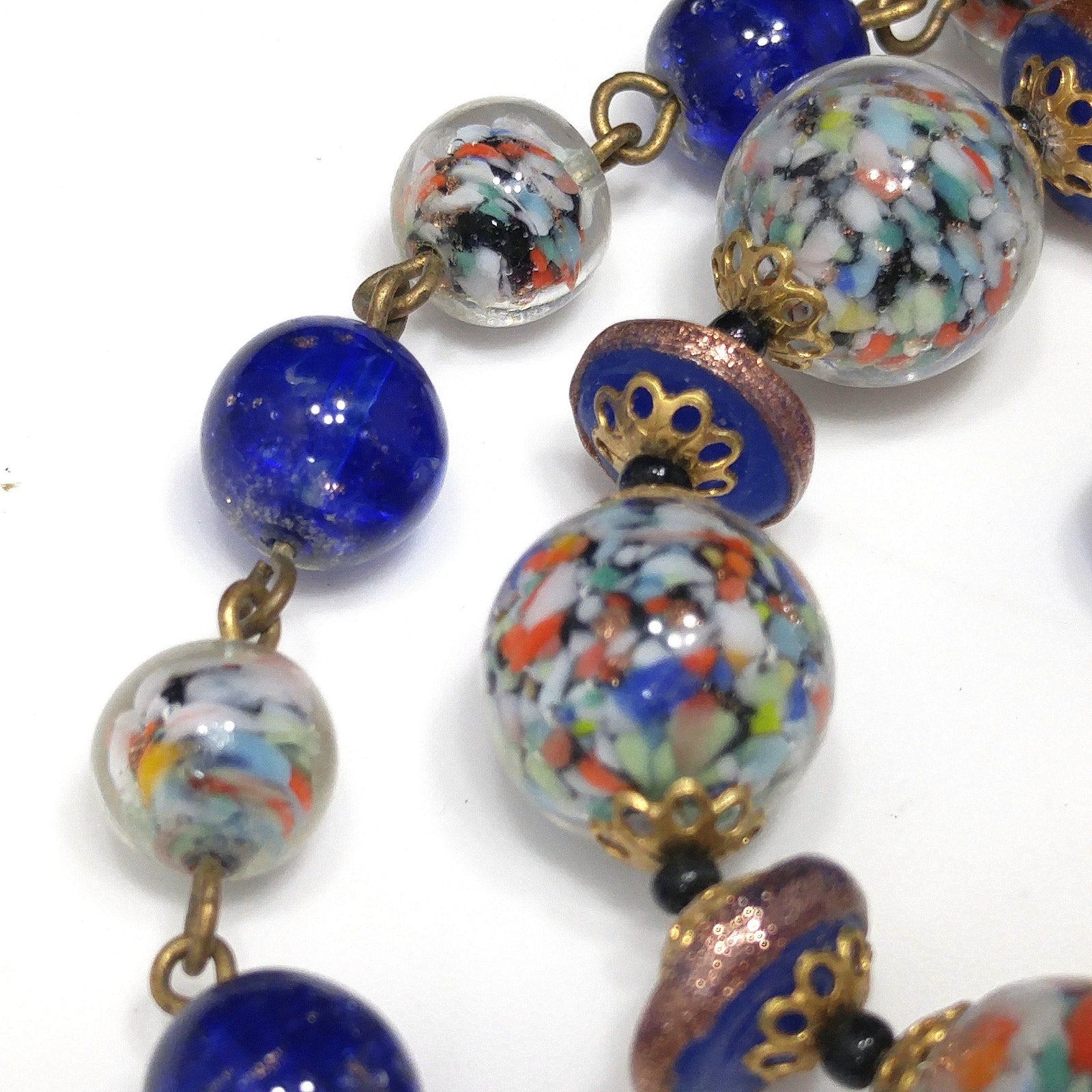 *Description: This is a beautiful vintage Murano glass beaded necklace with aventurine beads which look like glitter along the outside of this beautiful cobalt blue bead or within the bead. The larger 12mm beads are clear glass with multicolored specks of glass inside. Some of the extension beads are cobalt blue with aventurine glitter glass floating inside and others are clear glass with the multicolored glass inside. The combination of clear glass multicolored speckled beads and aventurine cobalt blue beads are gorgeous and are a future heirloom item. These are beautiful Italian beads and would be a great addition to your vintage jewelry collection or make a great vintage gift!