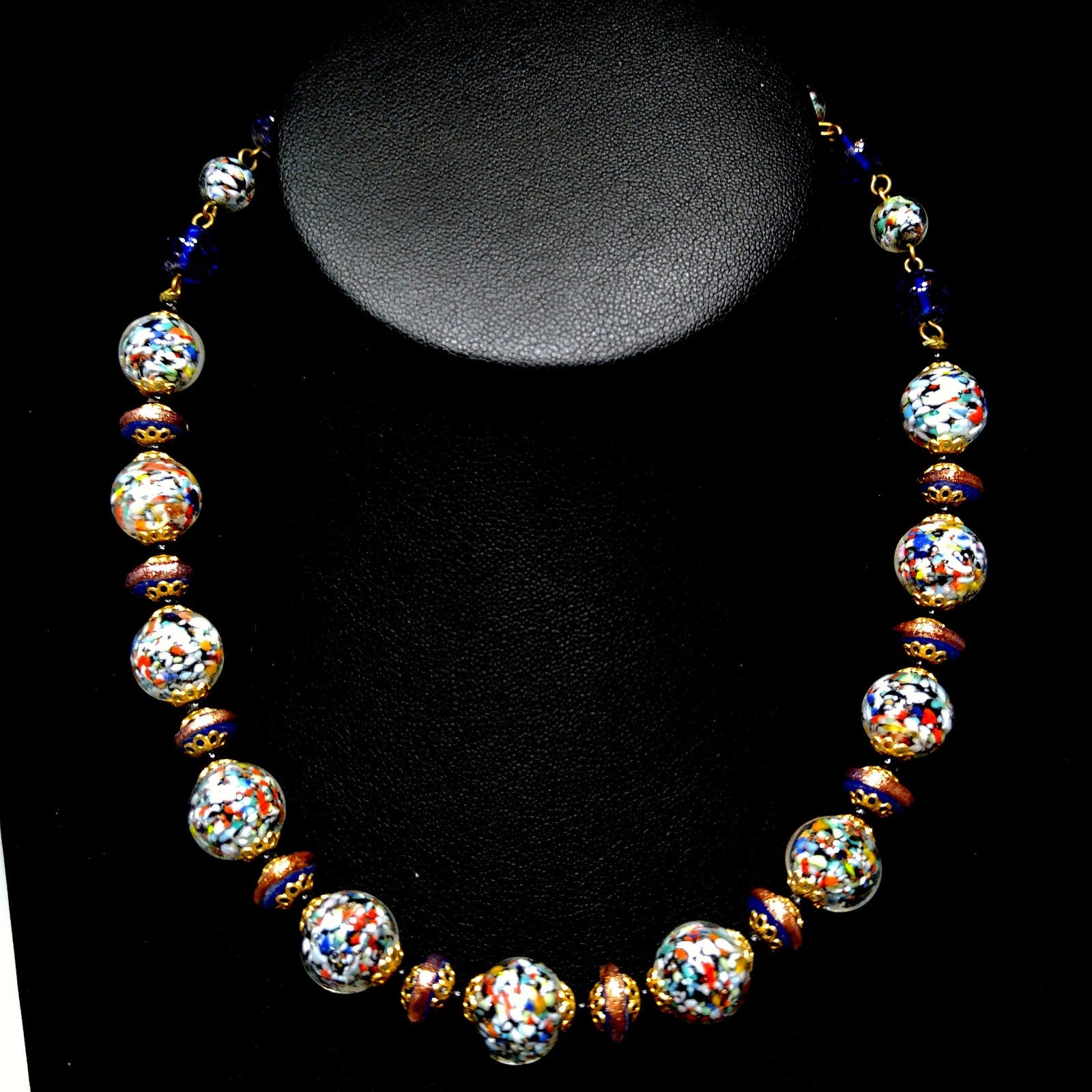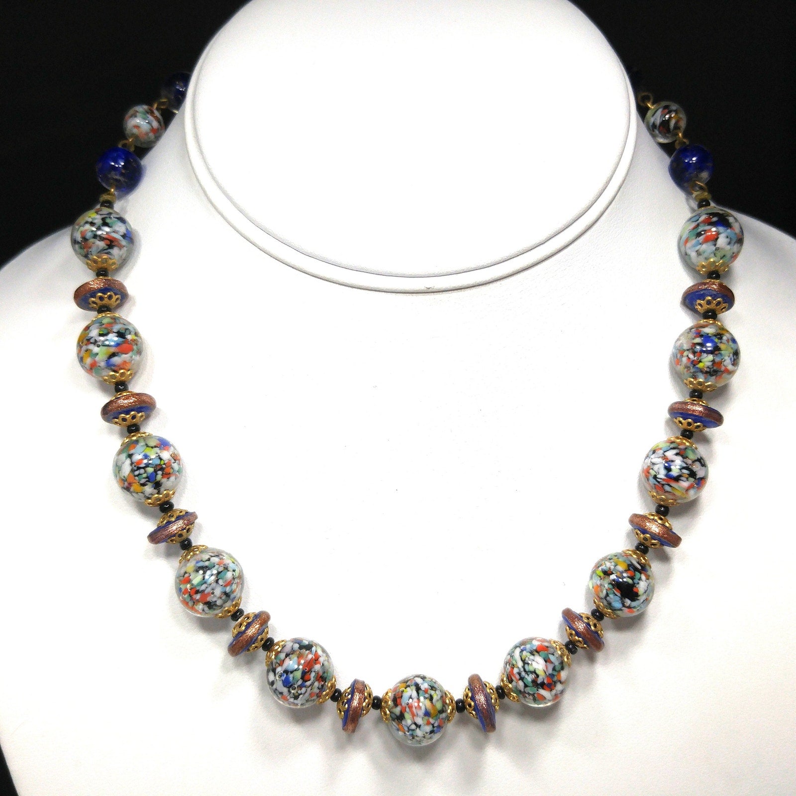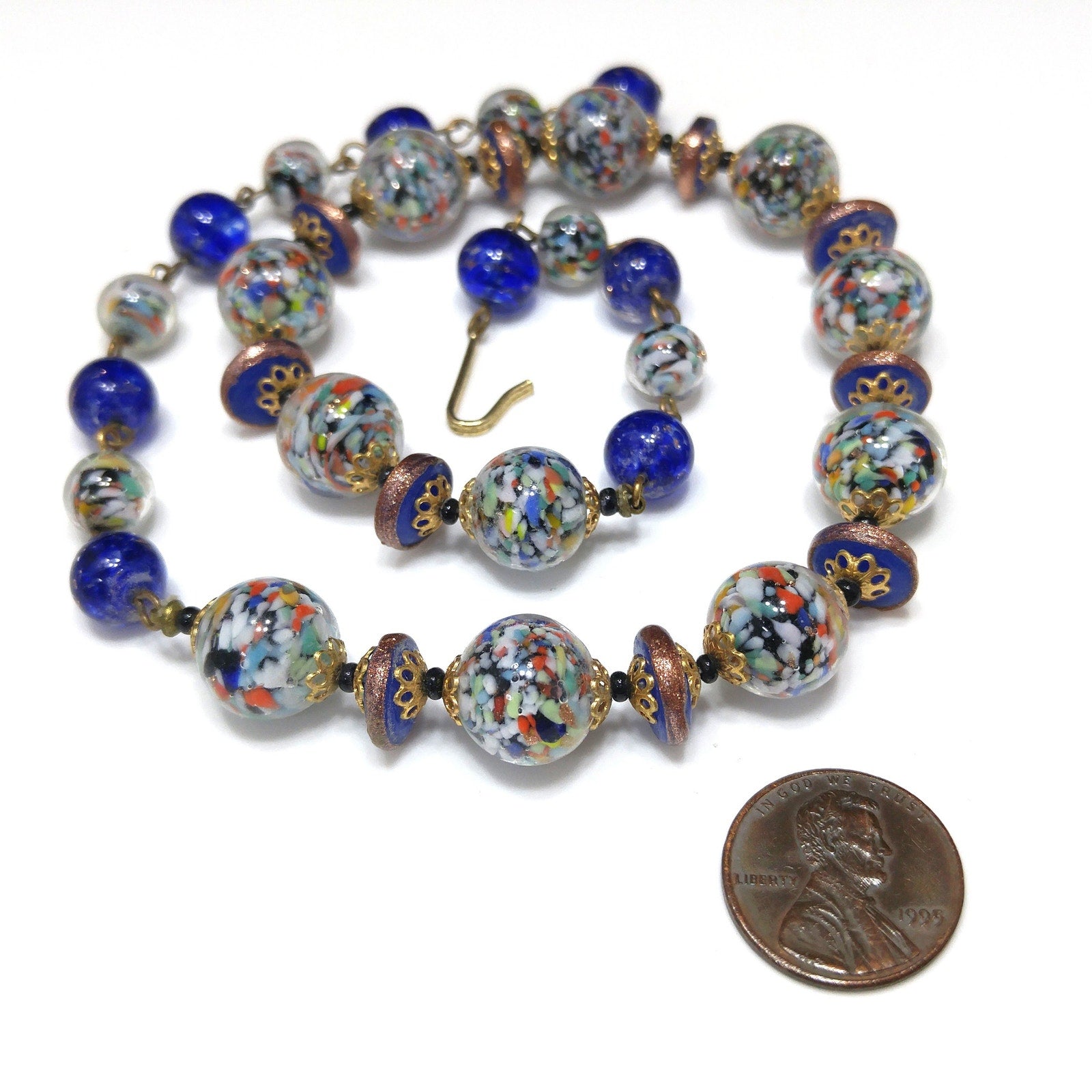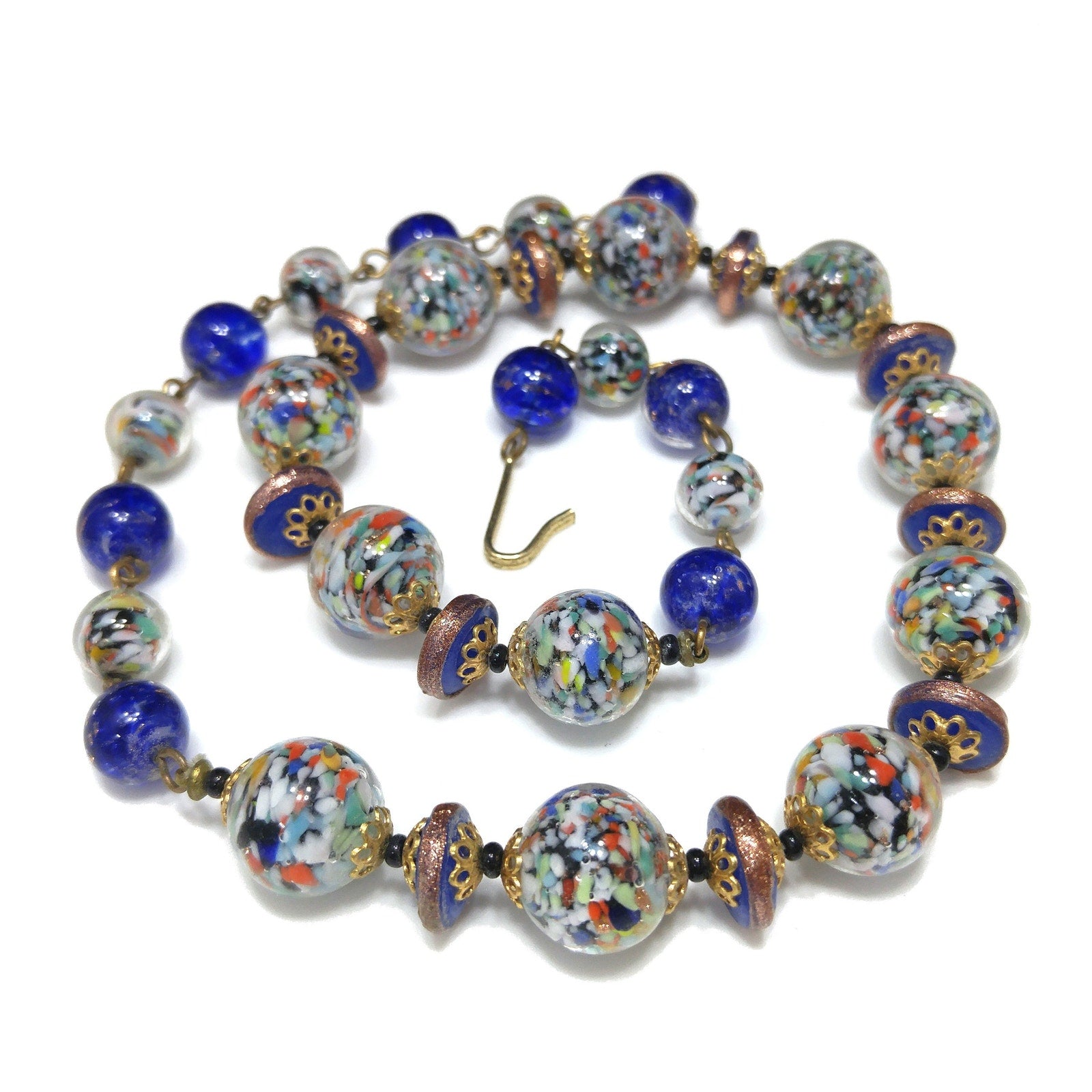 *Description: This is a beautiful vintage Murano glass beaded necklace with aventurine beads which look like glitter along the outside of this beautiful cobalt blue bead or within the bead. The larger 12mm beads are clear glass with multicolored specks of glass inside. Some of the extension beads are cobalt blue with aventurine glitter glass floating inside and others are clear glass with the multicolored glass inside. The combination of clear glass multicolored speckled beads and aventurine cobalt blue beads are gorgeous and are a future heirloom item. These are beautiful Italian beads and would be a great addition to your vintage jewelry collection or make a great vintage gift!