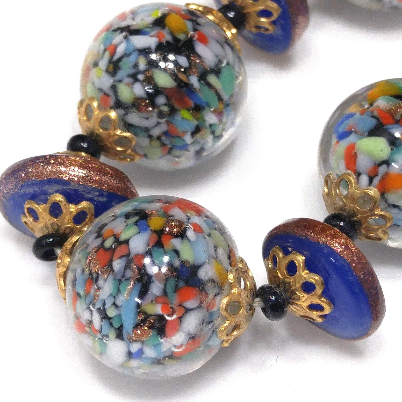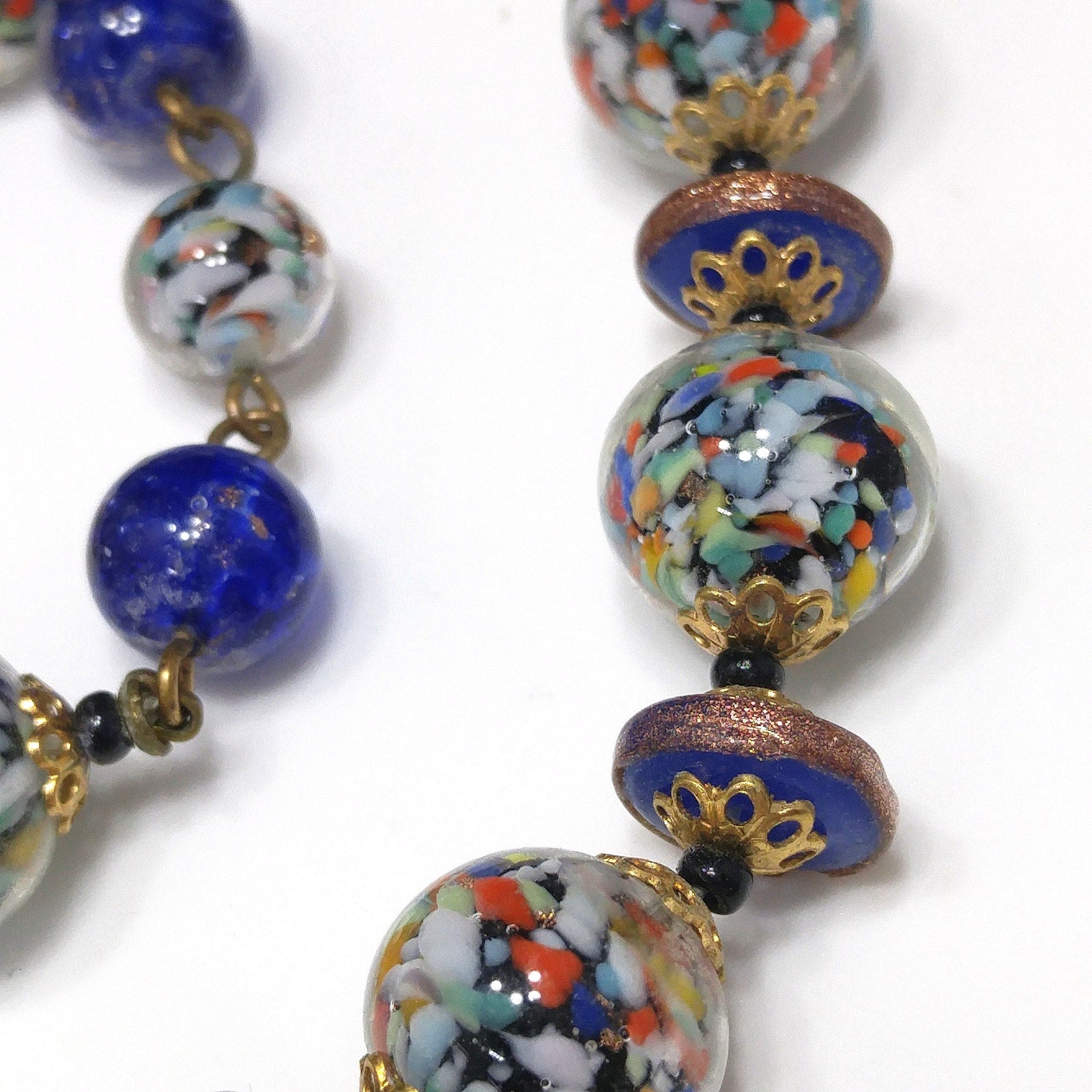 Murano Speckled Glass Beaded Necklace, Cobalt Blue Aventurine Glitter Glass, 1950s Vintage Jewelry