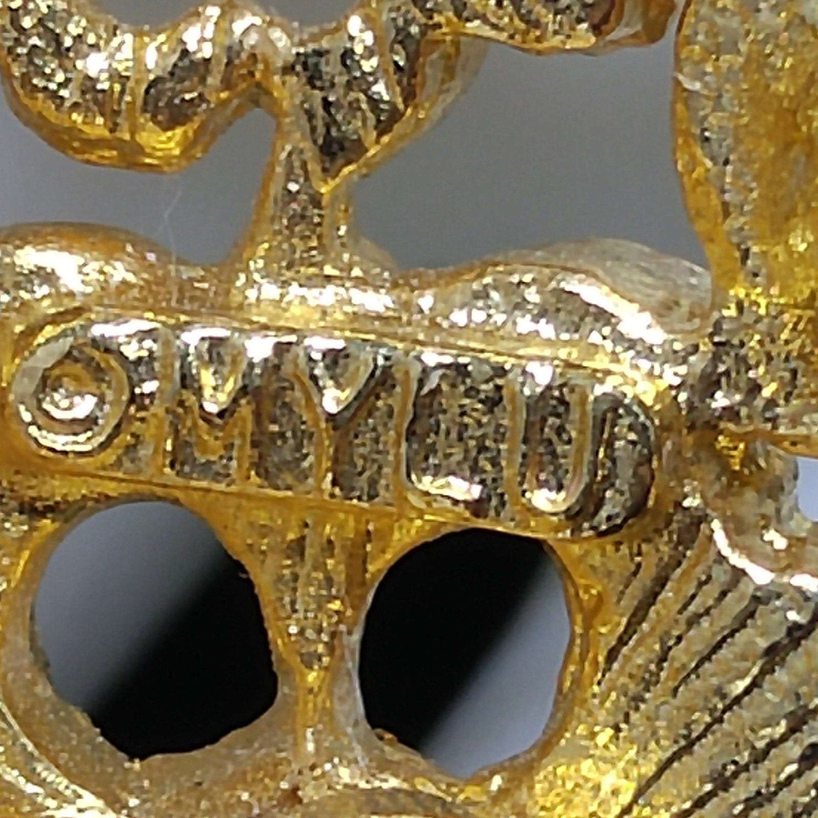 This is a beautiful vintage Mylu Christmas tree brooch from the 1960s. Featured in several reference books, this collectible piece is described in Coro Jewelry, A Collector’s Guide by Marcia Sparkles Brown (p. 230) as “gold plated flowers form a tree with rhinestone ornaments.” It is also shown in Christmas Tree Pins O Christmas Tree by Nancy Yunker Trowbridge (p. 114), where it is noted for its lacy floral design and ornate scrolled base.