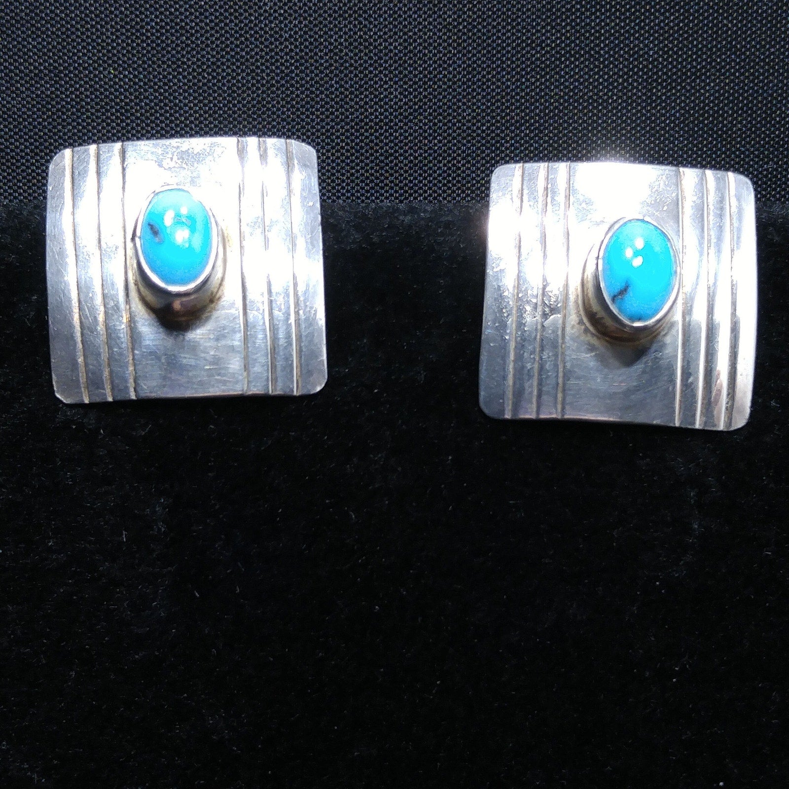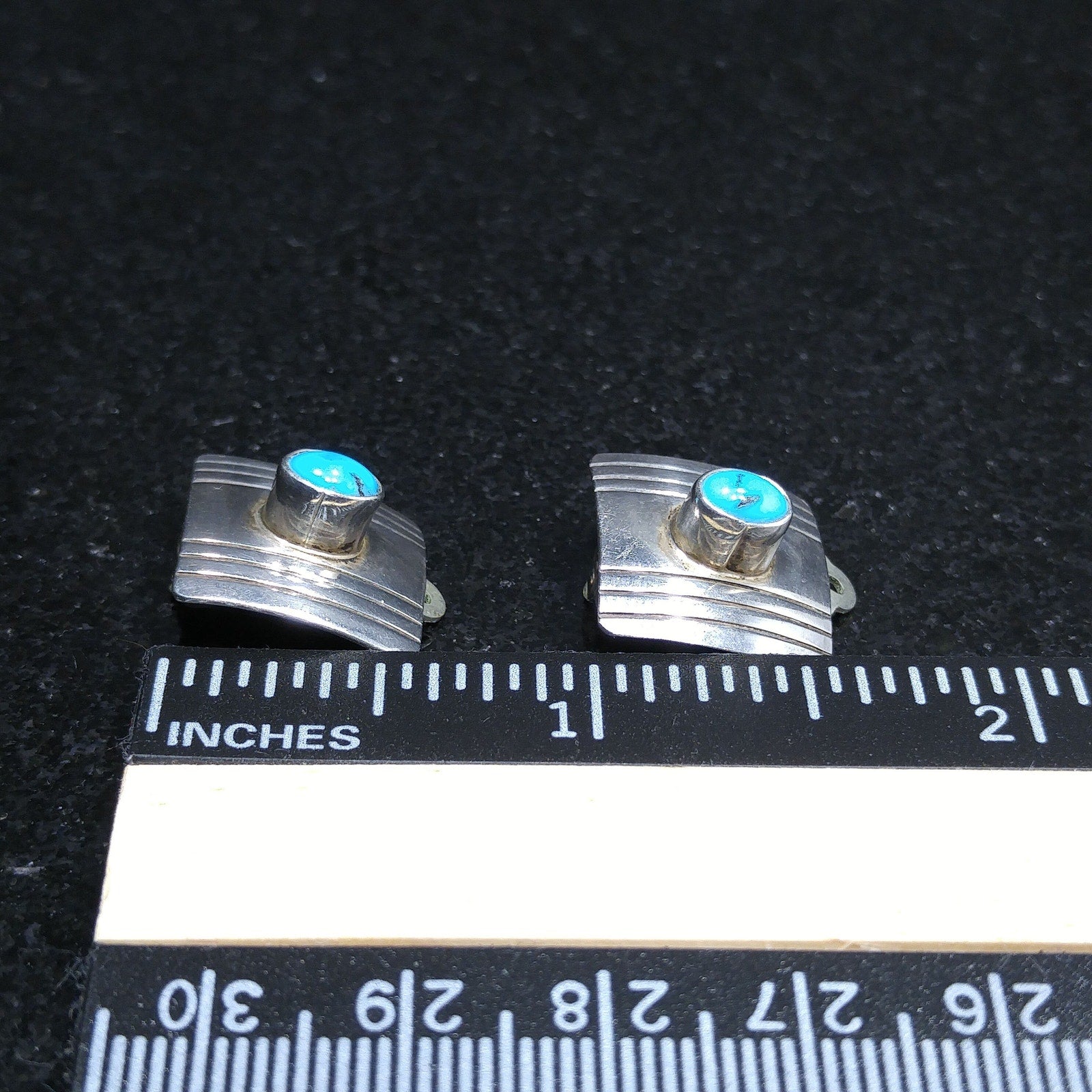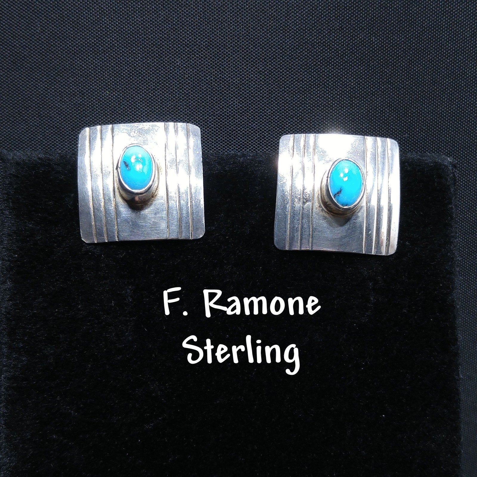 *Description: This is a great pair of Frank Ramone sterling silver earrings with a turquoise cabochon on each earring 3/16 raised from the surface in circulation in 1970s. These Navajo artisan earrings are very light in weight and stamped Sterling on the back of each, along with the artist's makers mark: F. Ramone. They would be a great pair to add to your vintage jewelry collection or make a wonderful vintage gift.