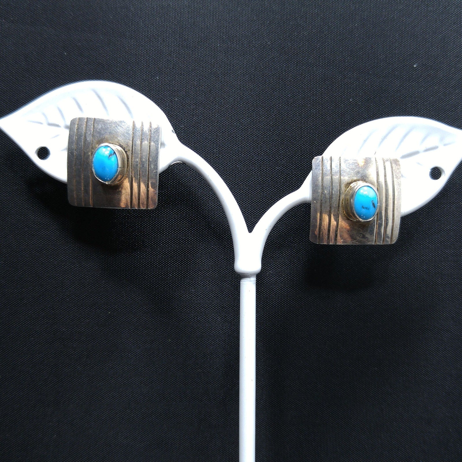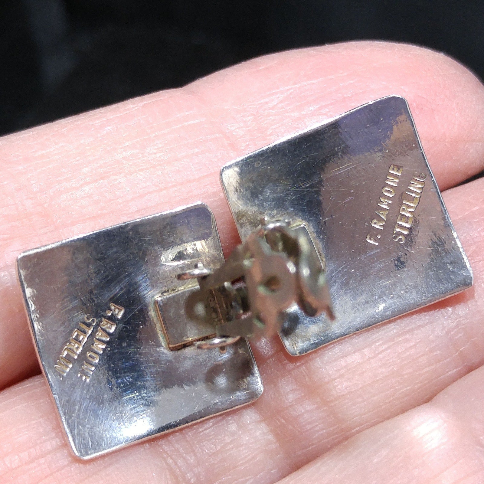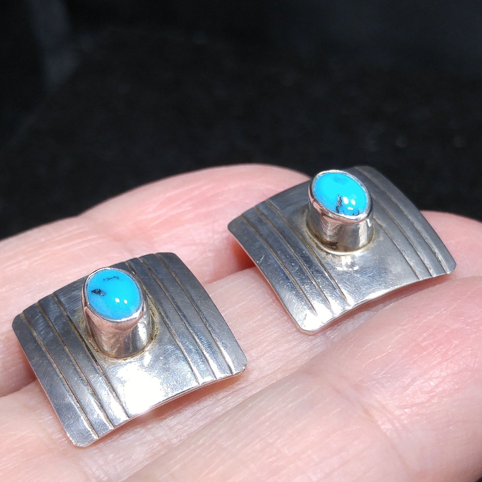 *Description: This is a great pair of Frank Ramone sterling silver earrings with a turquoise cabochon on each earring 3/16 raised from the surface in circulation in 1970s. These Navajo artisan earrings are very light in weight and stamped Sterling on the back of each, along with the artist's makers mark: F. Ramone. They would be a great pair to add to your vintage jewelry collection or make a wonderful vintage gift.