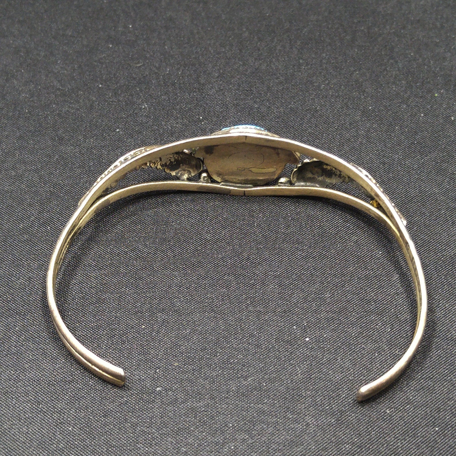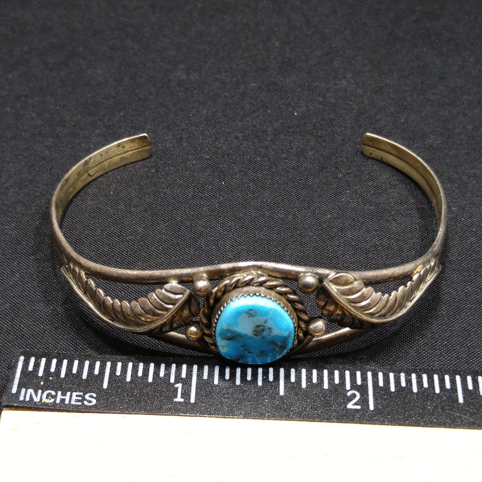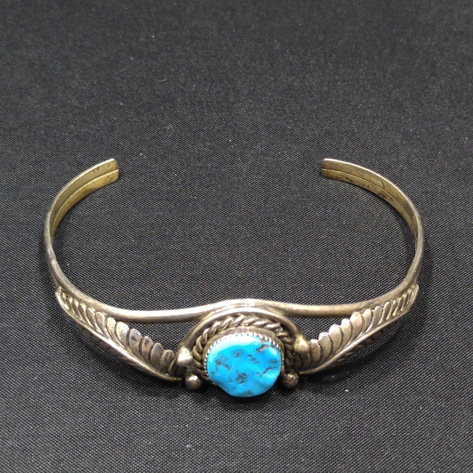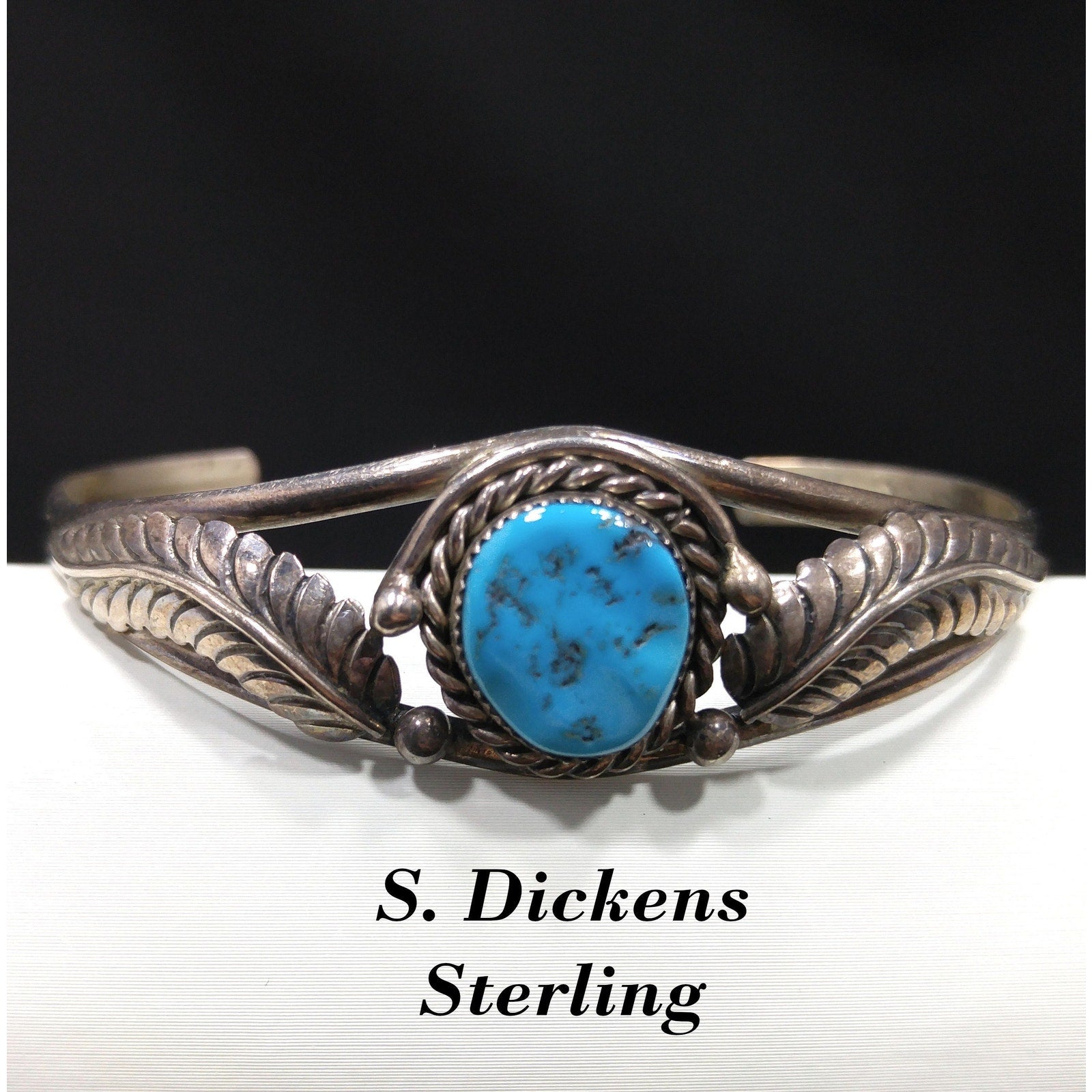 *Description: This is a great Navajo turquoise and sterling silver bracelet by Navajo artist Sarah Dickens. I believe the bracelet is from the 1960s to 1970s. I tested the gemstone and it tested in the quartz range on the Presidium gem tester. I believe it to be turquoise. It looks to me as it has a glaze over it, rather than raw unpolished stone. It tests gemstone. The mark for Sarah Dickens is on the inside of the bracelet. This would be a great addition to your vintage jewelry collection or make a great vintage gift!