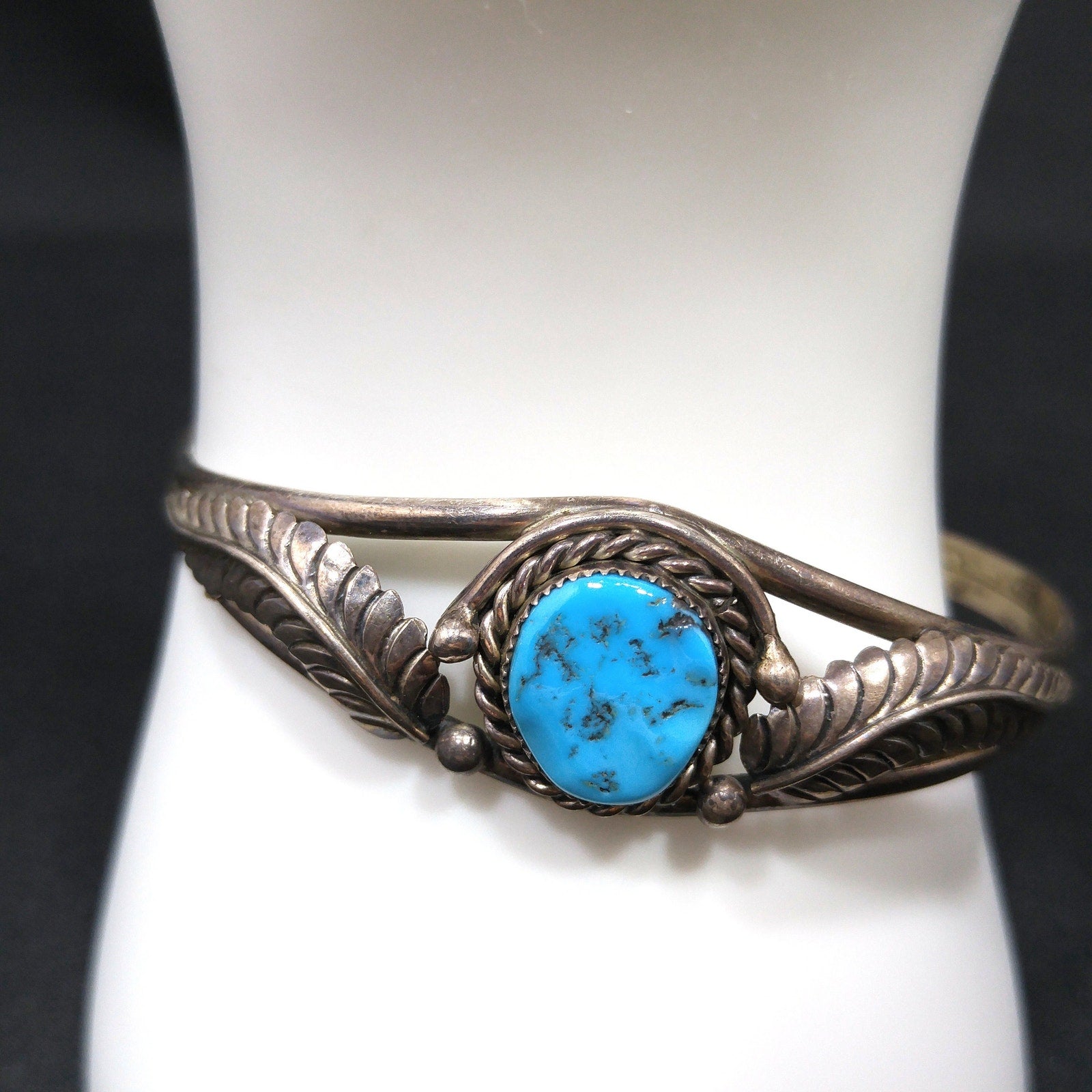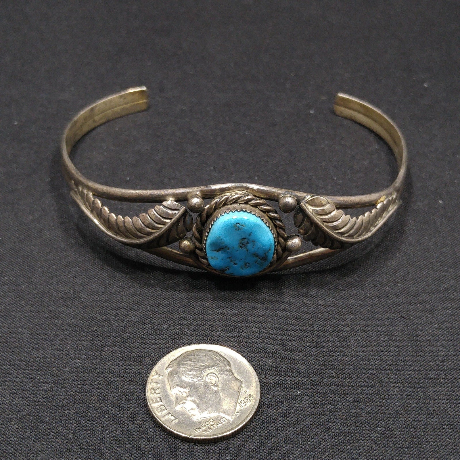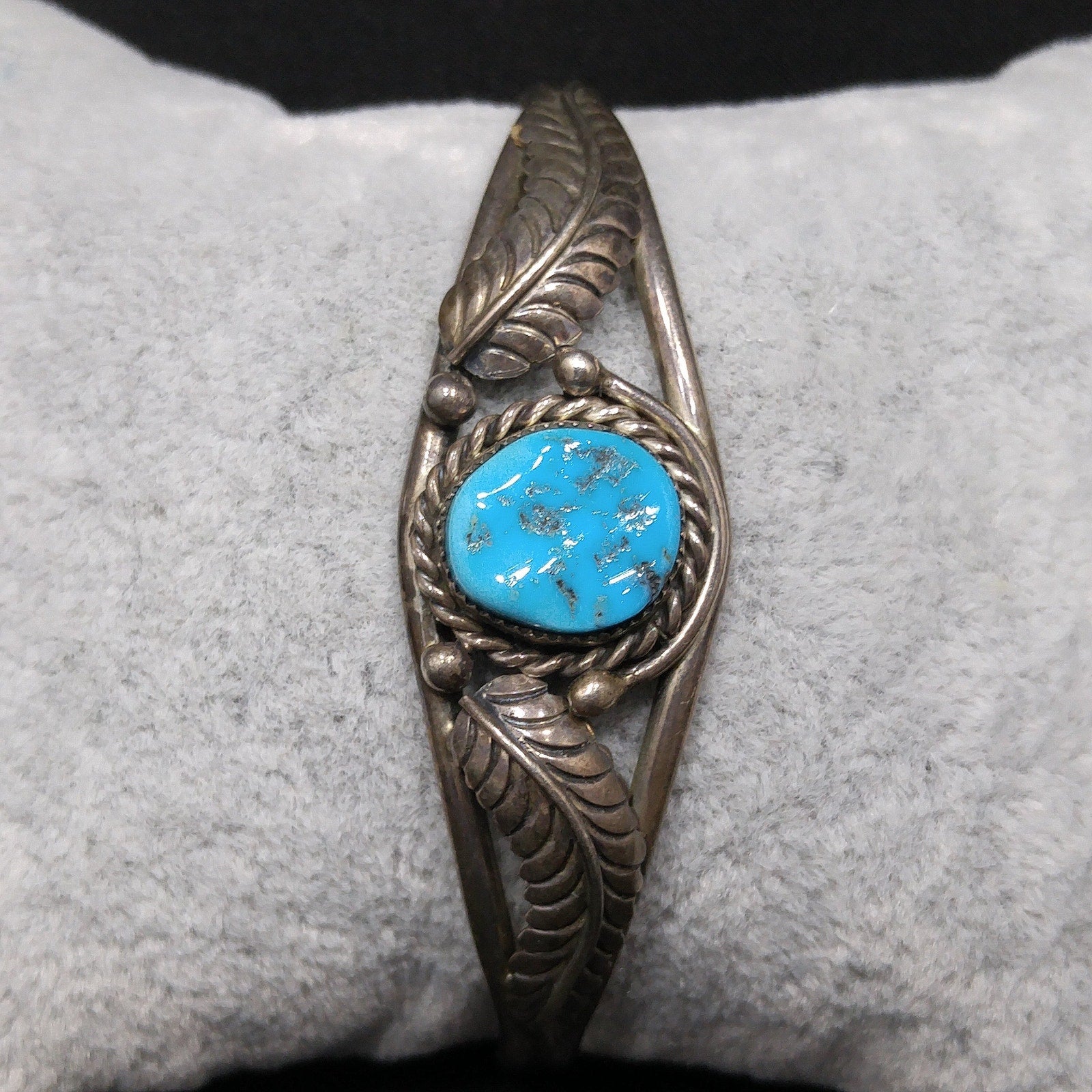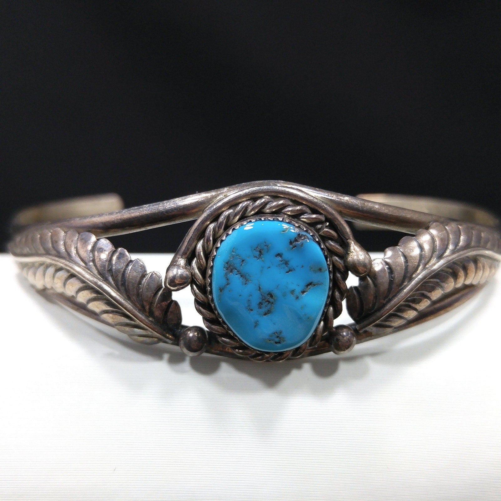 *Description: This is a great Navajo turquoise and sterling silver bracelet by Navajo artist Sarah Dickens. I believe the bracelet is from the 1960s to 1970s. I tested the gemstone and it tested in the quartz range on the Presidium gem tester. I believe it to be turquoise. It looks to me as it has a glaze over it, rather than raw unpolished stone. It tests gemstone. The mark for Sarah Dickens is on the inside of the bracelet. This would be a great addition to your vintage jewelry collection or make a great vintage gift!