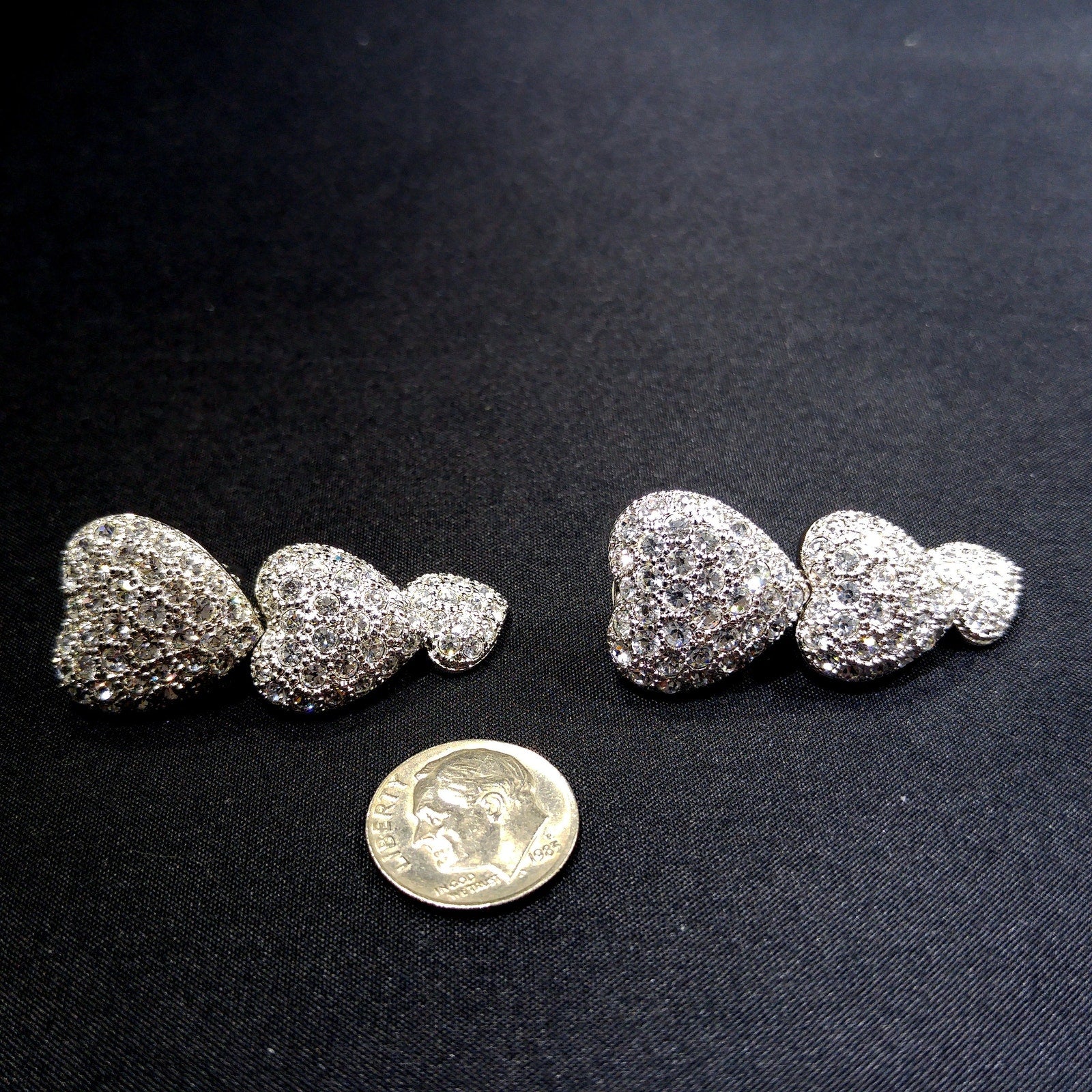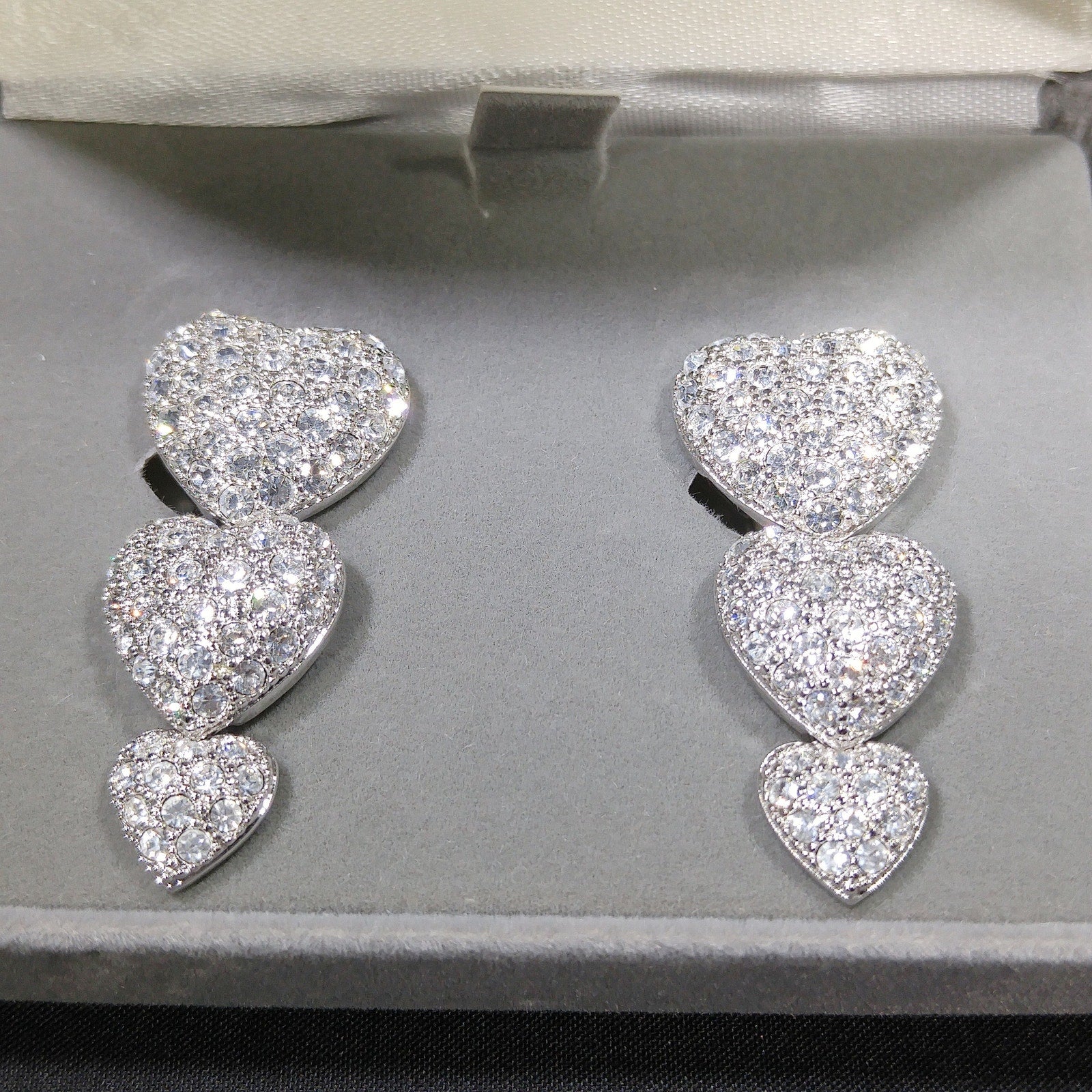 Each earring features three graduated hearts, fully encrusted with clear rhinestones for maximum brilliance. The earrings are rhodium plated for a sleek silver-tone finish and have comfortable clip-on backs with rubber pads. Made in Thailand, they come in their original box, making them a wonderful collectible or gift.